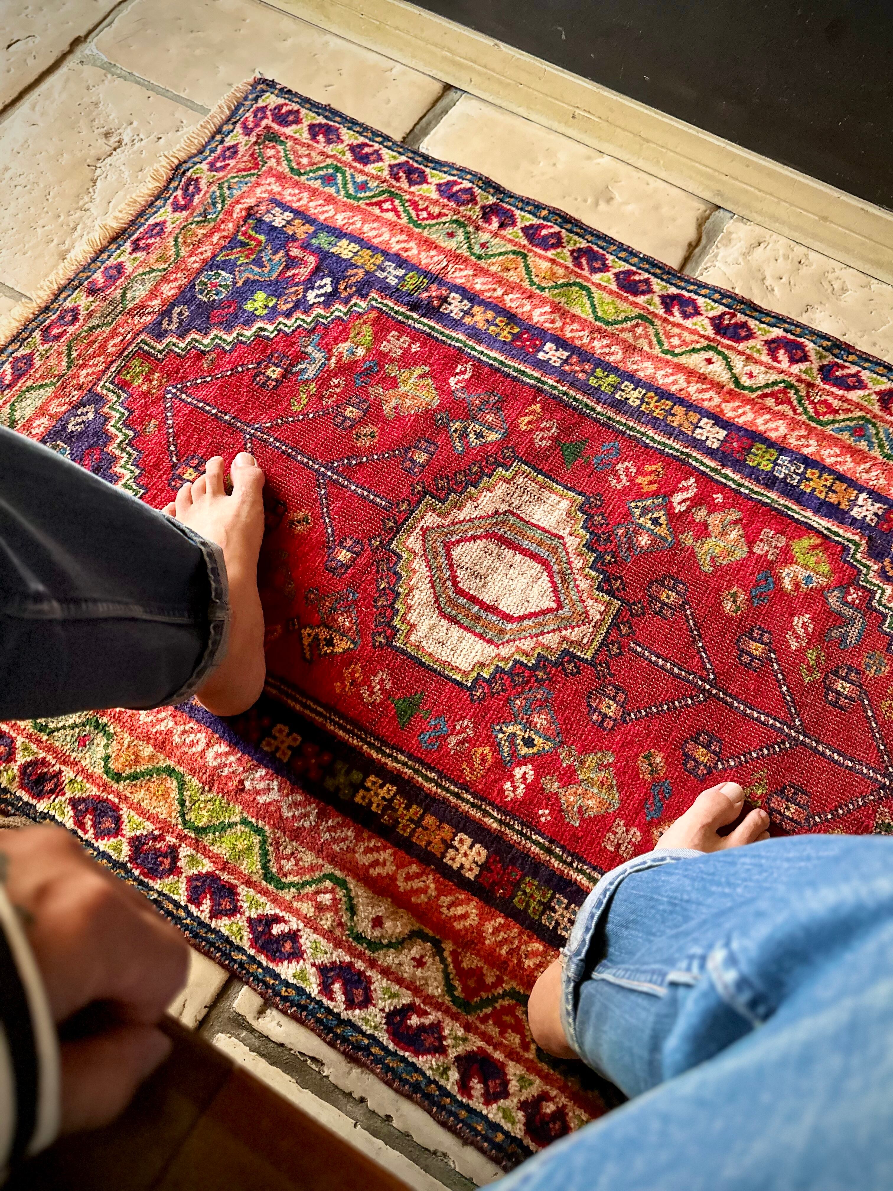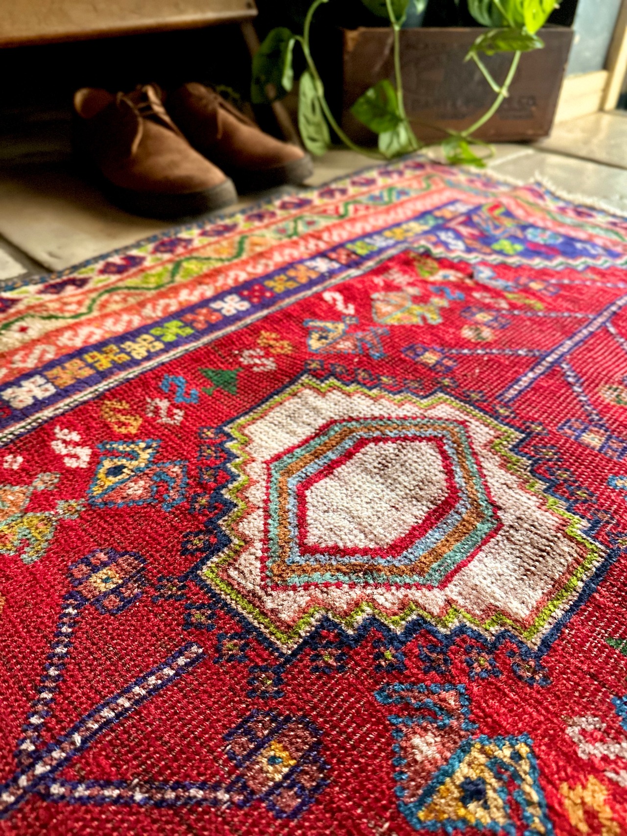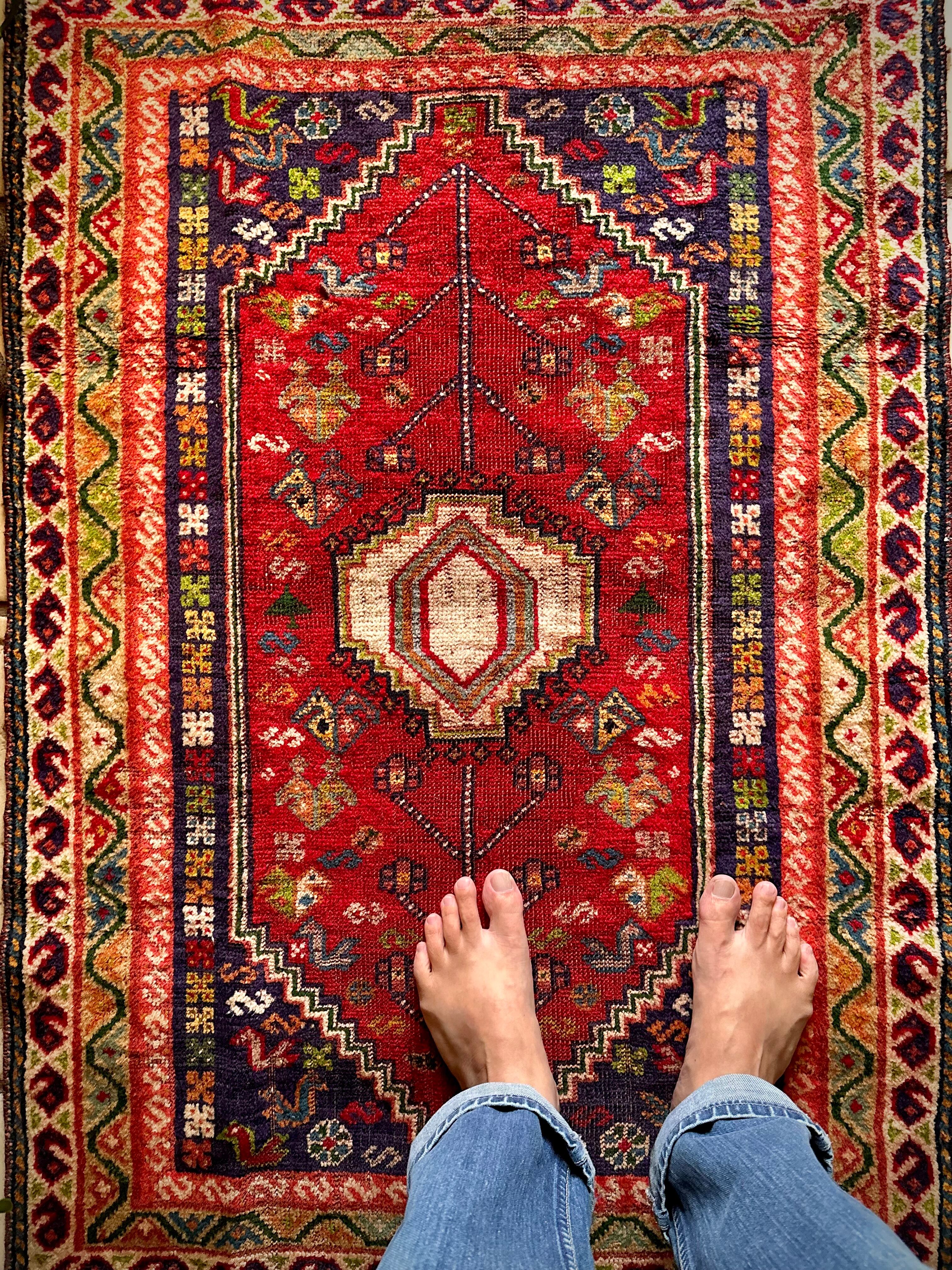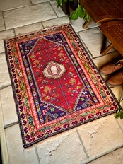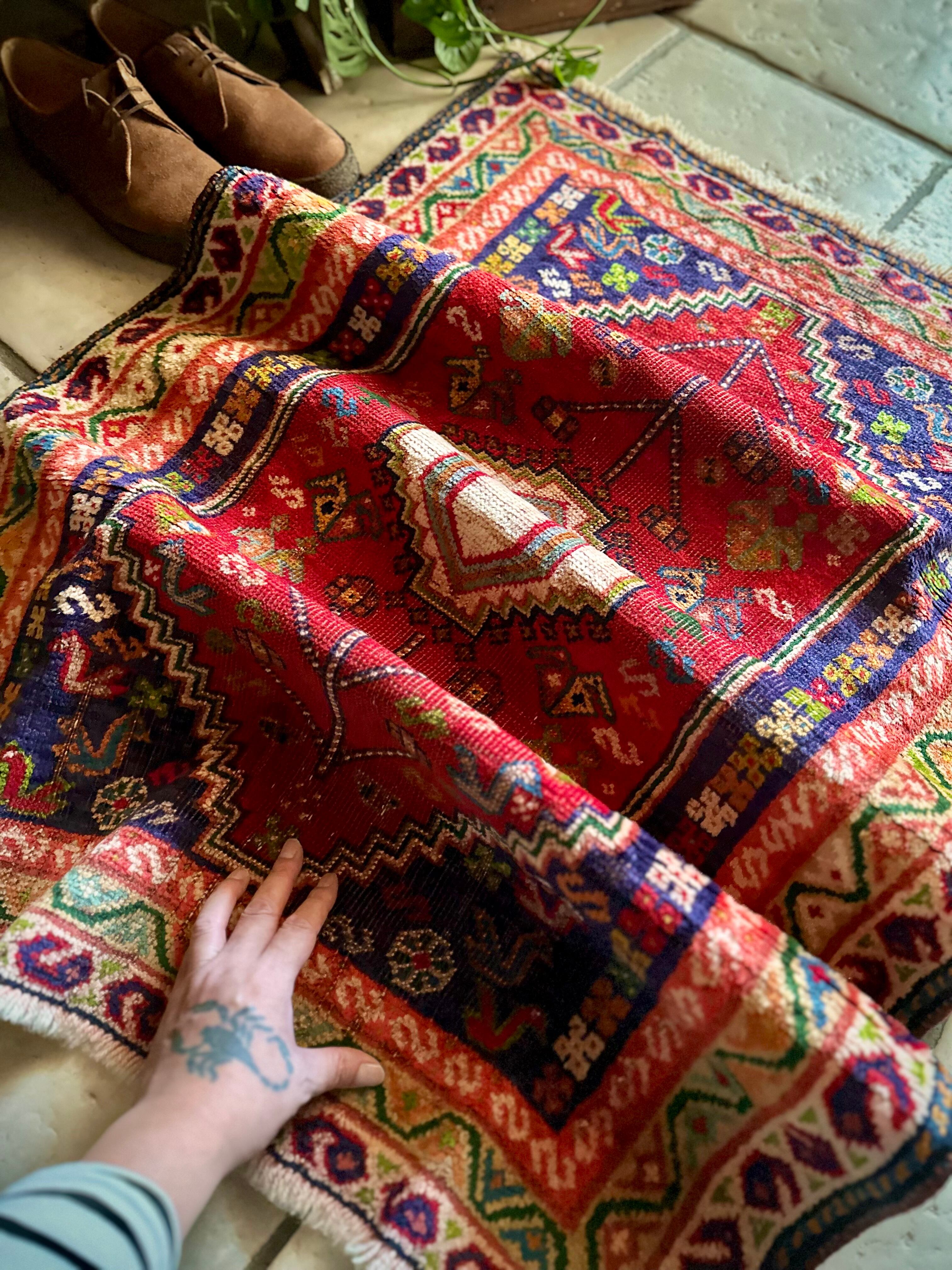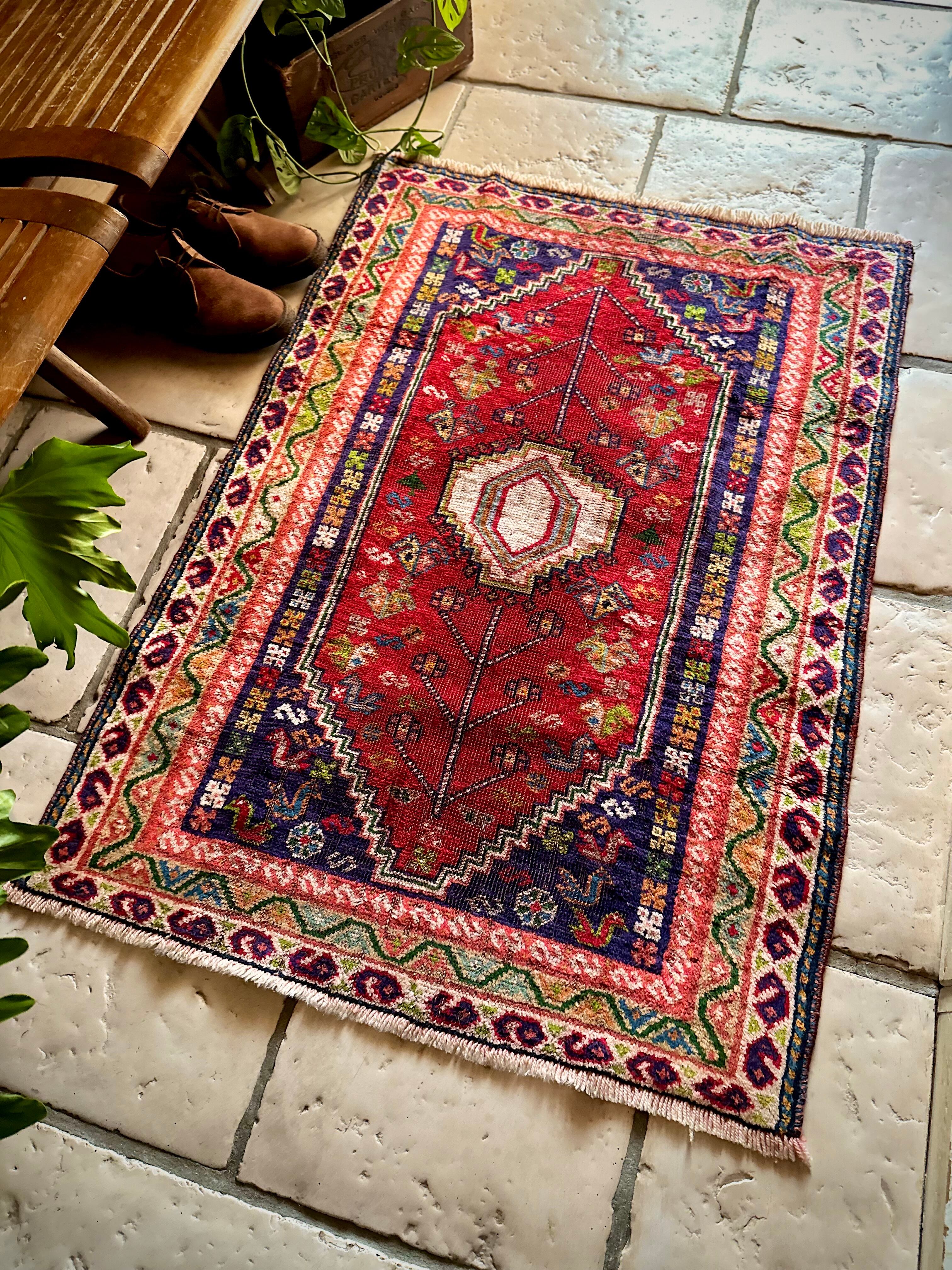 中央のメダリオンに生命の樹が宿され、蛇を模った魔除けを表すS字文様のボーダーのカラフルな色彩美はカシュガイならではでしょうか。大きさは玄関マットなどの出入り口や姿見前なんかに良さげな扱いやすいサイズ感になります。