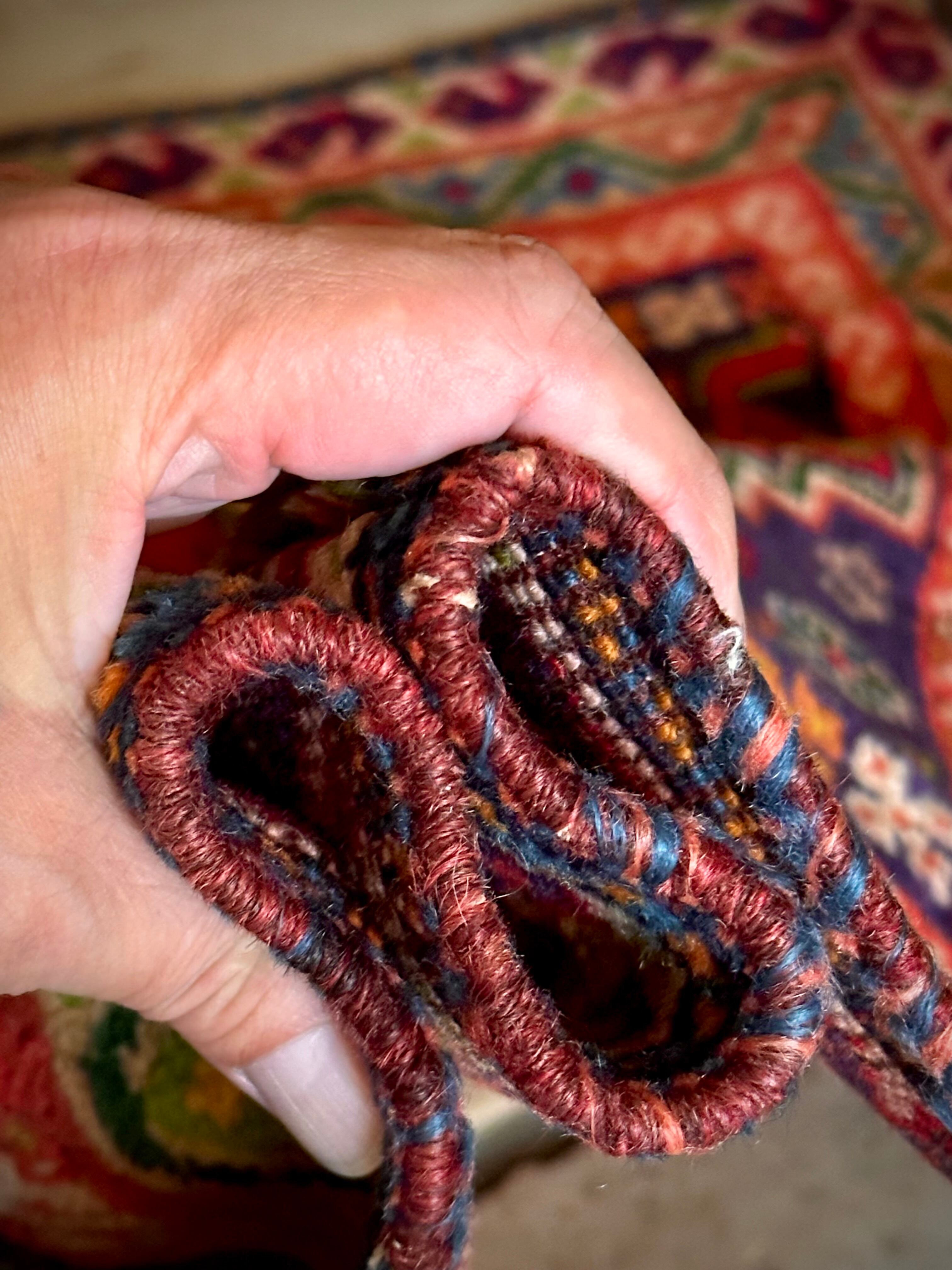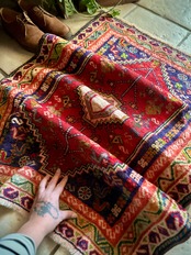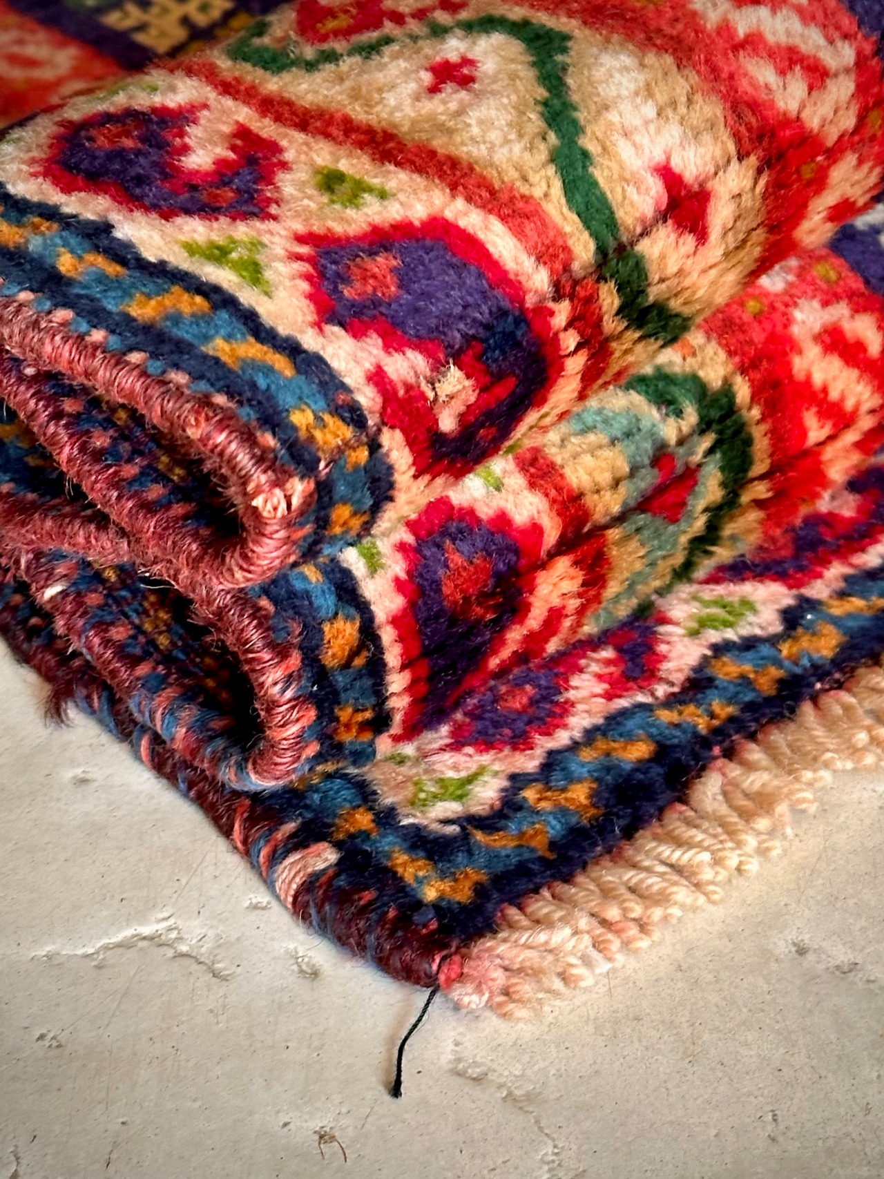 最後にラグそのものに関しては羊毛特有の匂いがあり、採寸は中央付近で計測していますが、手織りならではの歪みによる誤差や水洗いクリーニングによる縮み、また草木染めによる経年劣化の色ムラなどがありますが、それもまたヴィンテージラグの魅力かとご理解ください。