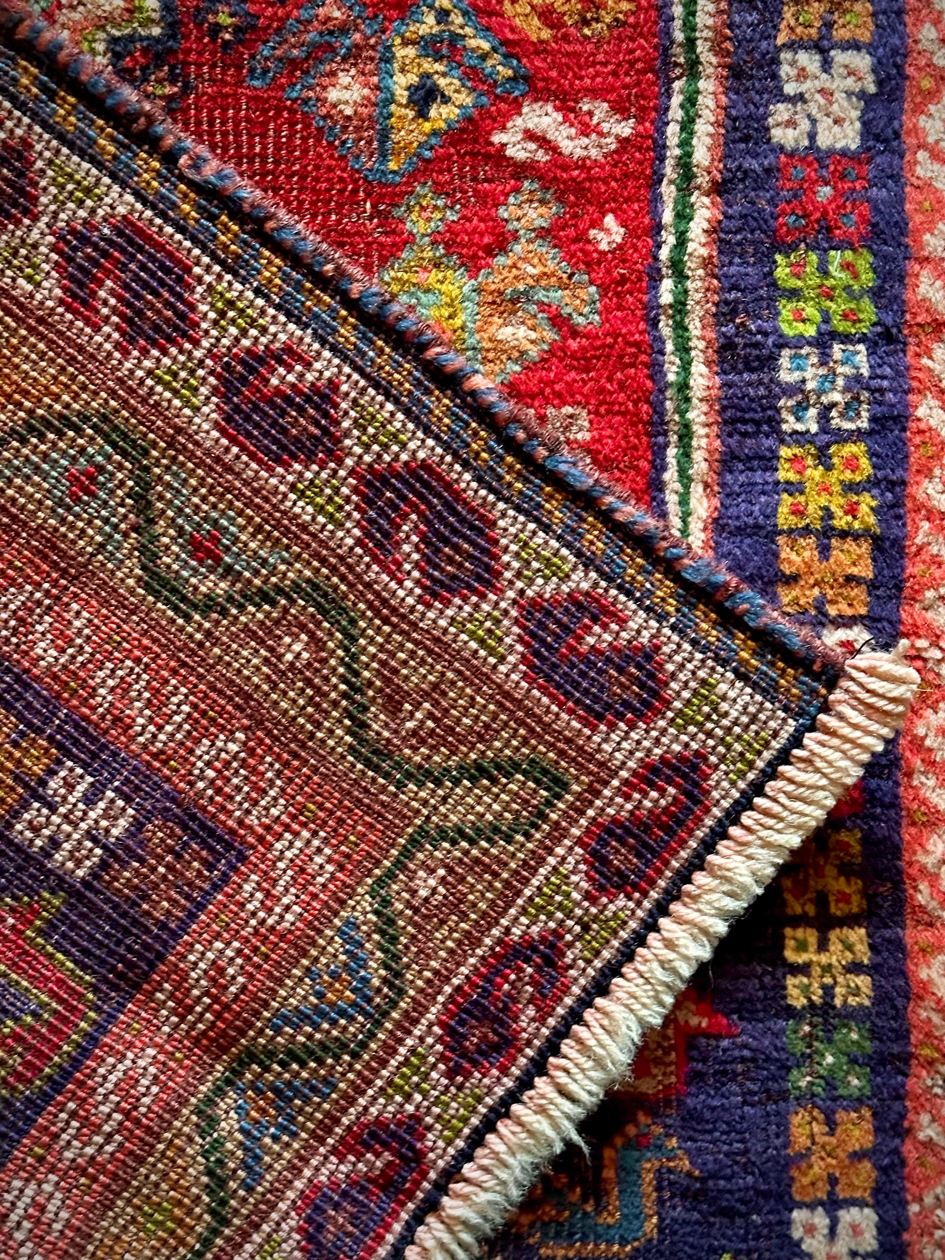 経年としては50年のヴィンテージラグらしく、かなりの使用感にフィールド部分のパイルが擦れて短くなっていますが、特に目立つ汚れやダメージにリペア箇所のないナイスなコンディションで、カシュガイにしてはサラッとした肌触りの1枚になります。