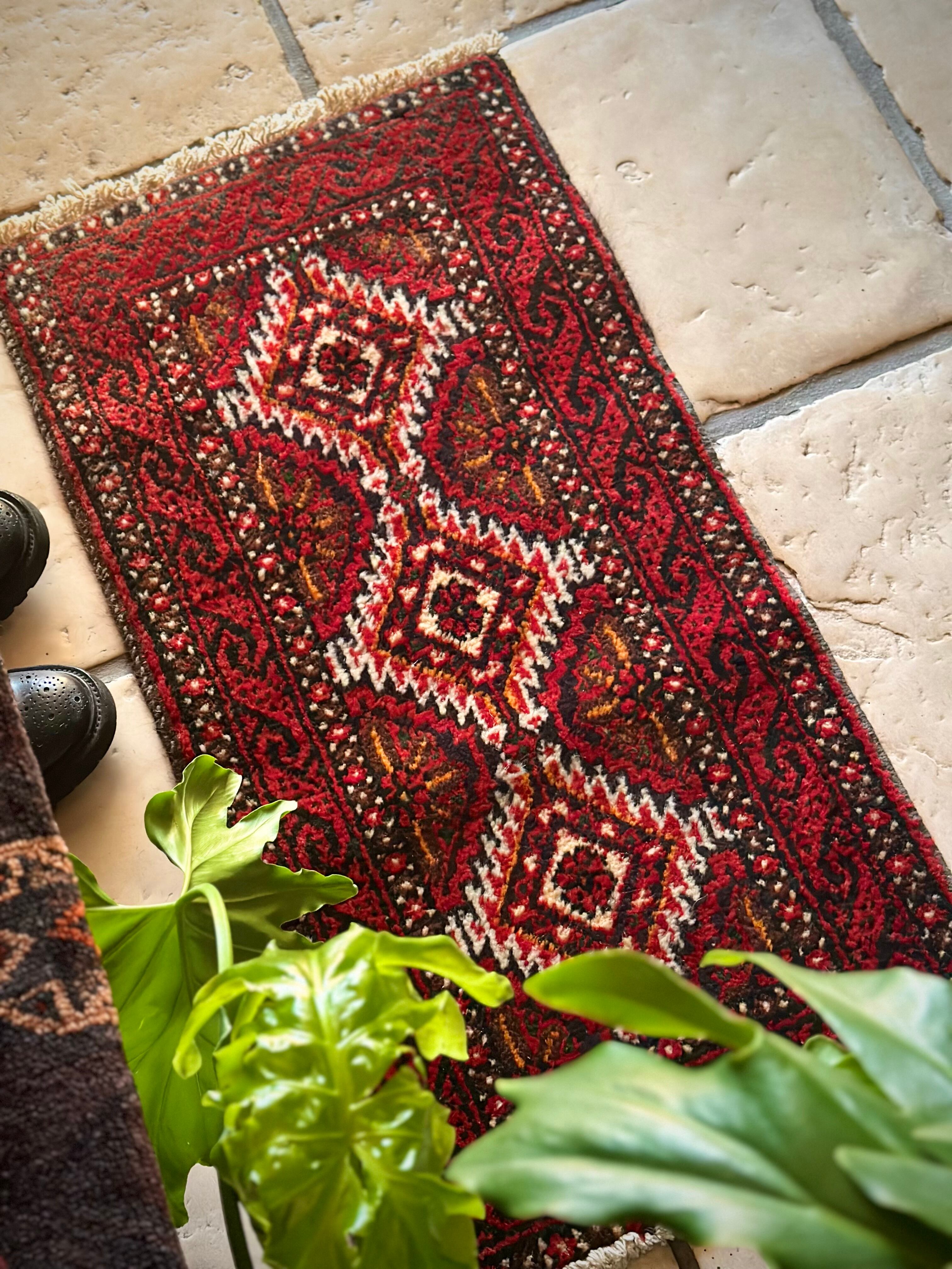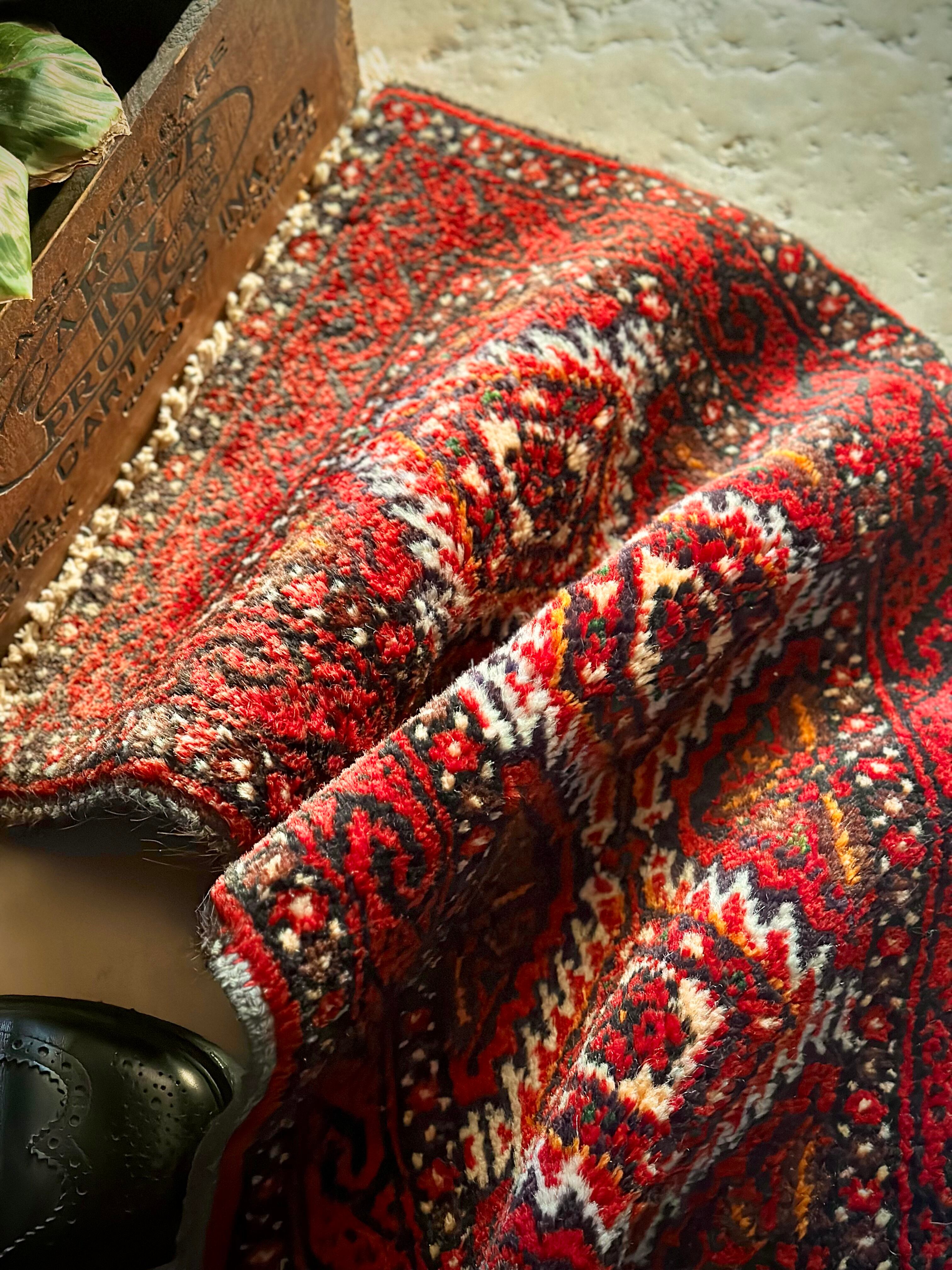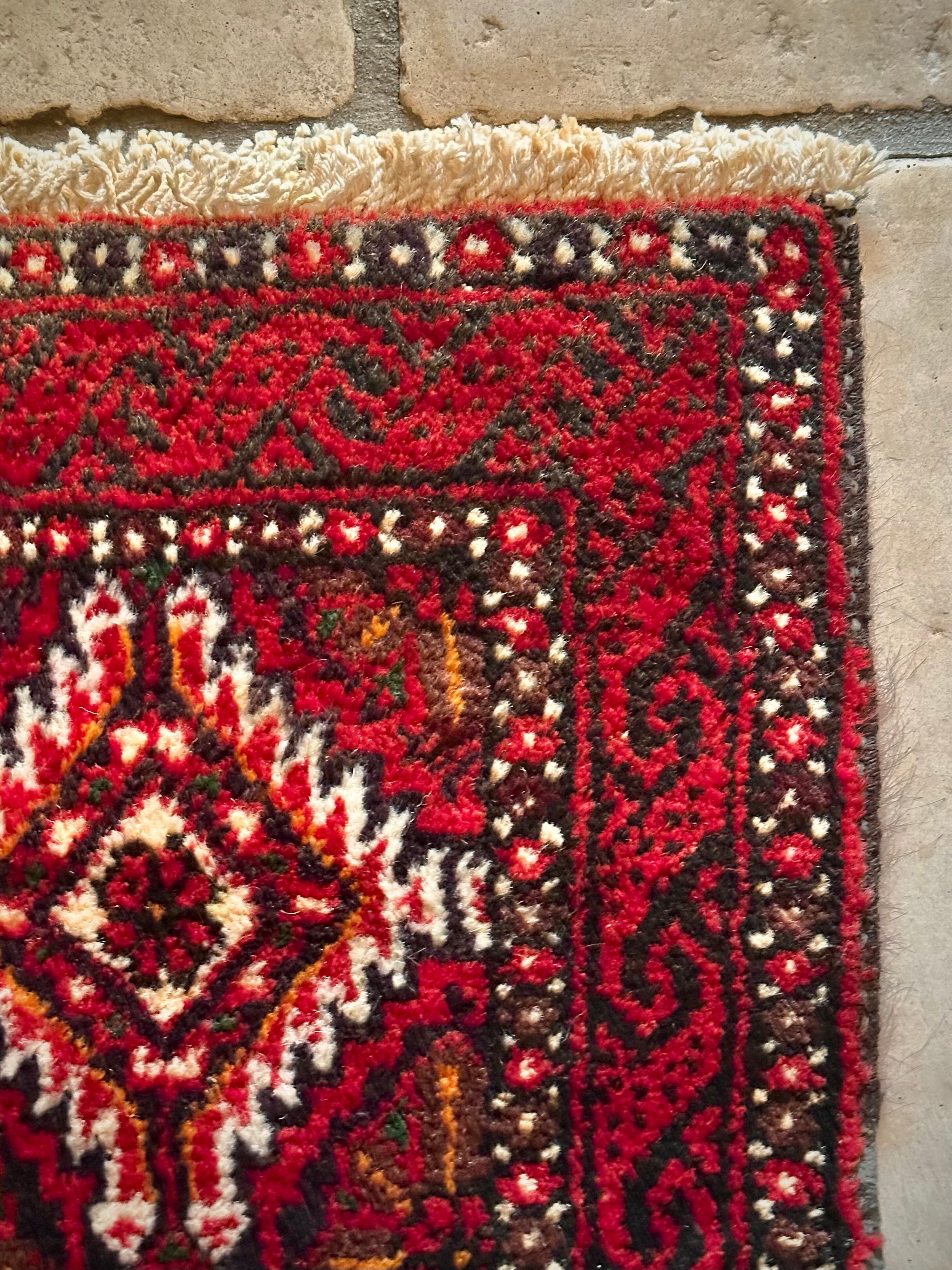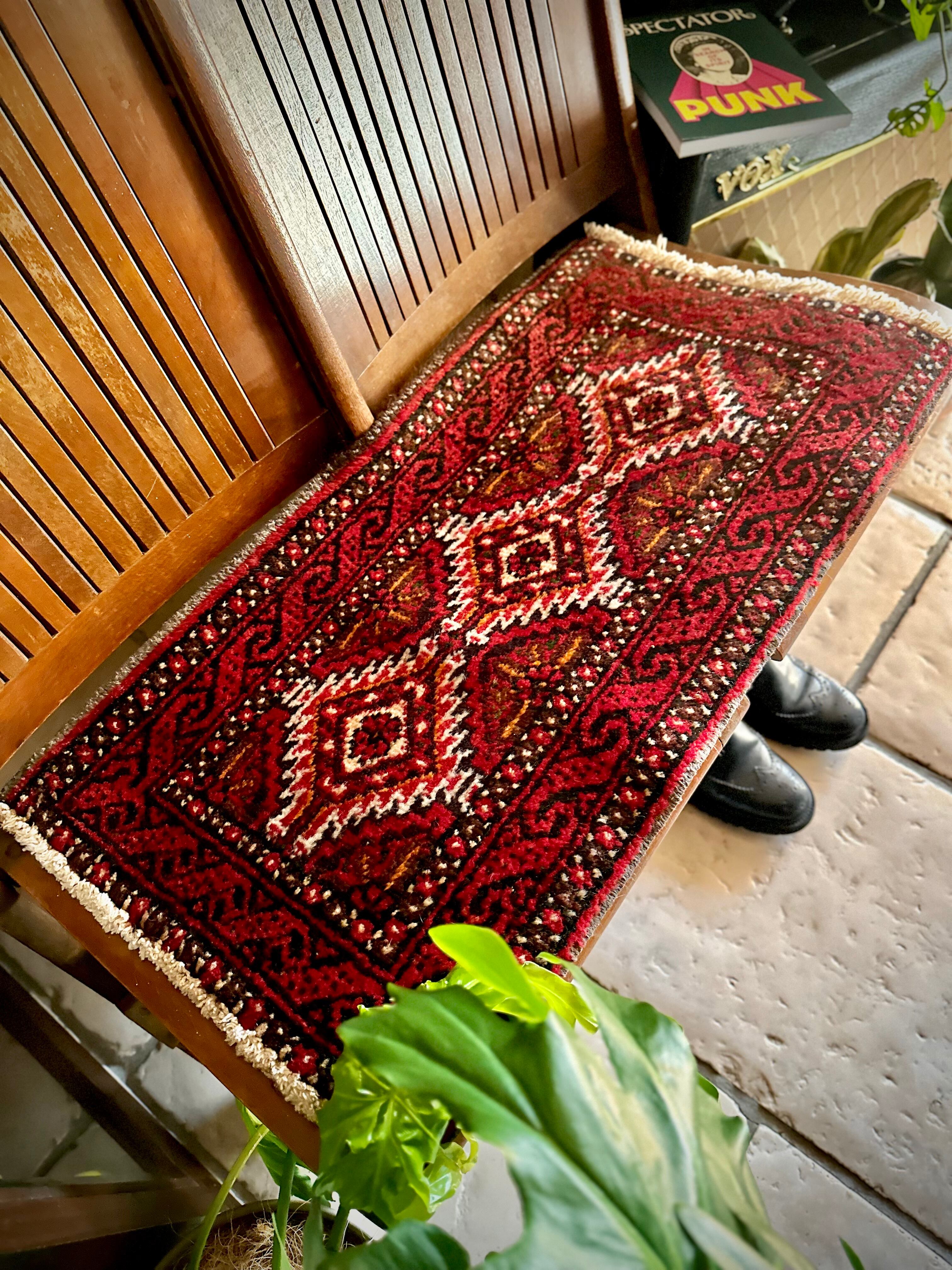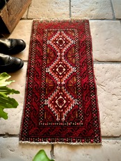 燃えるような灼熱の赤に3連メダリオンがカシュガイ族の様な見た目のこちらは、イラン東部に居住するバルーチ族のトライバルラグで、マシュハド産ならではの分厚くしっかりとした織りのミニラグになります。