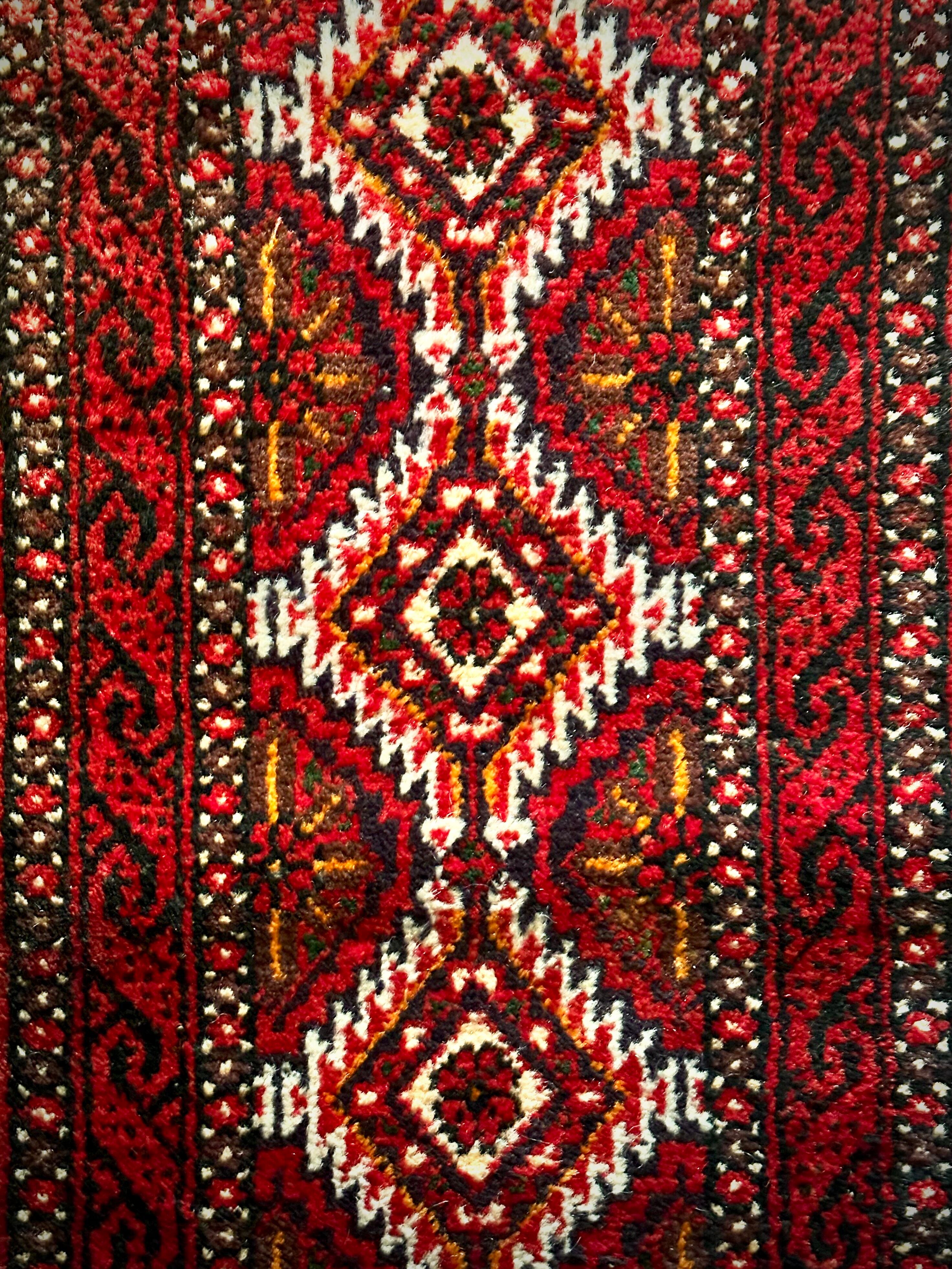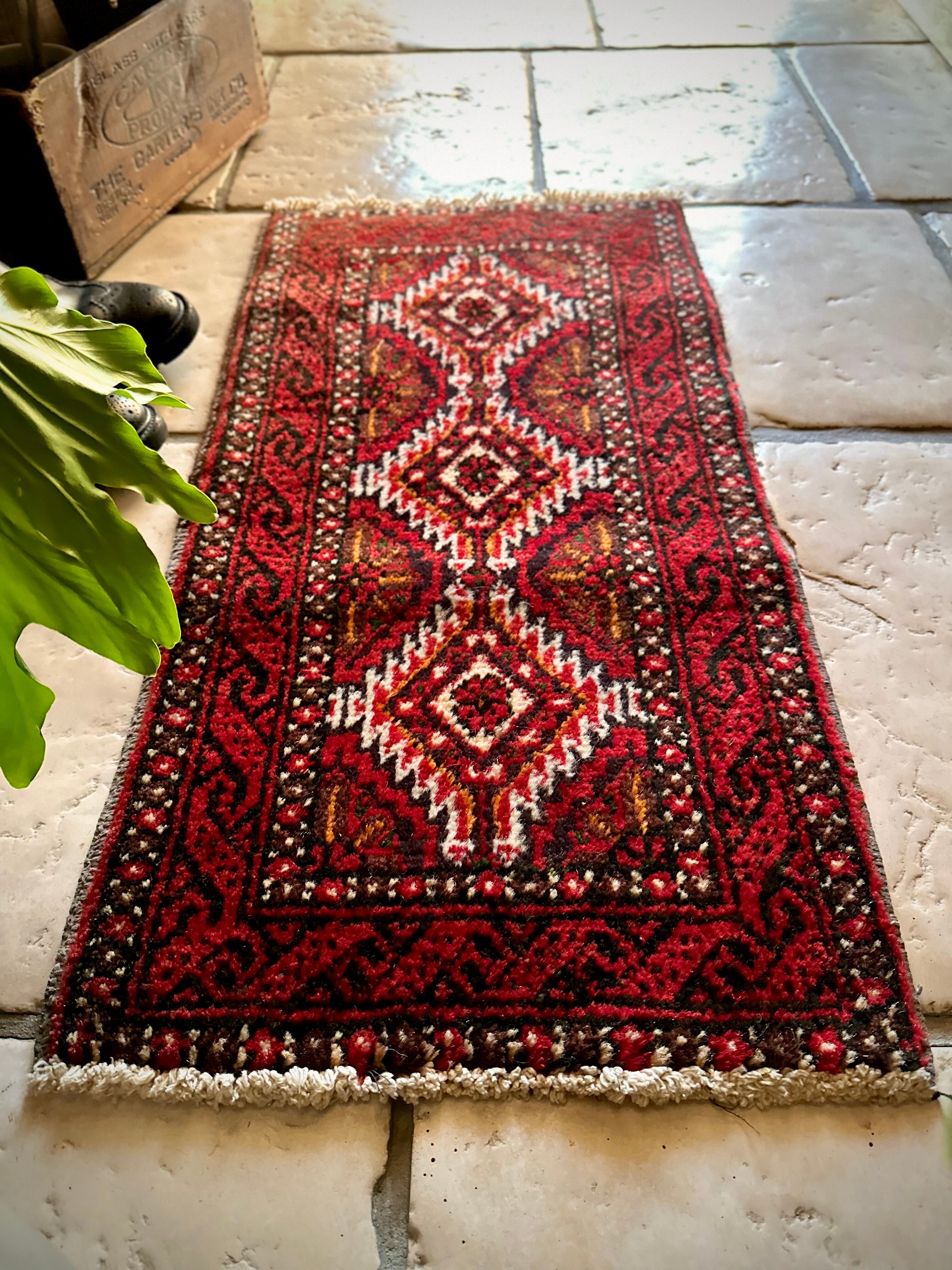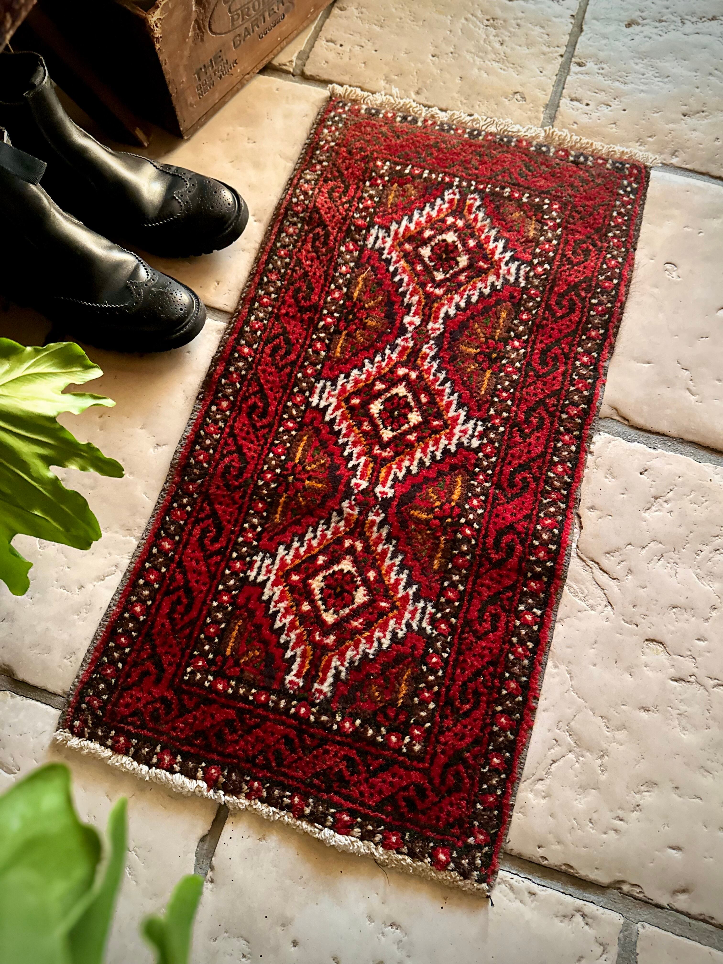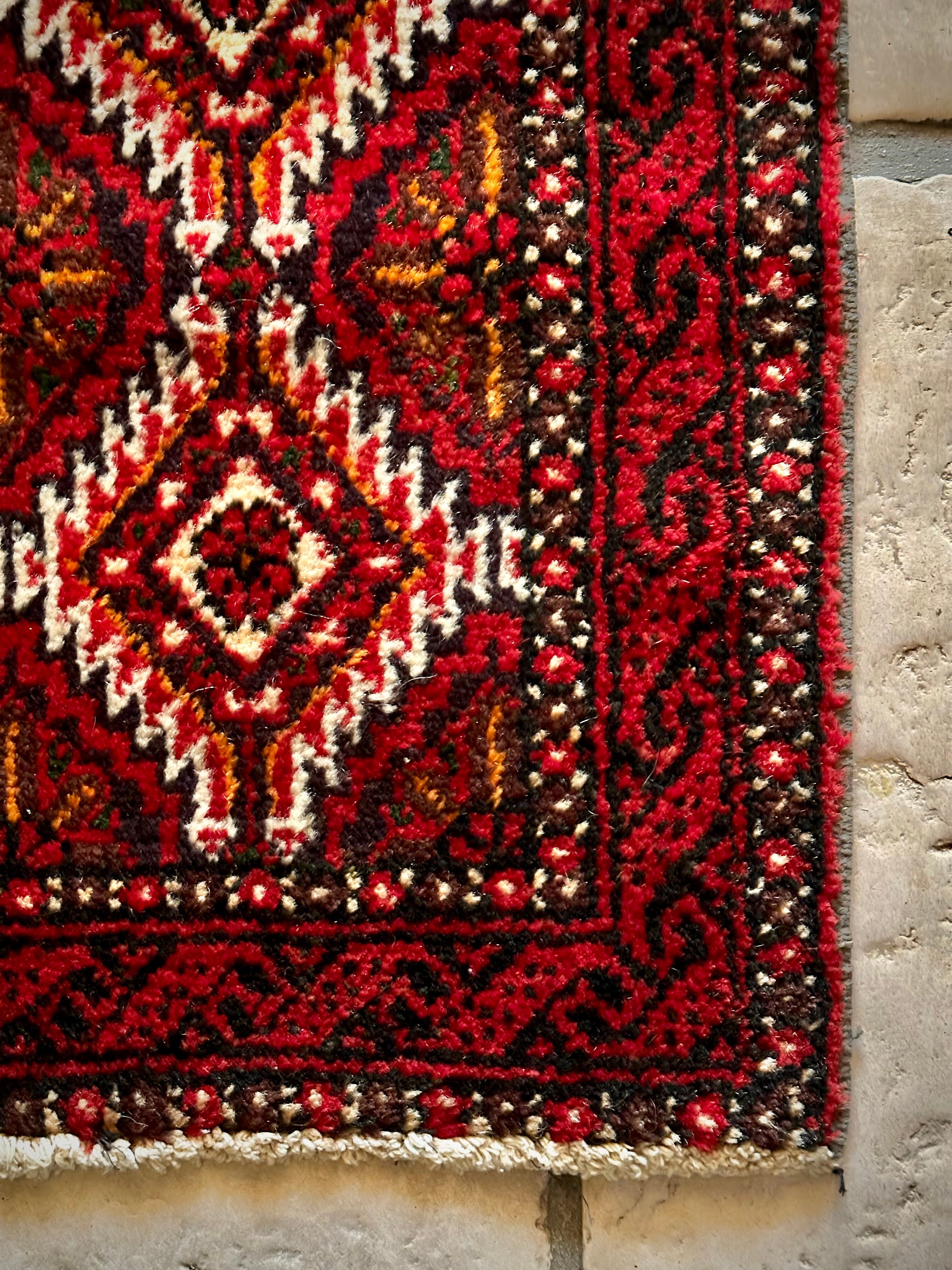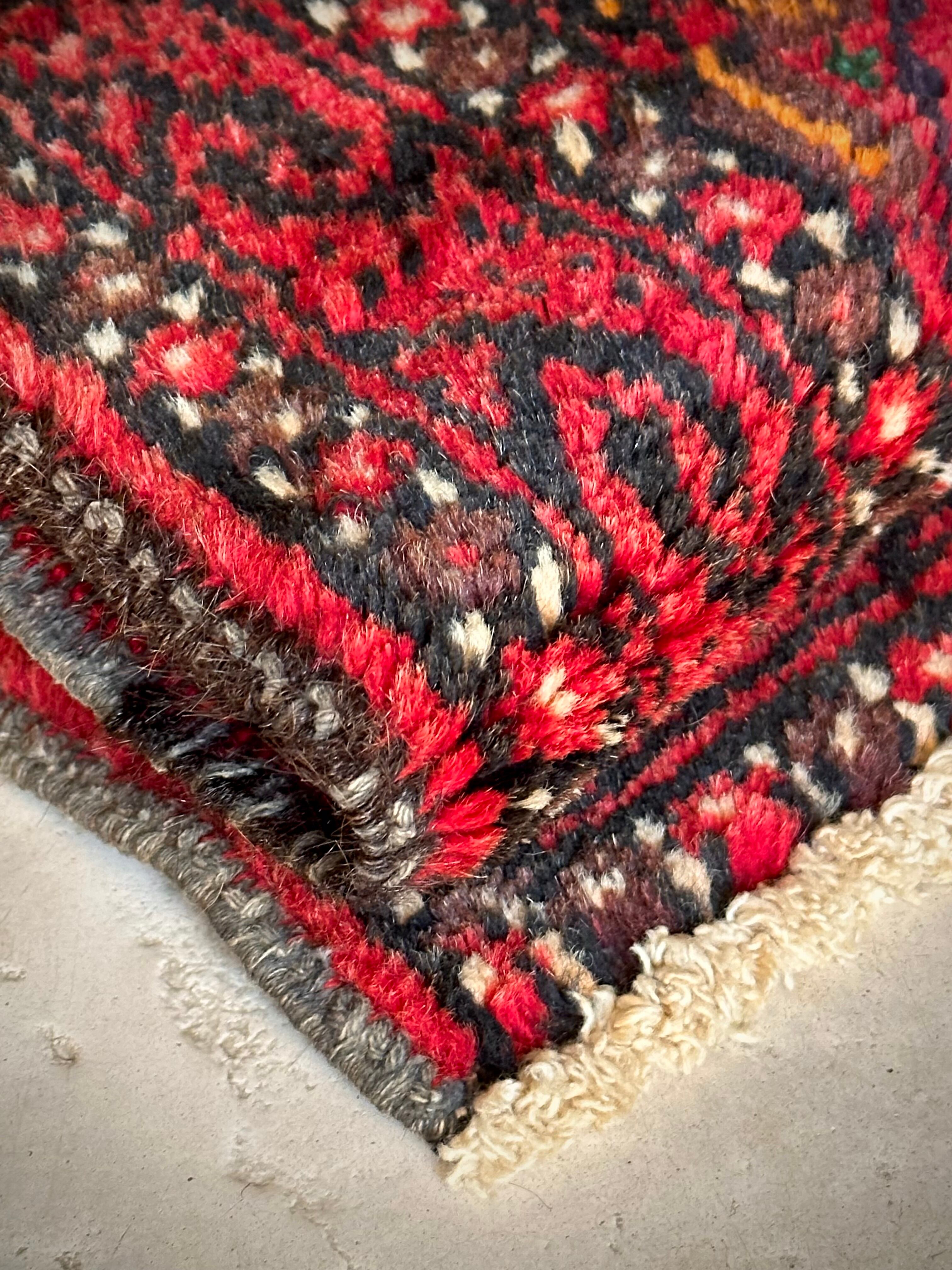 燃えるような灼熱の赤に3連メダリオンがカシュガイ族の様な見た目のこちらは、イラン東部に居住するバルーチ族のトライバルラグで、マシュハド産ならではの分厚くしっかりとした織りのミニラグになります。