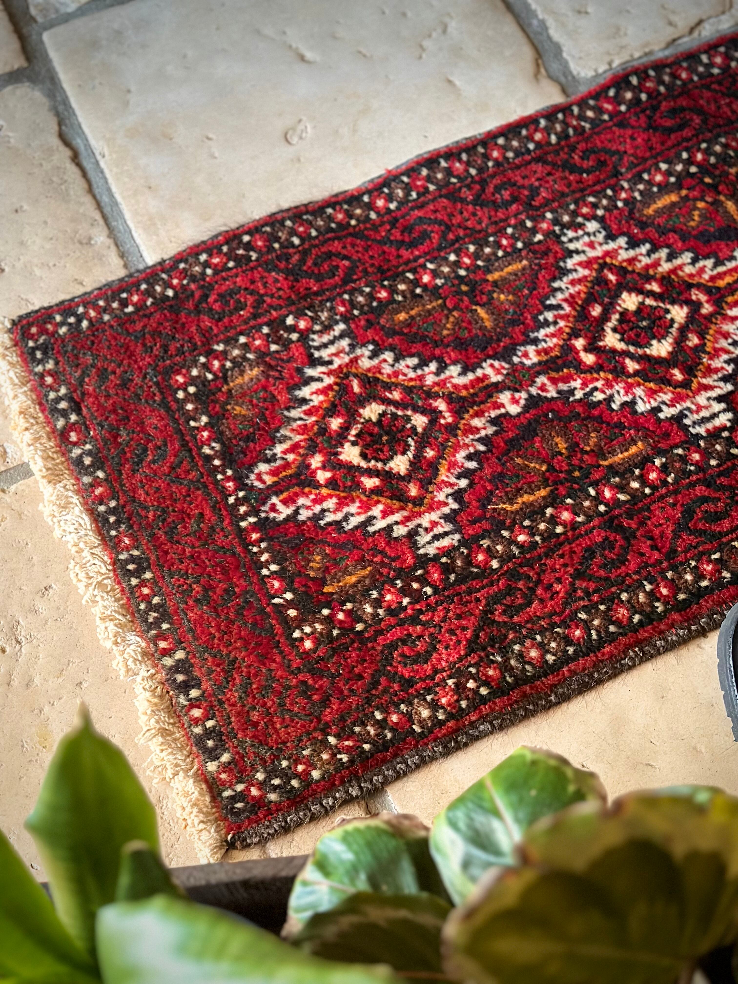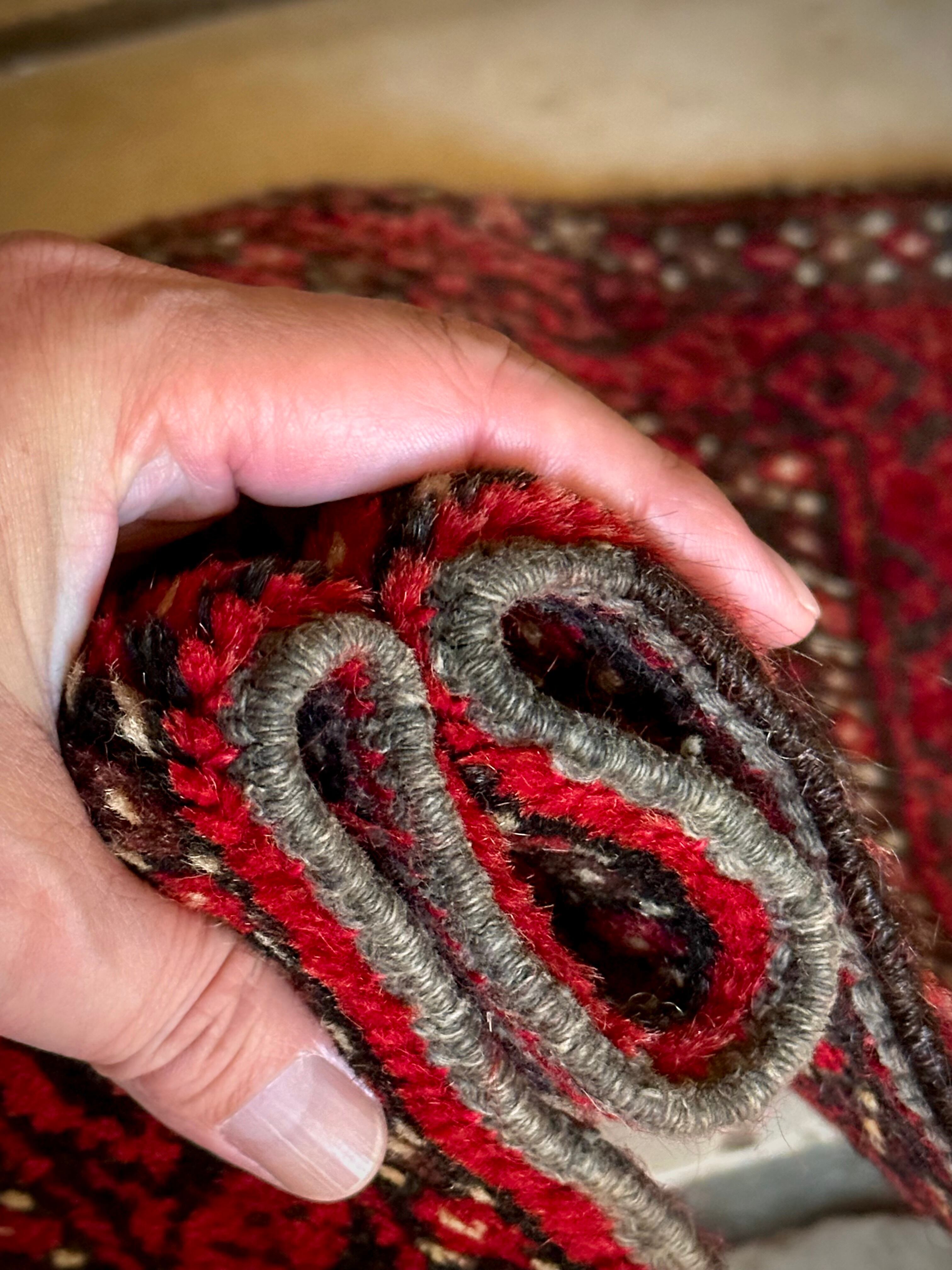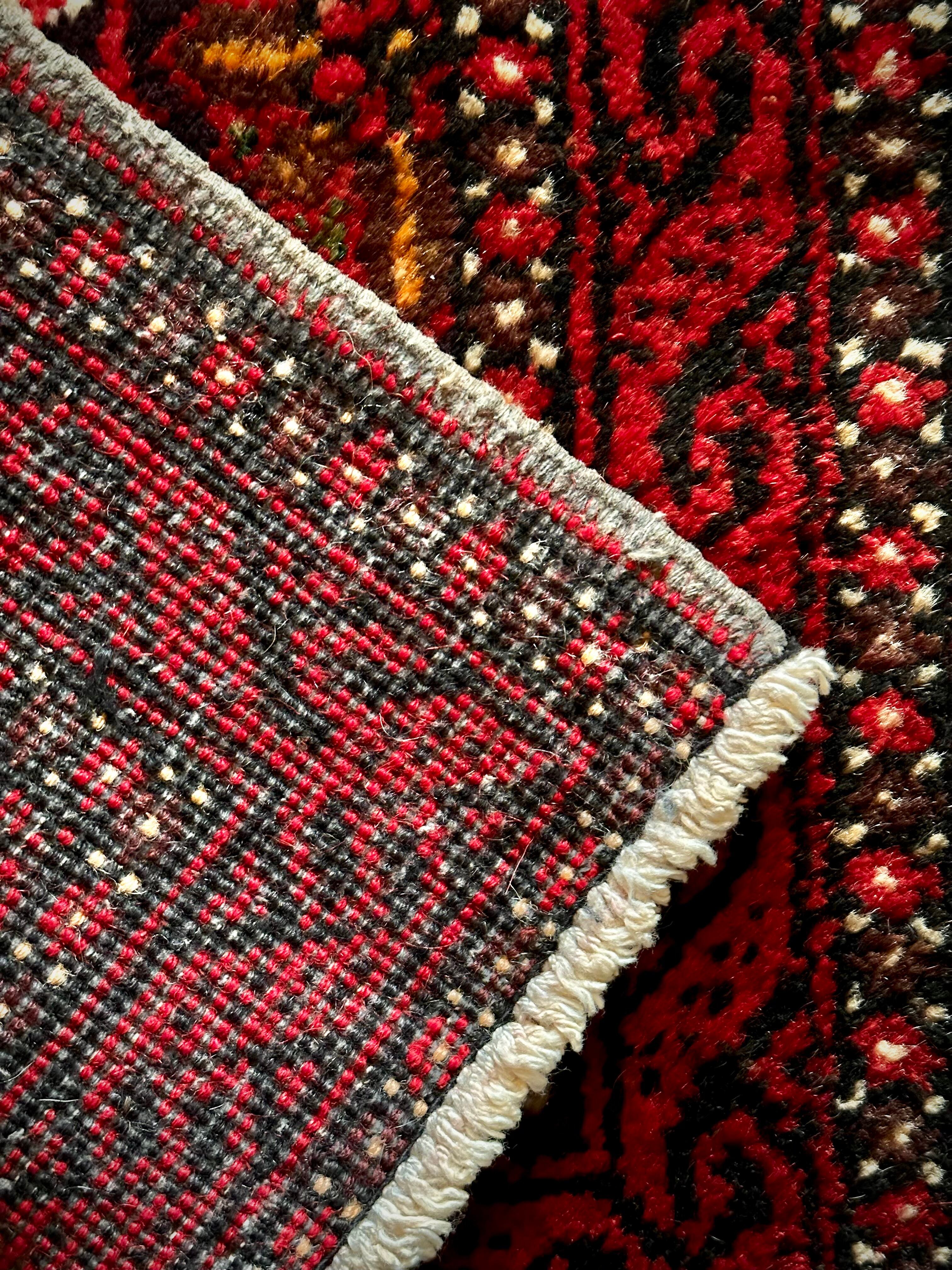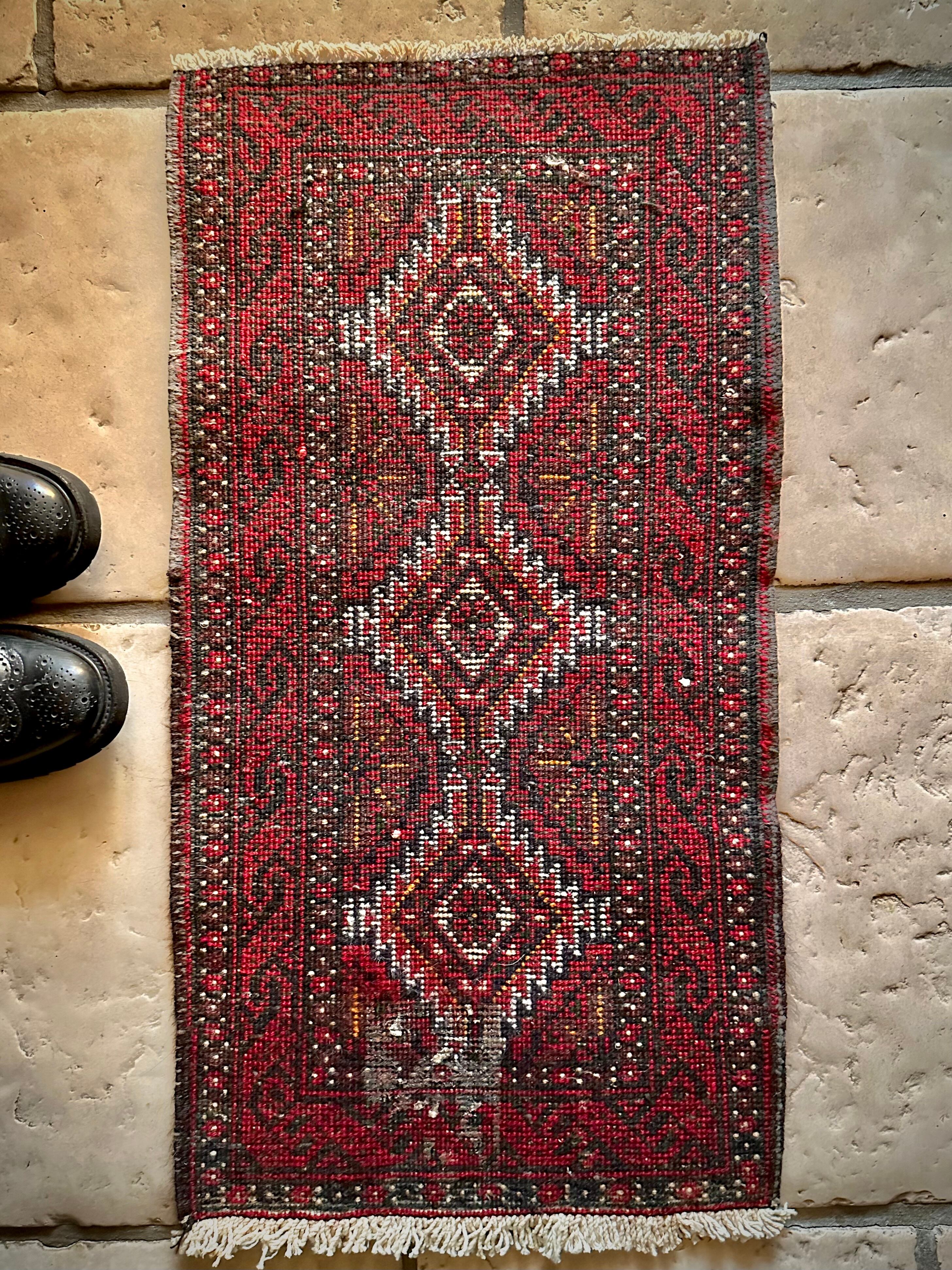 燃えるような灼熱の赤に3連メダリオンがカシュガイ族の様な見た目のこちらは、イラン東部に居住するバルーチ族のトライバルラグで、マシュハド産ならではの分厚くしっかりとした織りのミニラグになります。