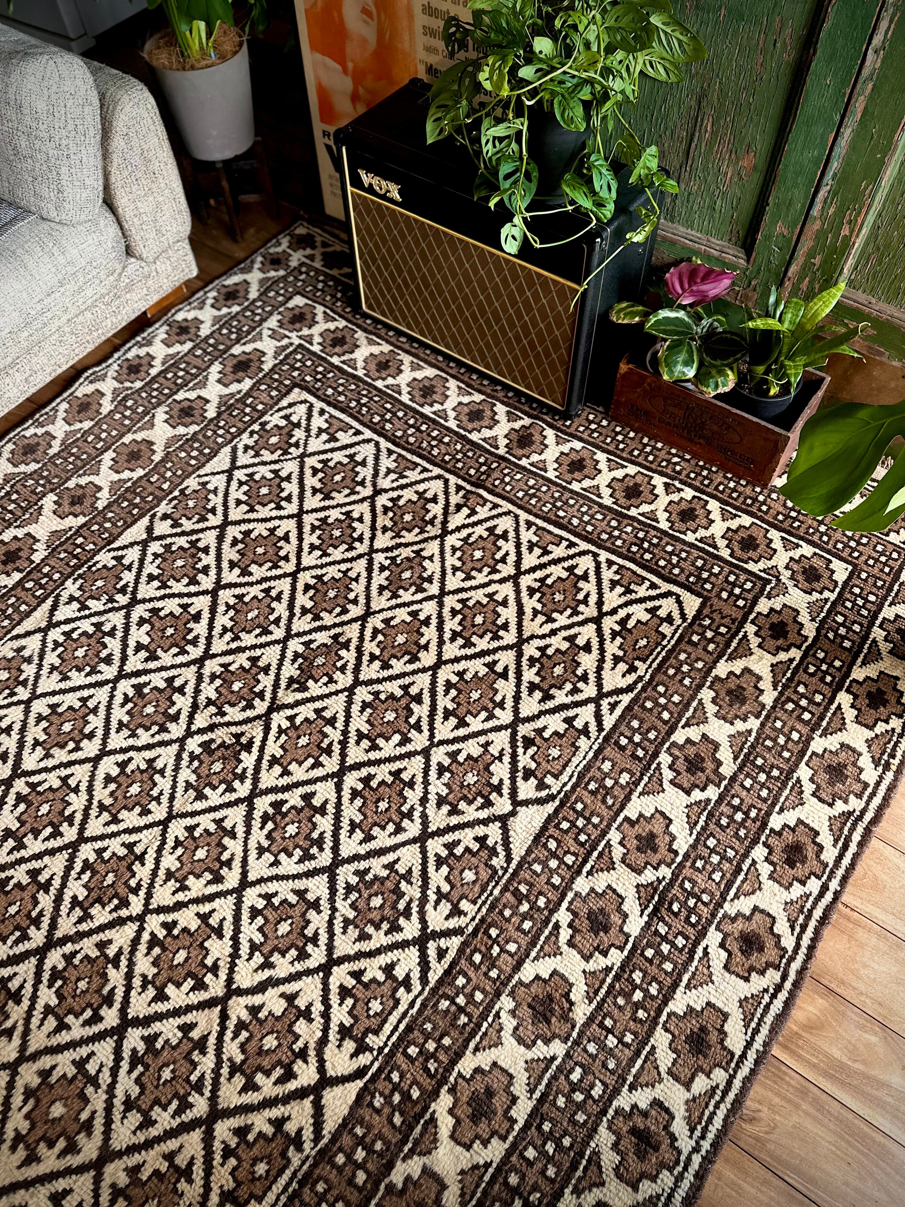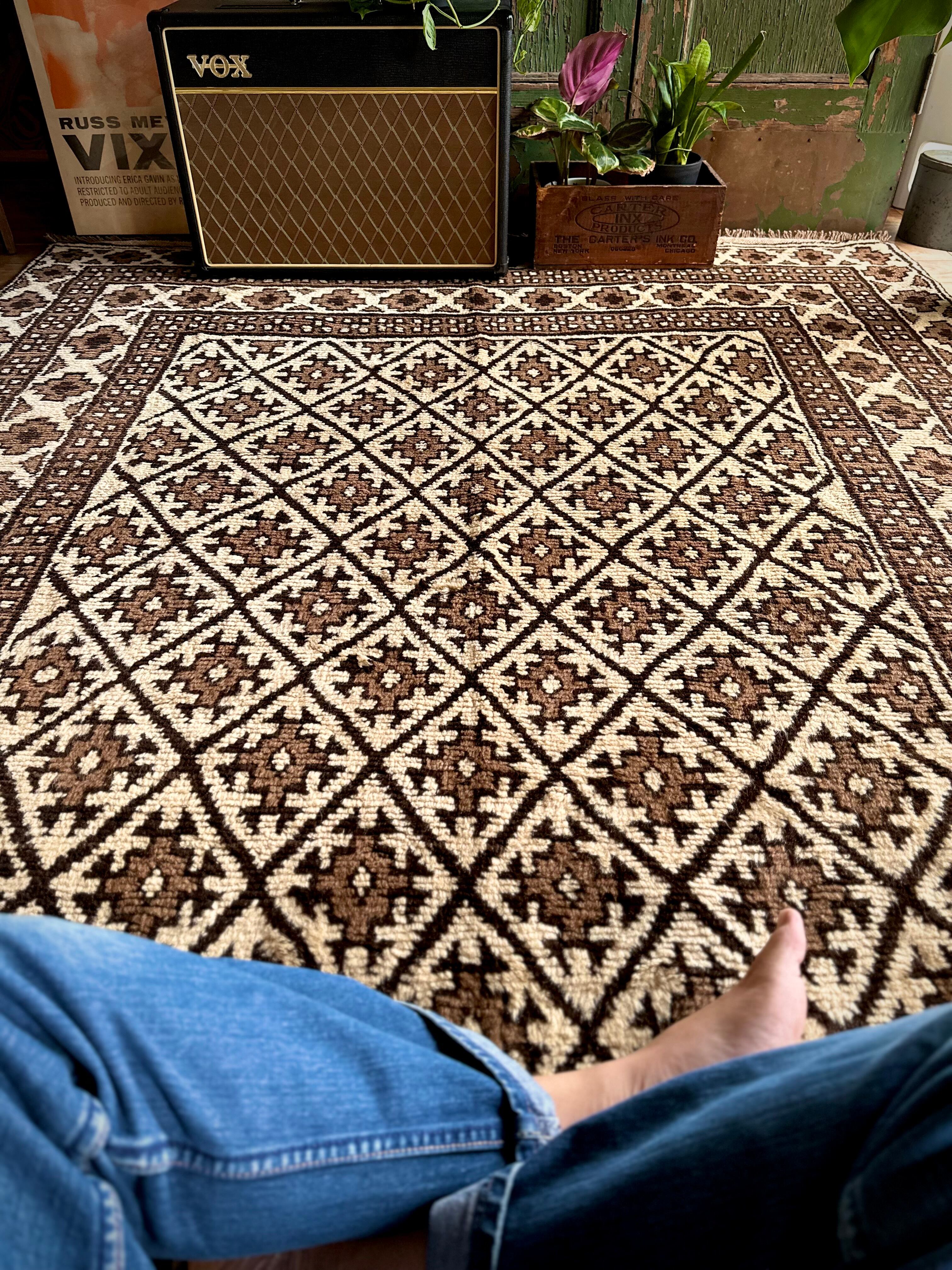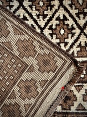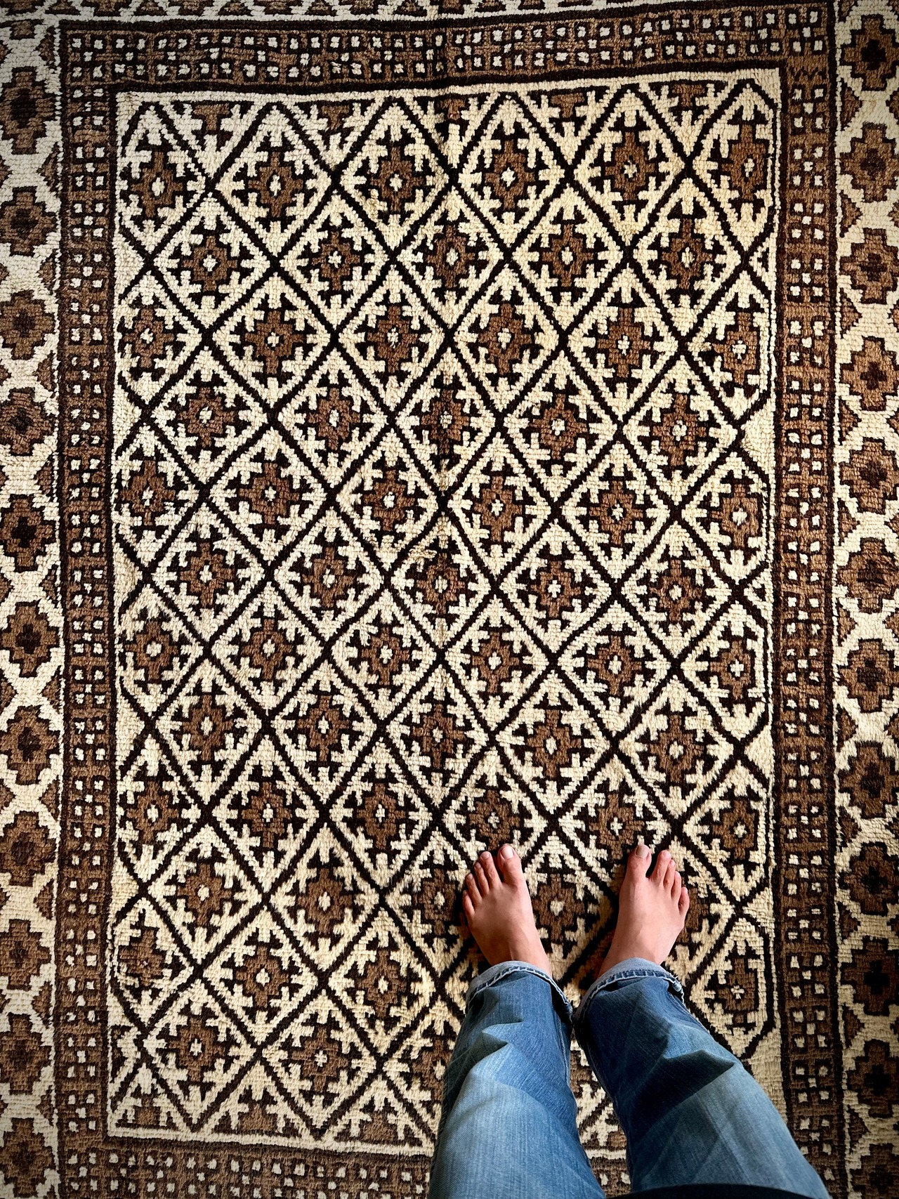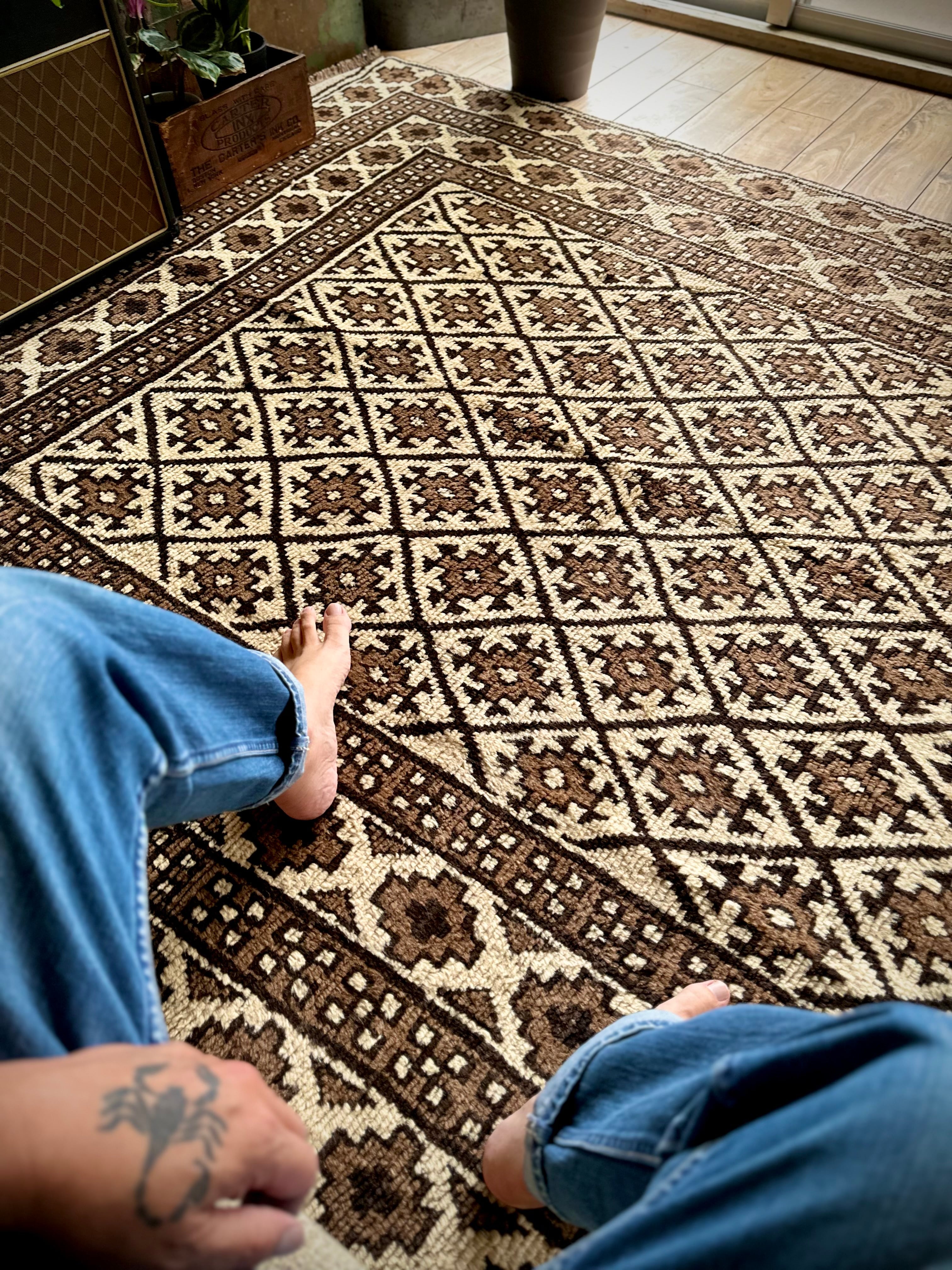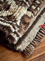 最後にラグそのものに関しては羊毛特有の匂いがあり、採寸は中央付近で計測していますが、手織りならではの歪みによる誤差や水洗いクリーニングによる縮み、また草木染めによる経年劣化の色ムラなどがありますが、それもまたヴィンテージラグの魅力かとご理解ください。