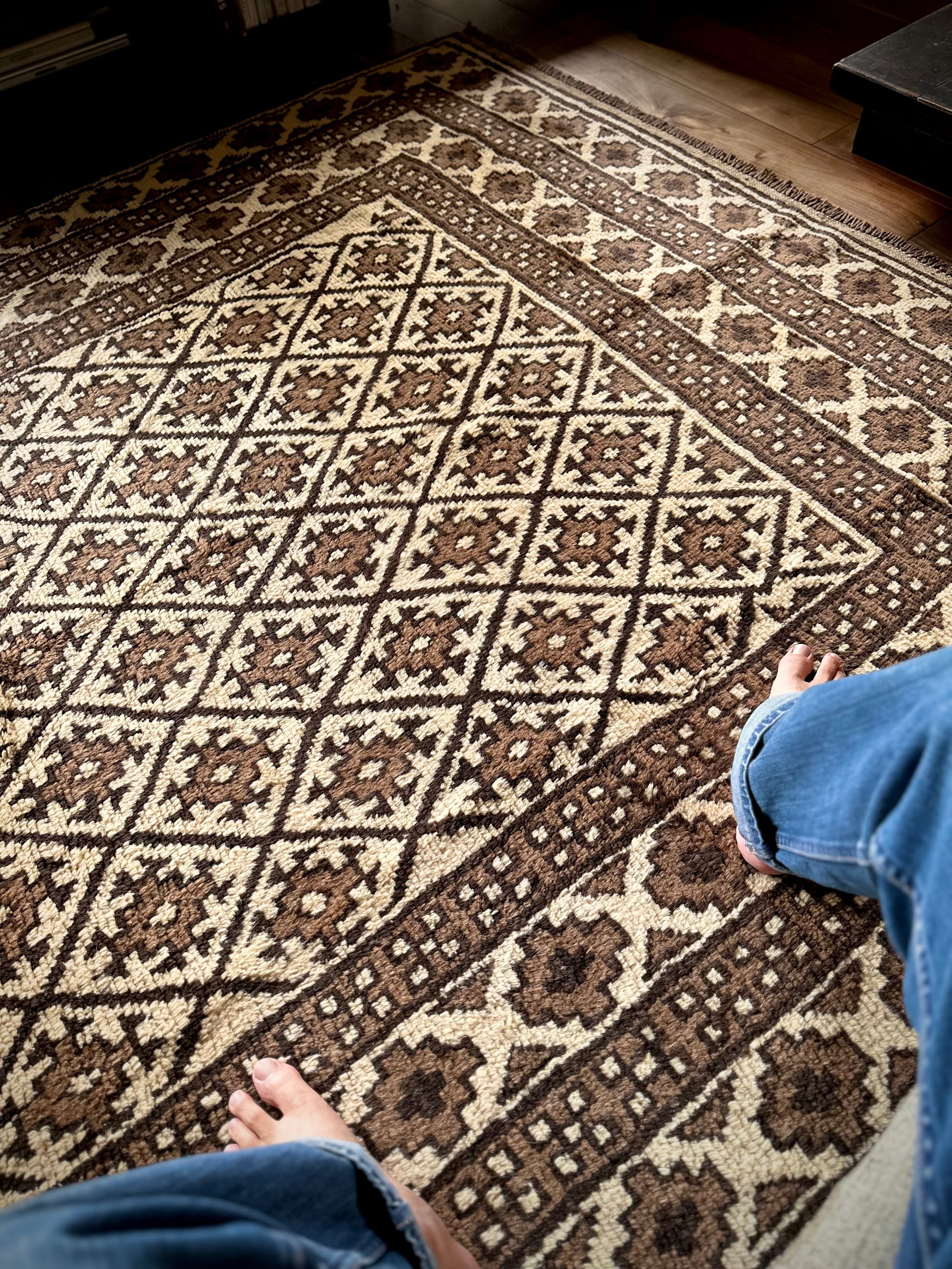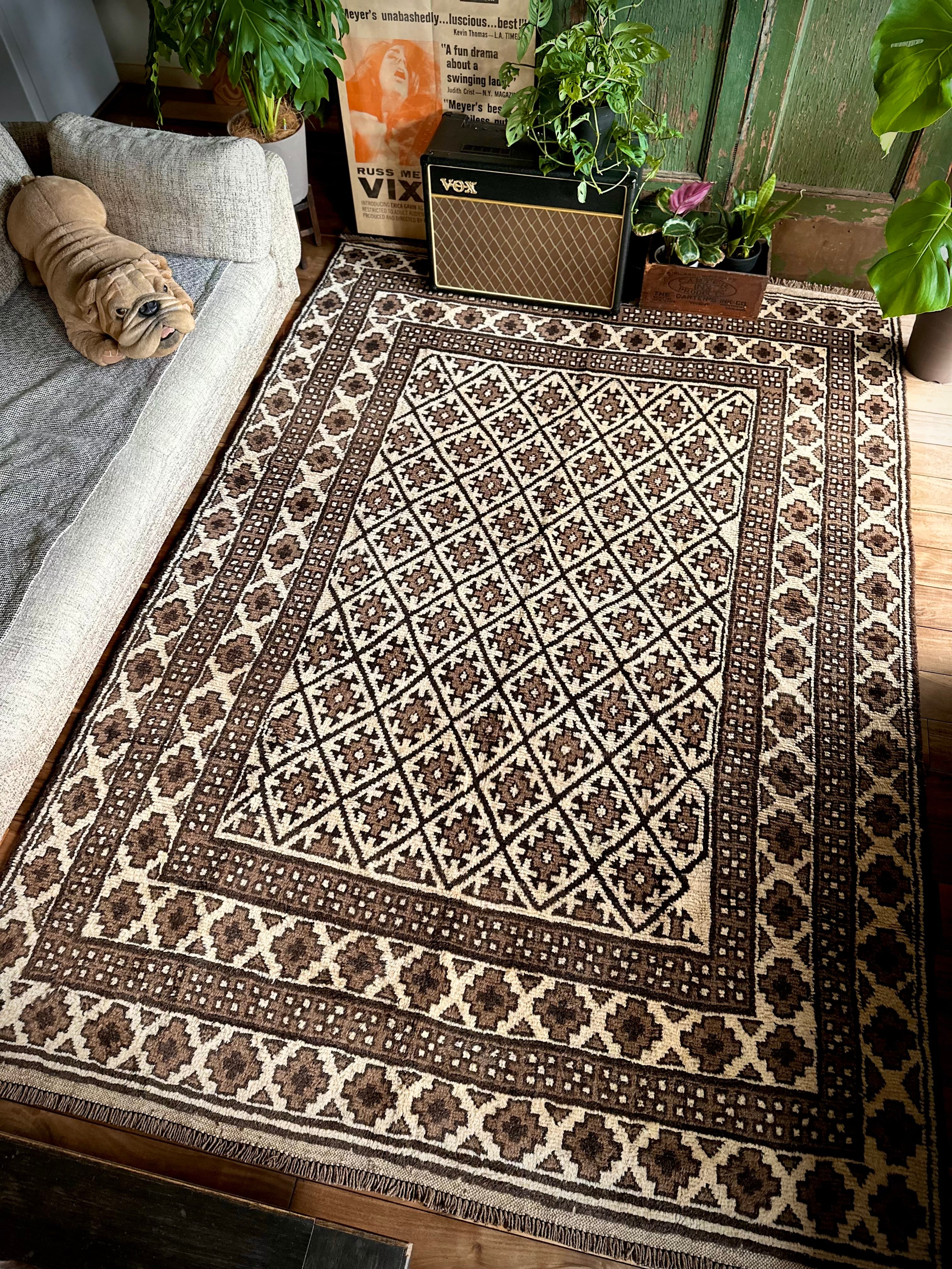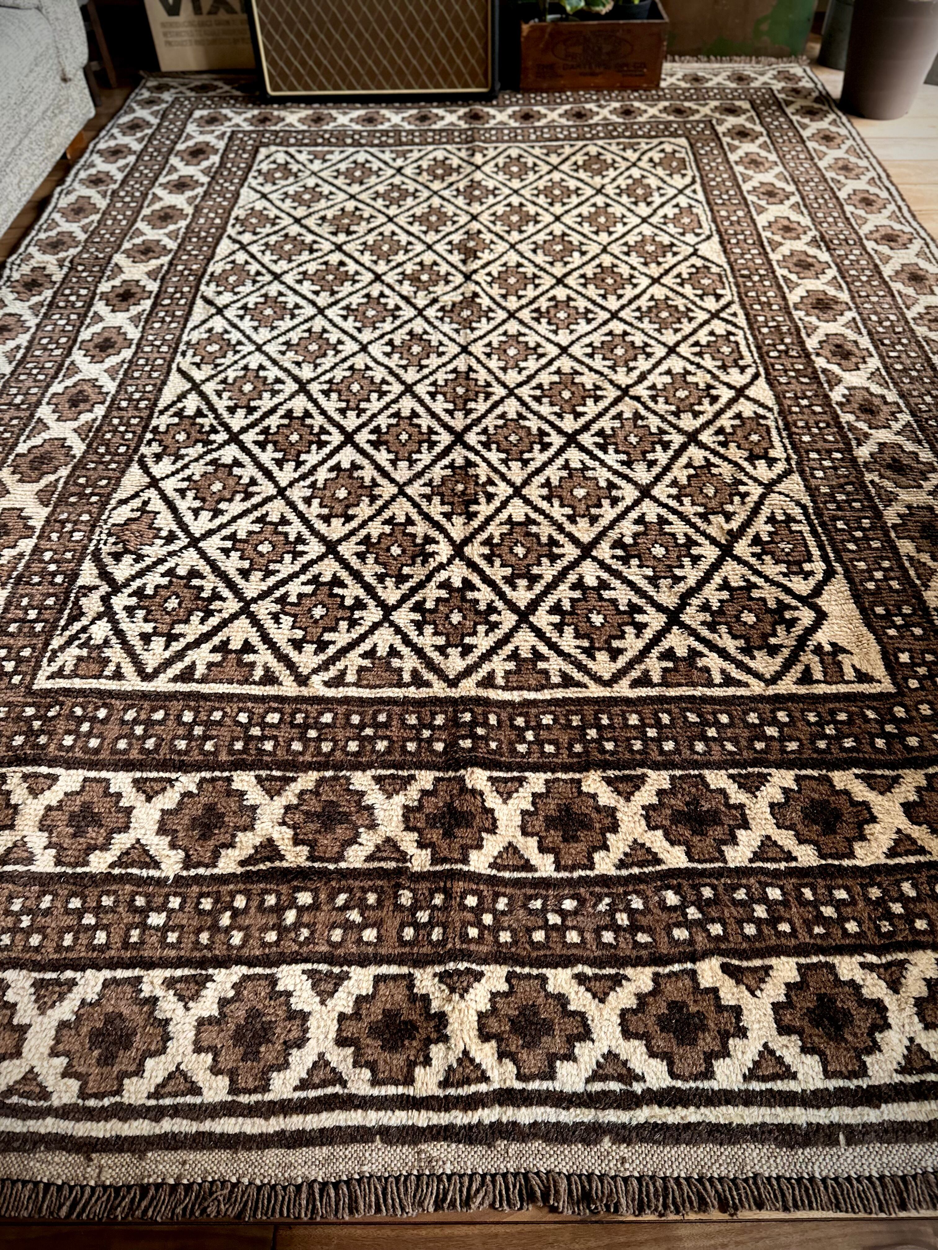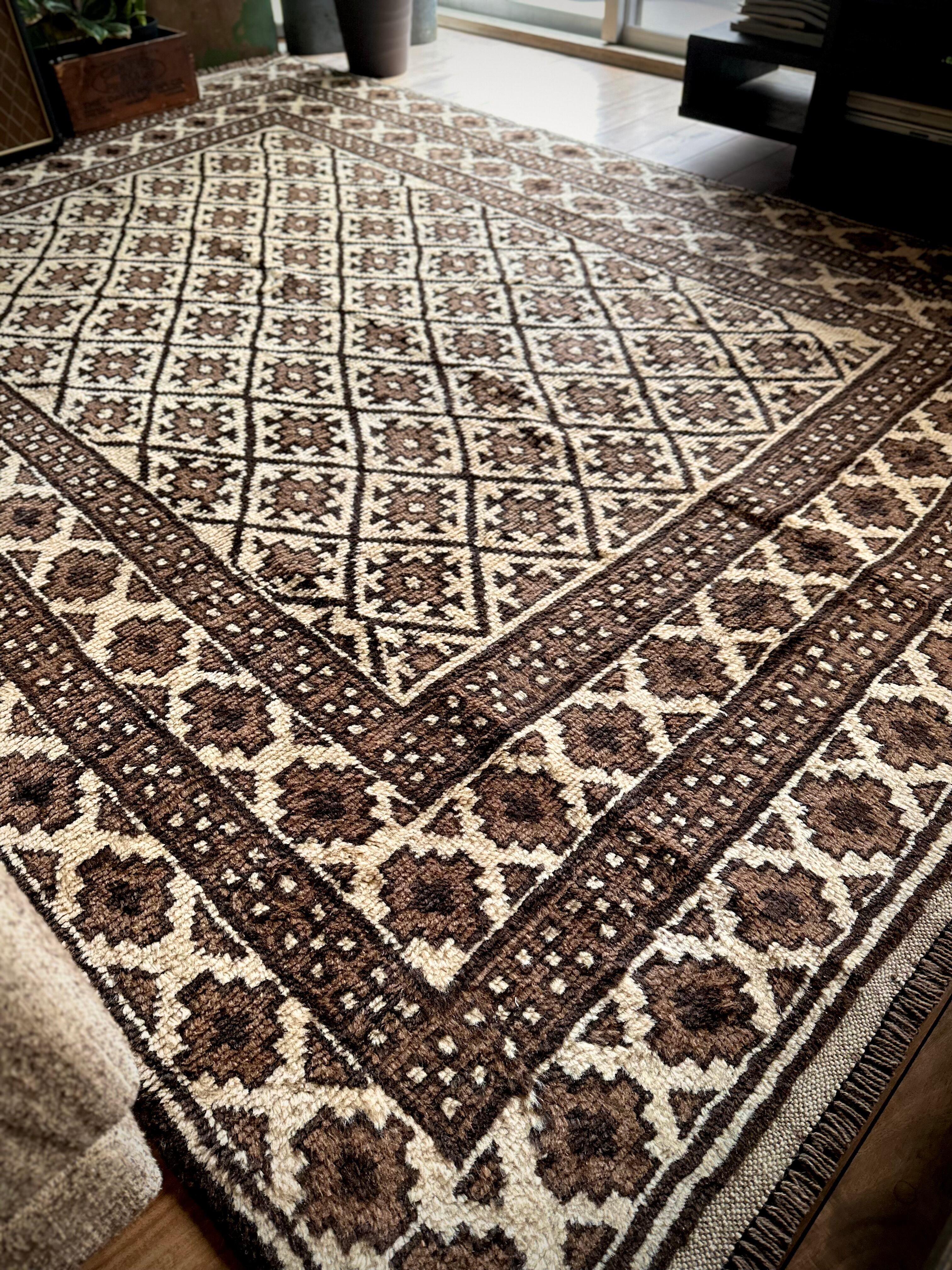 染められていない無染色な原毛のナチュラルカラーに、バイアスチェック柄に嵌め込まれた紋章が目を惹くこちらは、アフガニスタンはヘラート州にて遊牧生活を送るタイマニ族のトライバルラグで、ざっくりとした荒い織りながらもソフトな質感で温かみのあるプリミティブなラグになります。