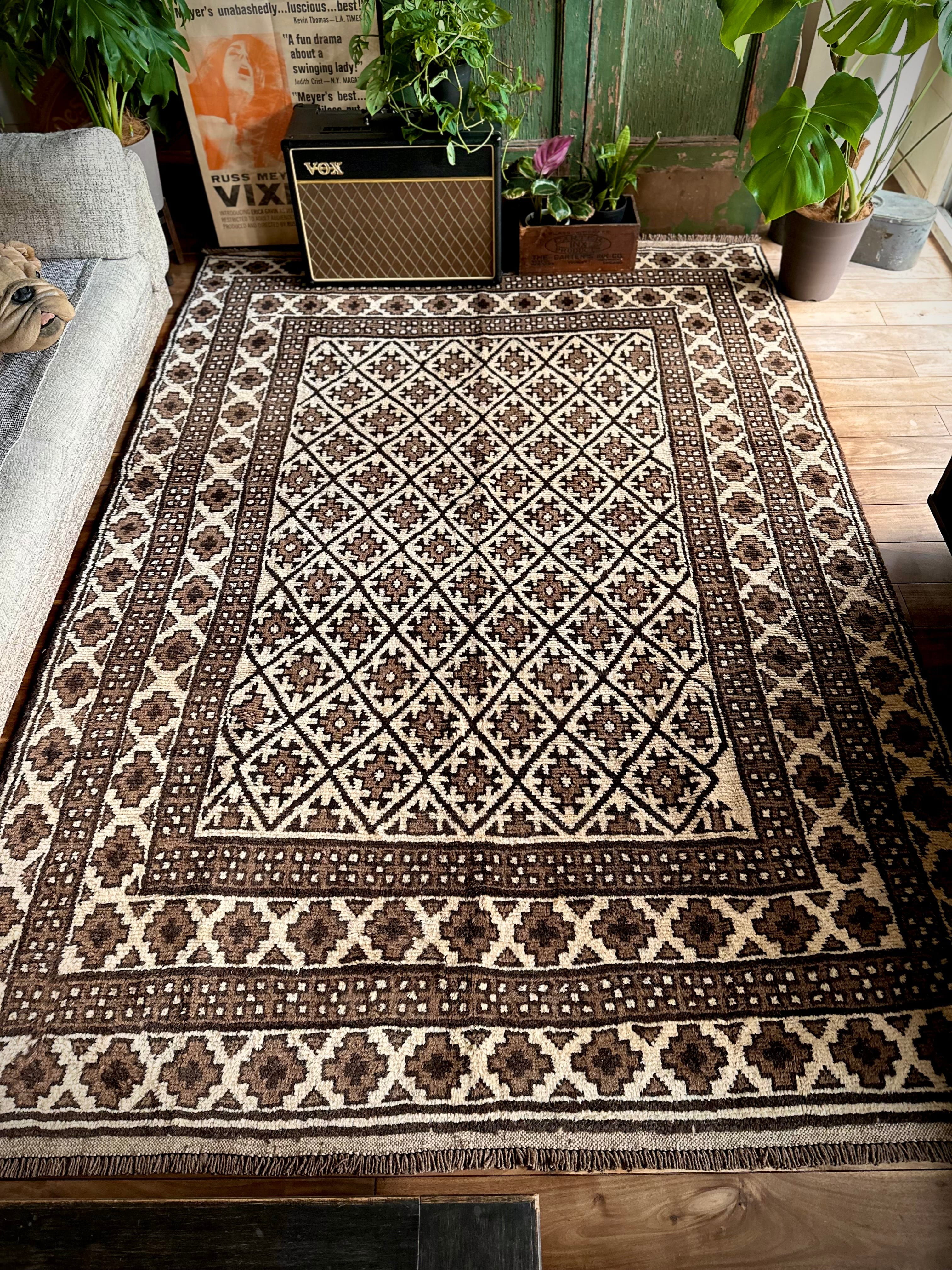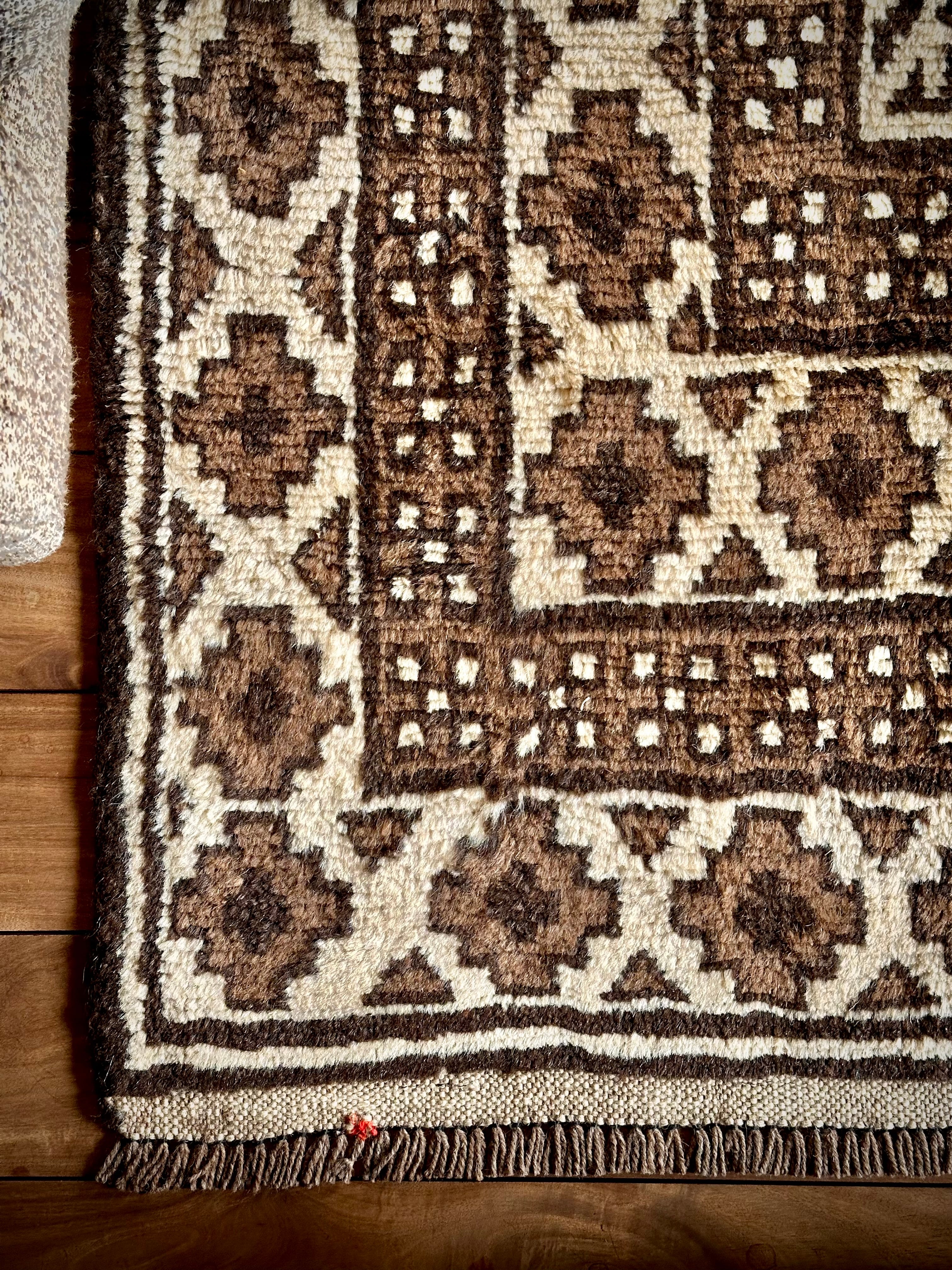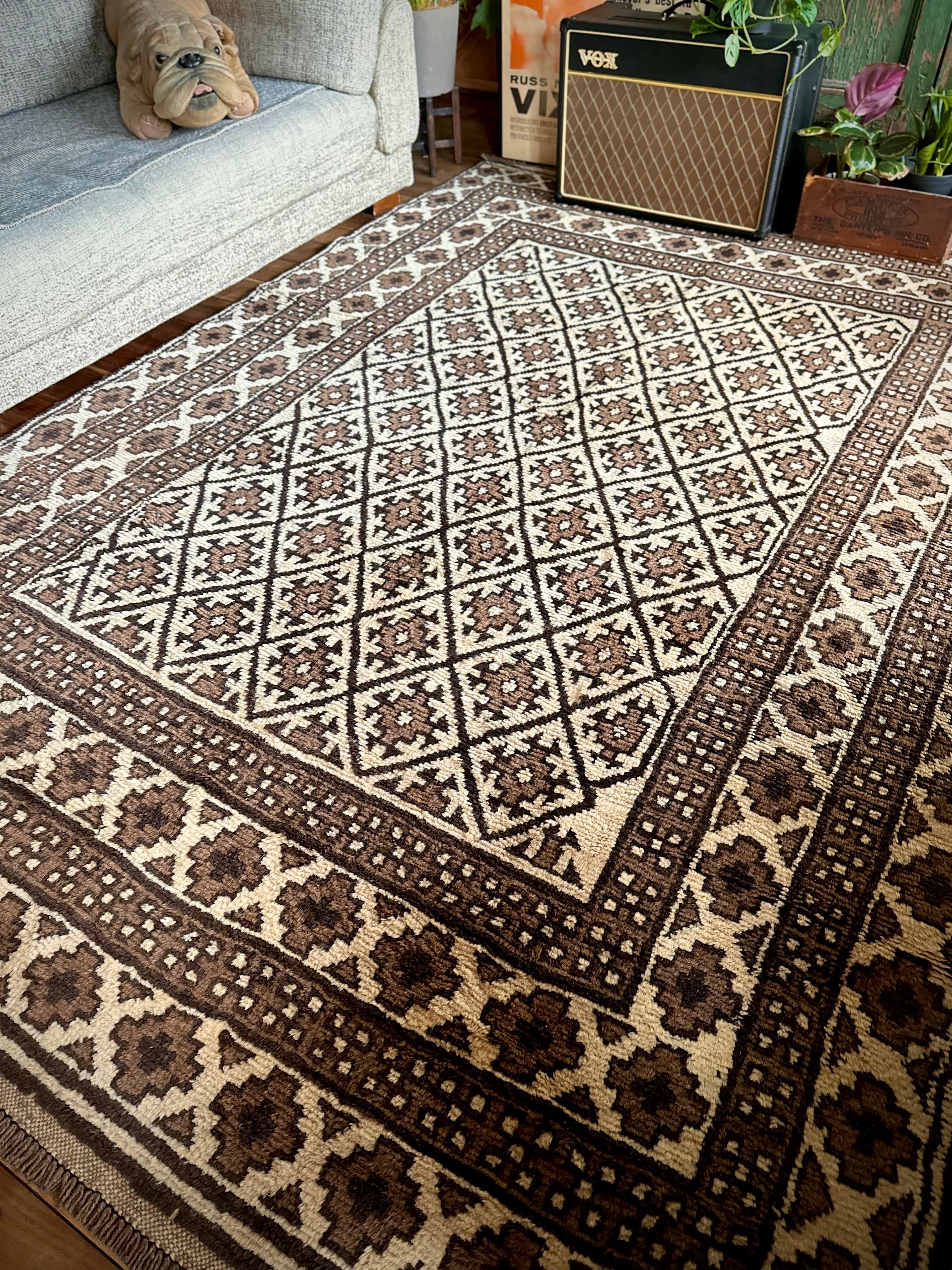 染められていない無染色な原毛のナチュラルカラーに、バイアスチェック柄に嵌め込まれた紋章が目を惹くこちらは、アフガニスタンはヘラート州にて遊牧生活を送るタイマニ族のトライバルラグで、ざっくりとした荒い織りながらもソフトな質感で温かみのあるプリミティブなラグになります。