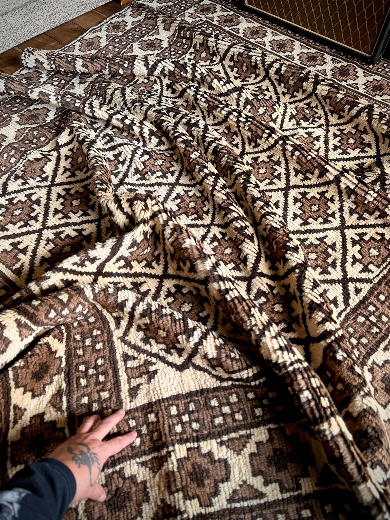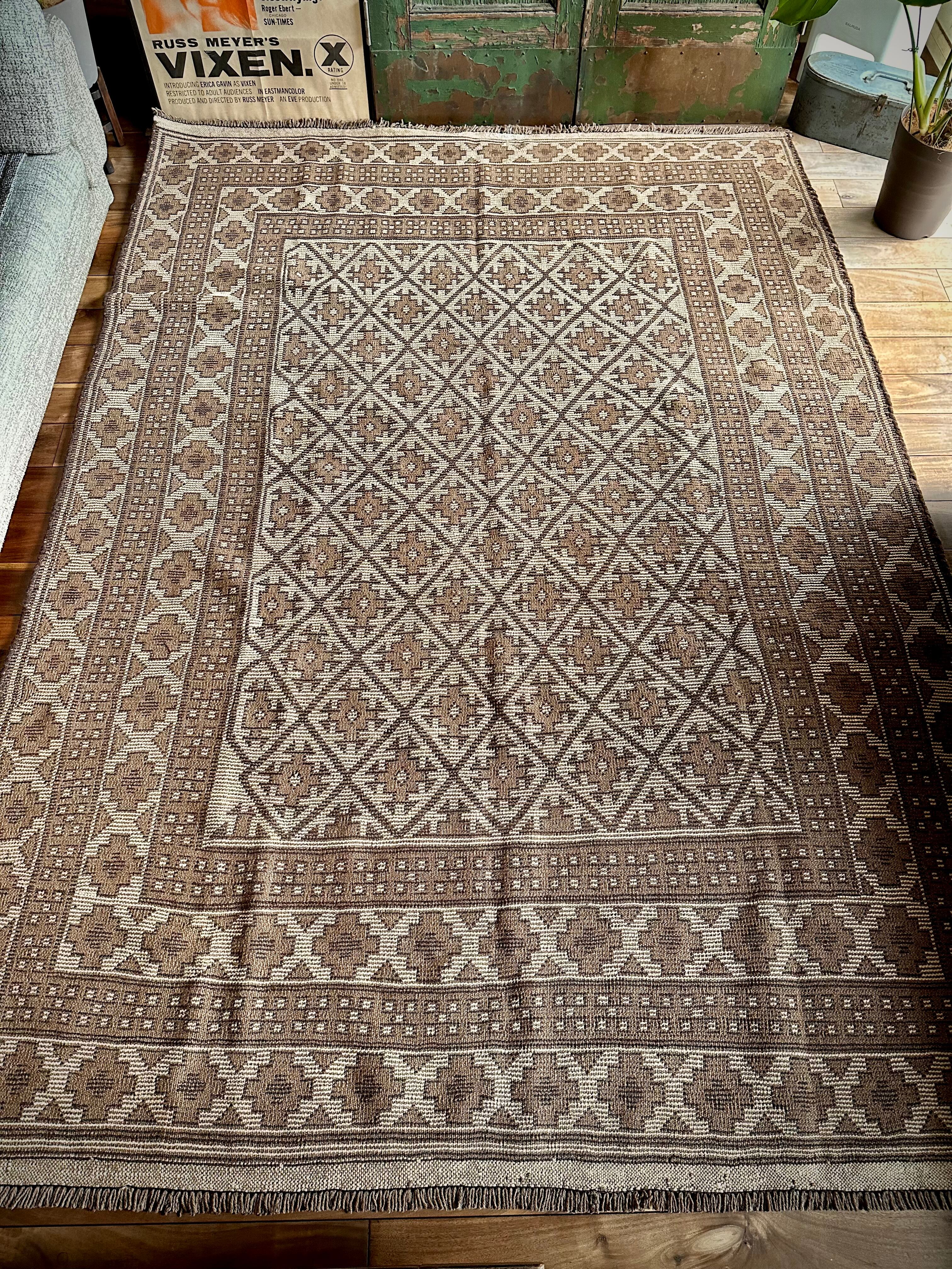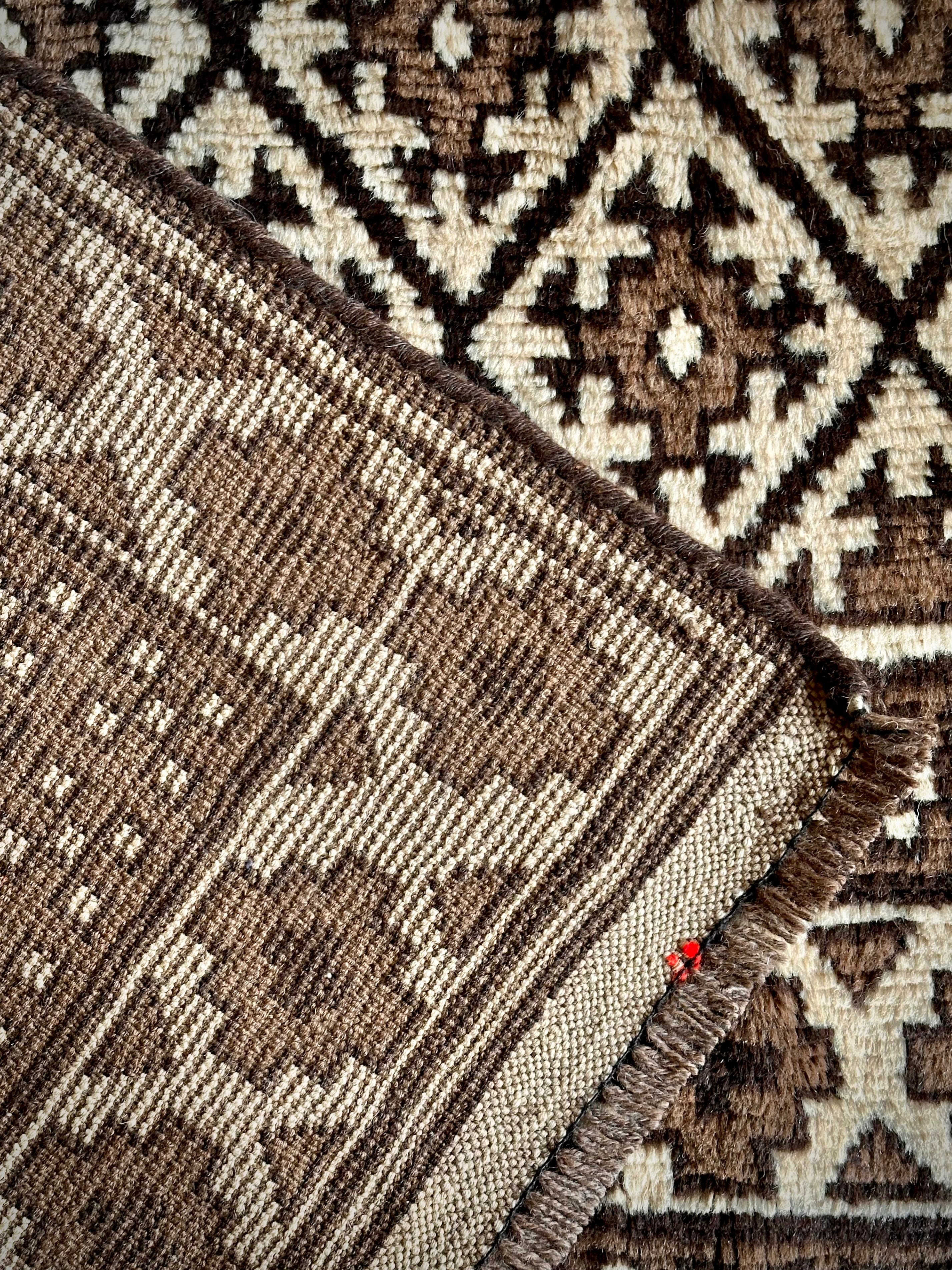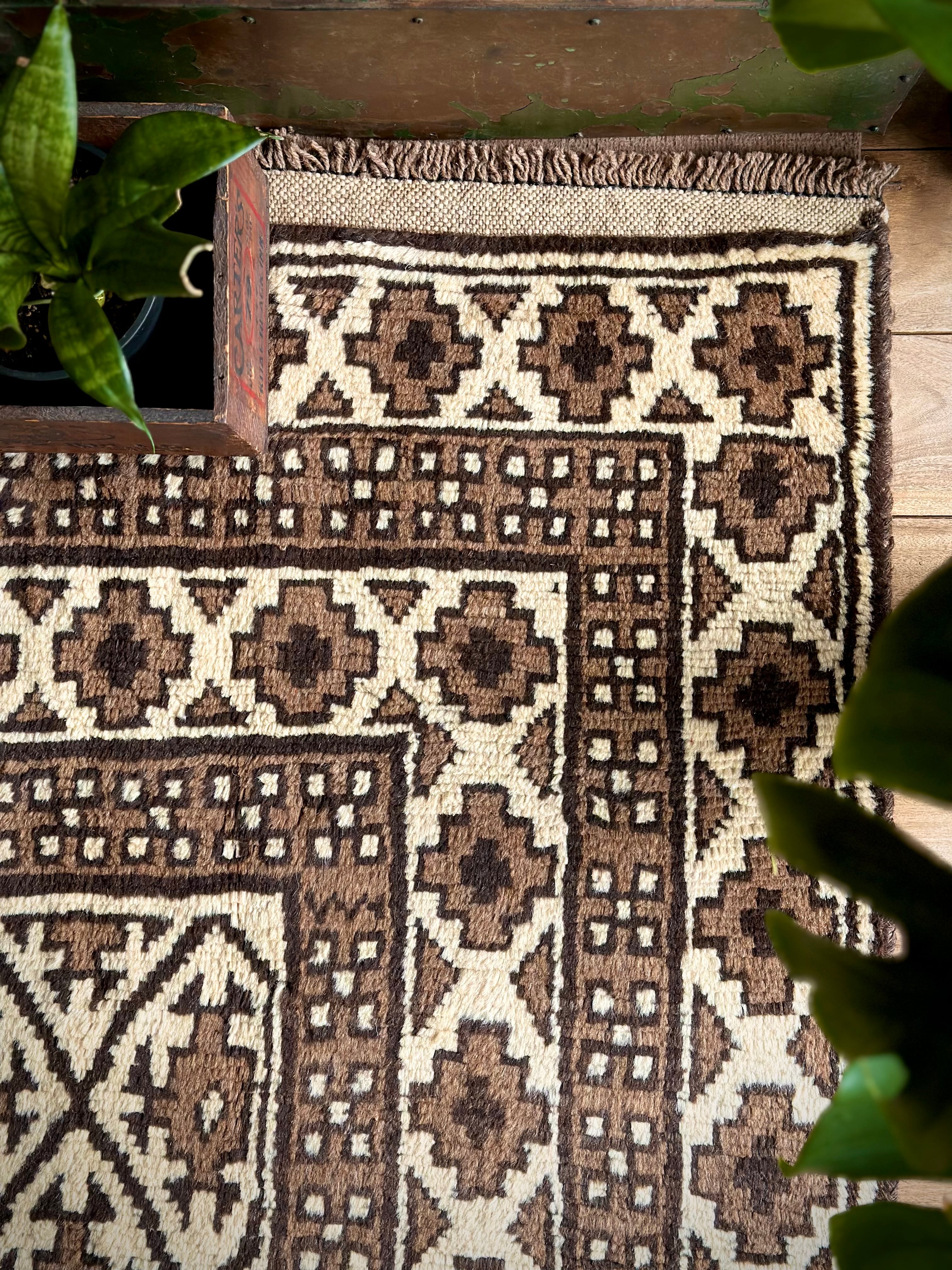 染められていない無染色な原毛のナチュラルカラーに、バイアスチェック柄に嵌め込まれた紋章が目を惹くこちらは、アフガニスタンはヘラート州にて遊牧生活を送るタイマニ族のトライバルラグで、ざっくりとした荒い織りながらもソフトな質感で温かみのあるプリミティブなラグになります。