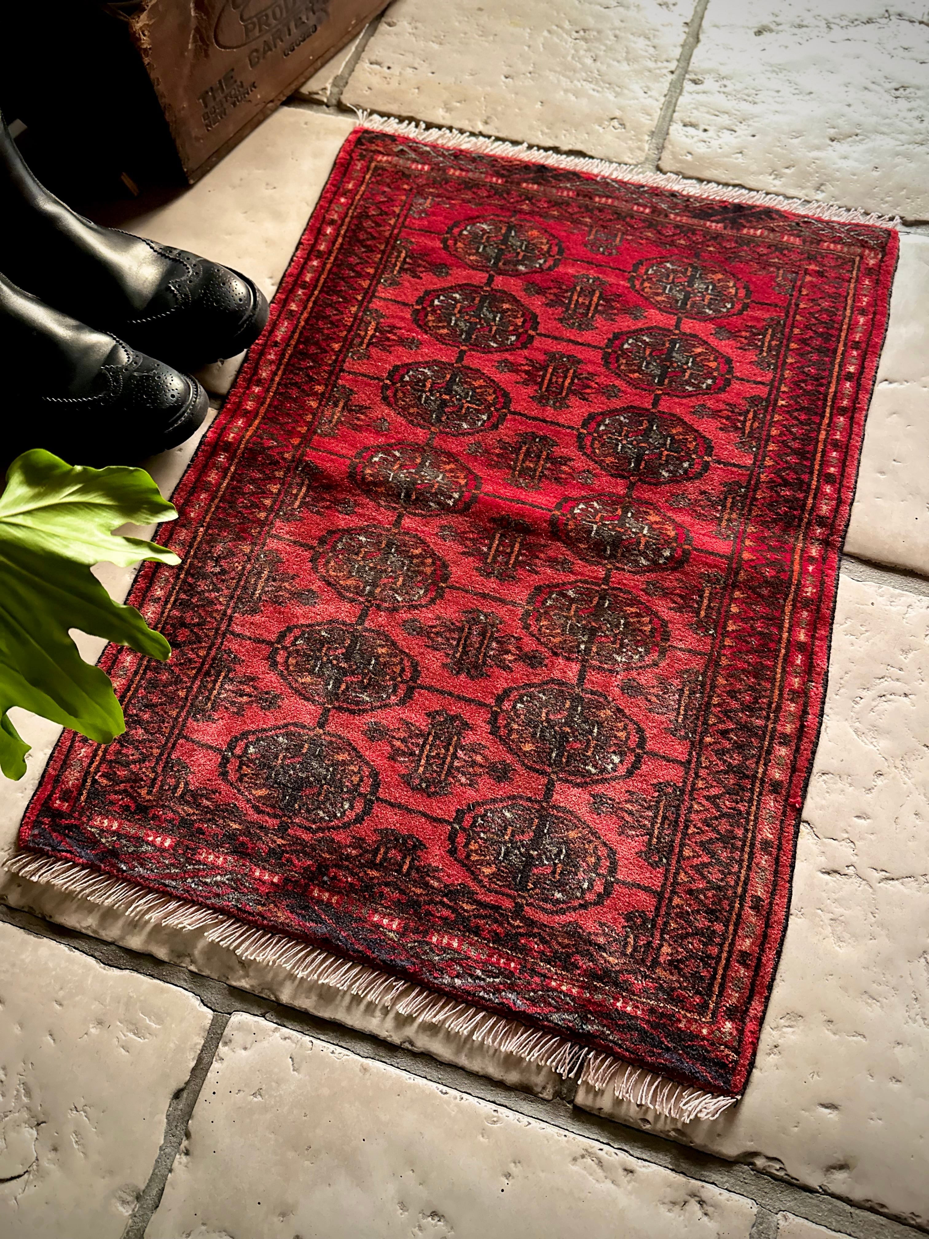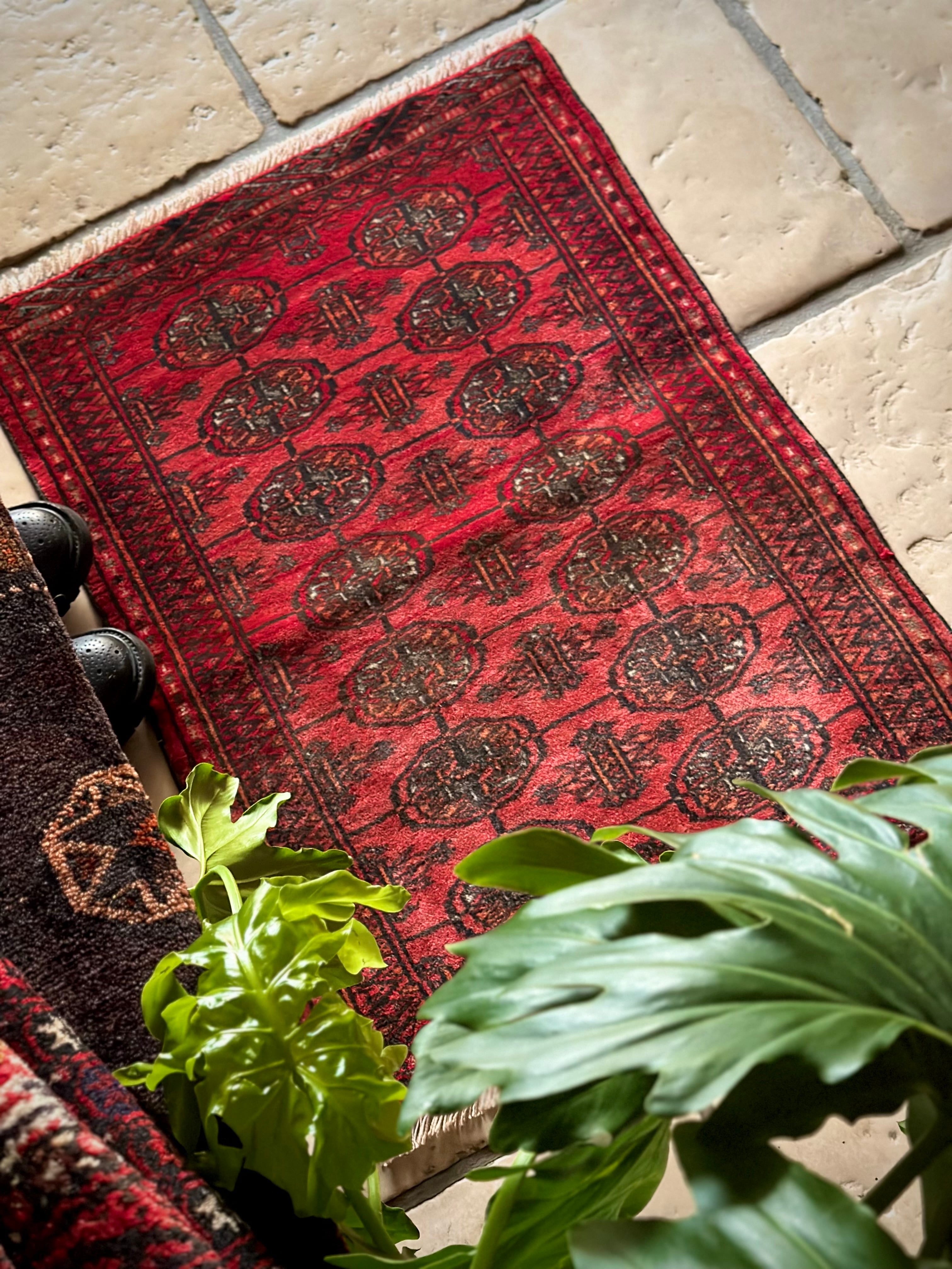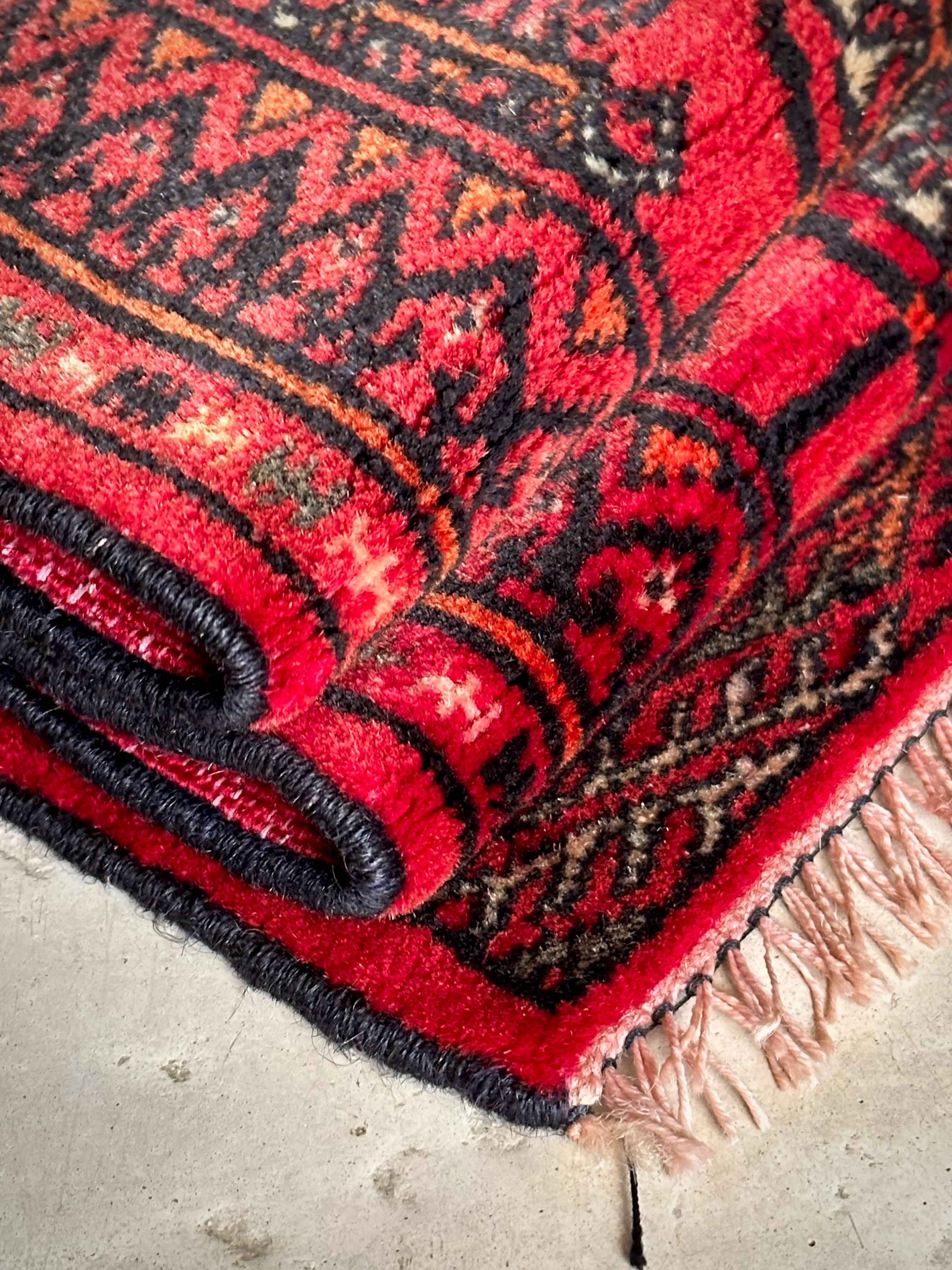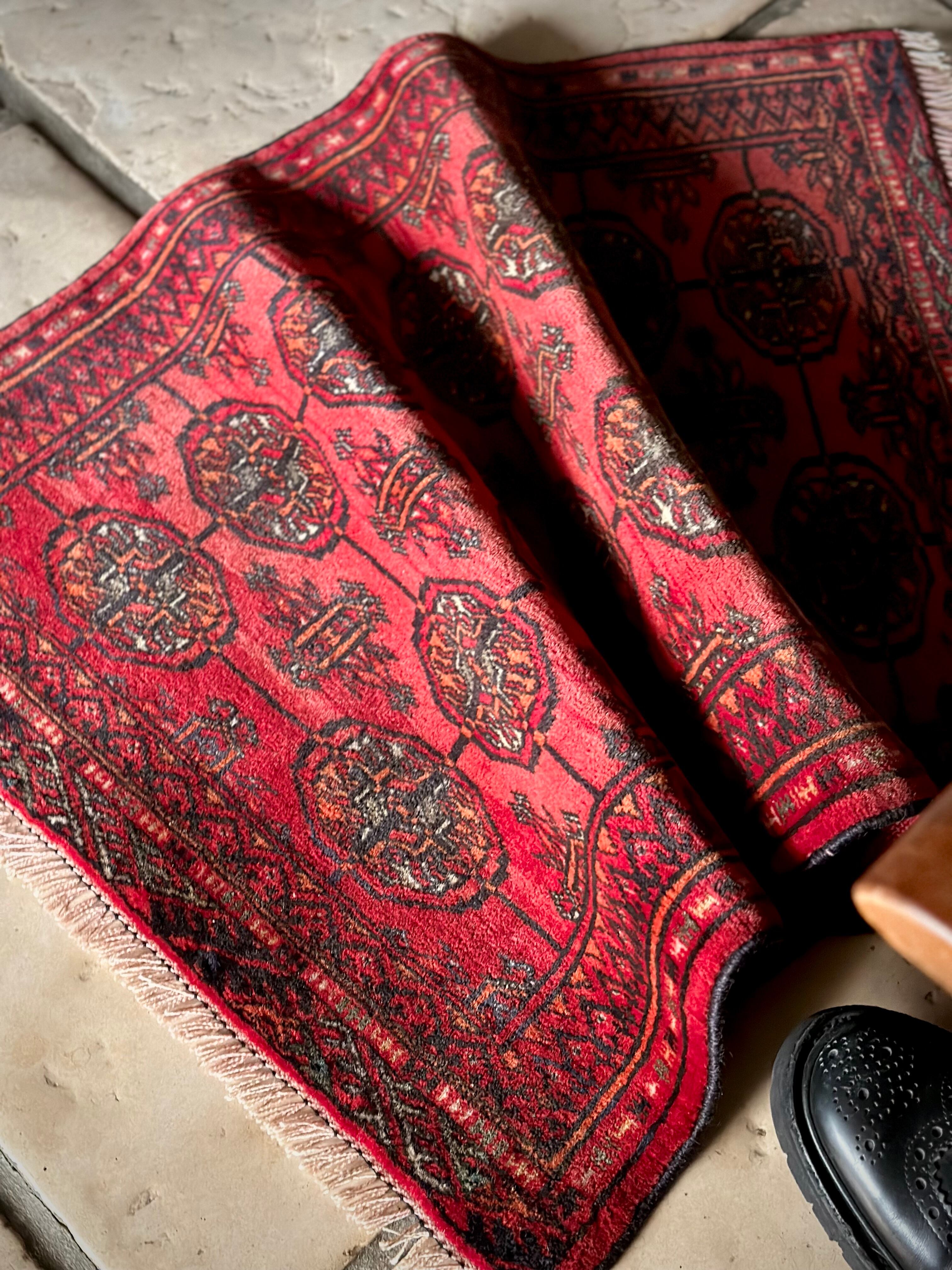 こじんまりとした真っ赤な見覚えのあるこちらは、一見してトルクメンのいつものヤツかと思いきや、なんとイラン東部に居住するバルーチ族のトライバルラグで、異部族間交流によって産まれた心温まる1枚になります。