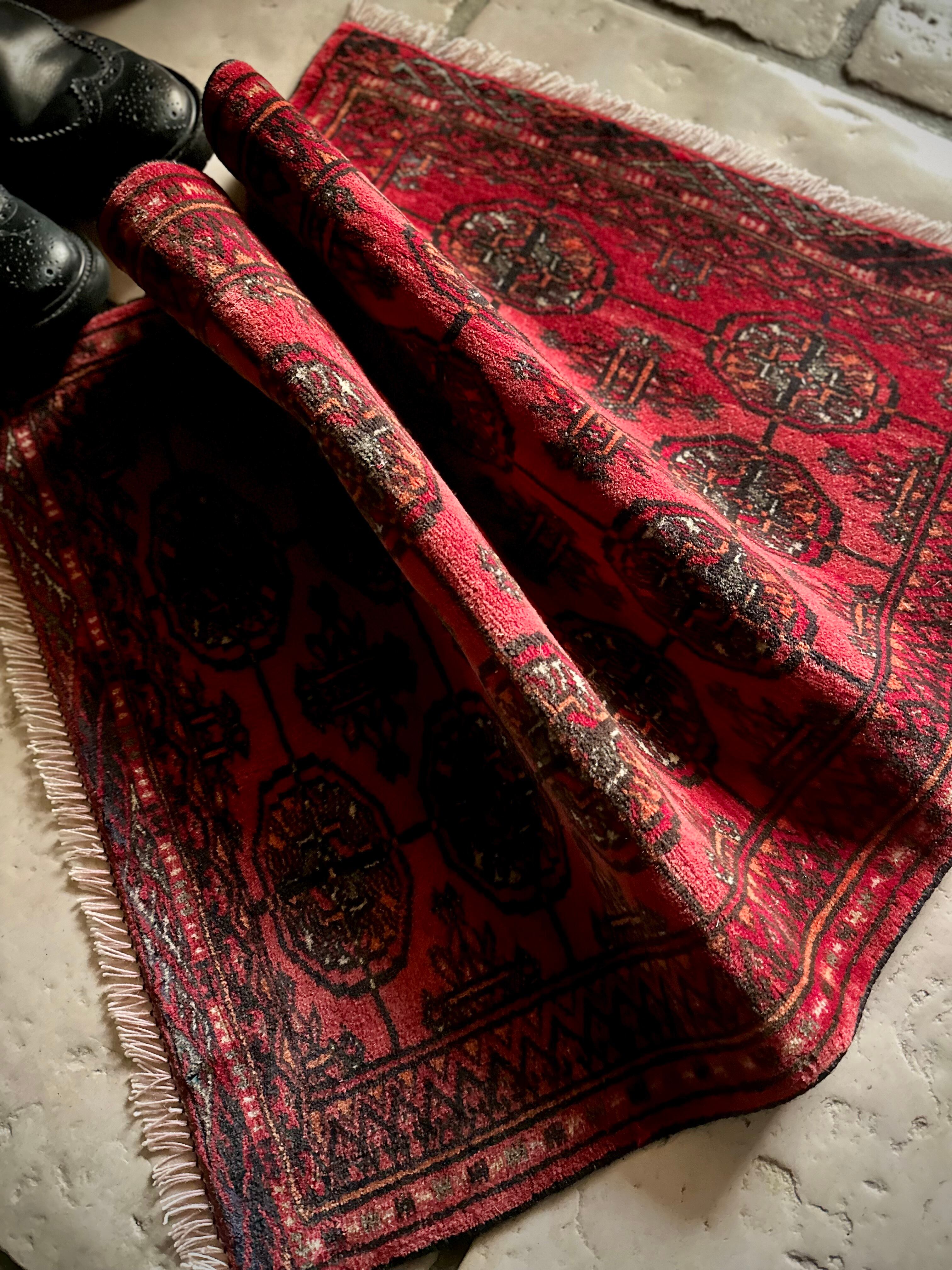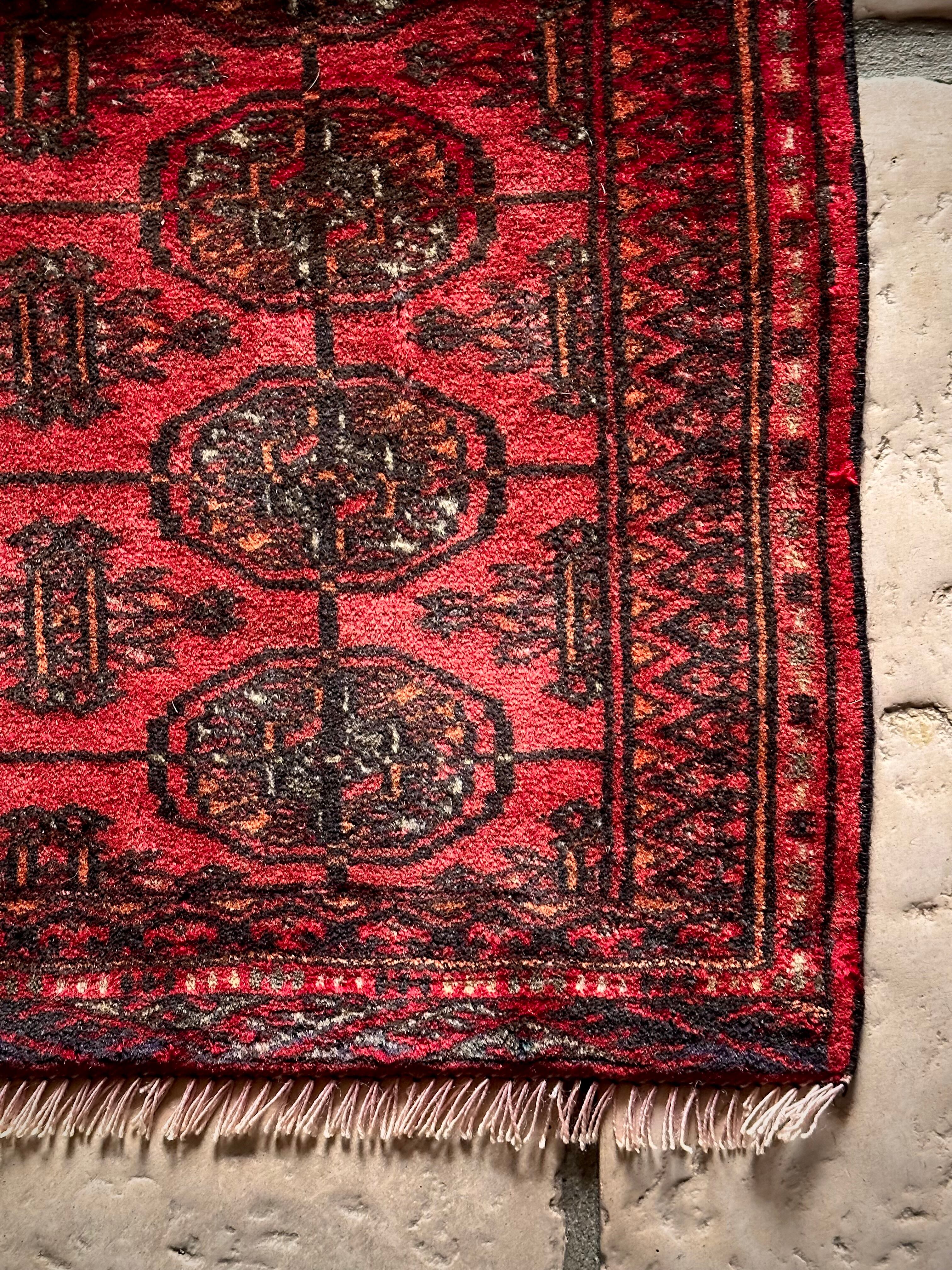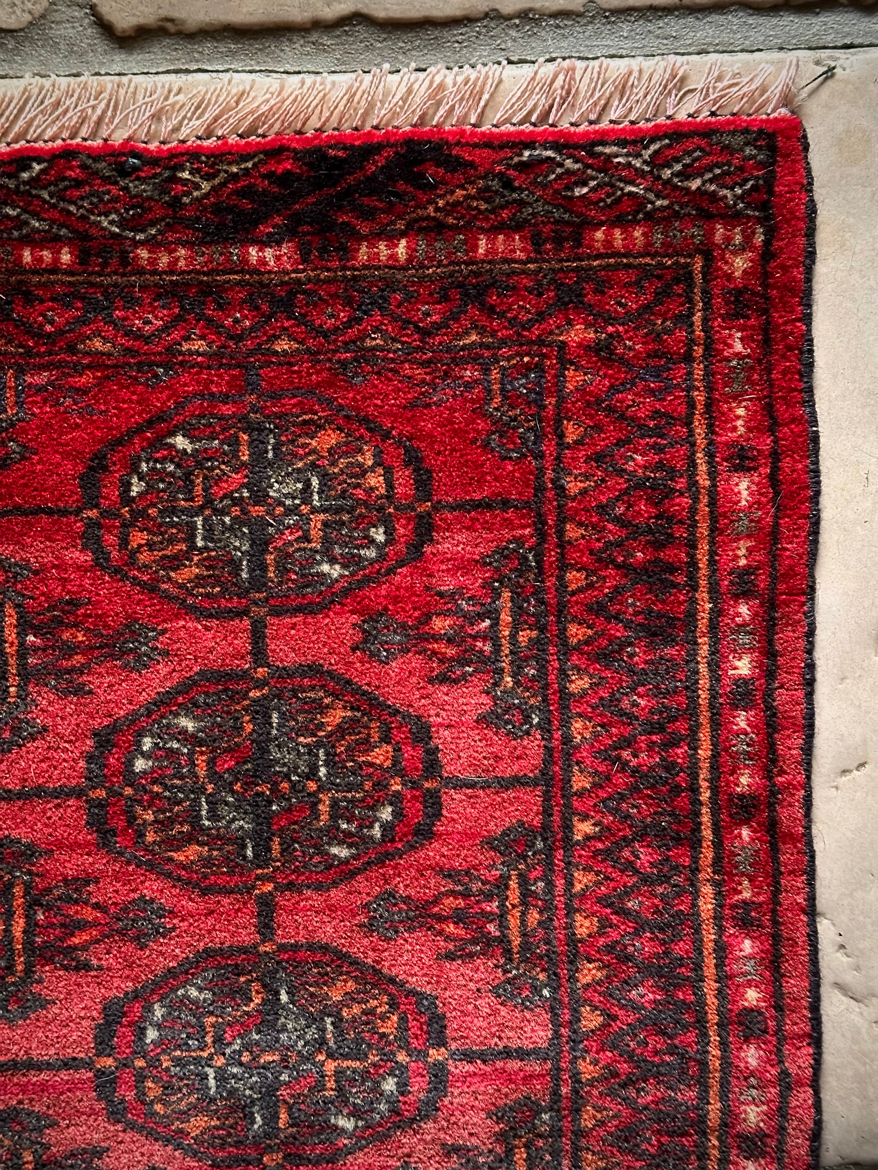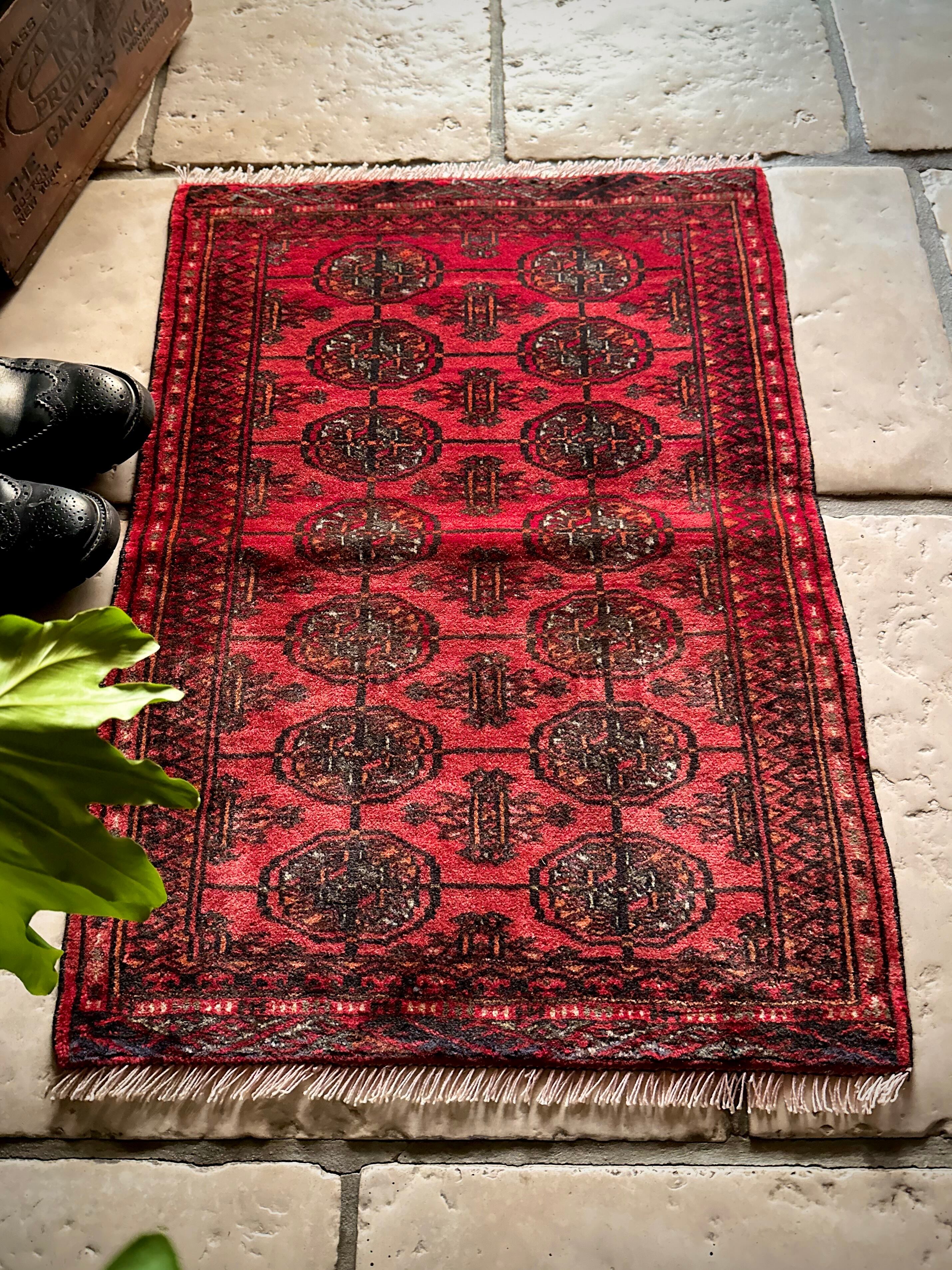 こじんまりとした真っ赤な見覚えのあるこちらは、一見してトルクメンのいつものヤツかと思いきや、なんとイラン東部に居住するバルーチ族のトライバルラグで、異部族間交流によって産まれた心温まる1枚になります。
