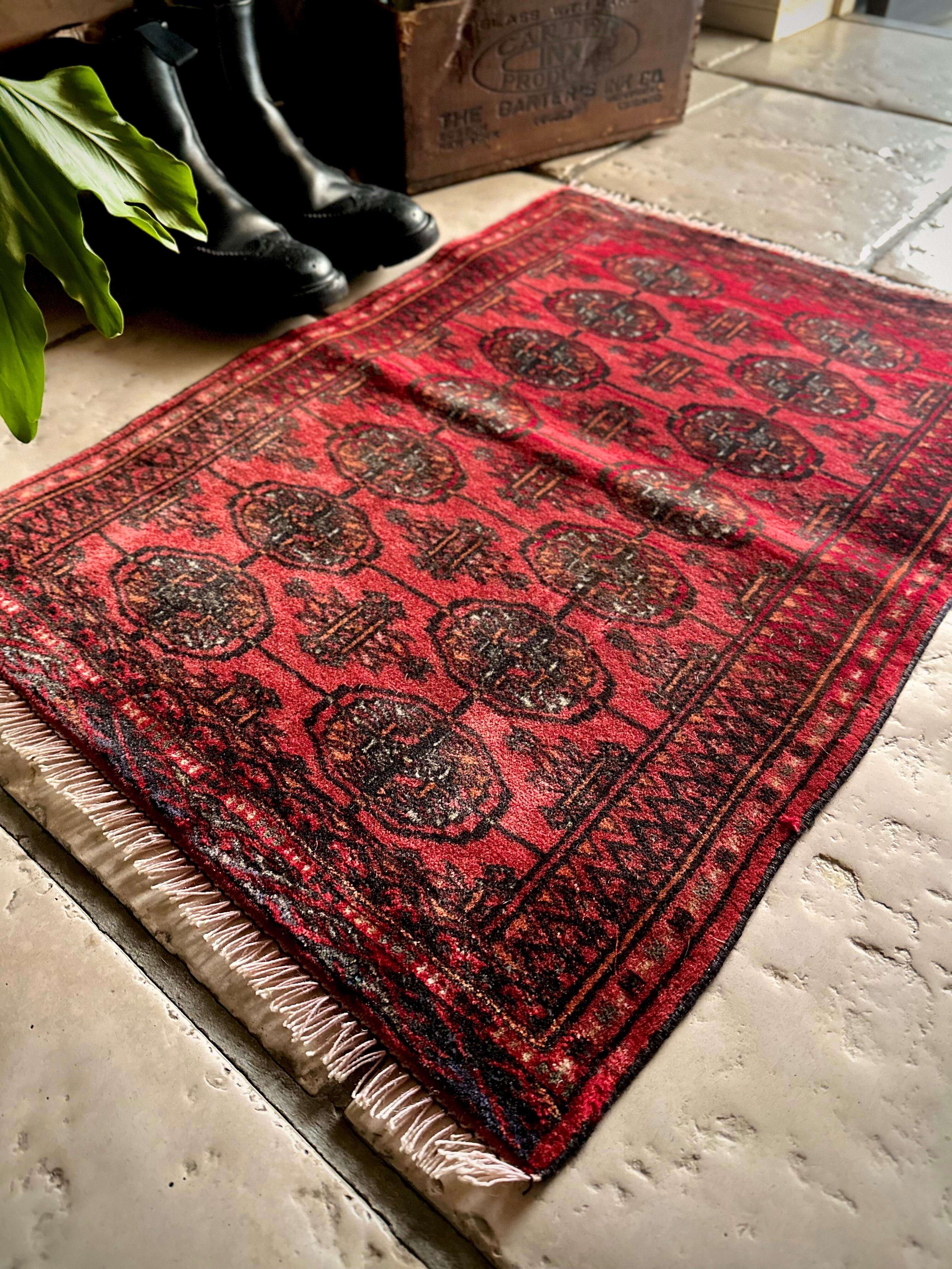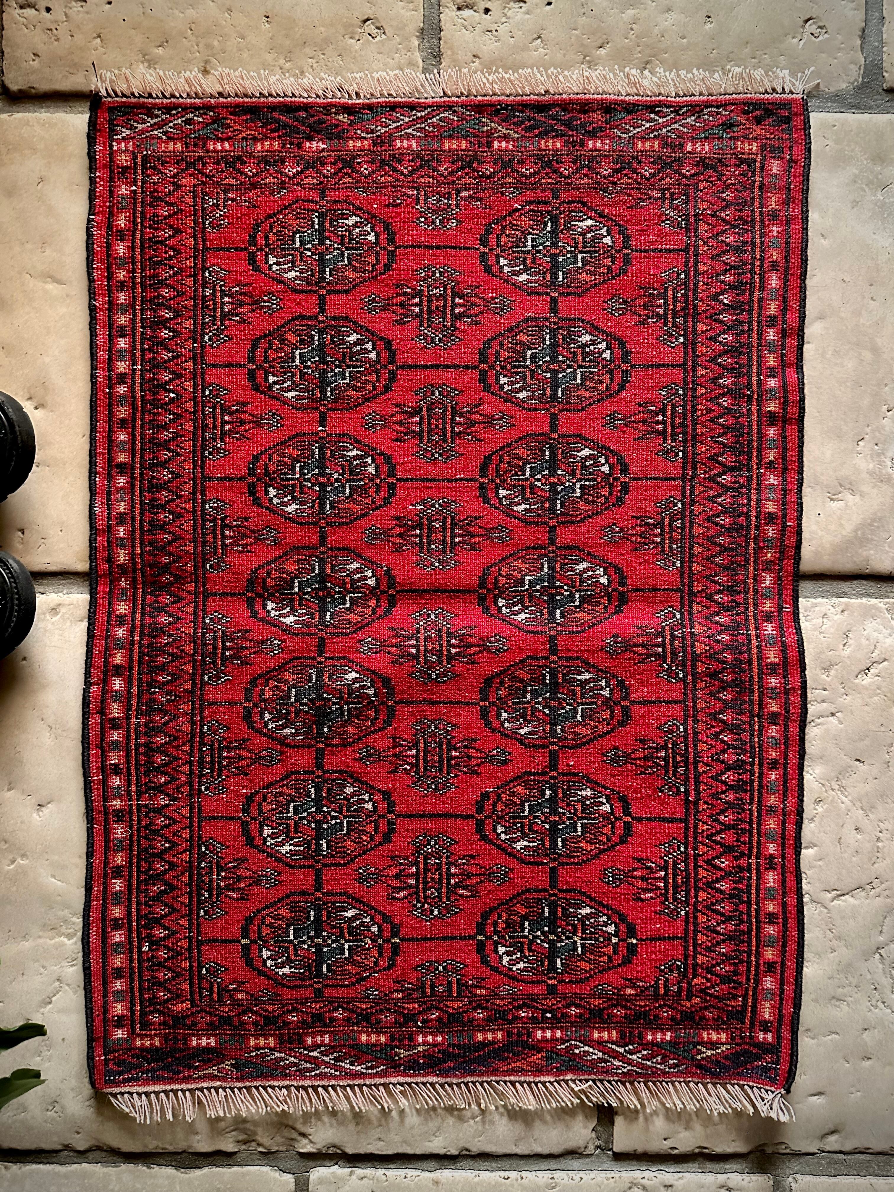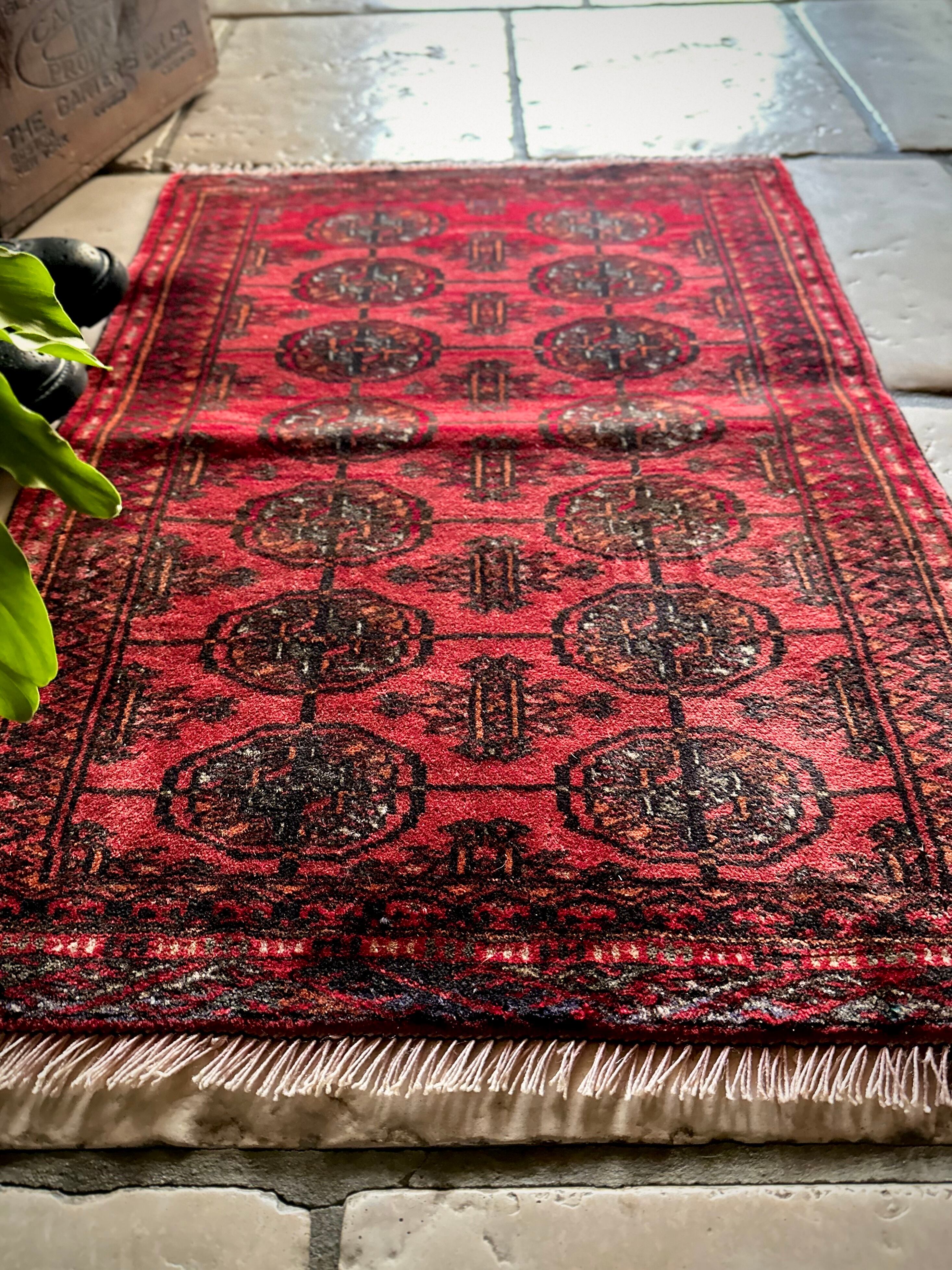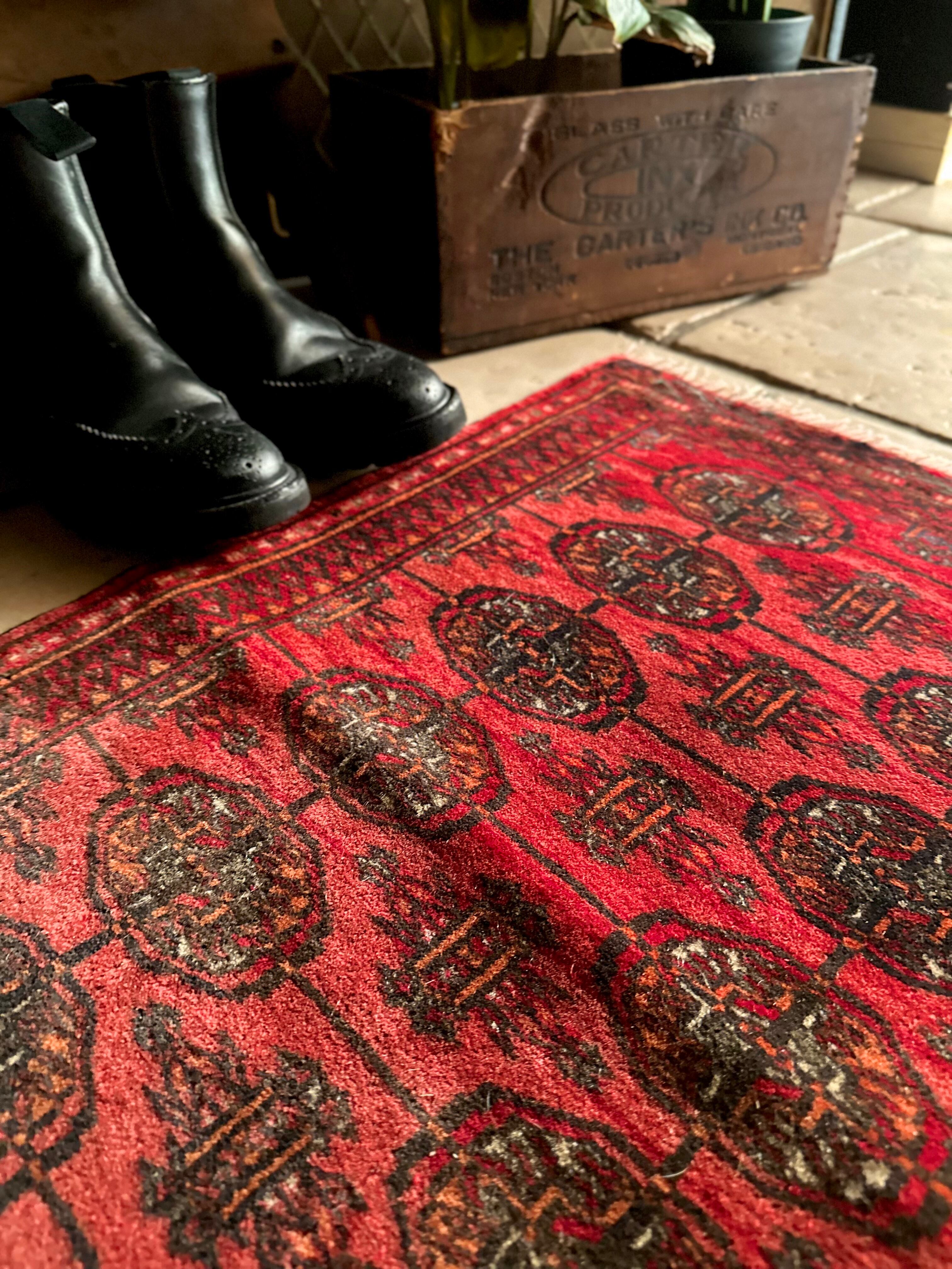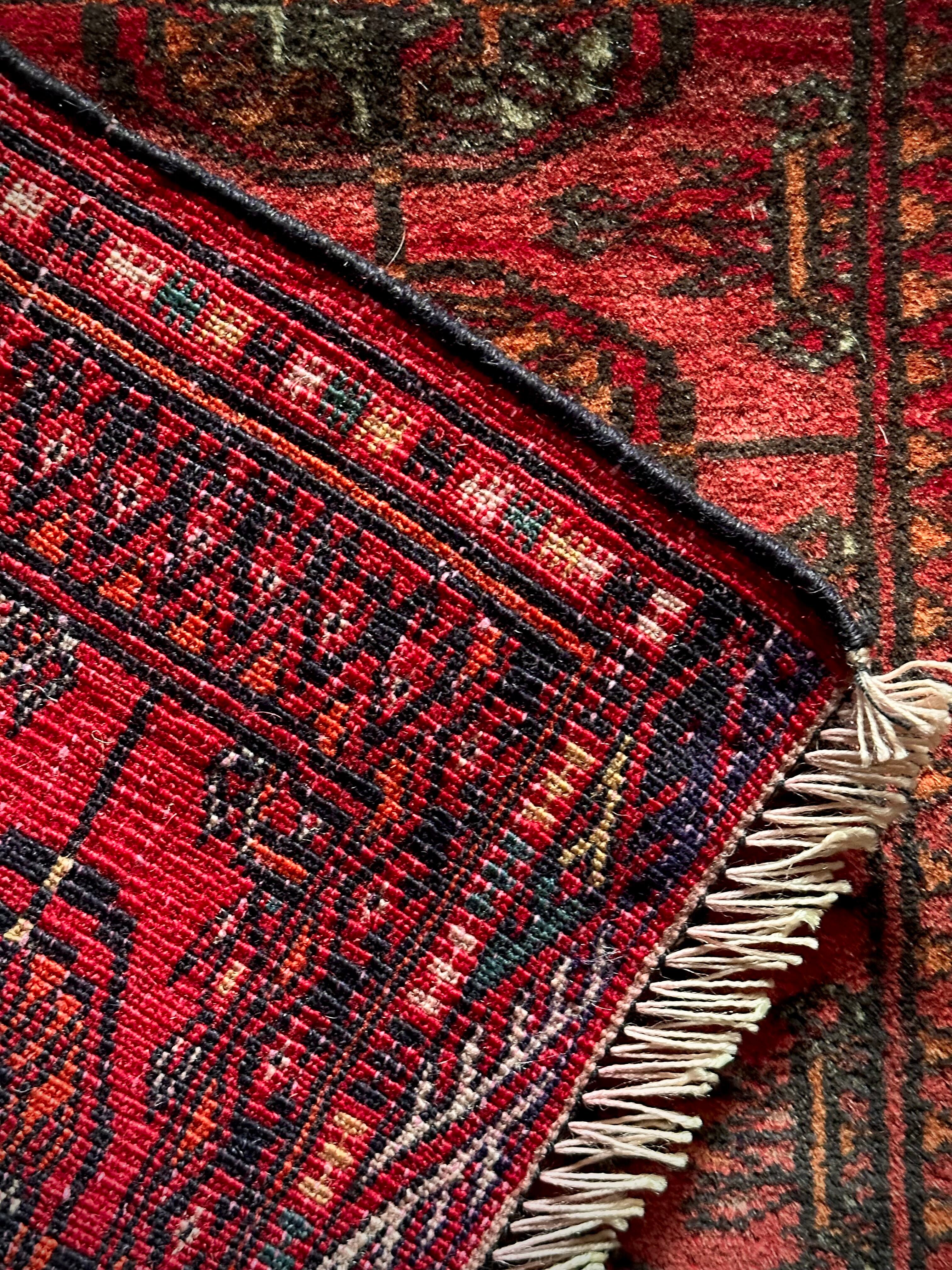 こじんまりとした真っ赤な見覚えのあるこちらは、一見してトルクメンのいつものヤツかと思いきや、なんとイラン東部に居住するバルーチ族のトライバルラグで、異部族間交流によって産まれた心温まる1枚になります。