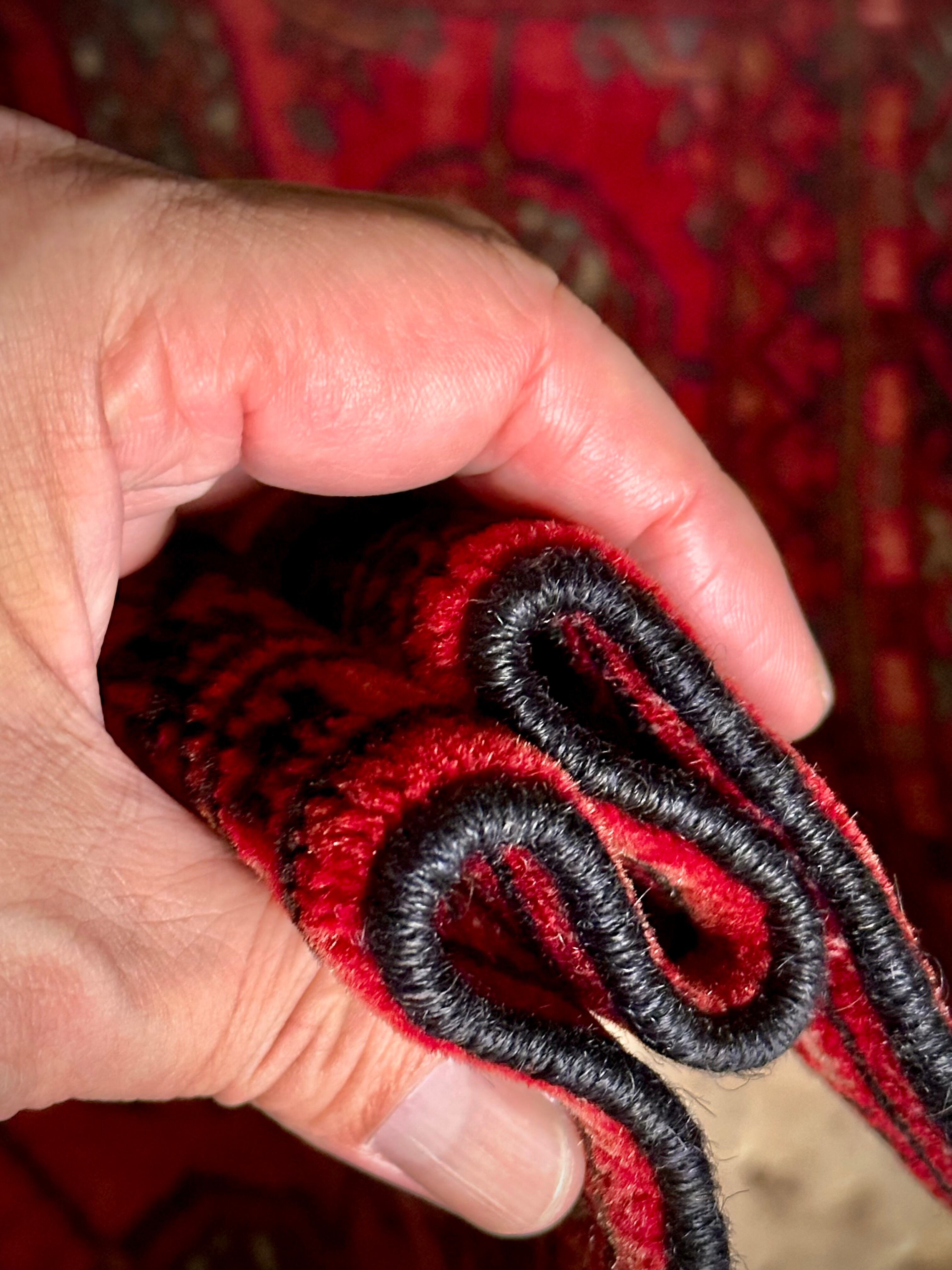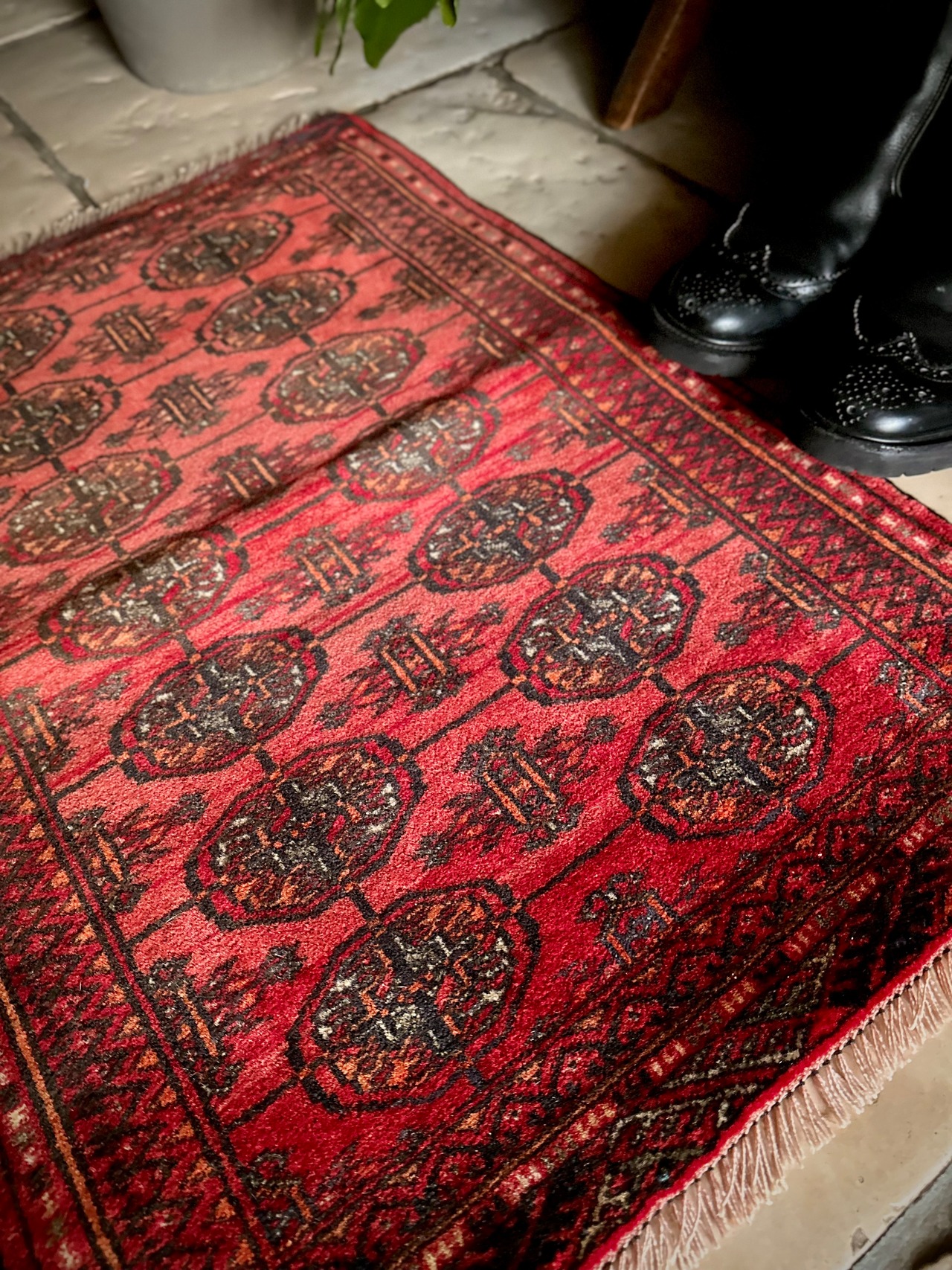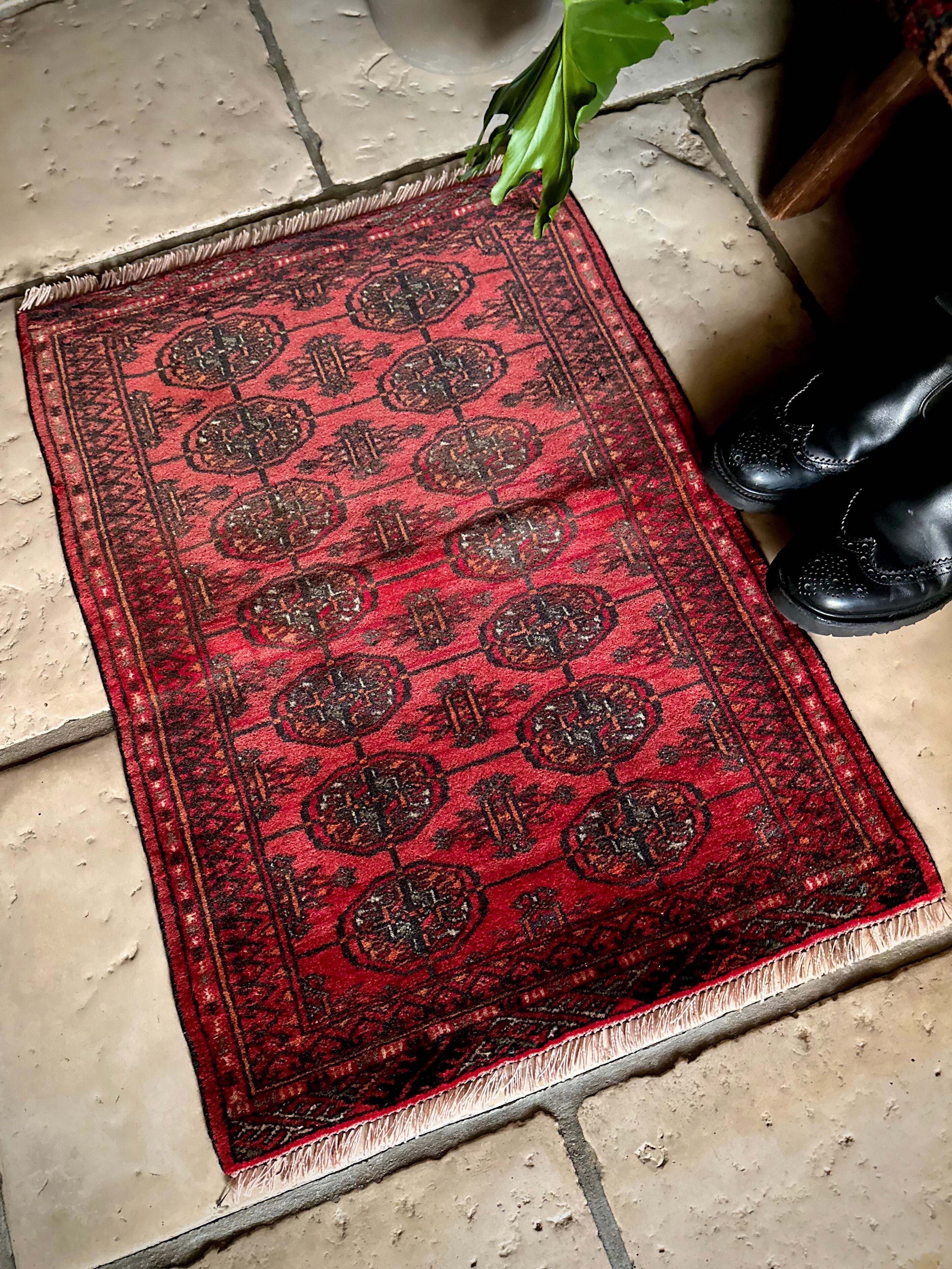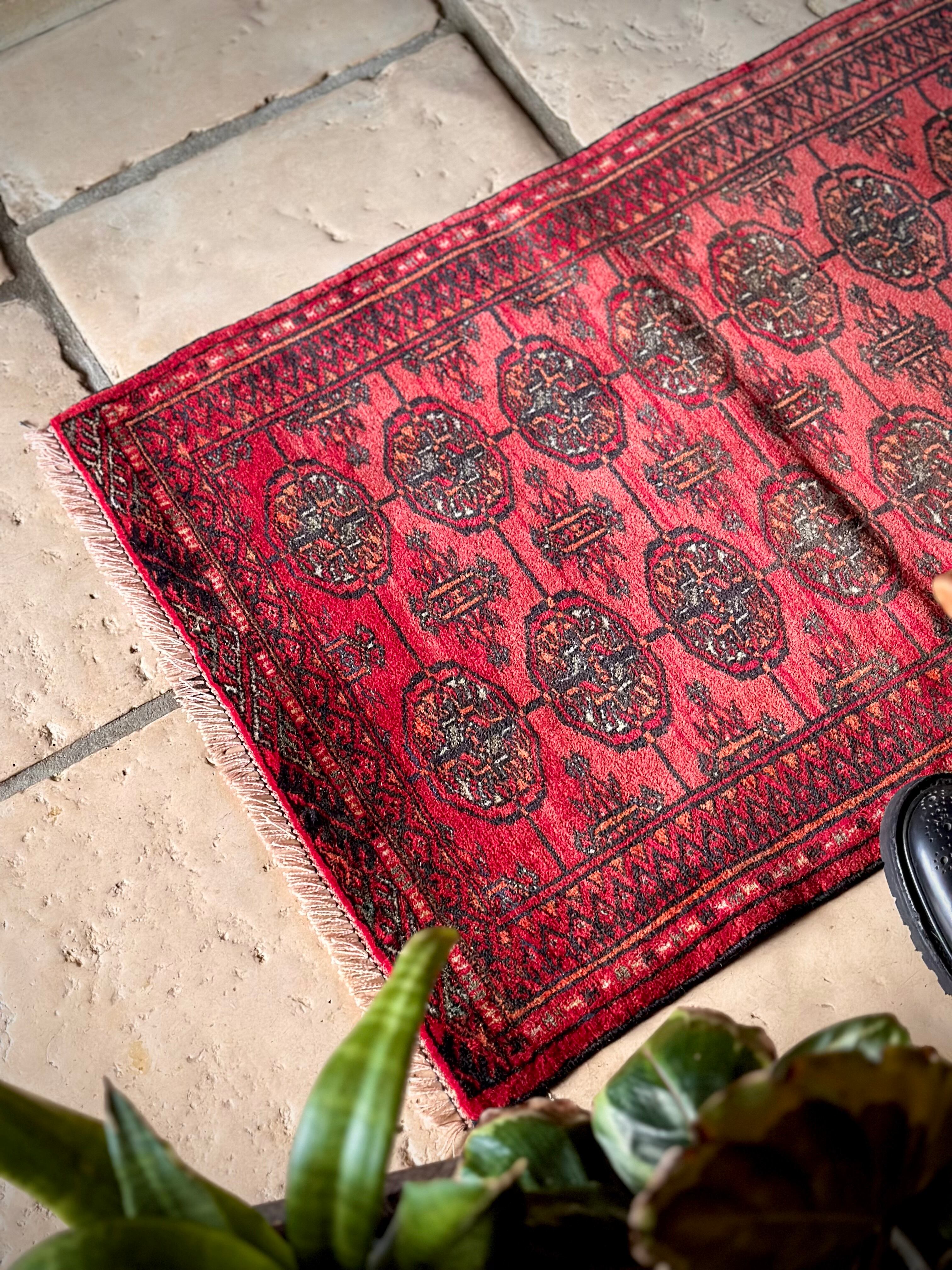 こじんまりとした真っ赤な見覚えのあるこちらは、一見してトルクメンのいつものヤツかと思いきや、なんとイラン東部に居住するバルーチ族のトライバルラグで、異部族間交流によって産まれた心温まる1枚になります。