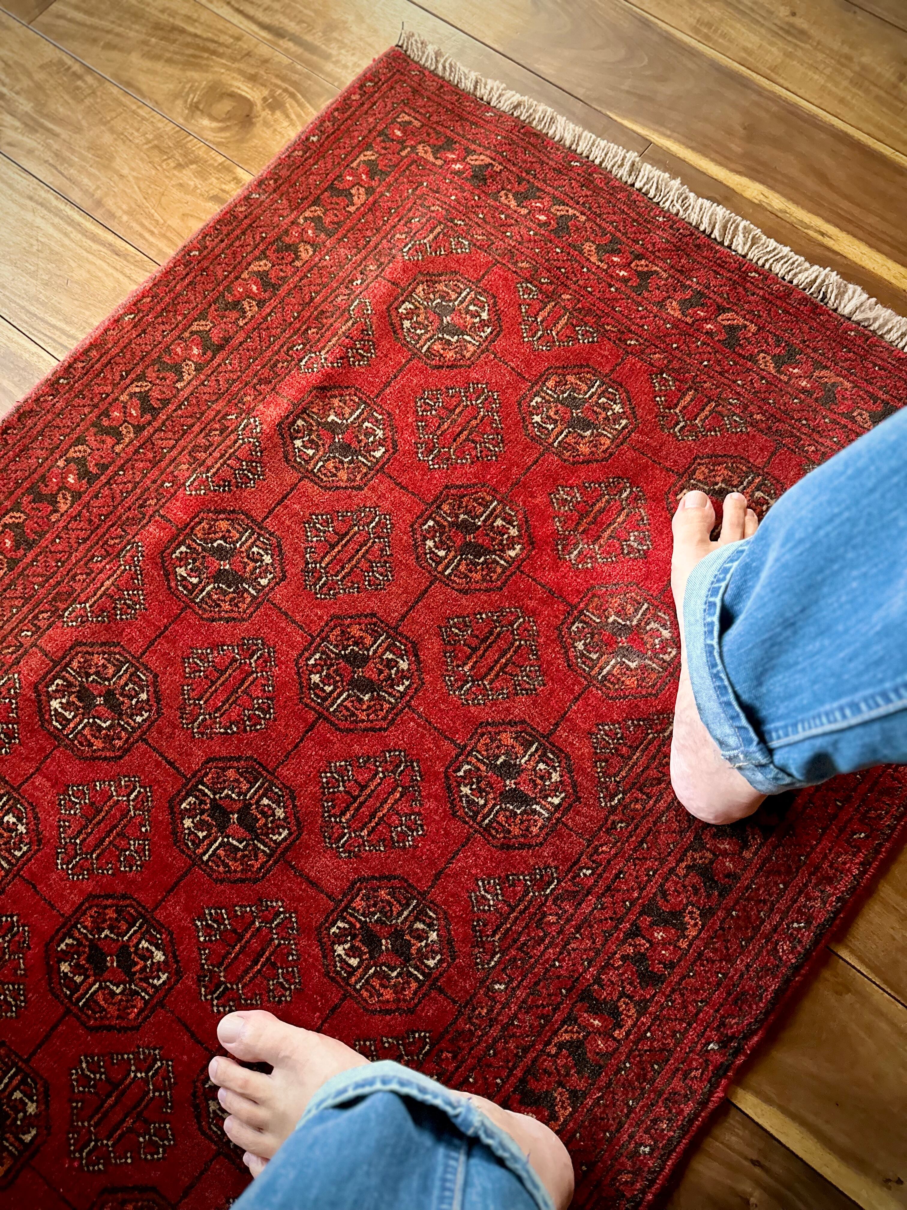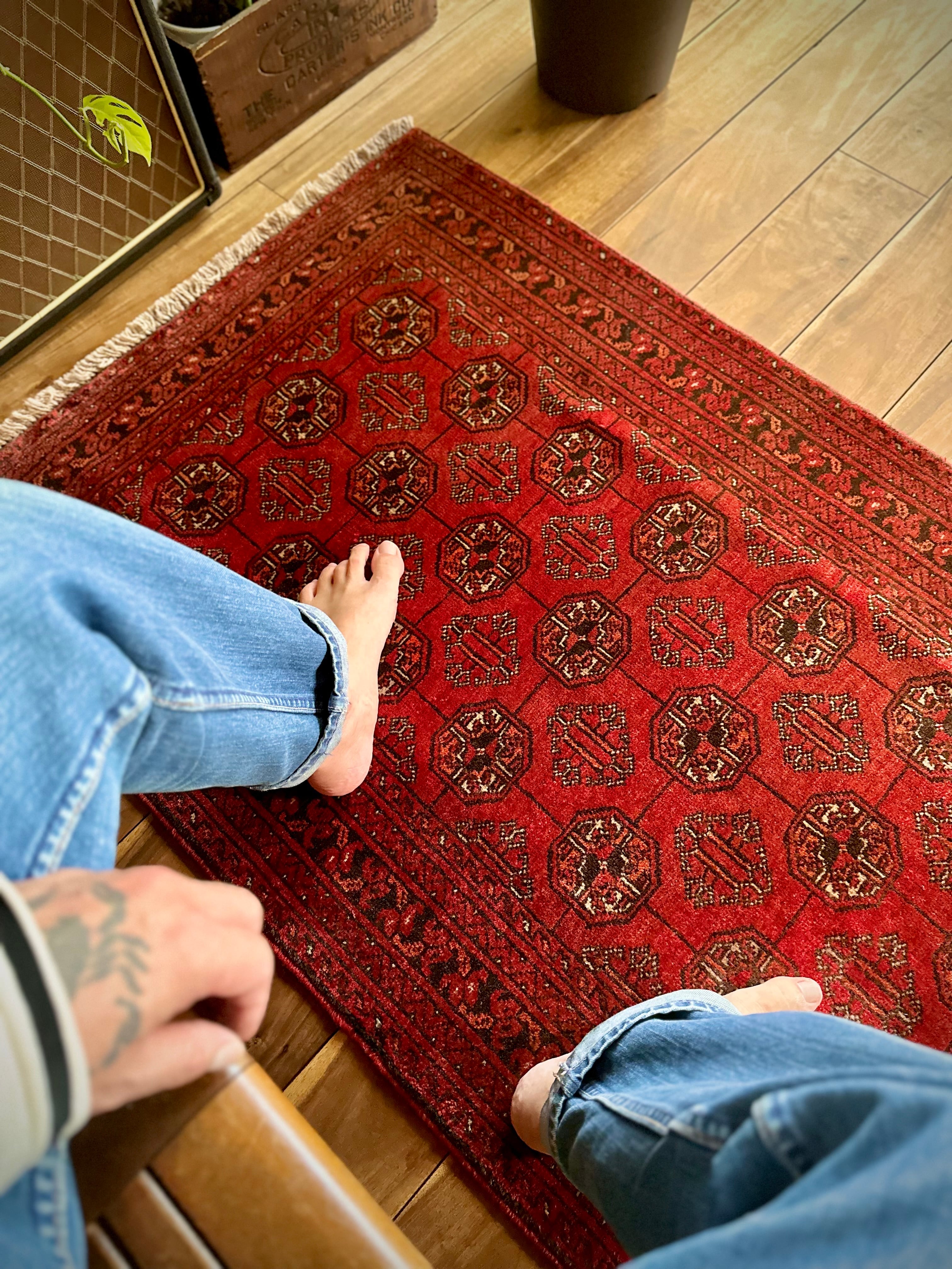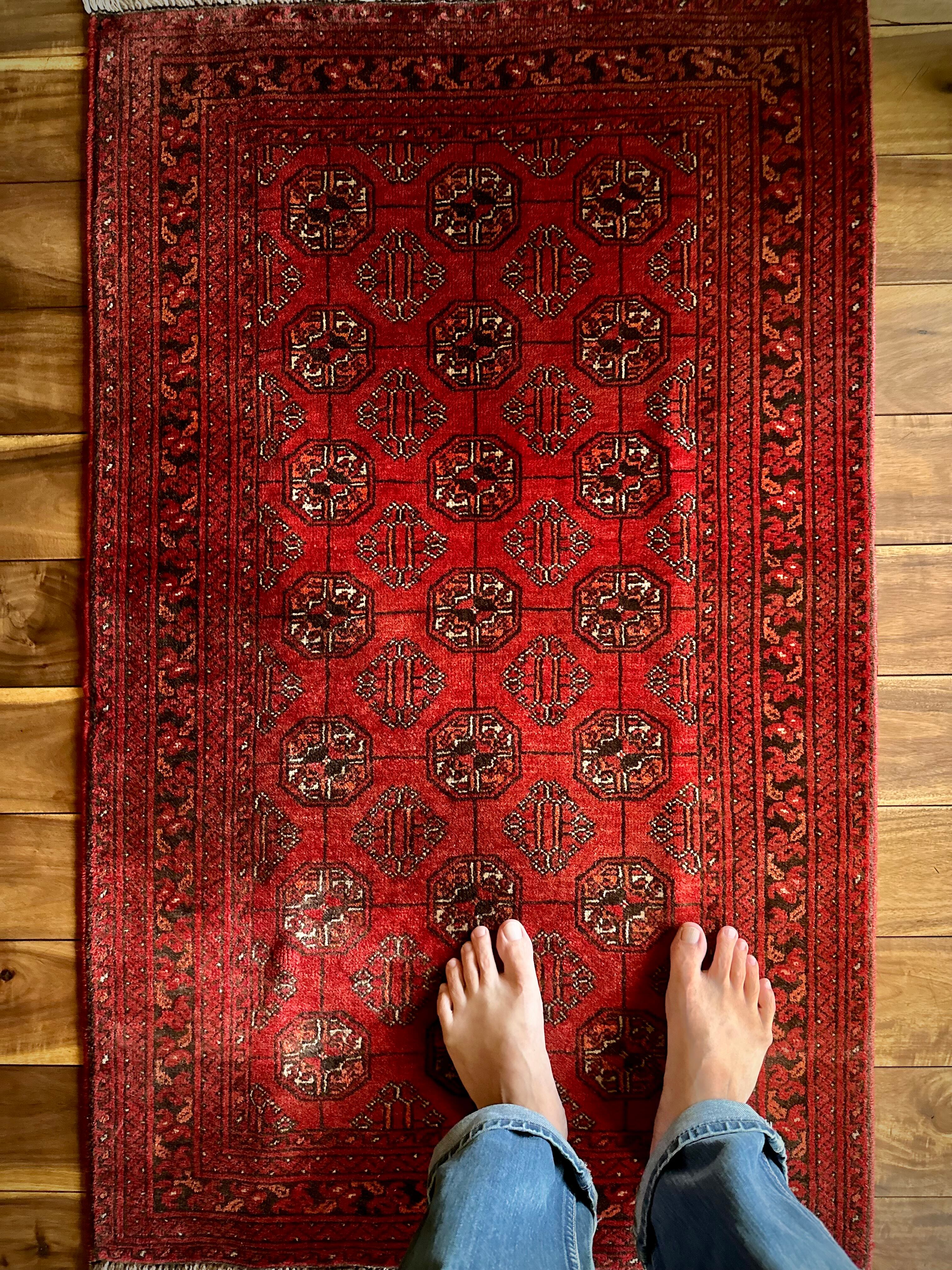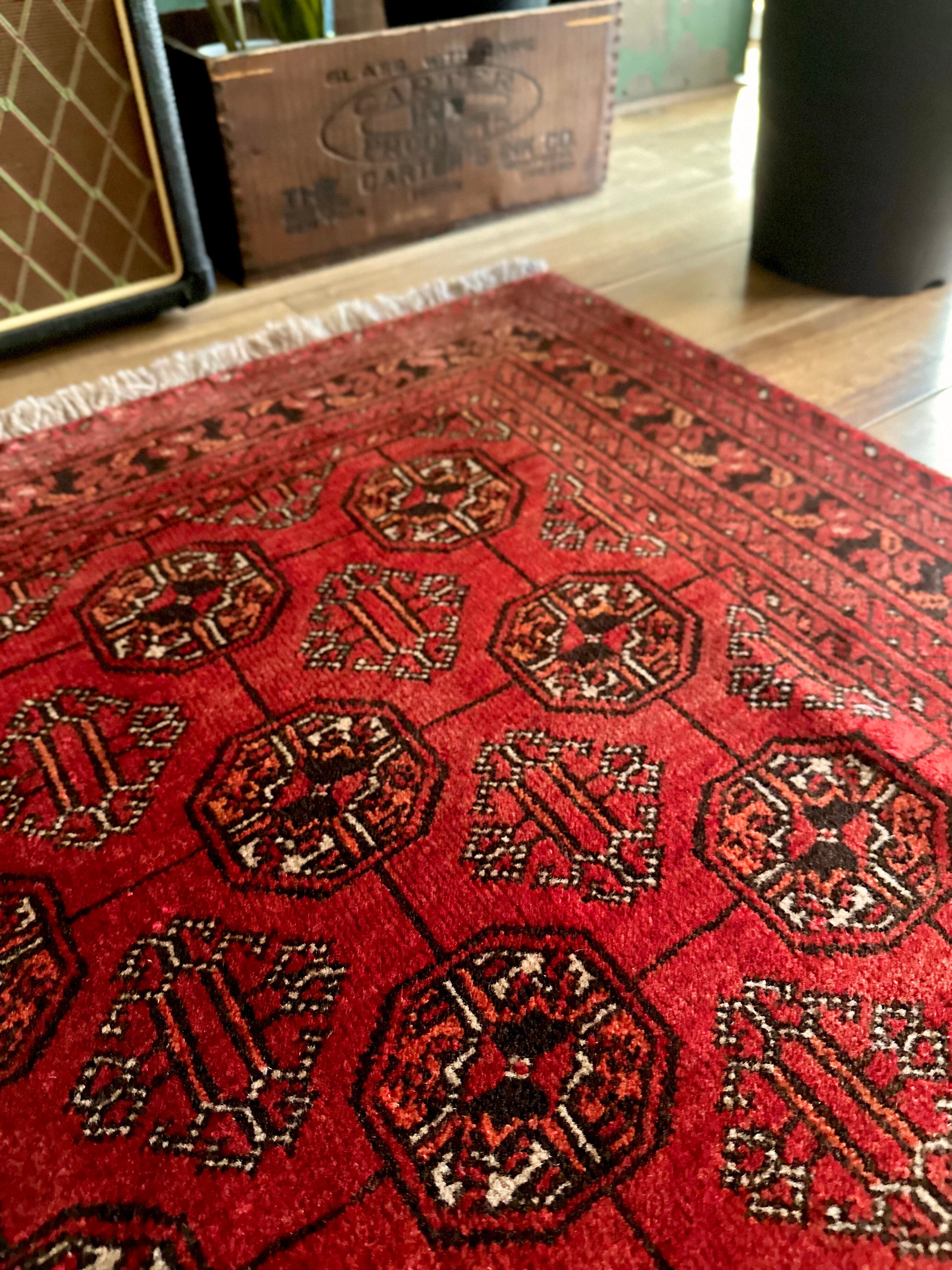 深みのある赤にオレンジがアクセントとして使われるトルクメンらしい凛とした佇まいで、由緒あるこのデザインは誰もが見惚れる1枚でしょうか。大きさは玄関マットや出入り口に適したアクセントラグなサイズ感で、厚みもありますのでキッチンなんかにも良さげですね。
