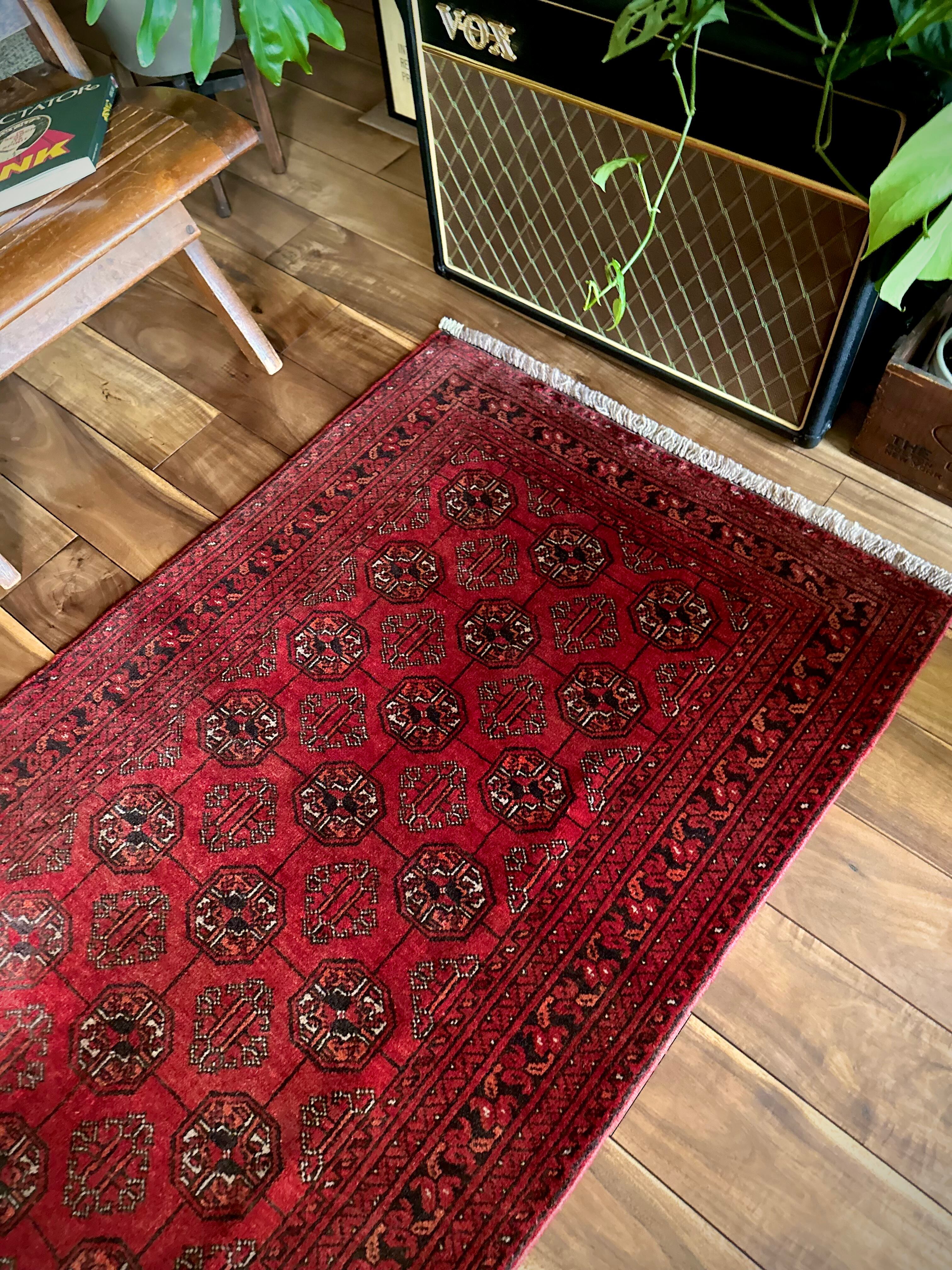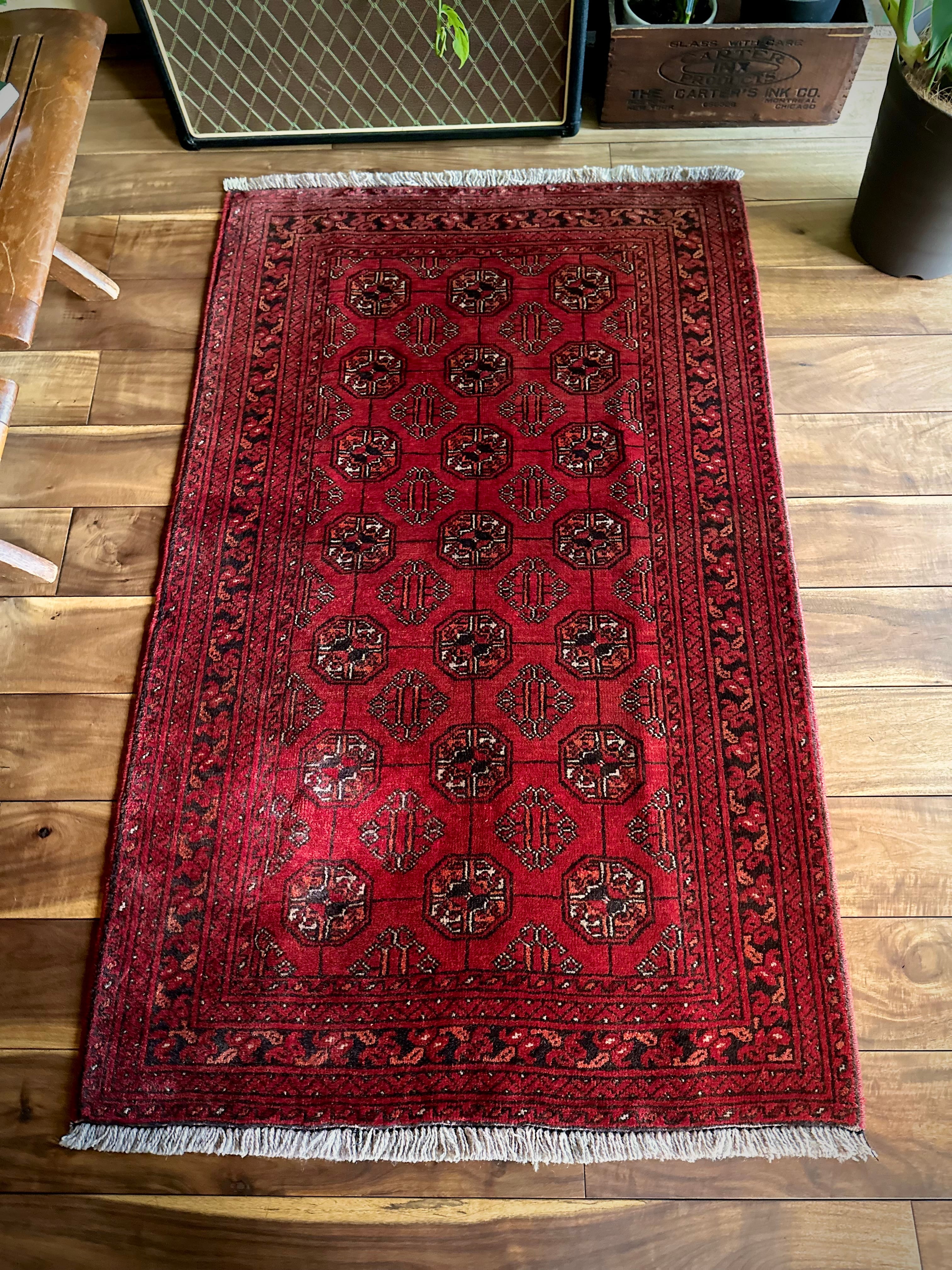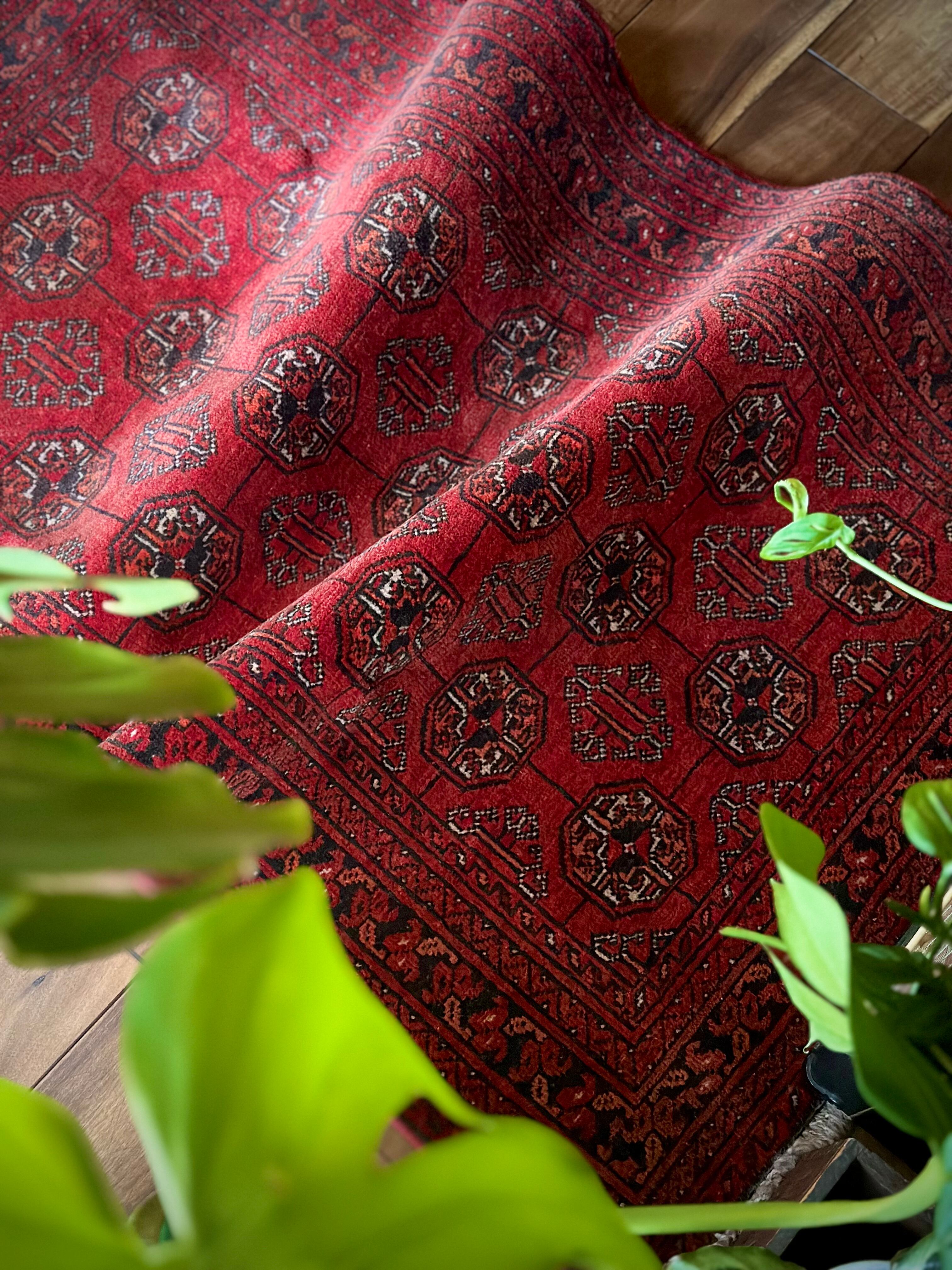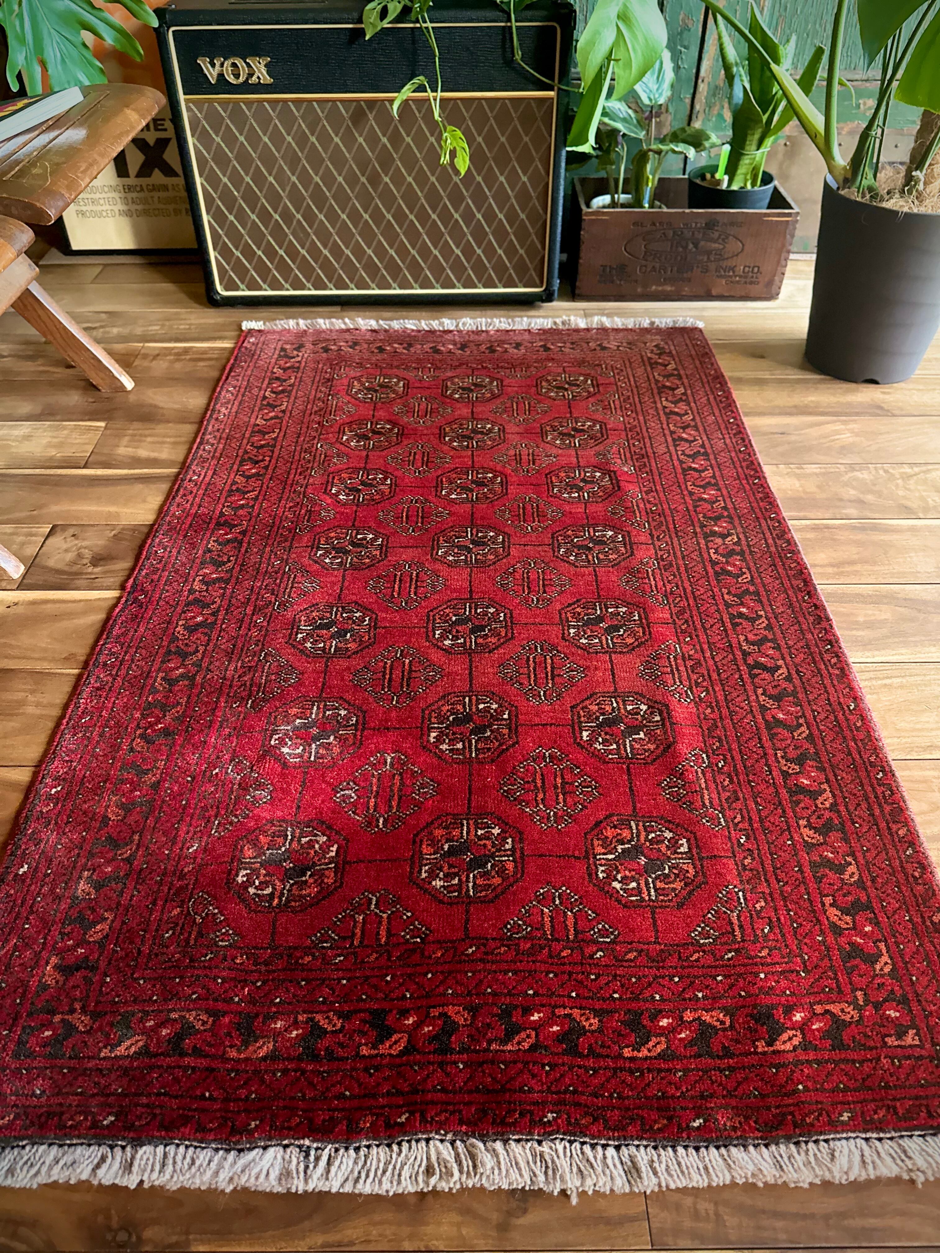 真紅のレッドカラーにギュルの連続紋様が威風堂々としたこちらは、アフガニスタン北部に居住するトルクメン族のトライバルラグで、かなり厚手に織られた丈夫な1枚になります。