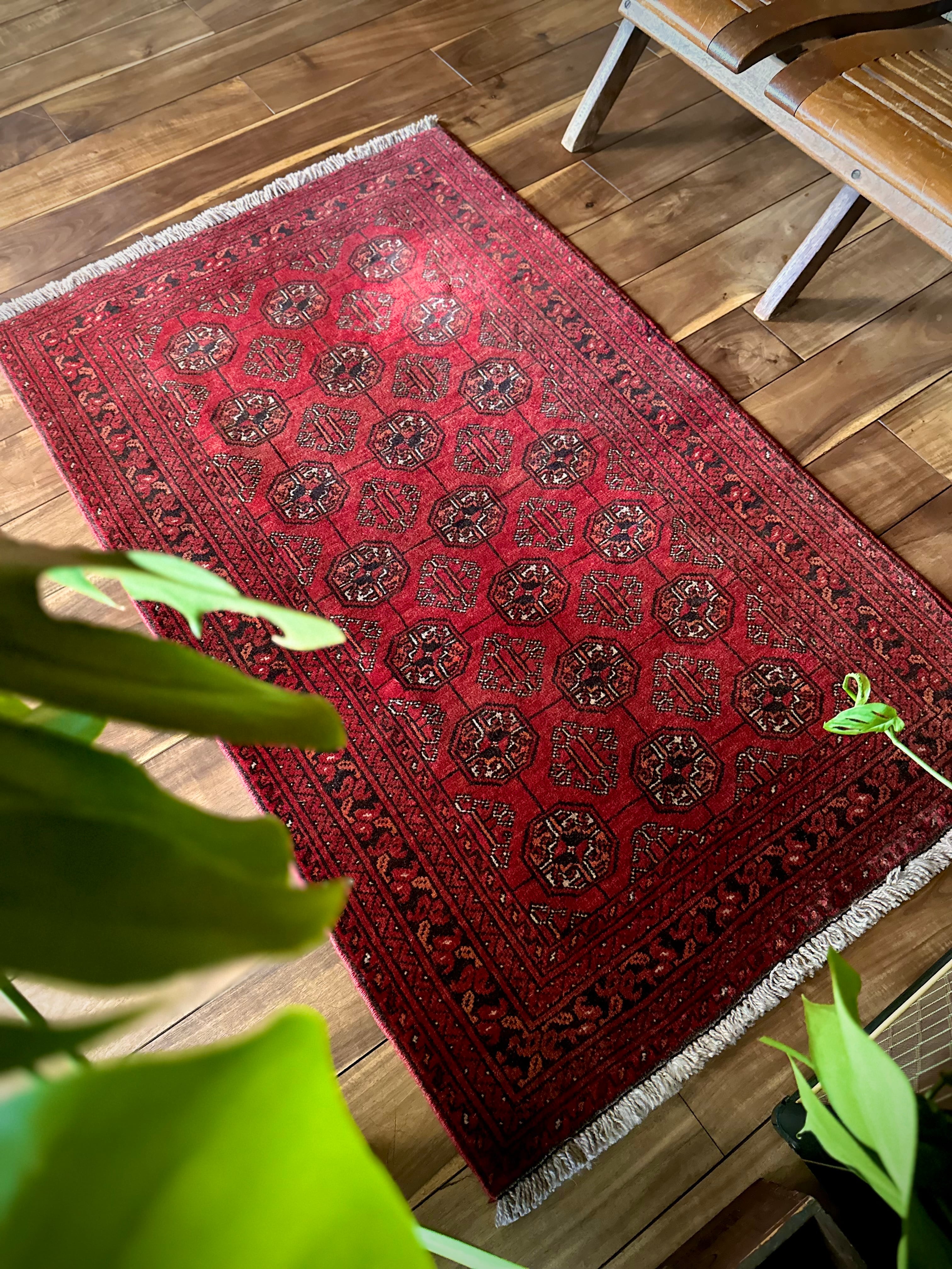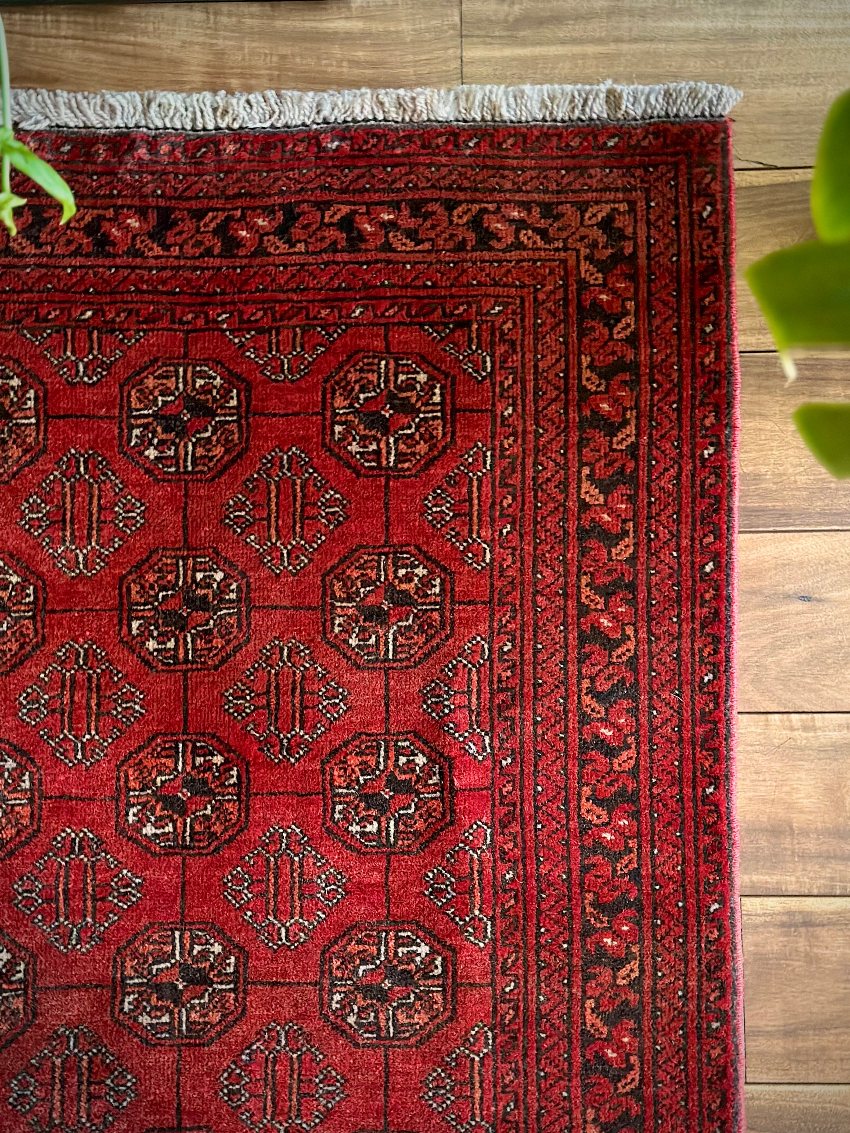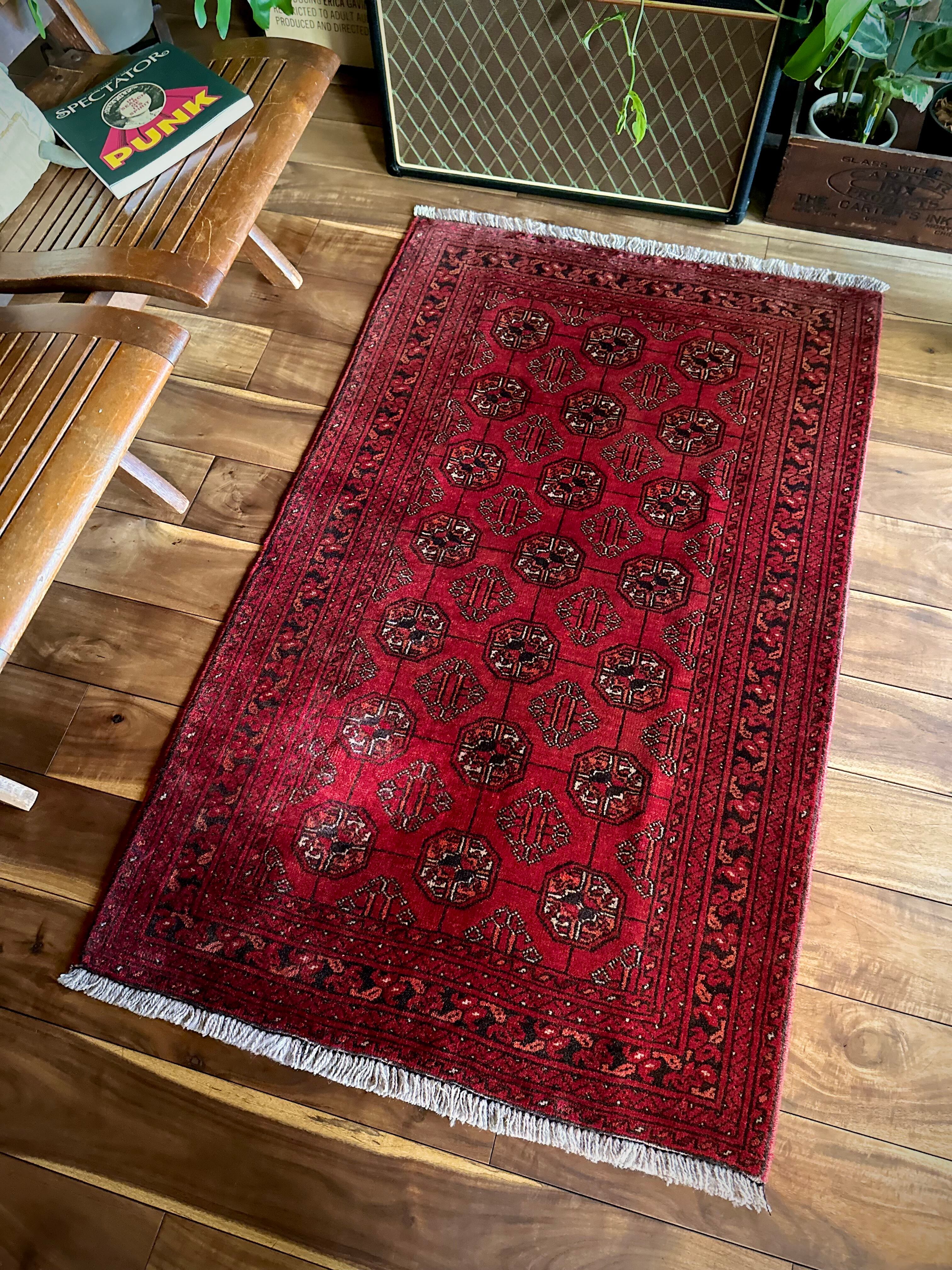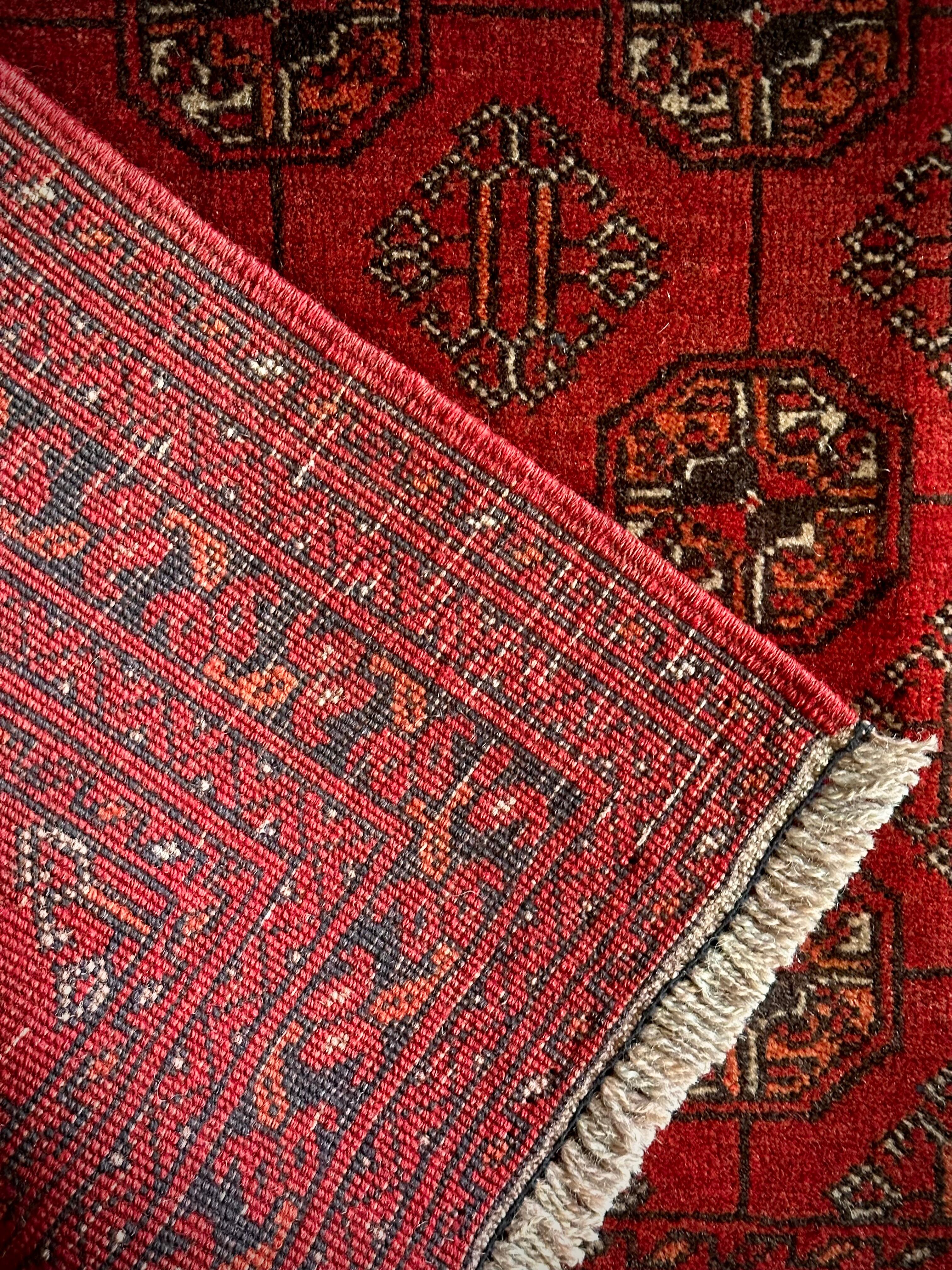 真紅のレッドカラーにギュルの連続紋様が威風堂々としたこちらは、アフガニスタン北部に居住するトルクメン族のトライバルラグで、かなり厚手に織られた丈夫な1枚になります。