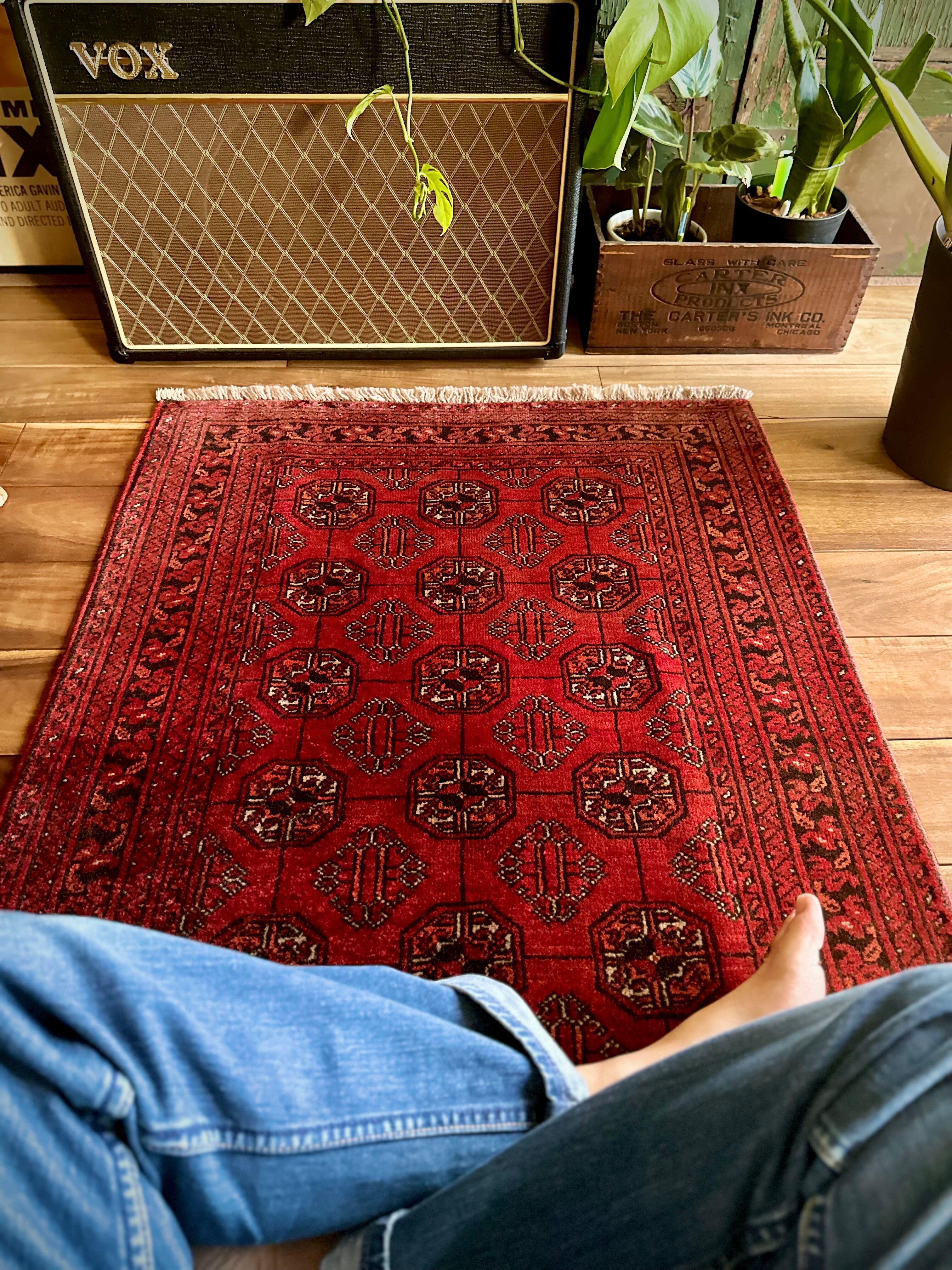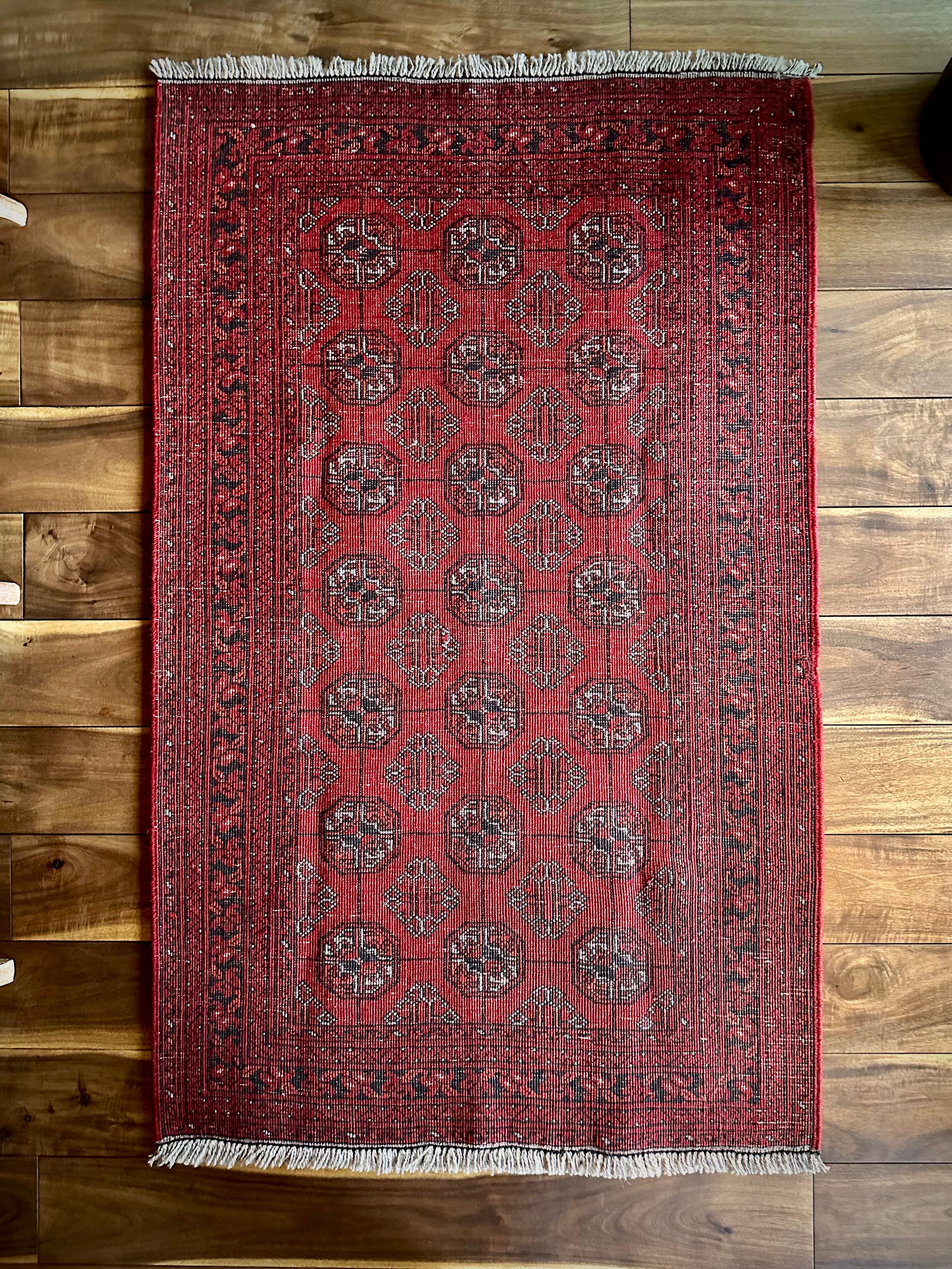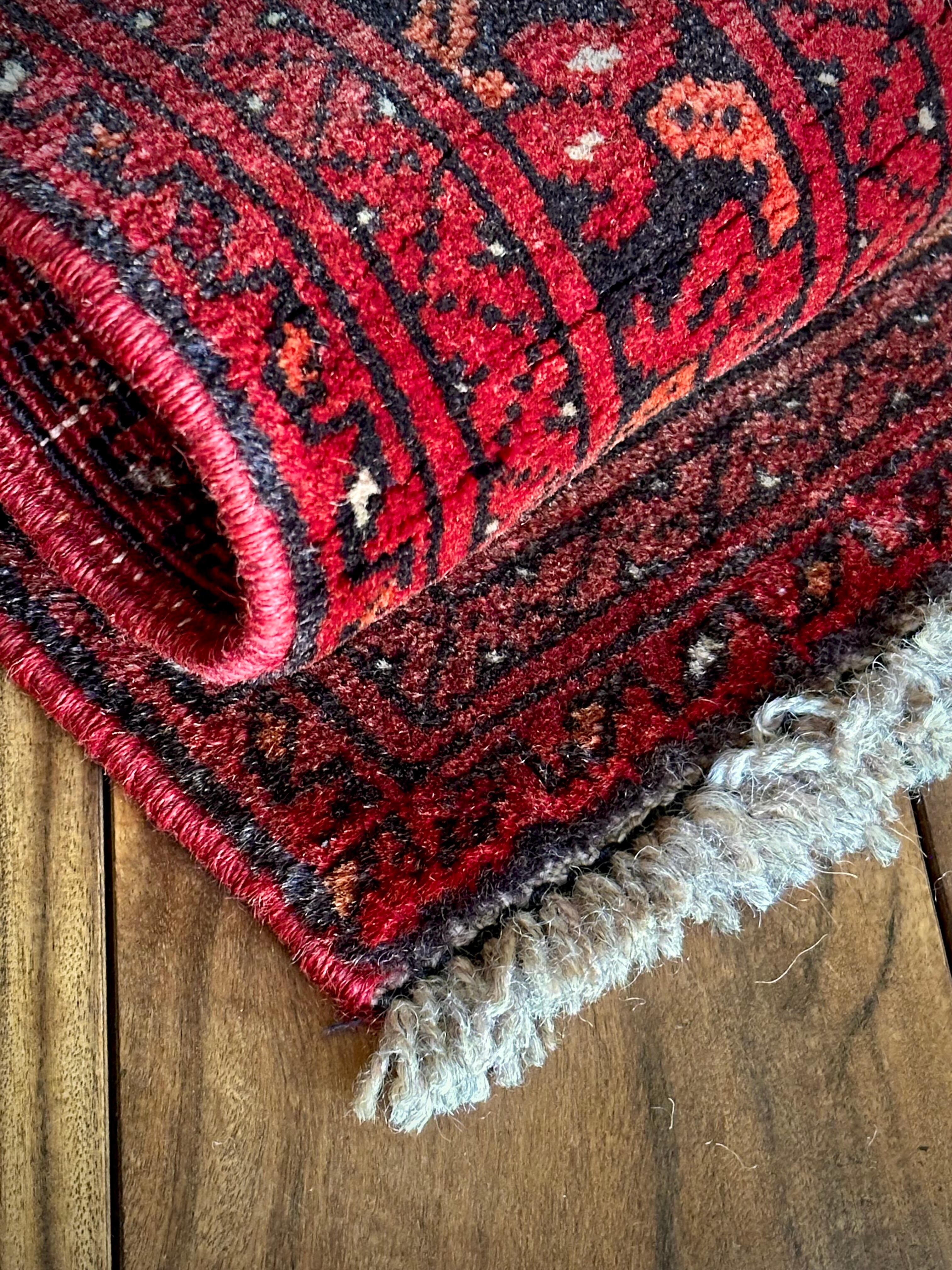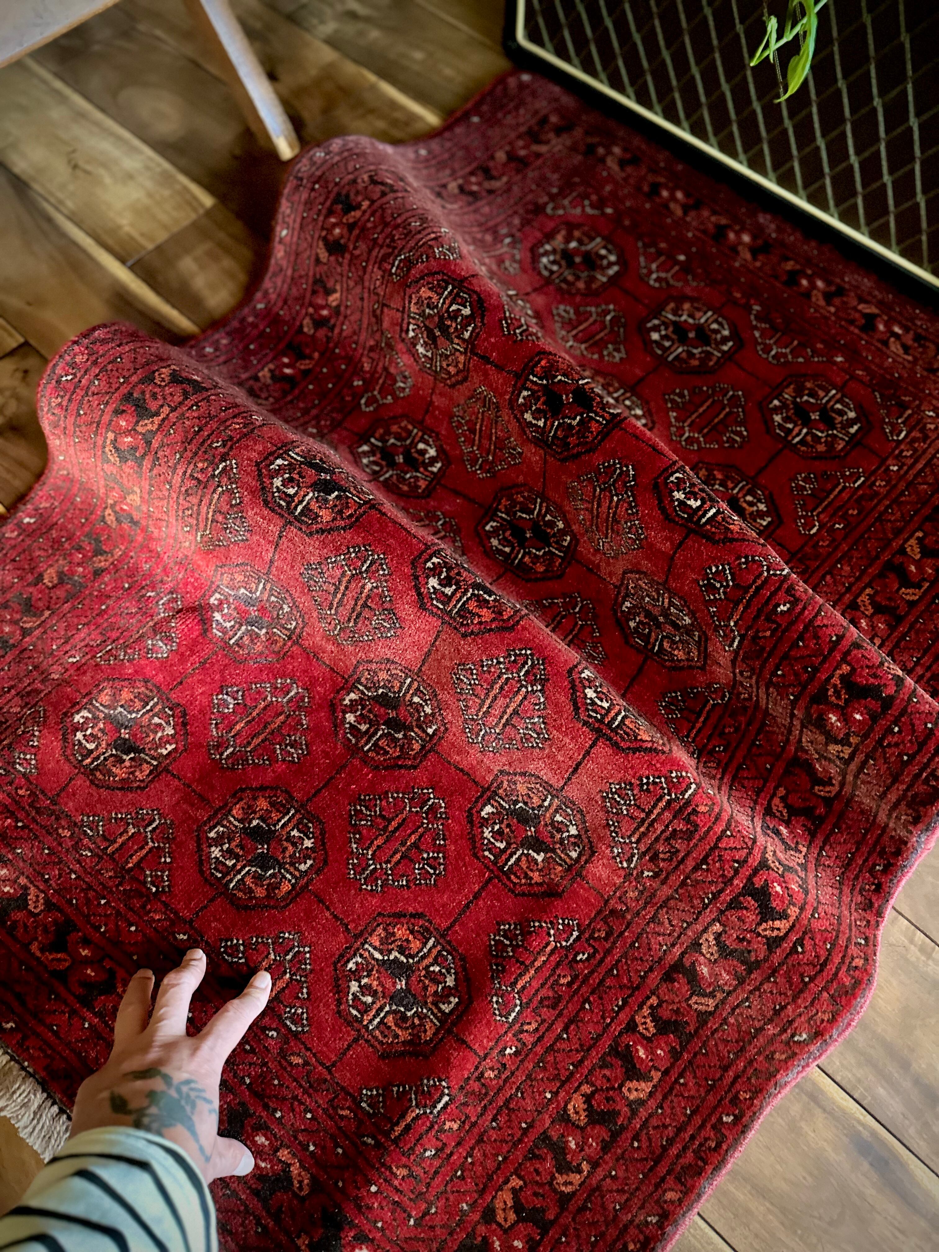 真紅のレッドカラーにギュルの連続紋様が威風堂々としたこちらは、アフガニスタン北部に居住するトルクメン族のトライバルラグで、かなり厚手に織られた丈夫な1枚になります。