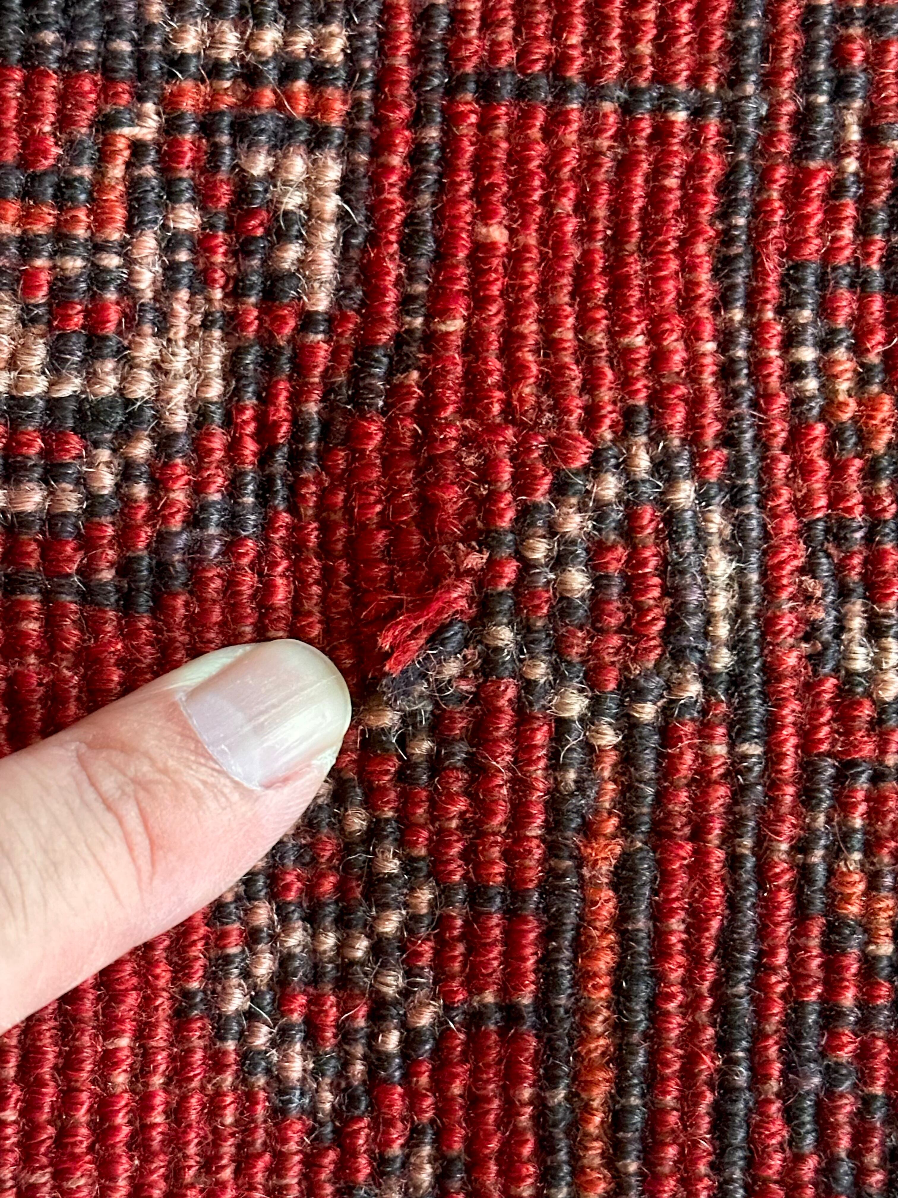 経年としては50年のヴィンテージラグになりますがそれほどの使用感はなく、特に目立つ汚れにリペアはありませんが、折り畳んだ際に緯糸が切れたと思われる1cmほどの裂け目があります。敷いている分には問題はありませんしこれ以上裂けることもありませんが、こちらで簡単な補修をしておきますのでご安心ください。