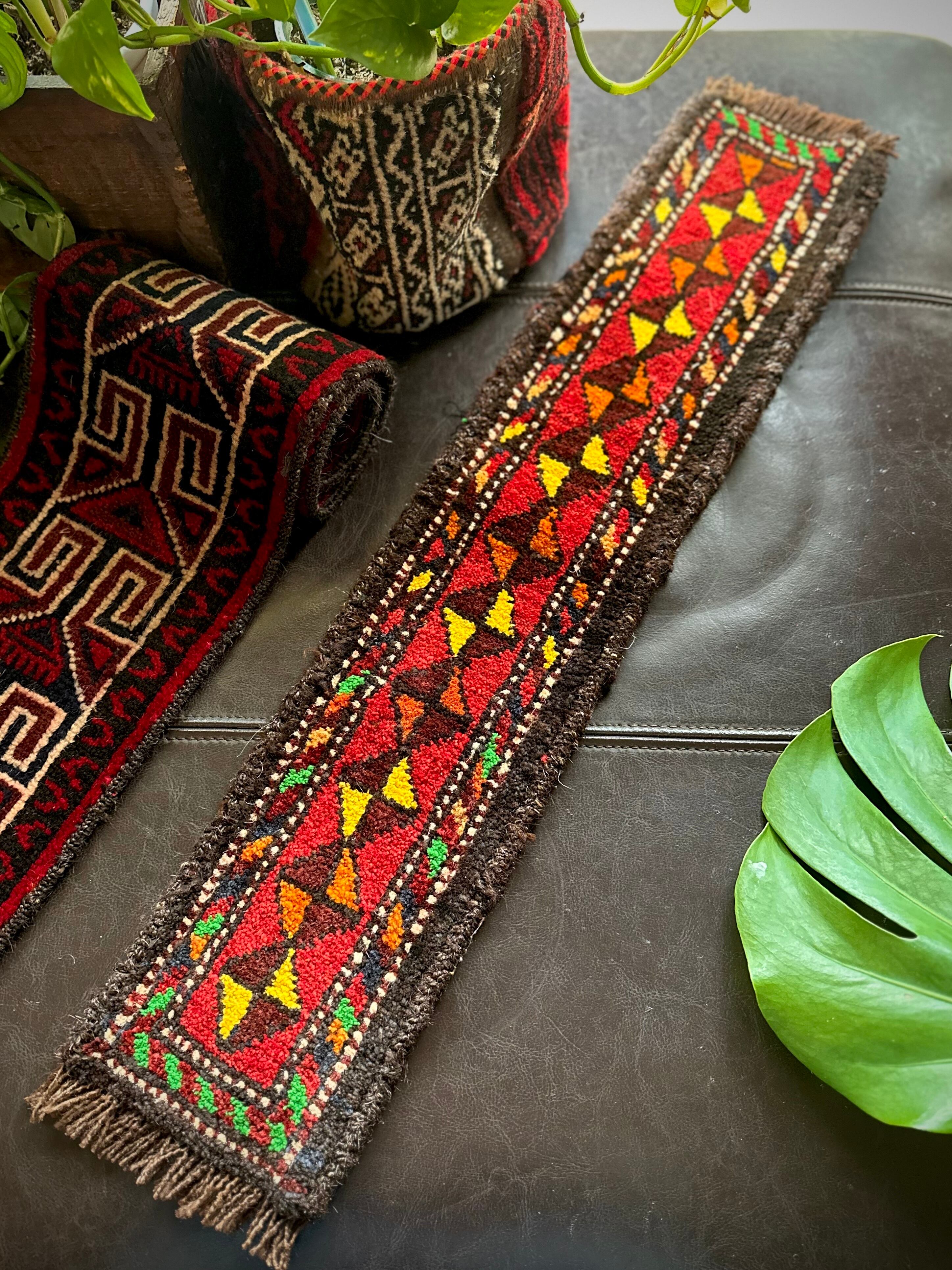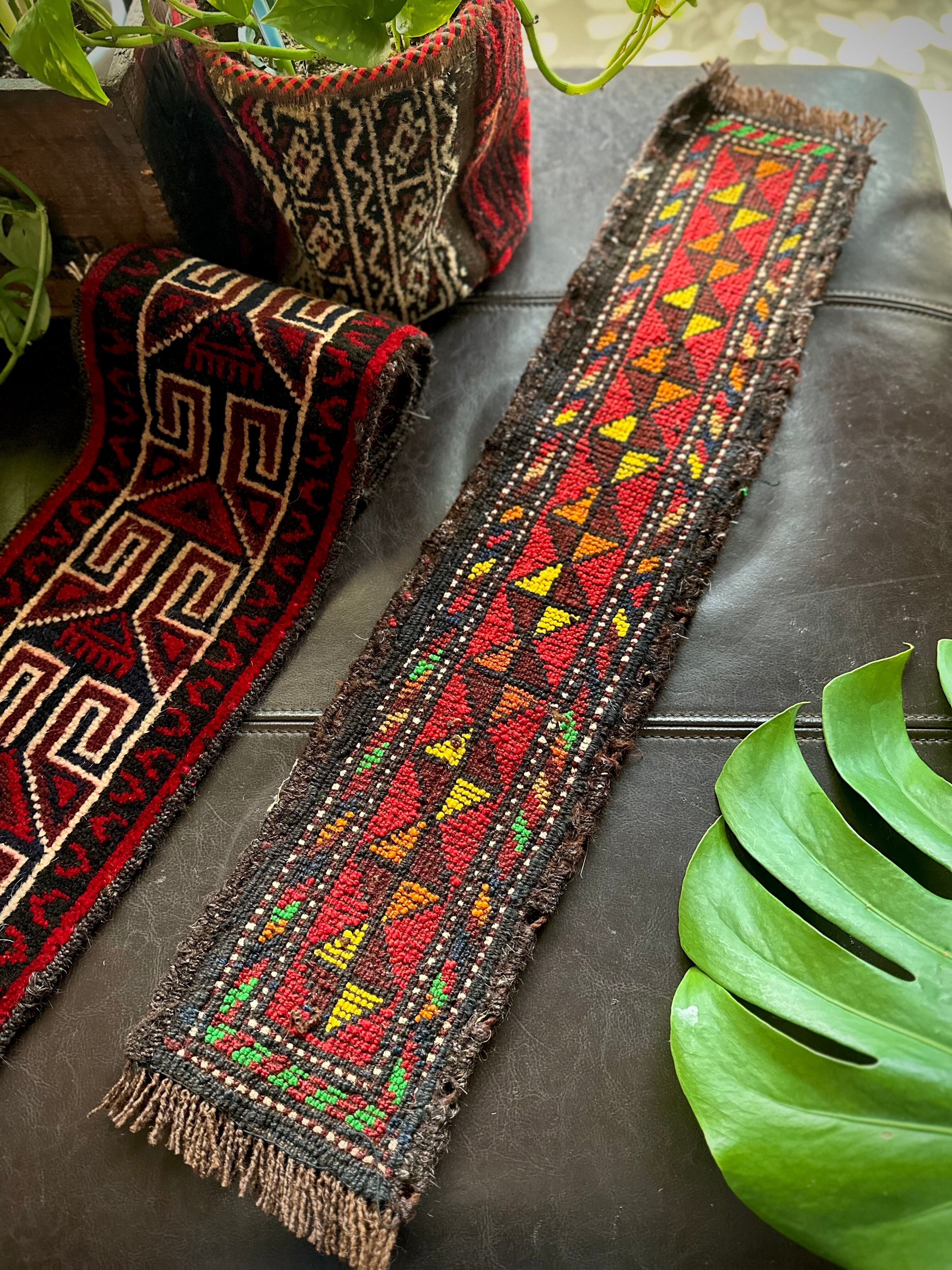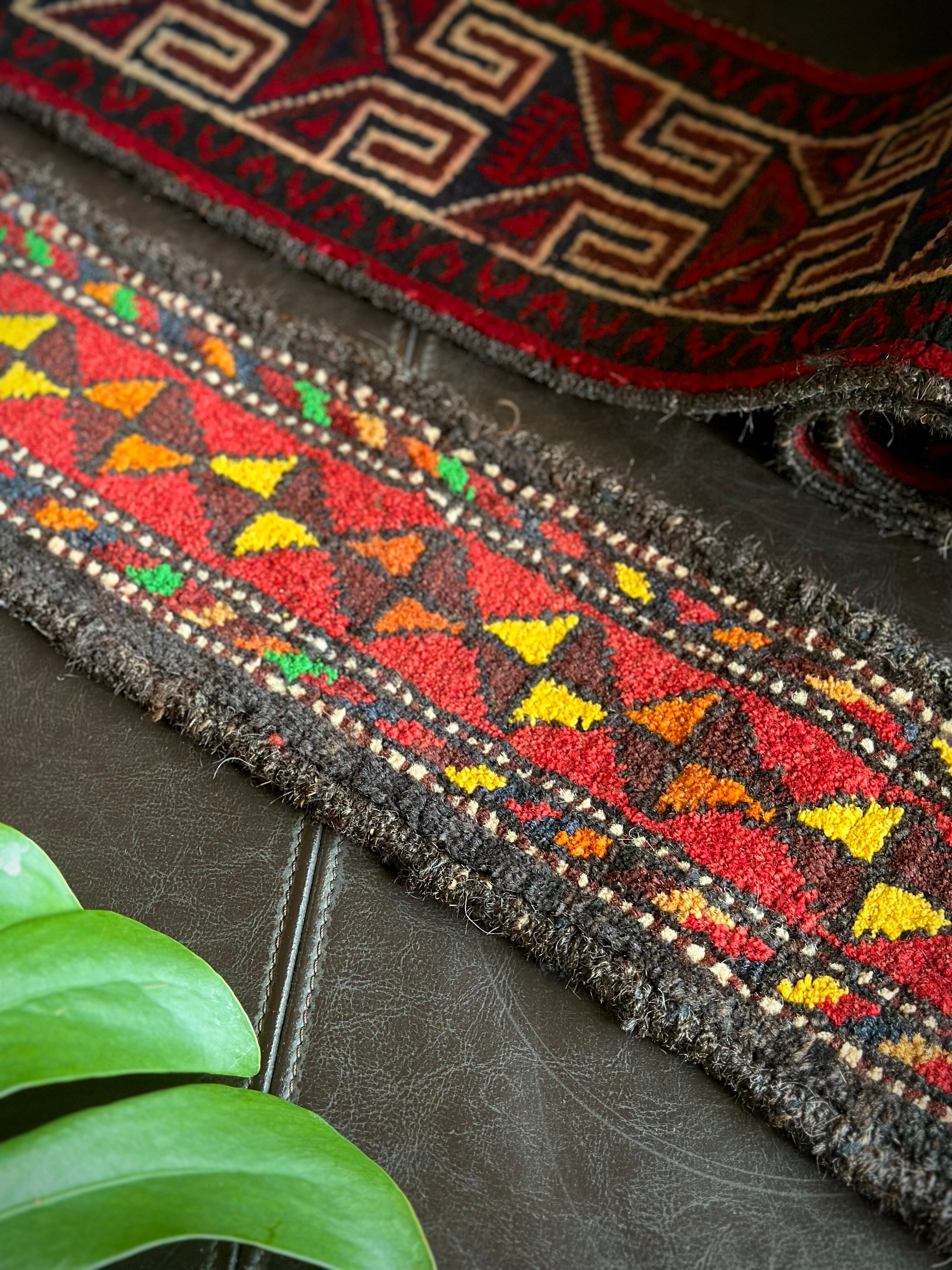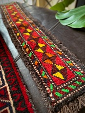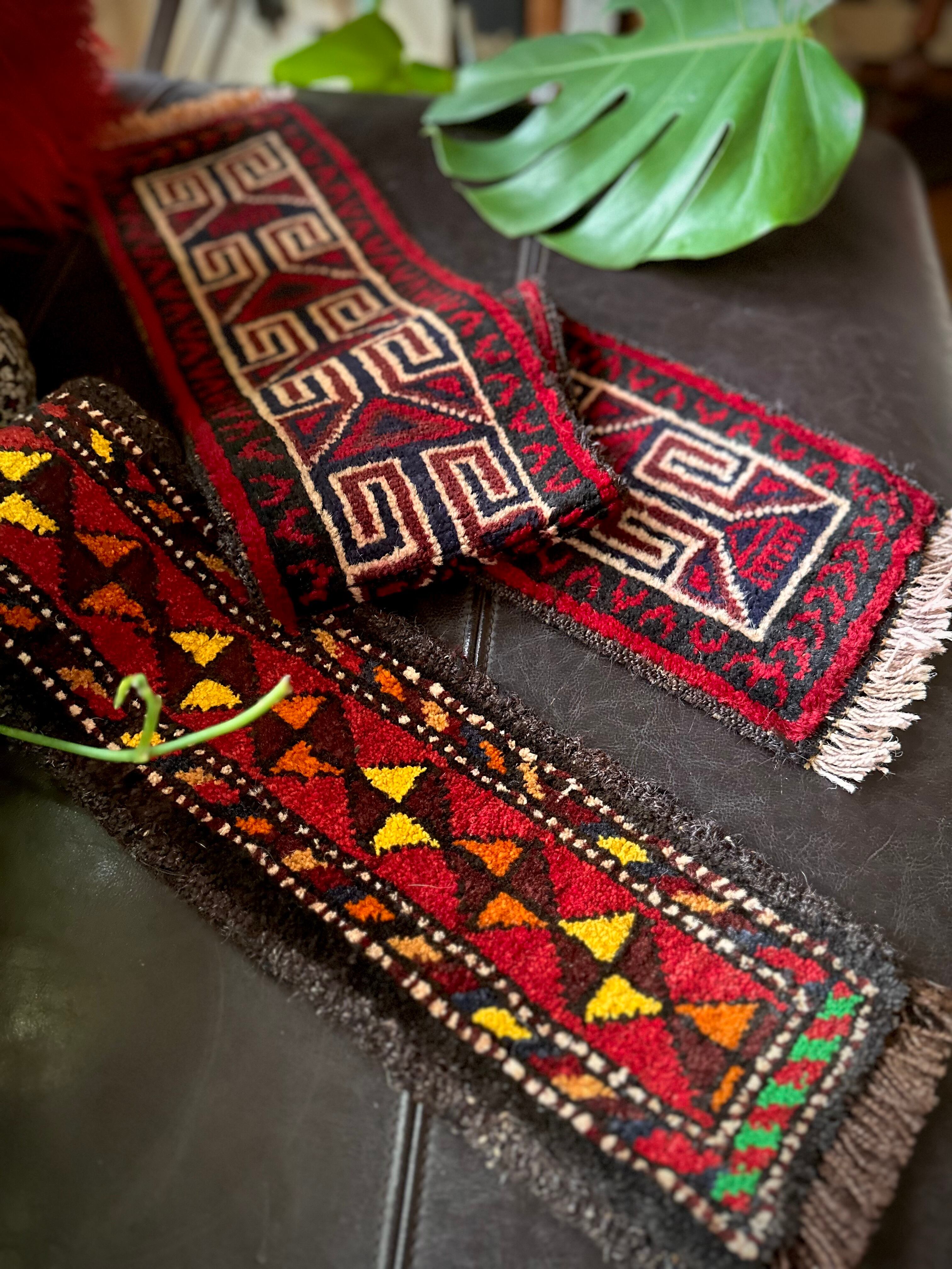 こちらの商品はアフガニスタンのヘラート州に居住するバルーチ族によって、ひとつひとつ手織りされたアニマル・トラッピングスと呼ばれる動物用の首飾りで、元はタッセルやビーズなどが付いていたのを取り除いてミニラグに仕立て直したモノになります。