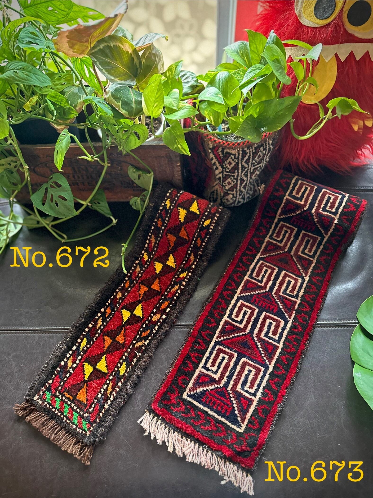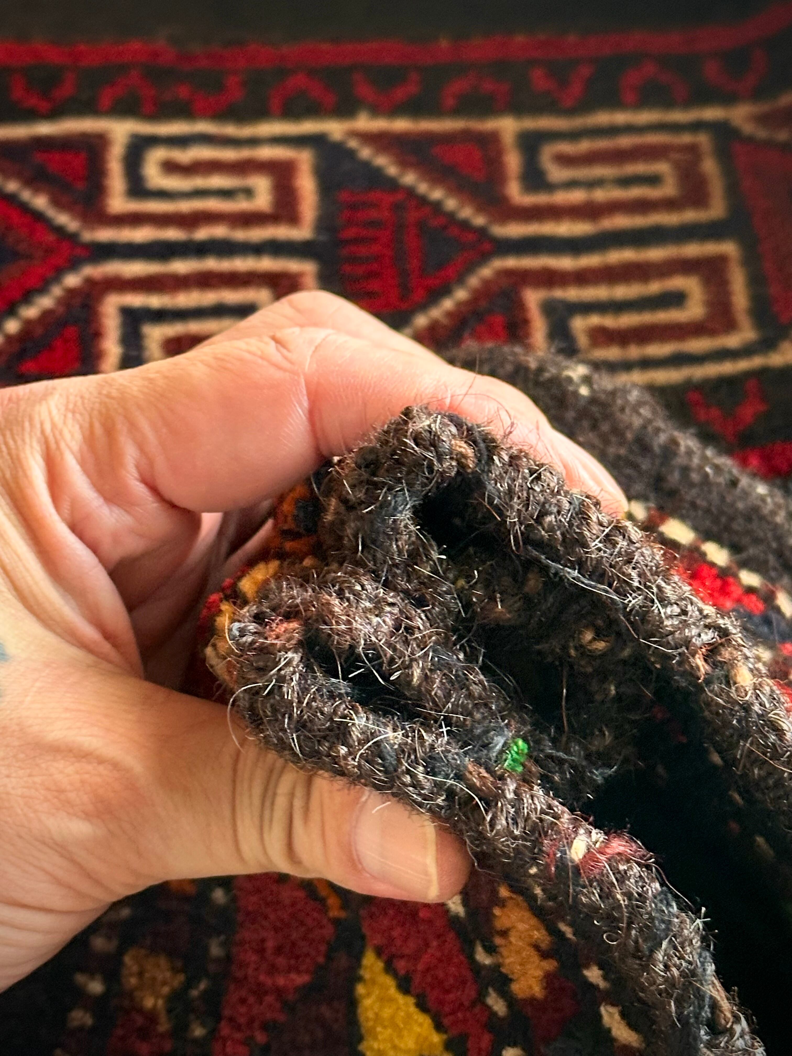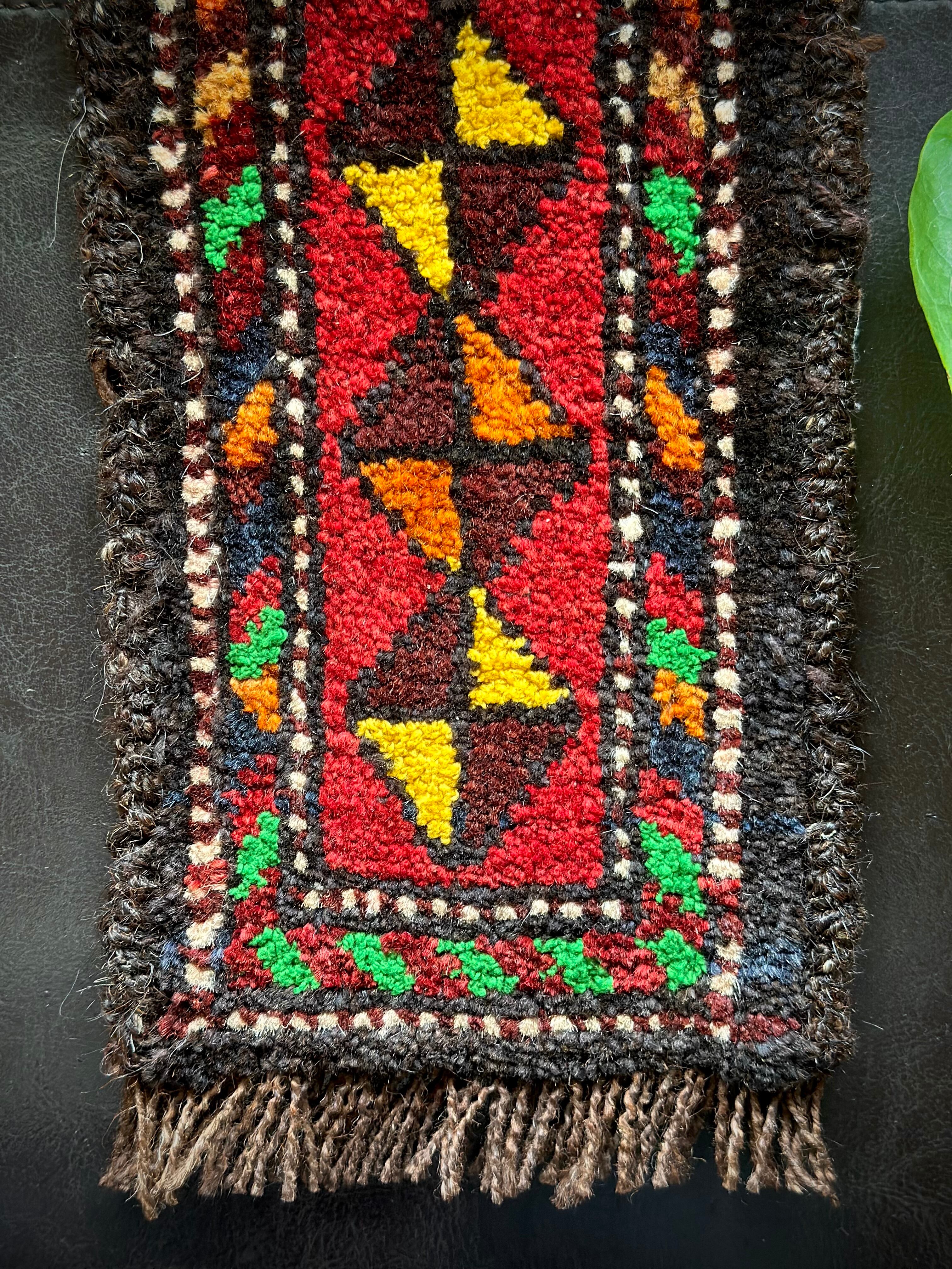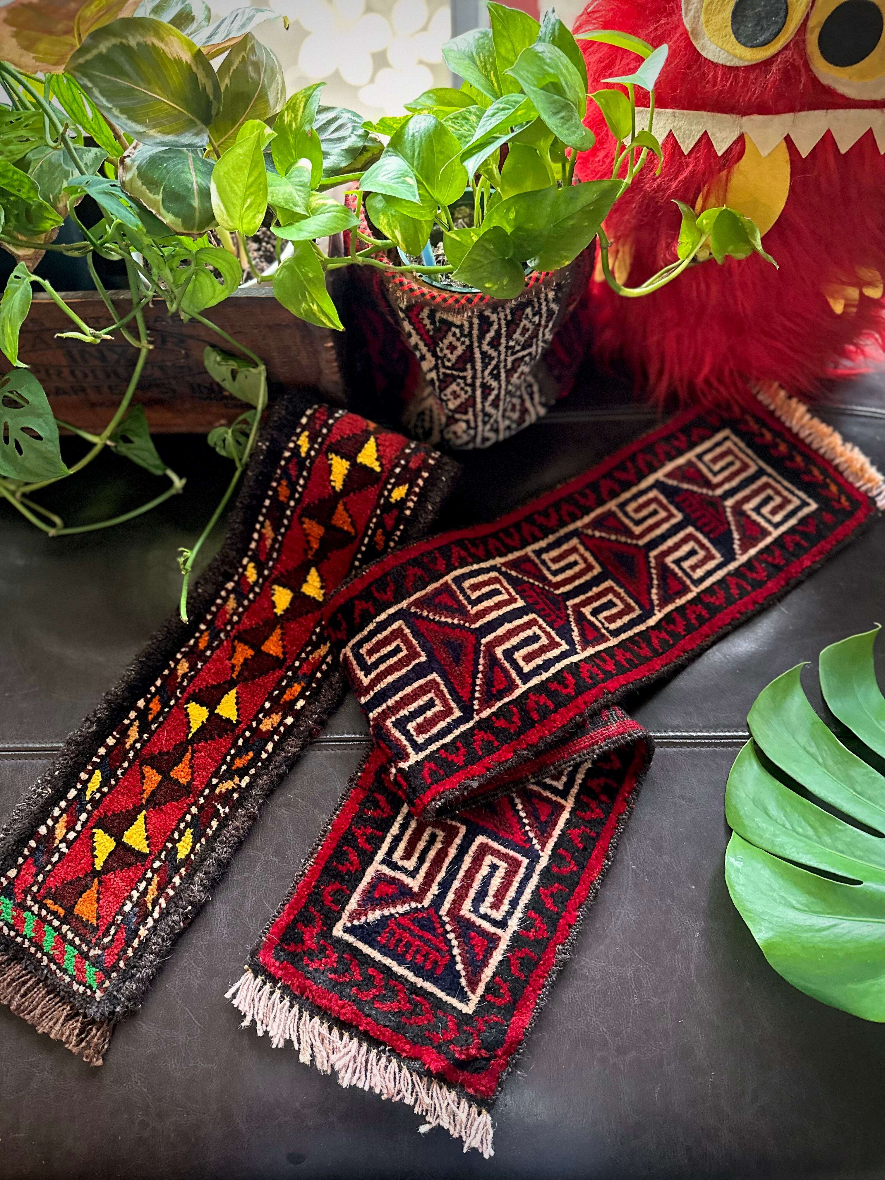 こちらの商品はアフガニスタンのヘラート州に居住するバルーチ族によって、ひとつひとつ手織りされたアニマル・トラッピングスと呼ばれる動物用の首飾りで、元はタッセルやビーズなどが付いていたのを取り除いてミニラグに仕立て直したモノになります。