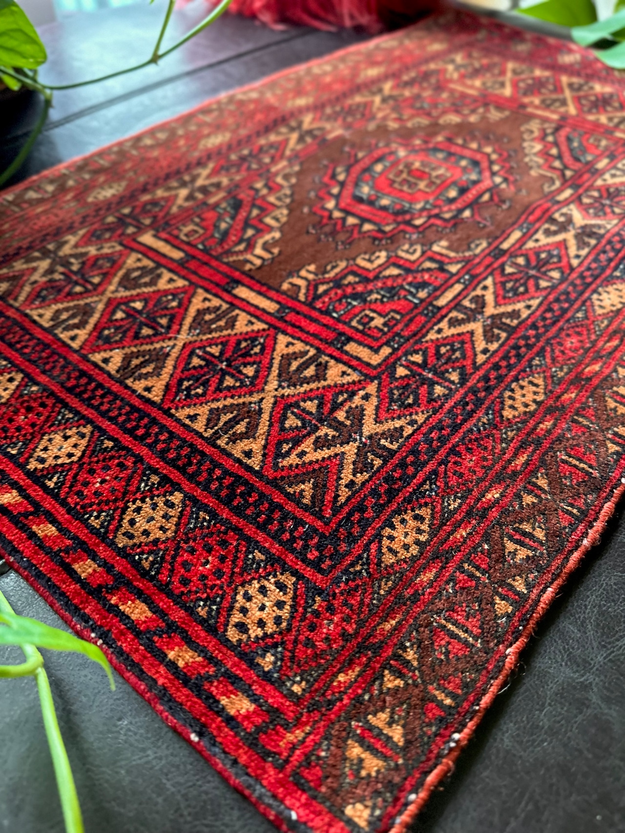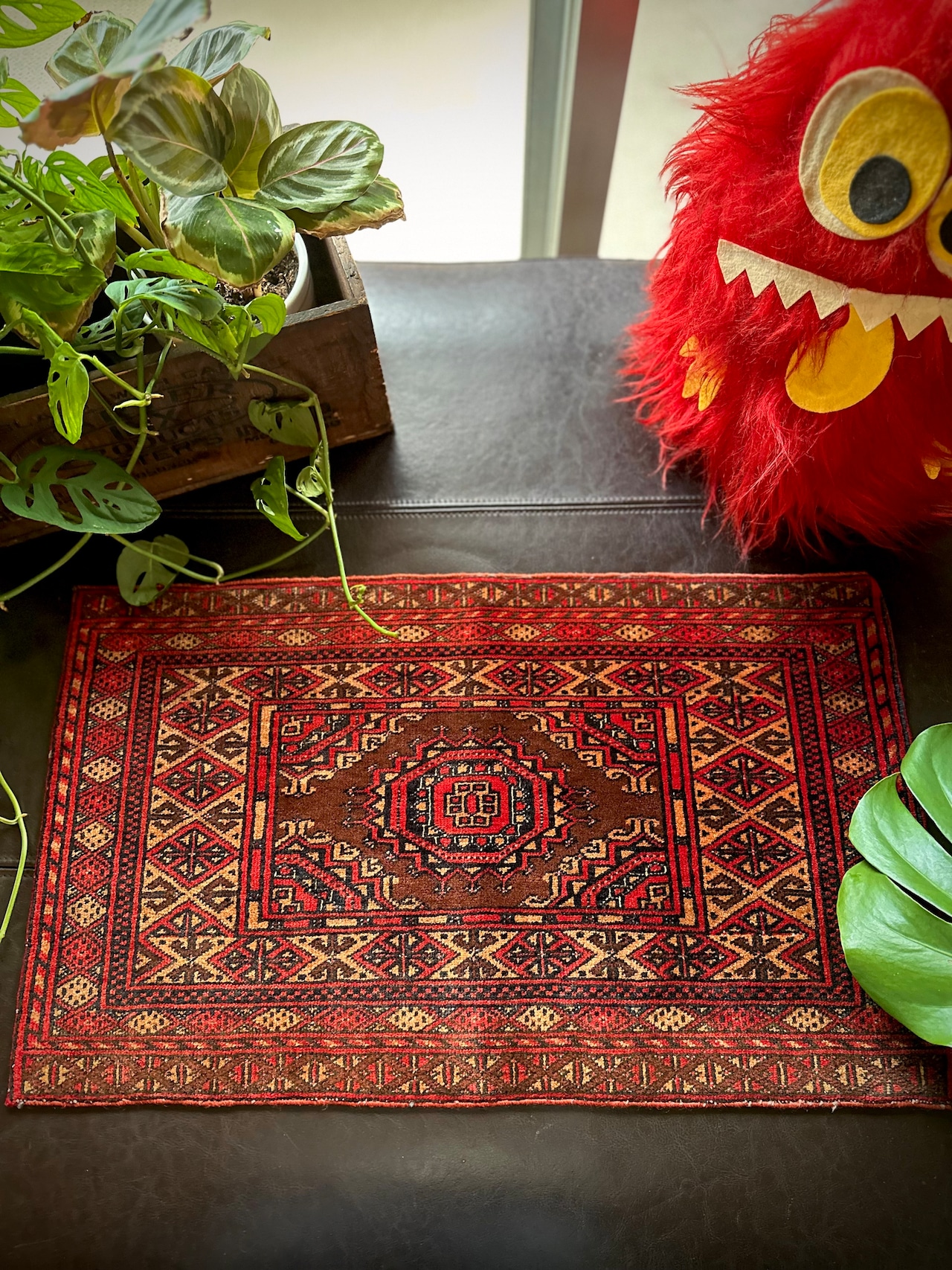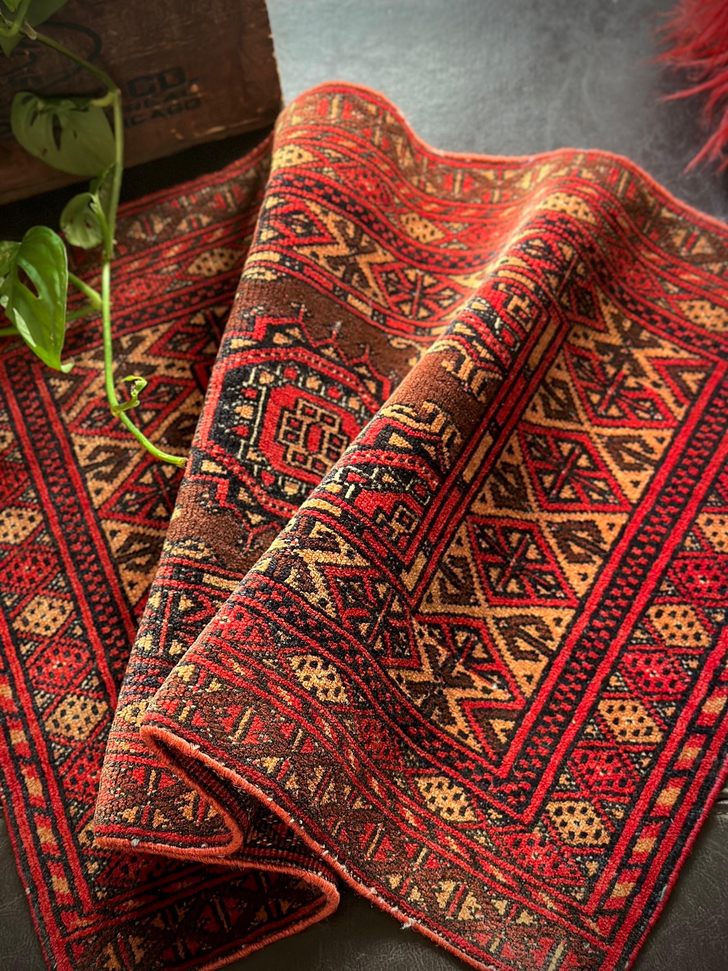 鮮やかなオレンジとレッドにブラウンが合わさった暖かみのあるこちらは、アフガニスタン北部に居住するトルクメン族のトライバルラグで、小振りなミニラグながらも端正に織られた薄手の1枚になります。