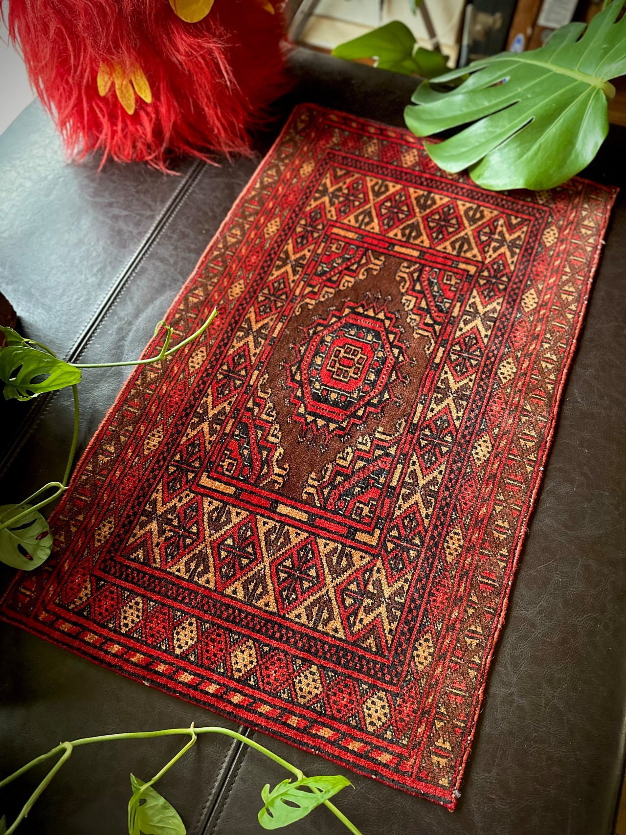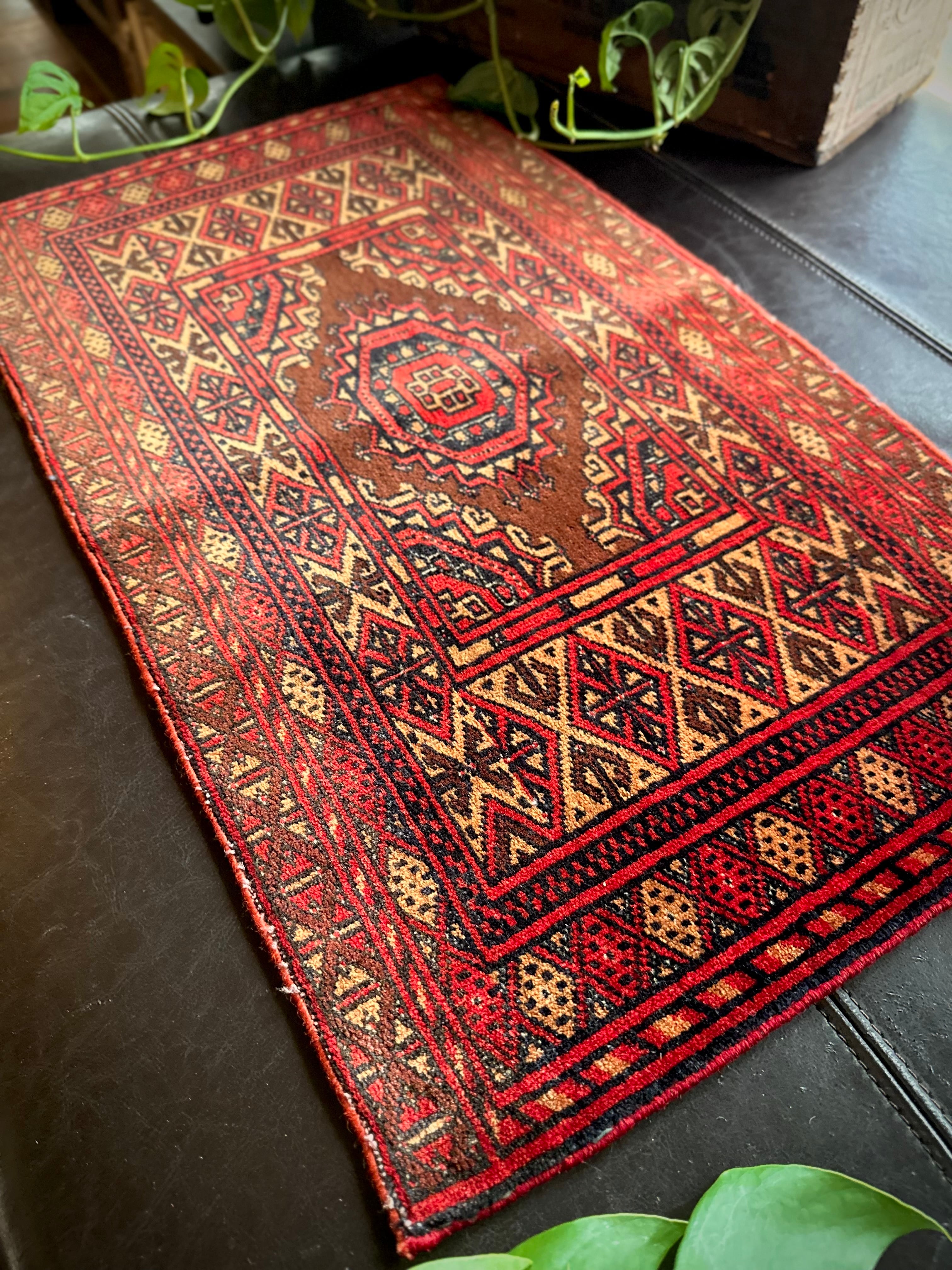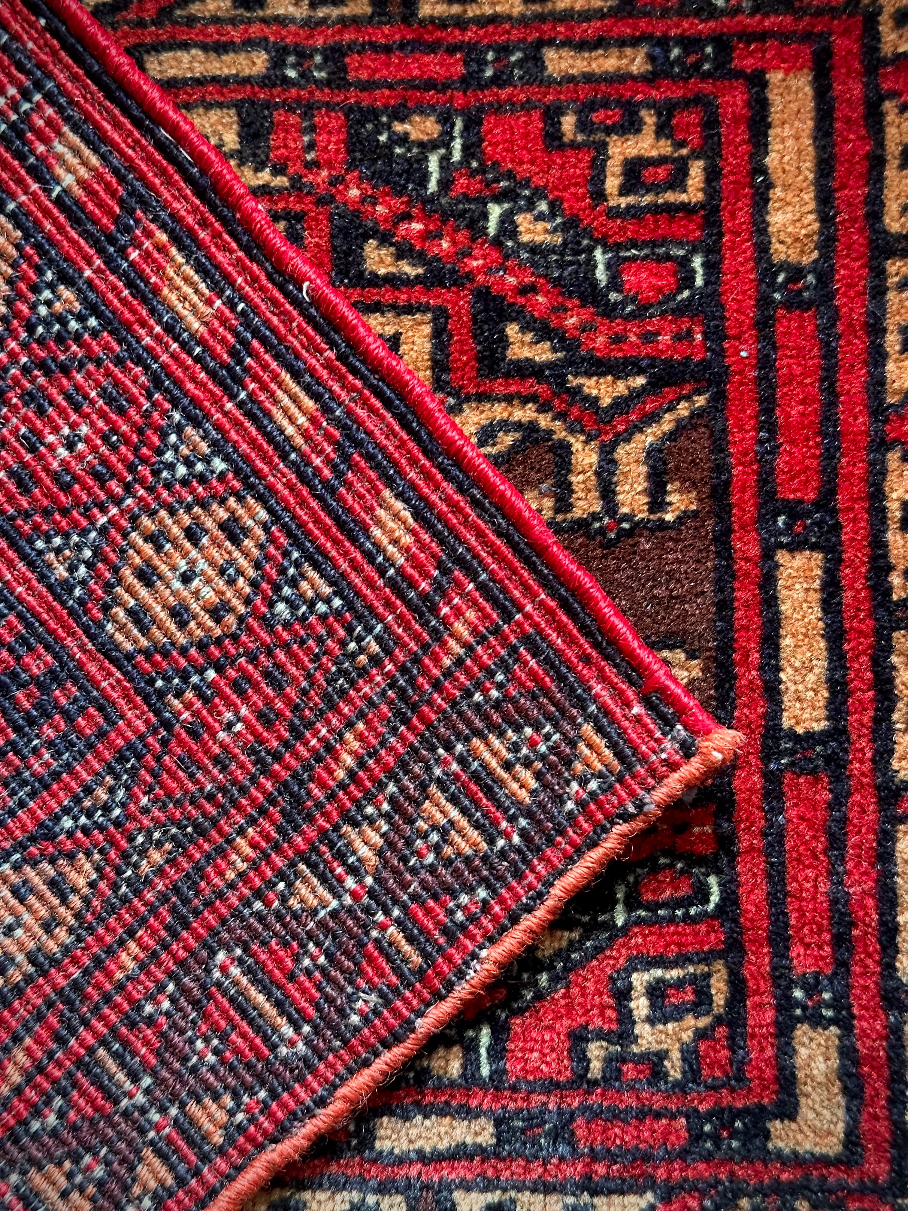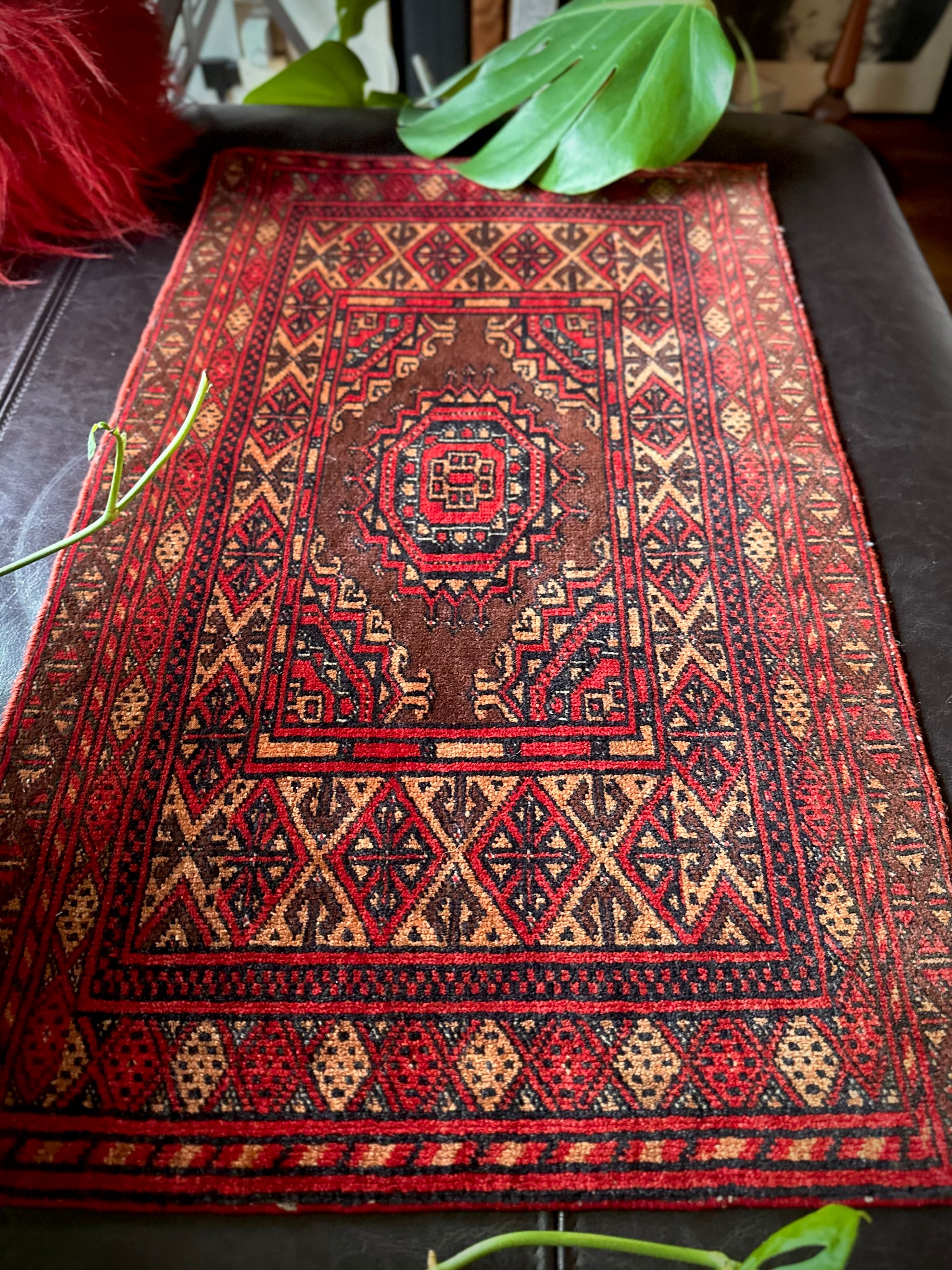 鮮やかなオレンジとレッドにブラウンが合わさった暖かみのあるこちらは、アフガニスタン北部に居住するトルクメン族のトライバルラグで、小振りなミニラグながらも端正に織られた薄手の1枚になります。