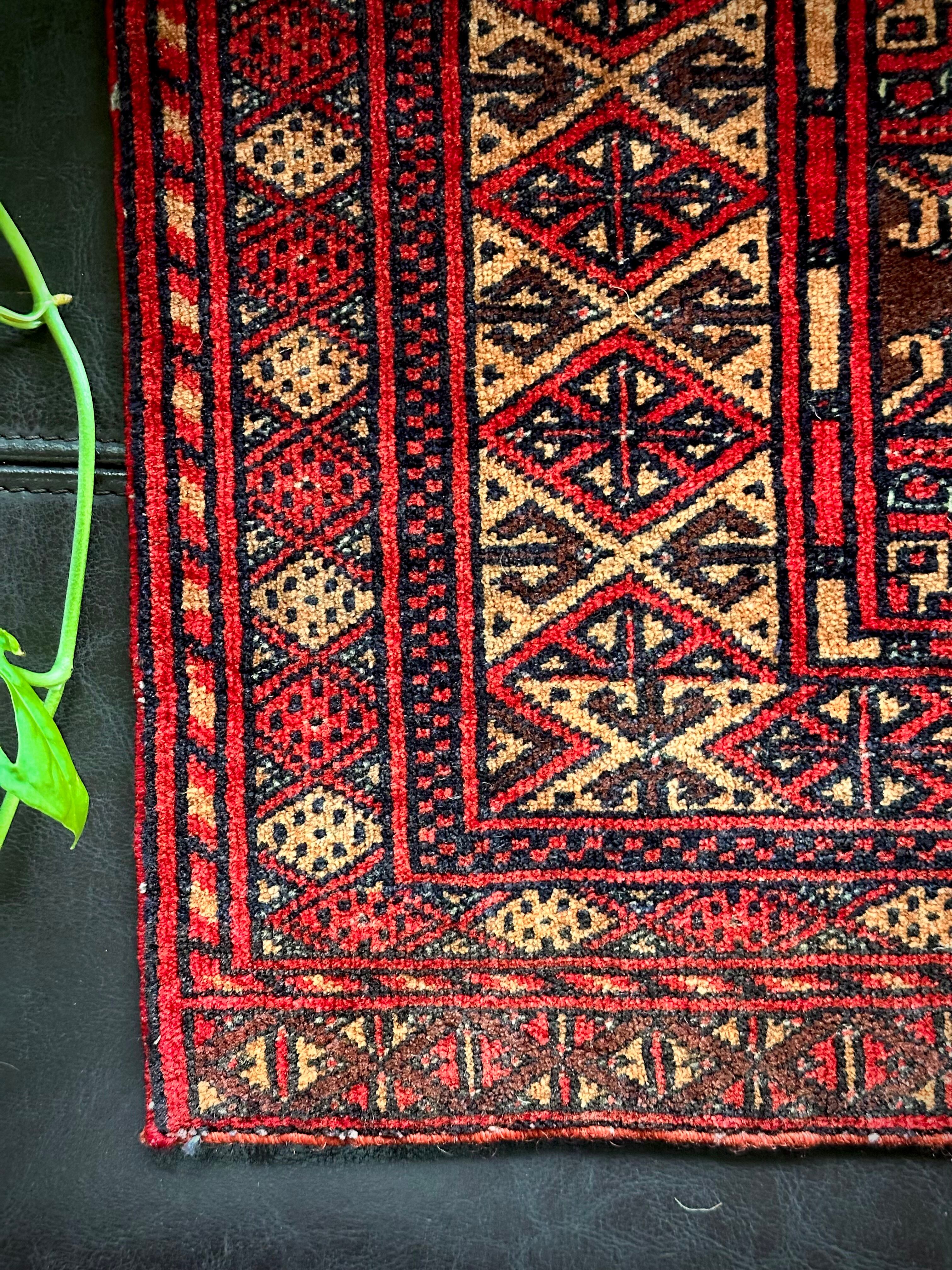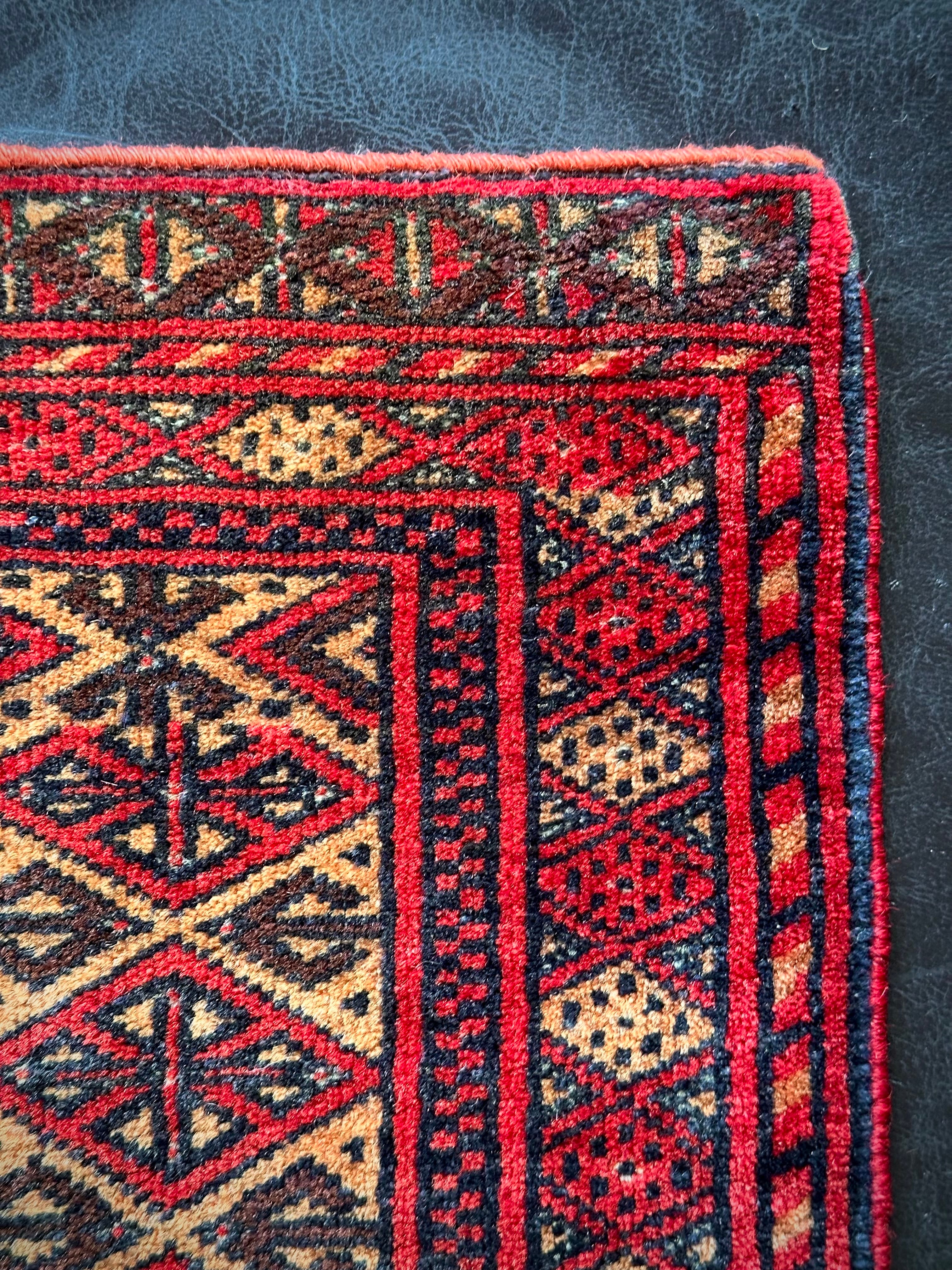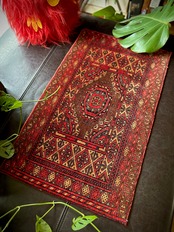 女性の装飾具をモチーフにしたサロールギュルを中央に、トルクメンらしいミルフィーユ状のボーダーがフィールドを引き立てているでしょうか。大きさはちょっとした机の上や棚などに敷いてもらえる扱いやすいサイズ感で、燃える様な色合いが植物とも相性が良さげです。
