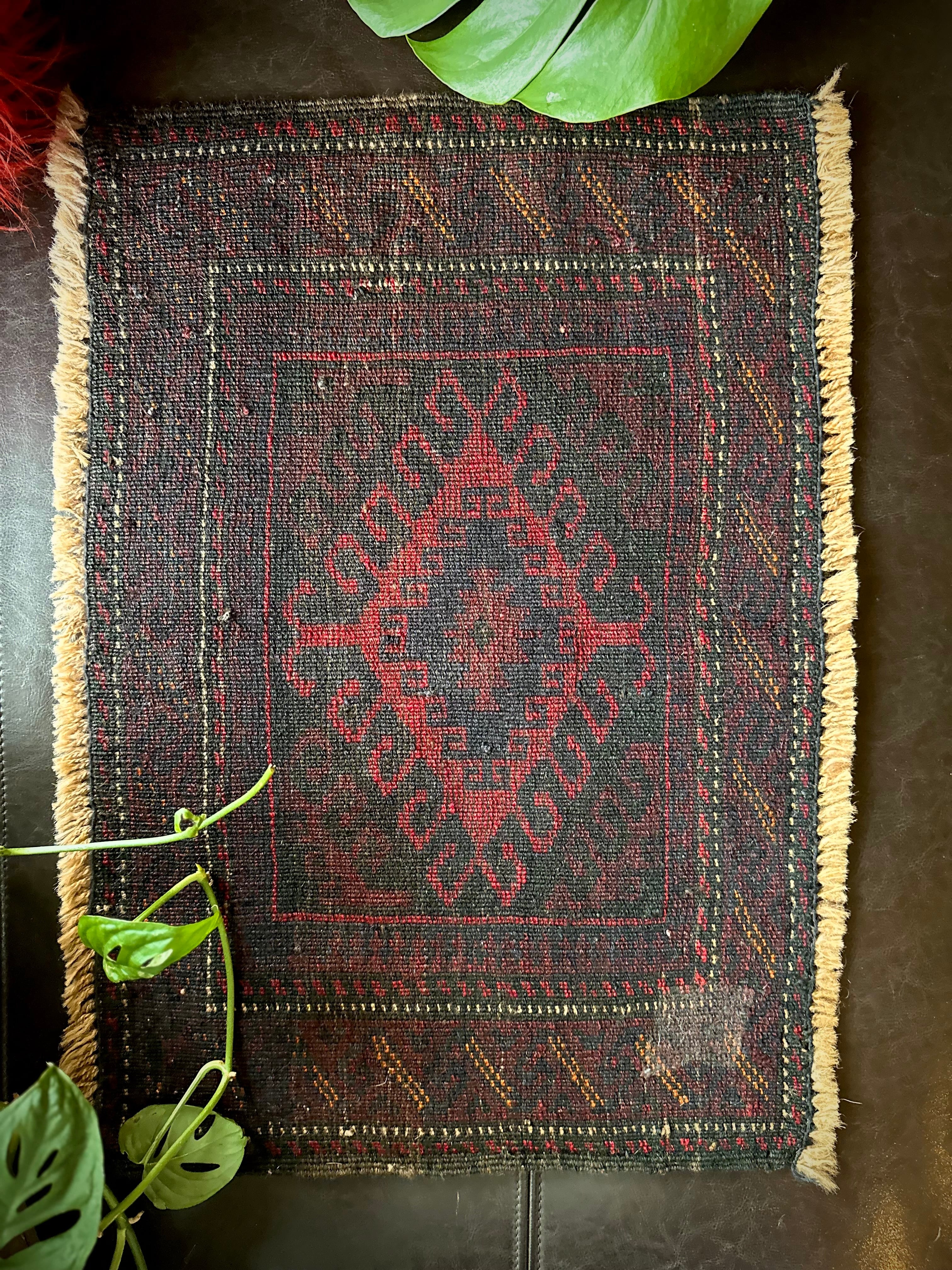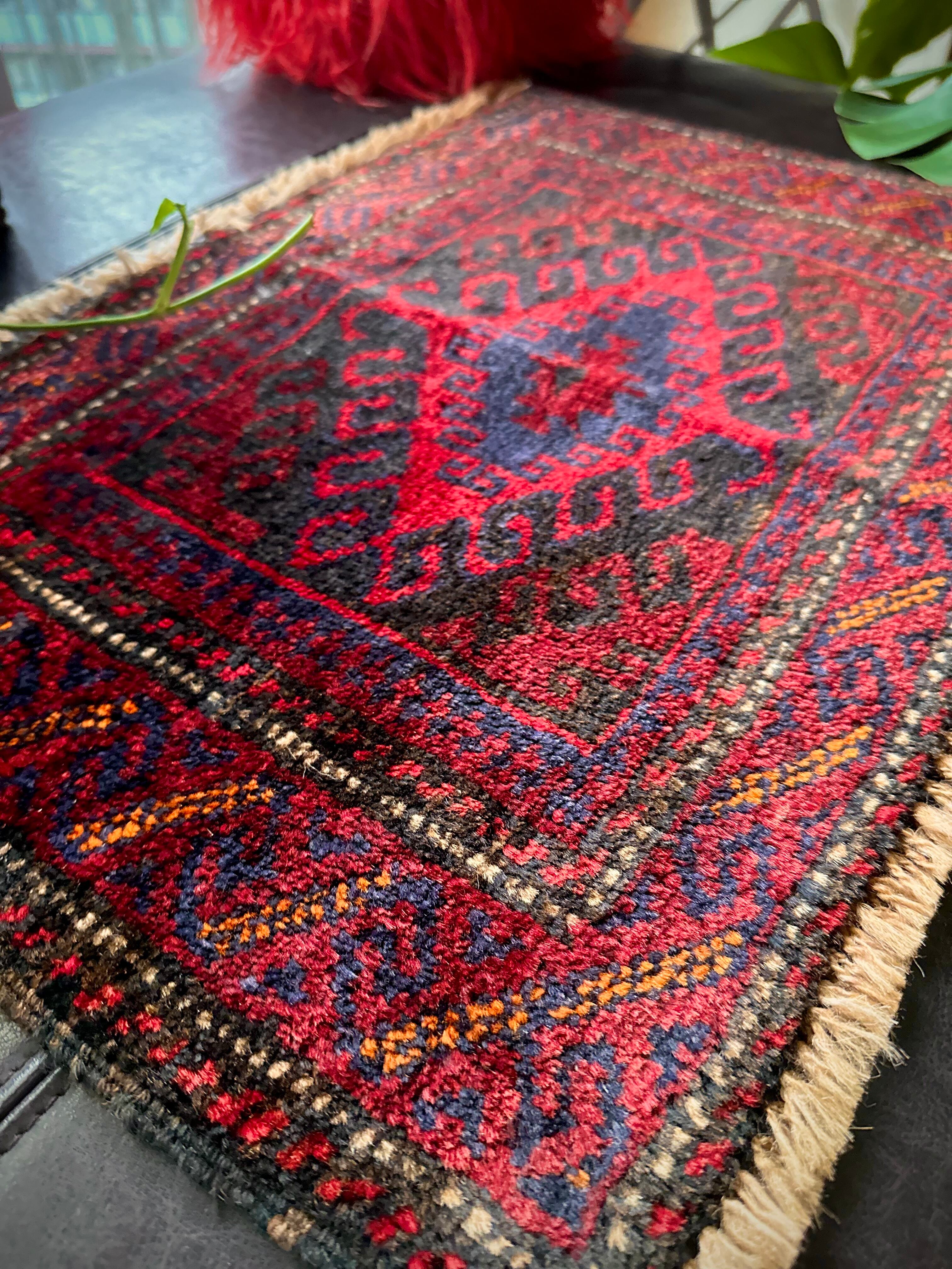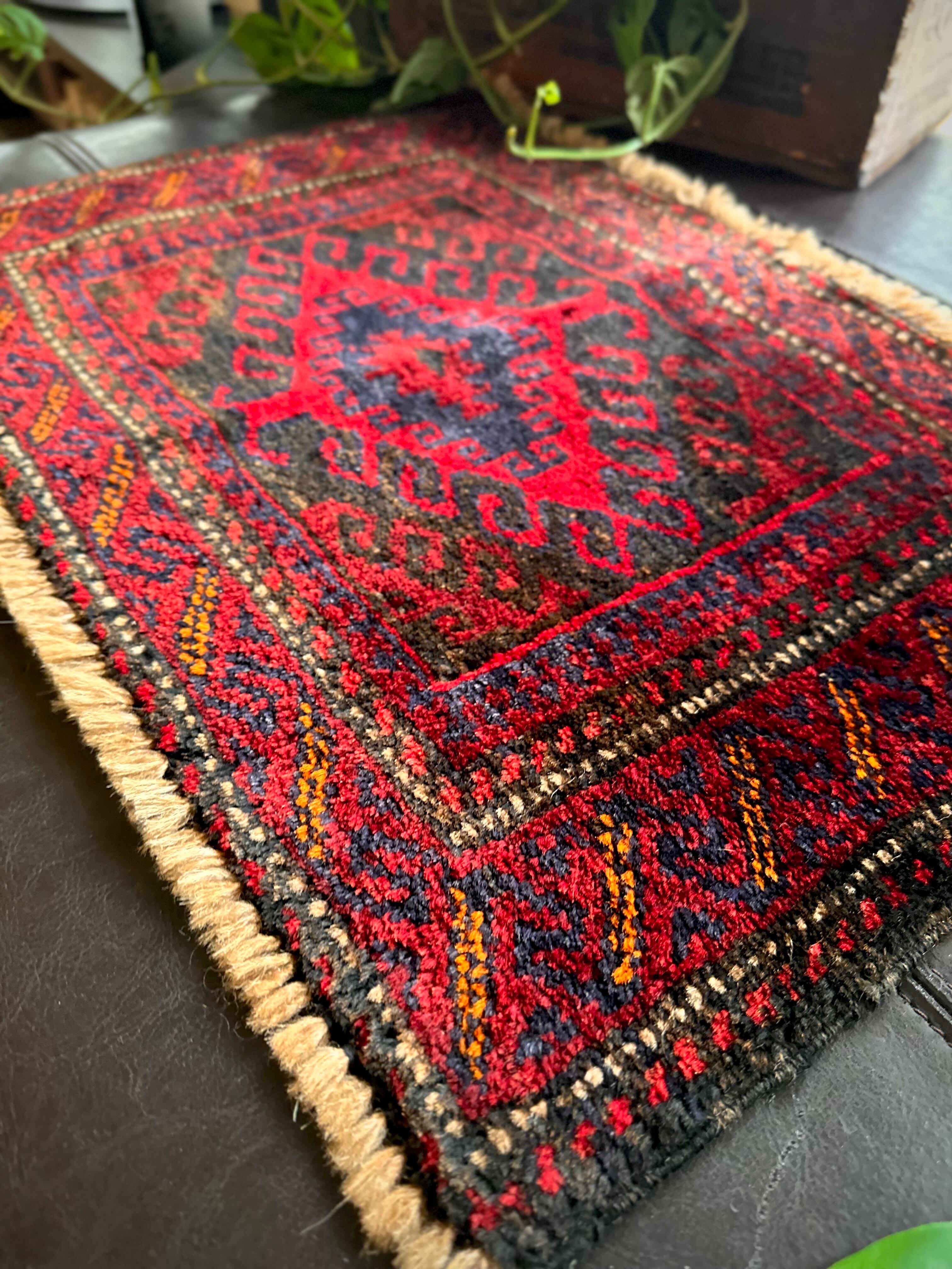 元々はラクダなどに担がせるホルジンと呼ばれるサドルバッグの表皮をラグに仕立て直したモノで、小さいながらも部族感が溢れ出た雰囲気がかっこいいでしょうか。大きさはテーブルや棚上などに敷けるミニラグなサイズ感で、鉢植え置きとしても使い勝手の良い1枚になります。