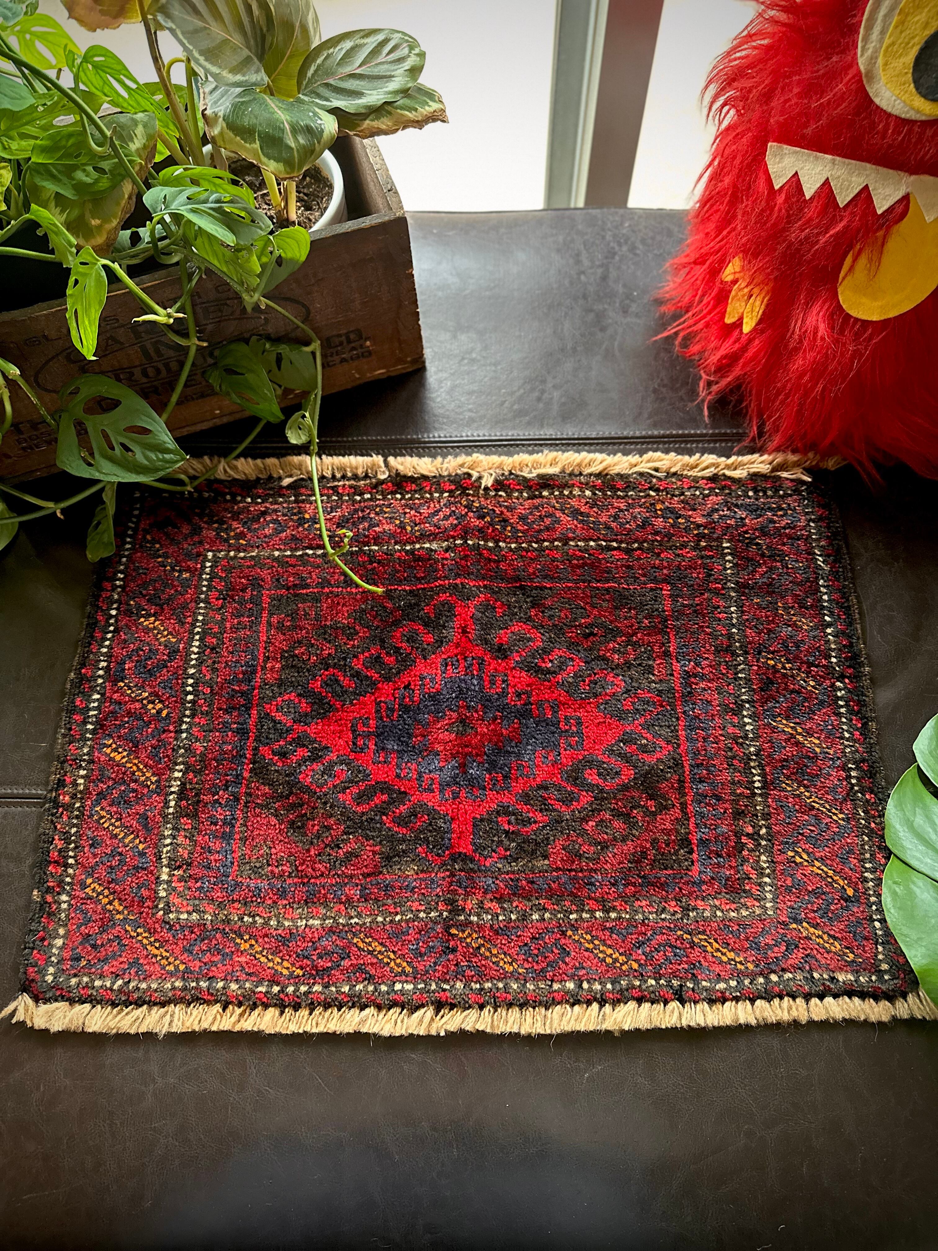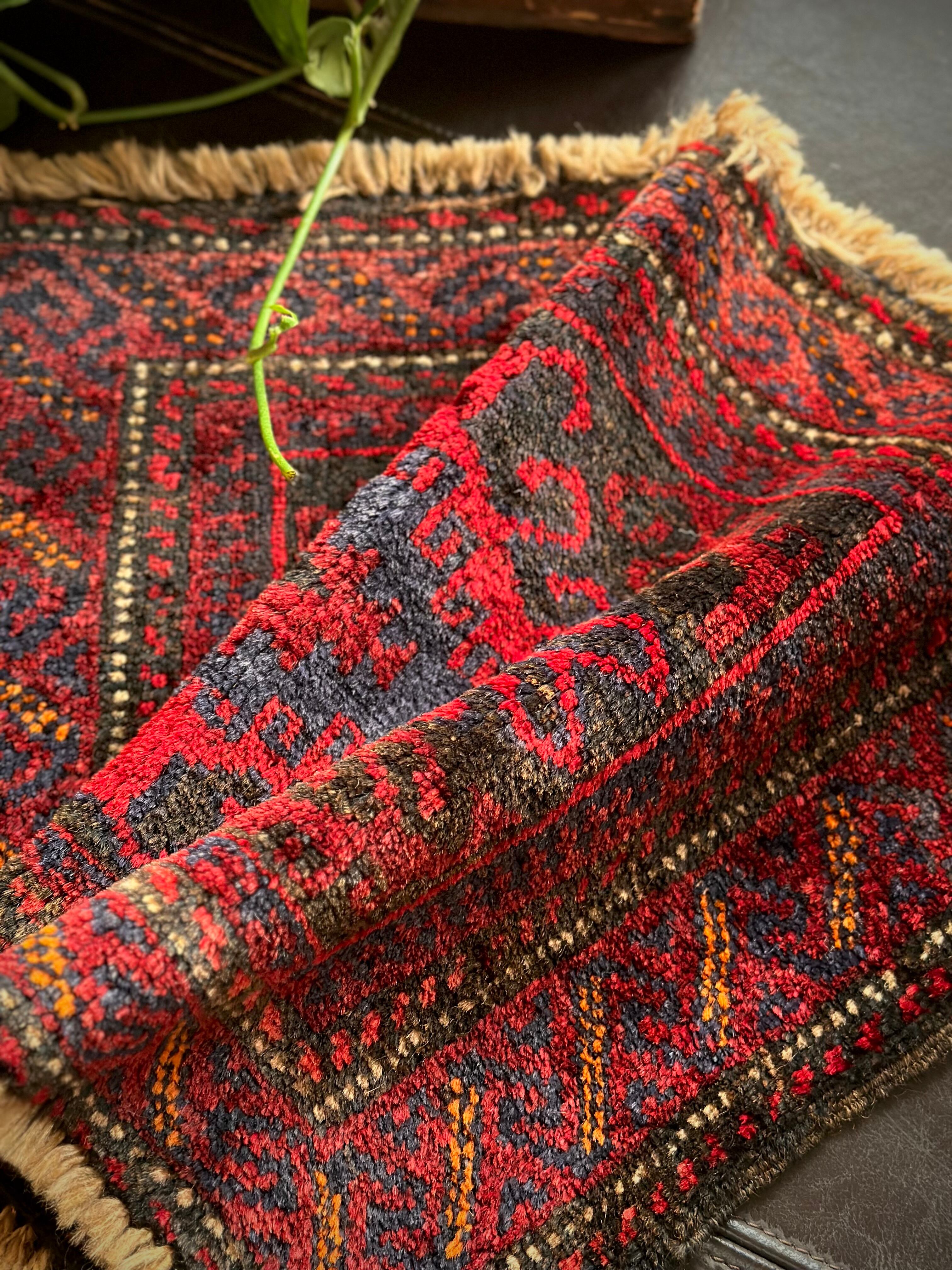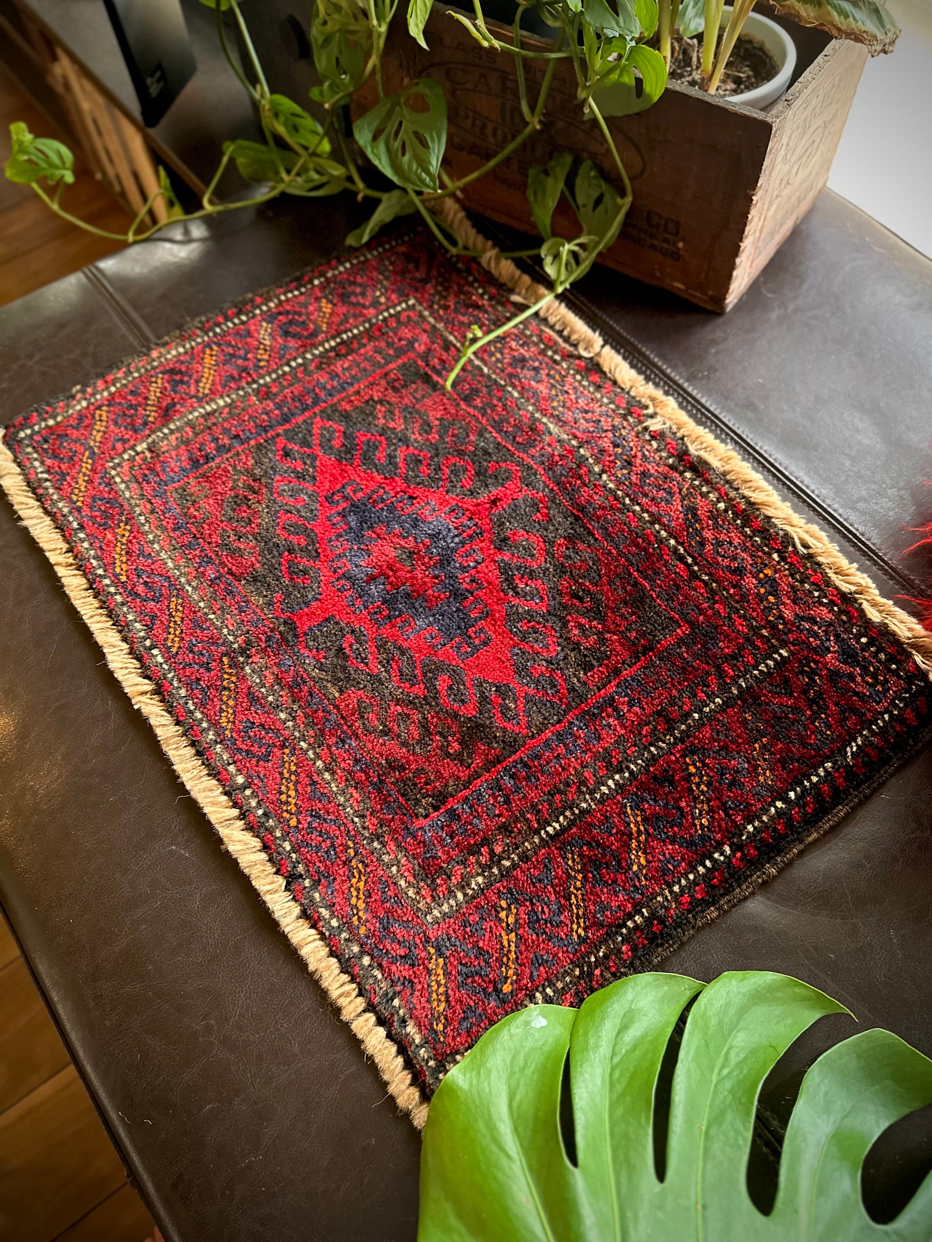 元々はラクダなどに担がせるホルジンと呼ばれるサドルバッグの表皮をラグに仕立て直したモノで、小さいながらも部族感が溢れ出た雰囲気がかっこいいでしょうか。大きさはテーブルや棚上などに敷けるミニラグなサイズ感で、鉢植え置きとしても使い勝手の良い1枚になります。