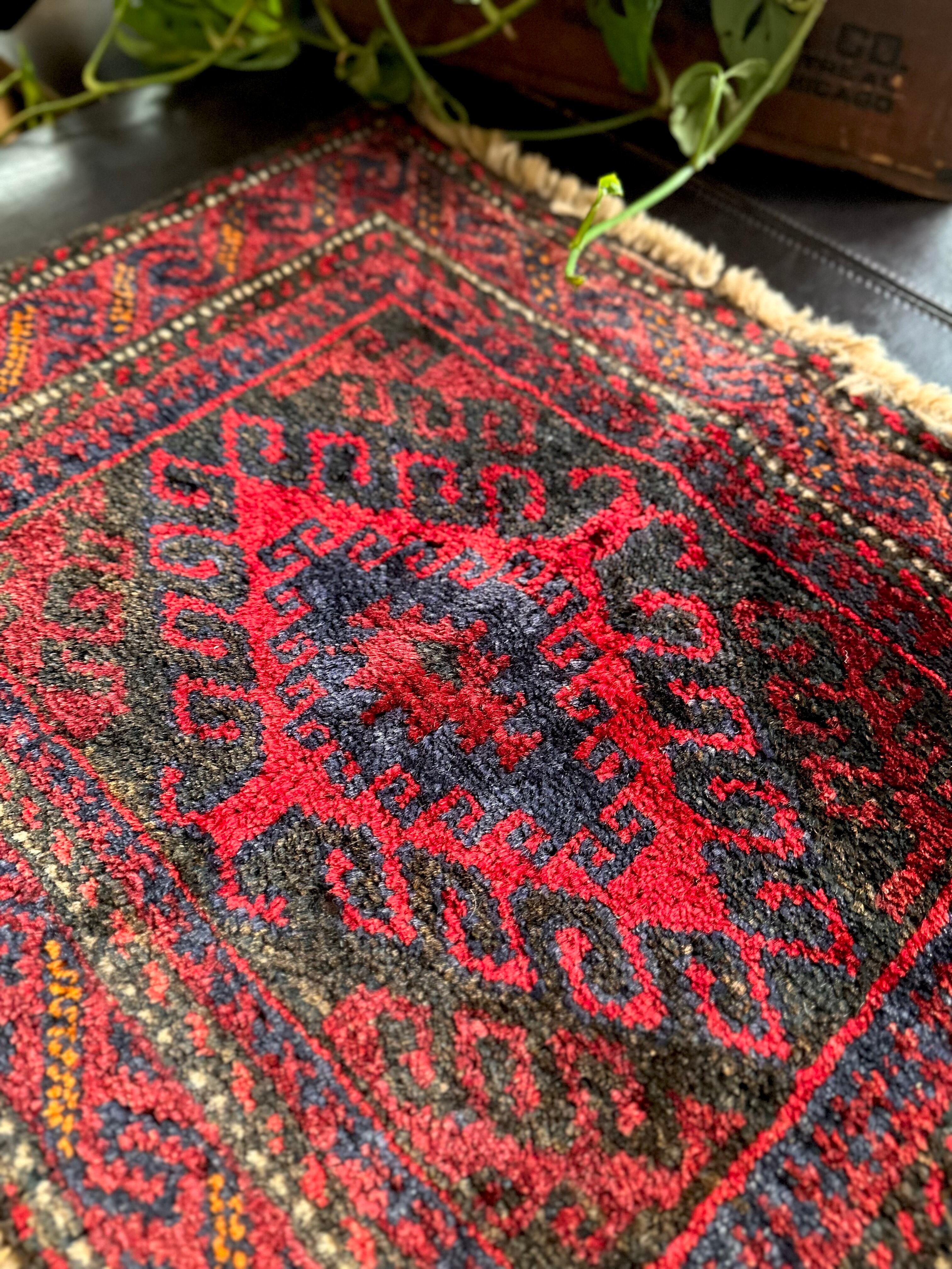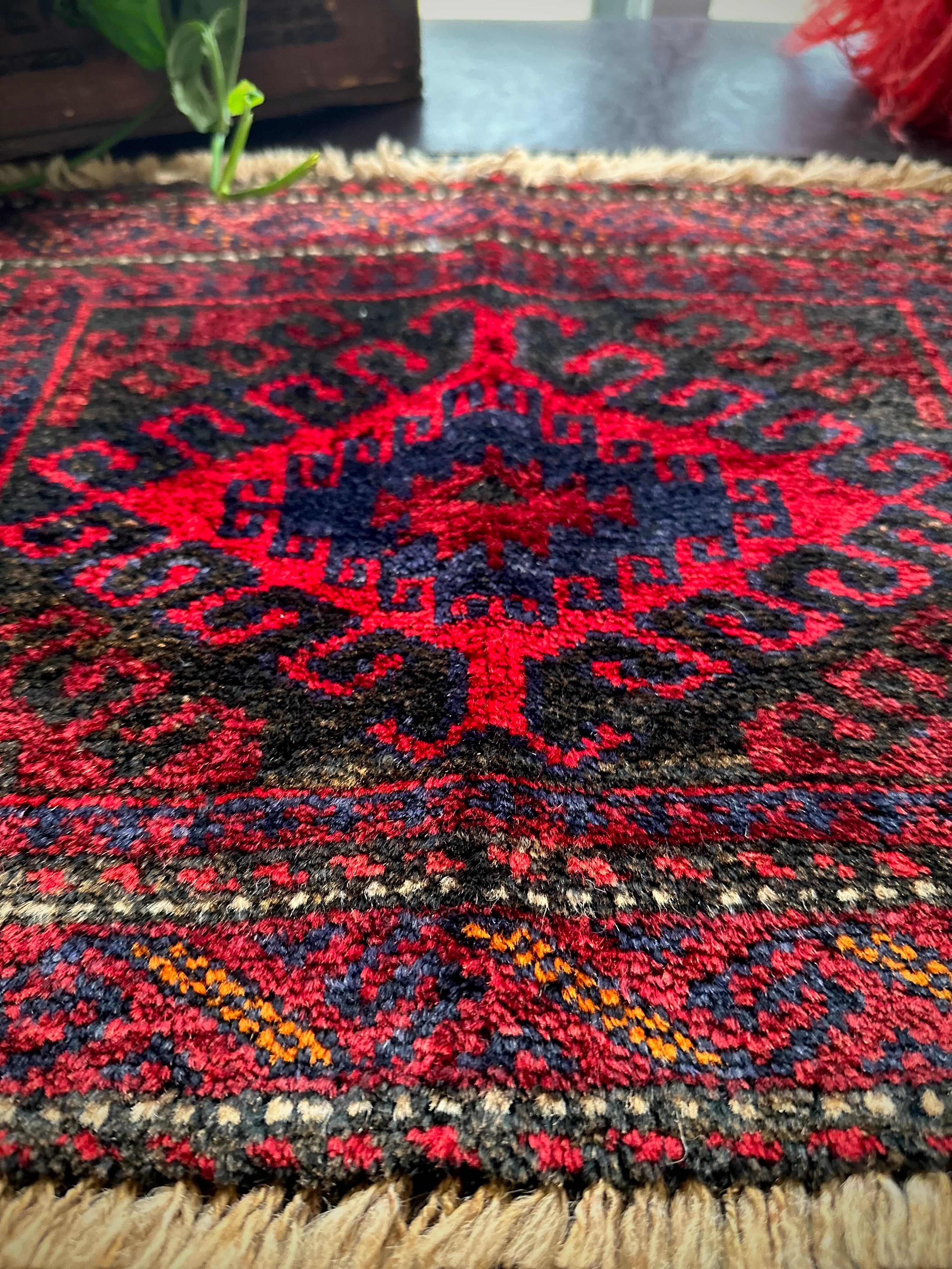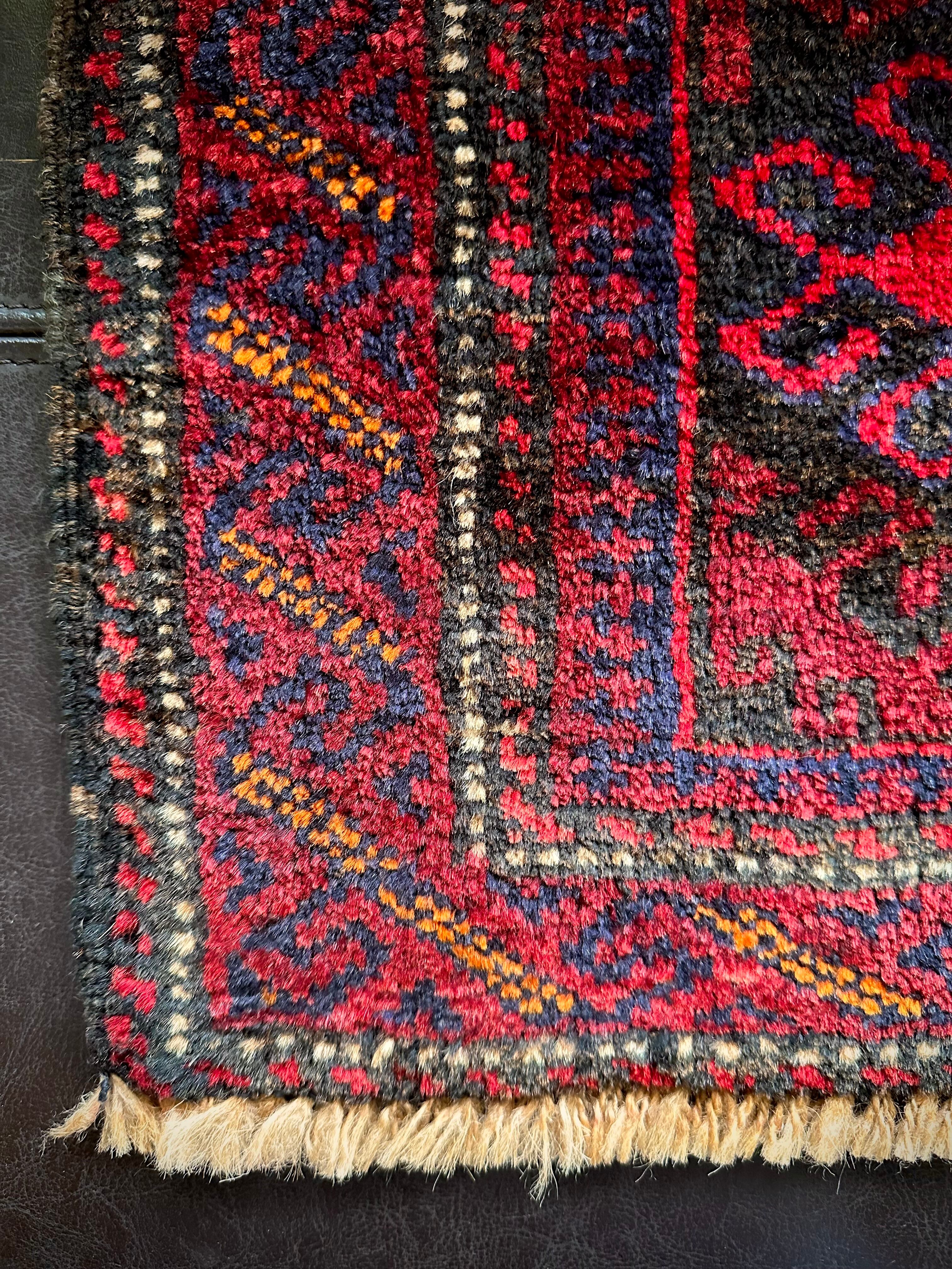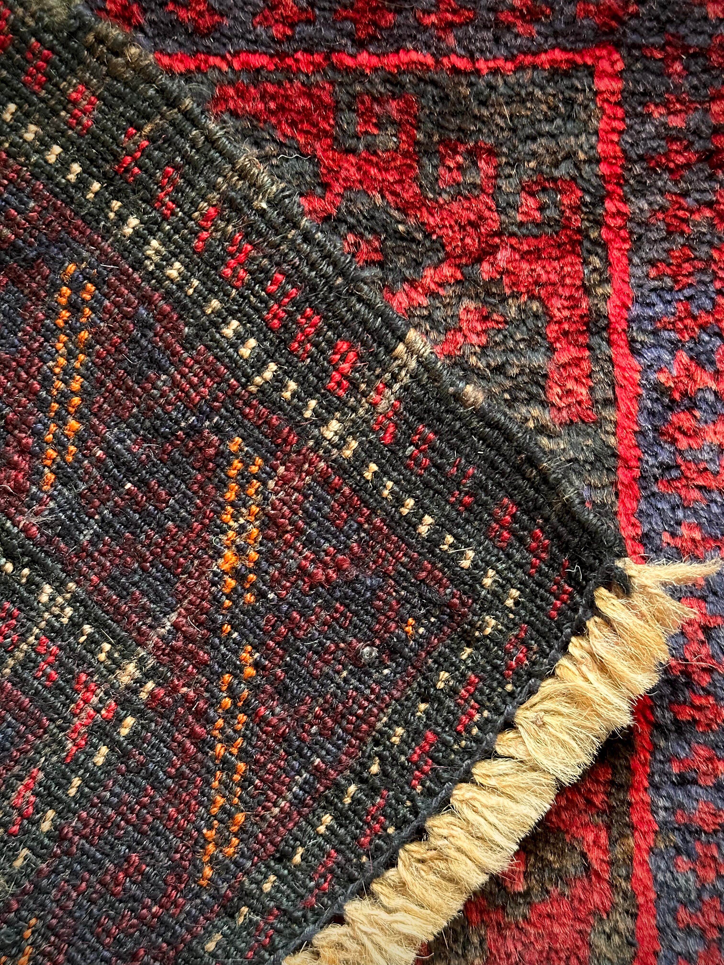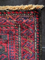 真っ赤なフックドメダリオンを中心に鈍く光るネイビーにブラックを織り混ぜ、イエローオレンジがアクセントになったバーガンディのボーダーが渋いこちらは、アフガニスタンはヘラート絨毯に居住するバルーチ族のトライバルラグになります。