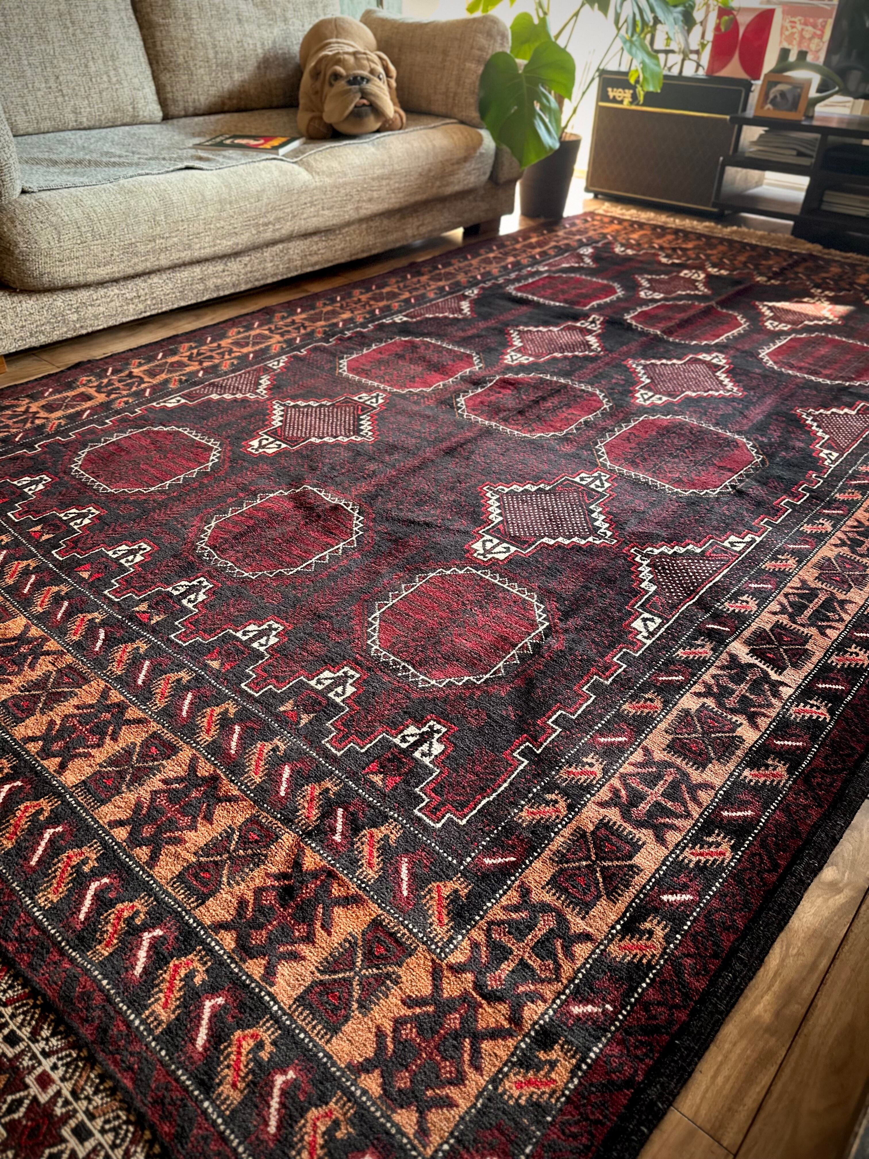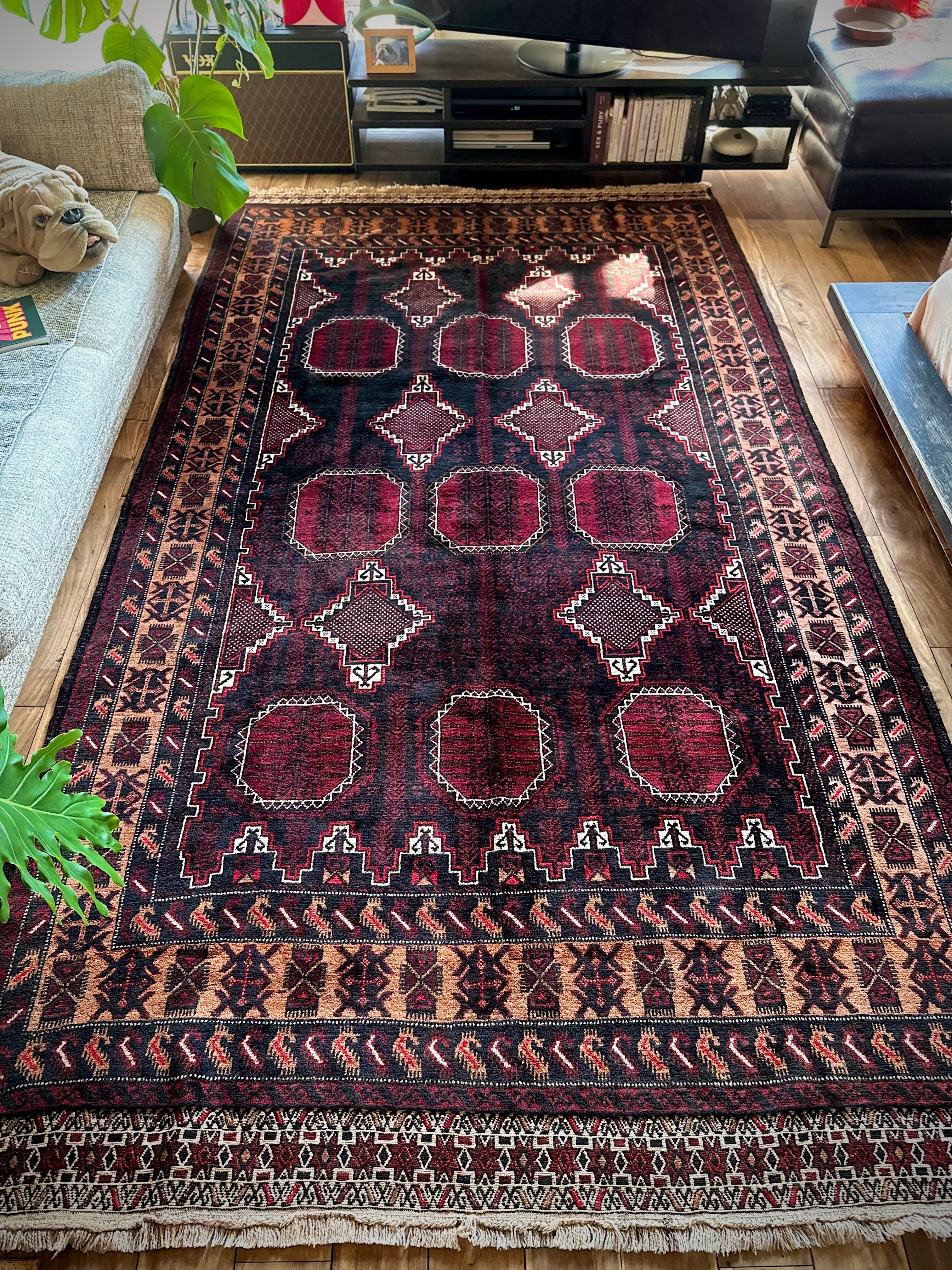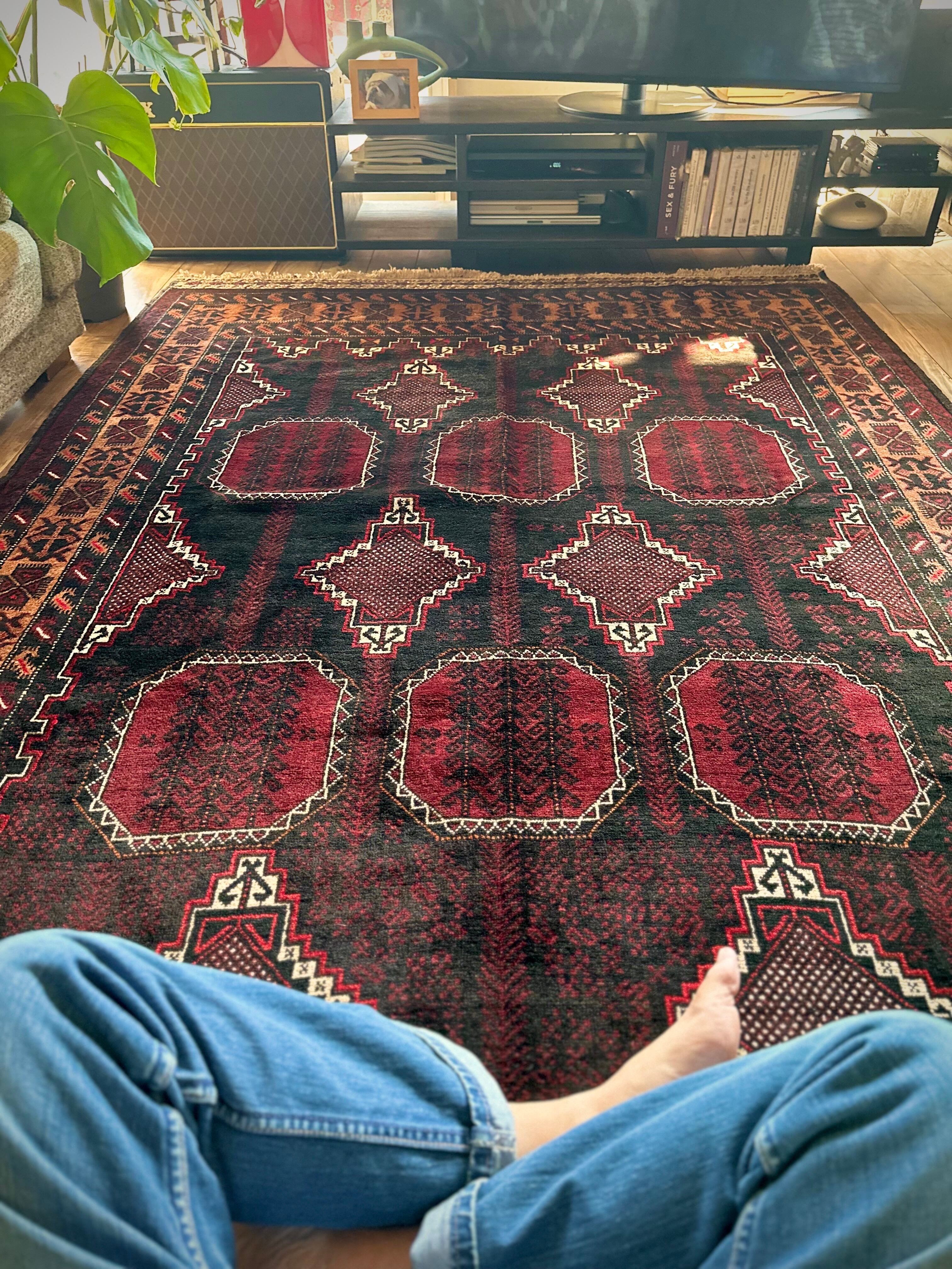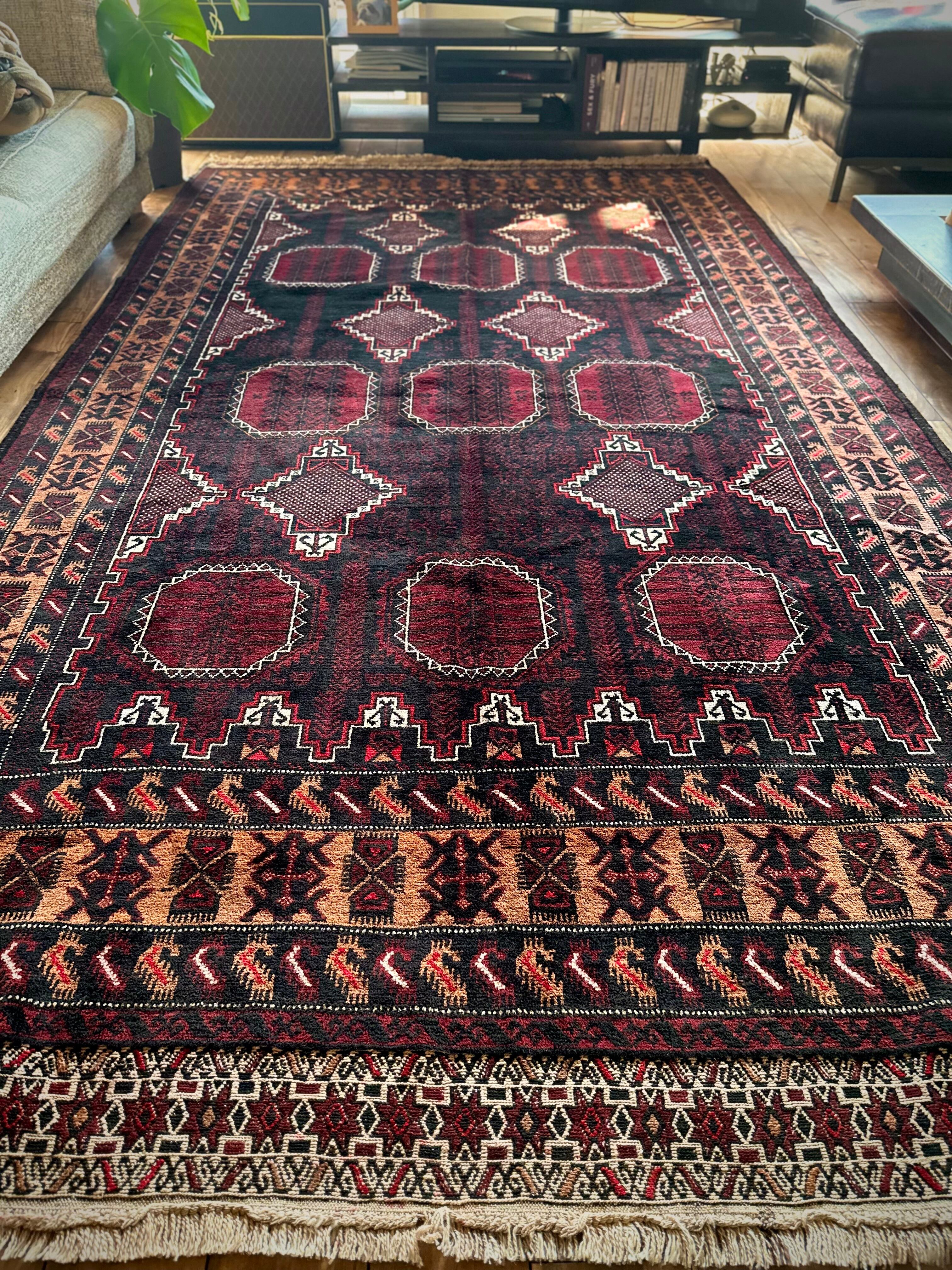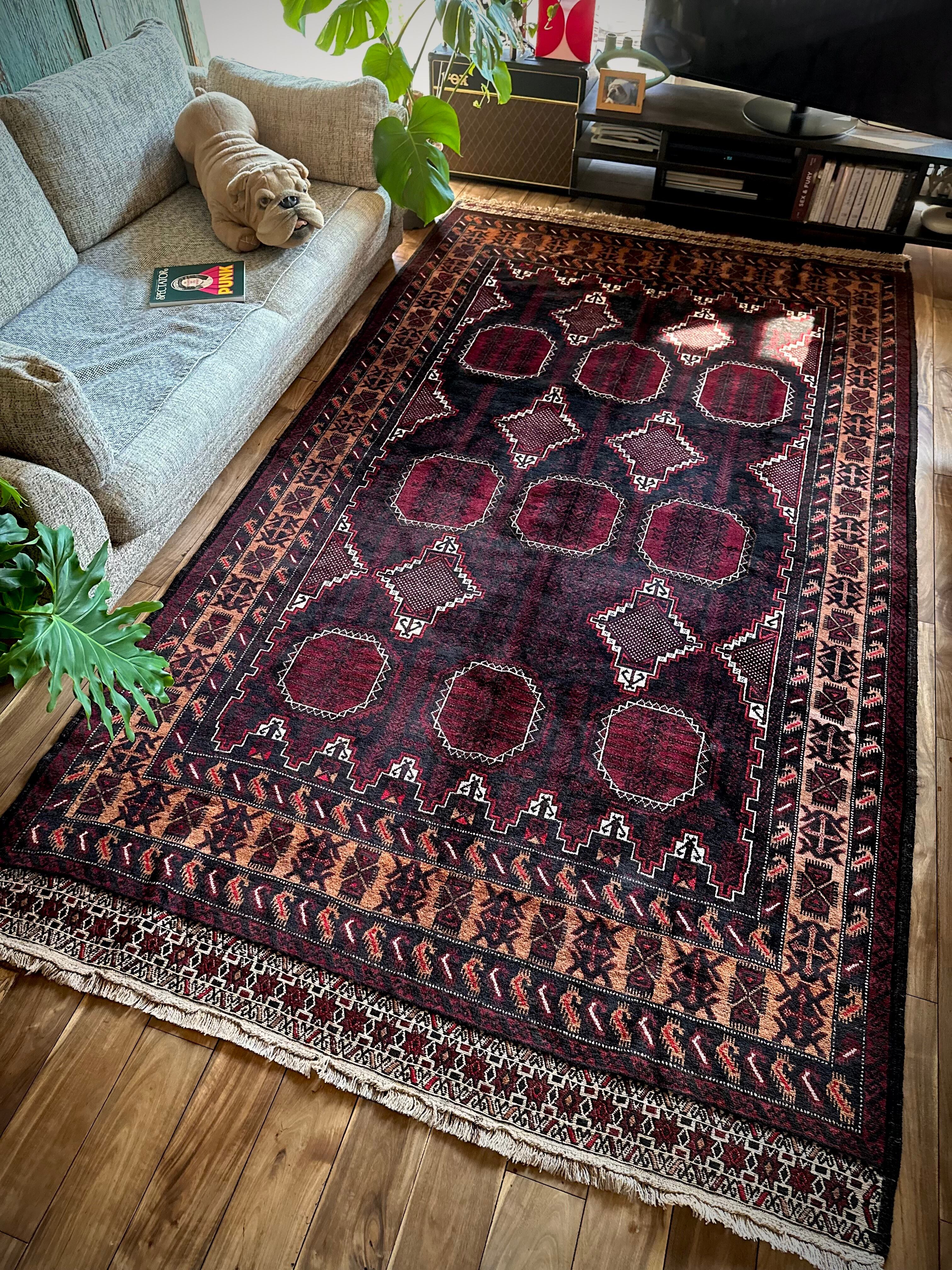 鈍く黒光りするブラックとバーガンディに、なんだかお洒落なカフェオレのボーダーが馴染むかっこいいこちらは、アフガニスタンはヘラート州に居住するバルーチ族のトライバルラグで、リビングを埋め尽くす3メーターを超えた特大サイズのメインラグになります。
