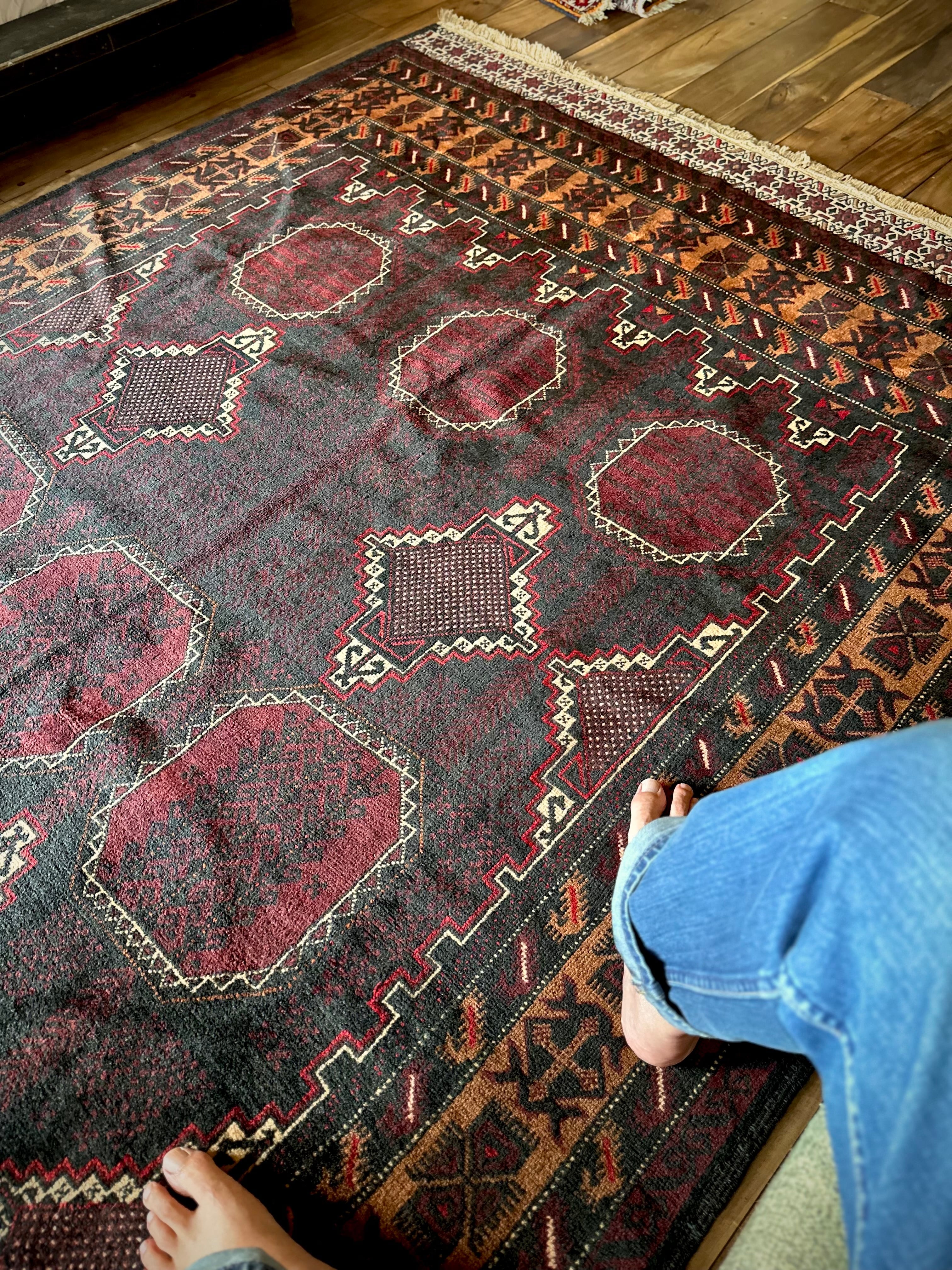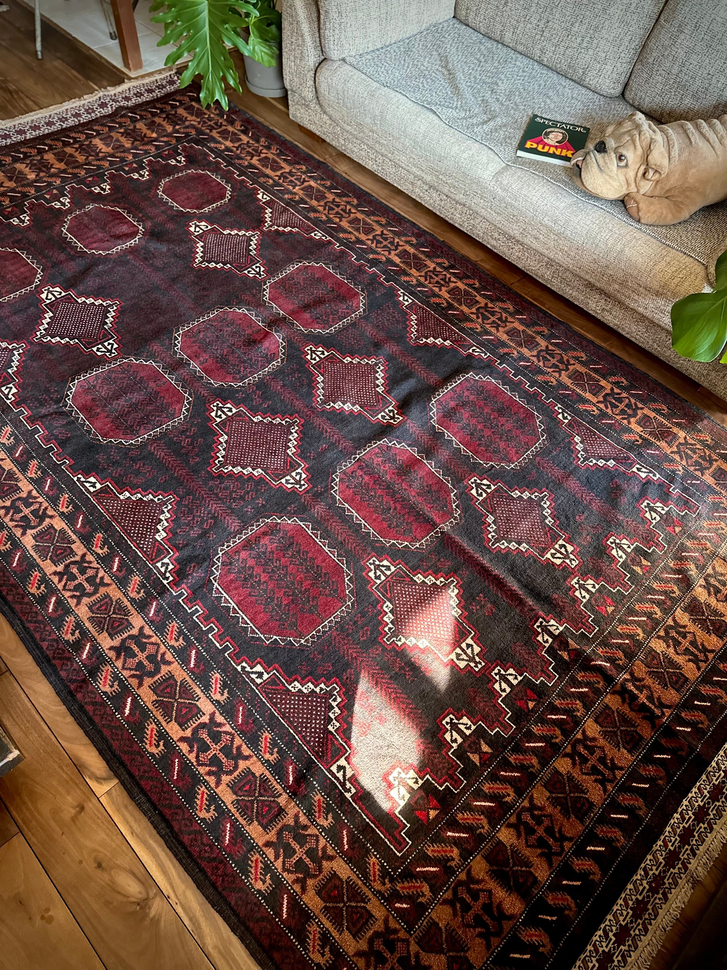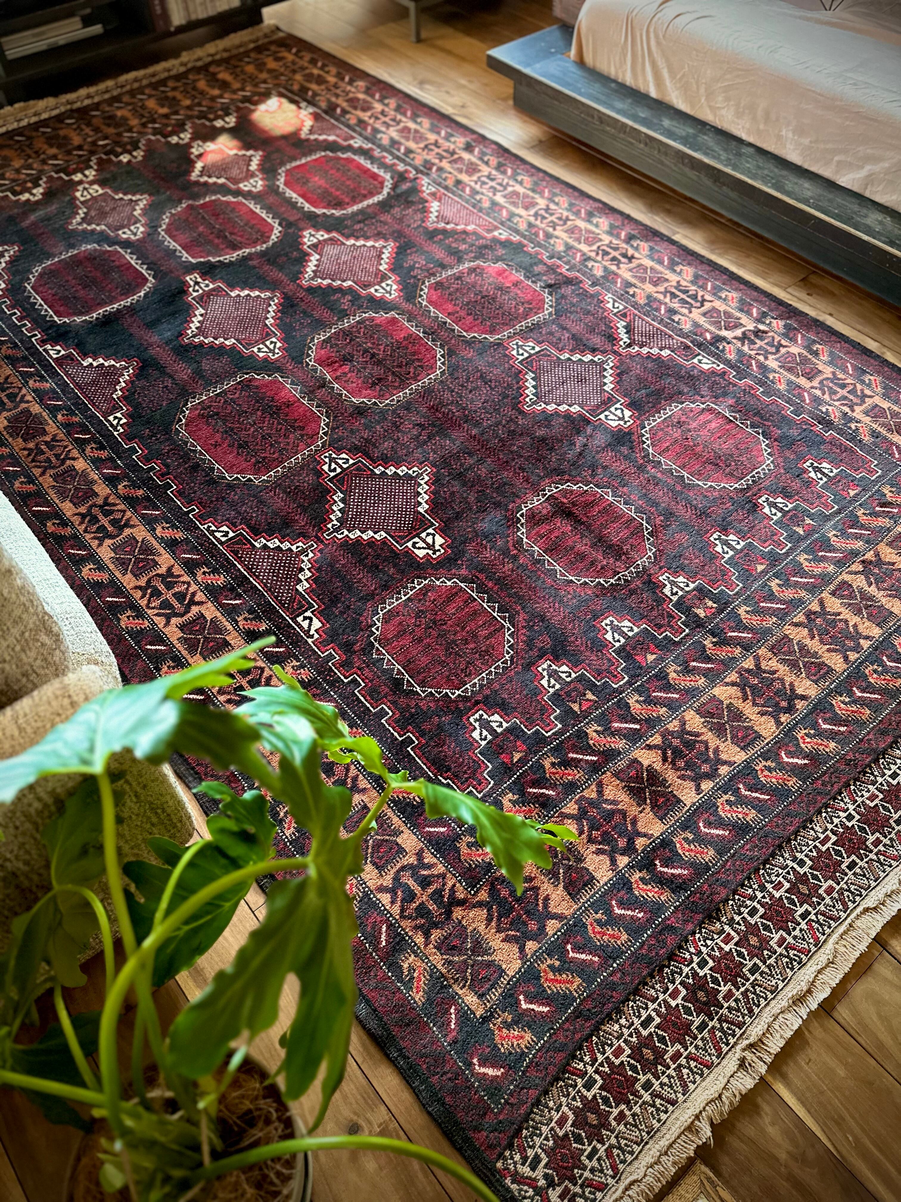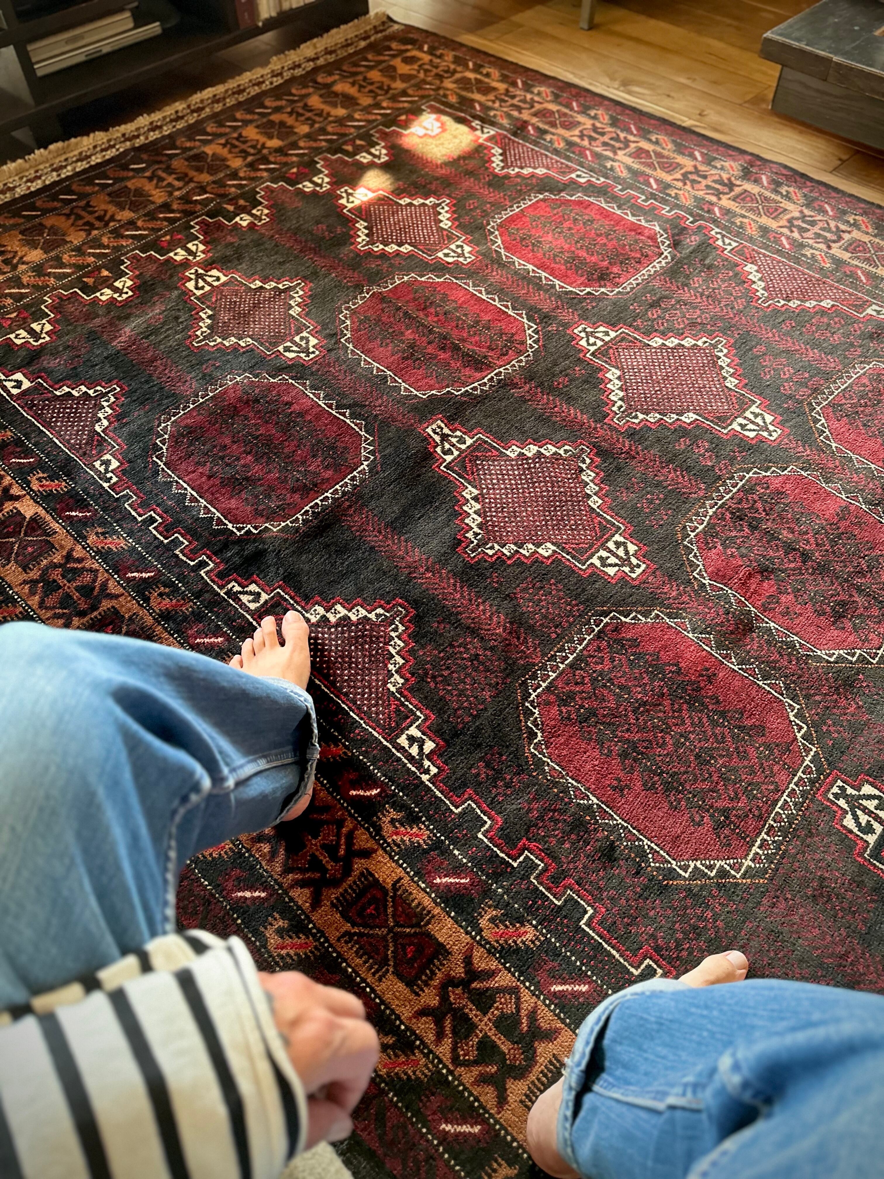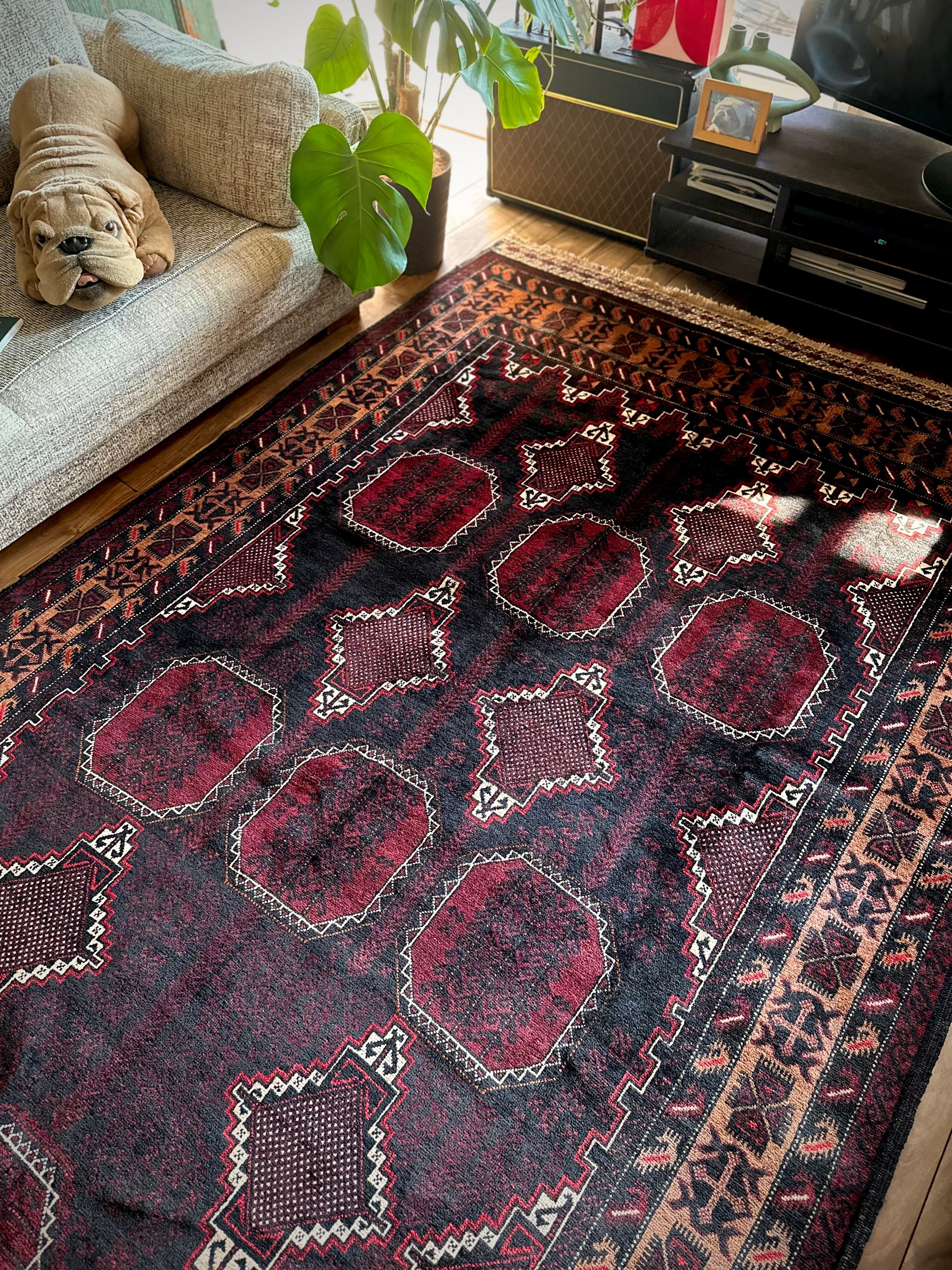 鈍く黒光りするブラックとバーガンディに、なんだかお洒落なカフェオレのボーダーが馴染むかっこいいこちらは、アフガニスタンはヘラート州に居住するバルーチ族のトライバルラグで、リビングを埋め尽くす3メーターを超えた特大サイズのメインラグになります。