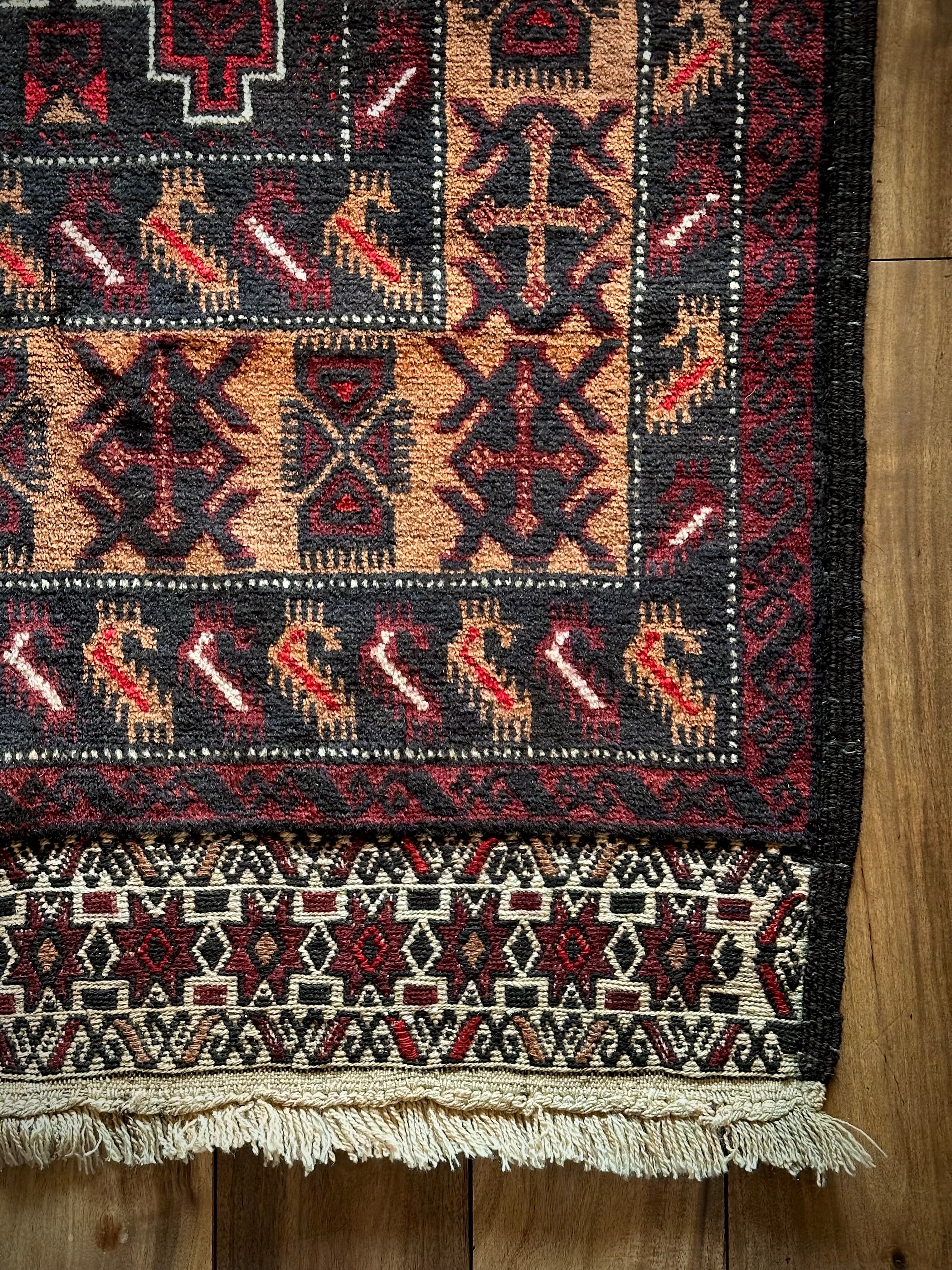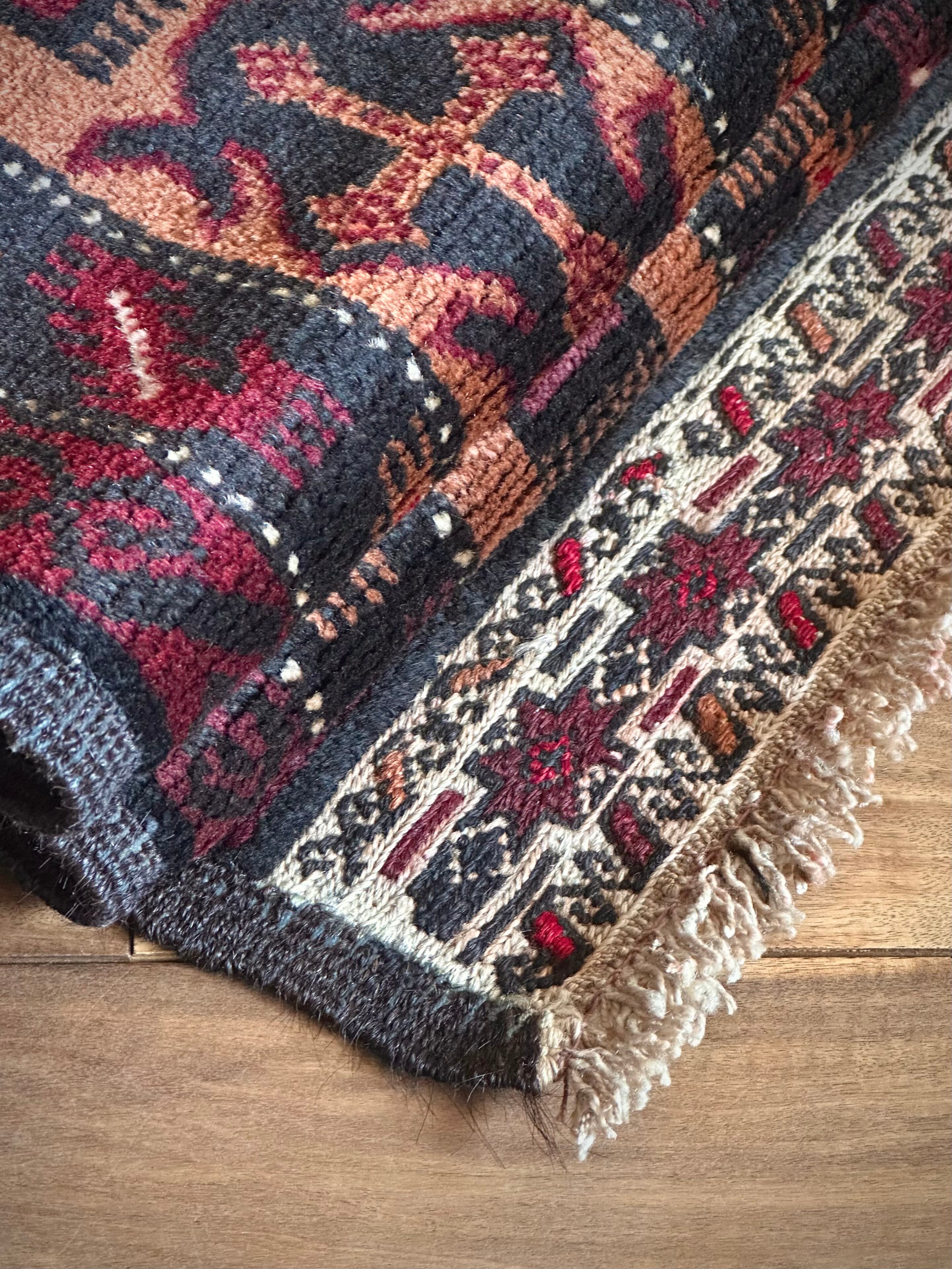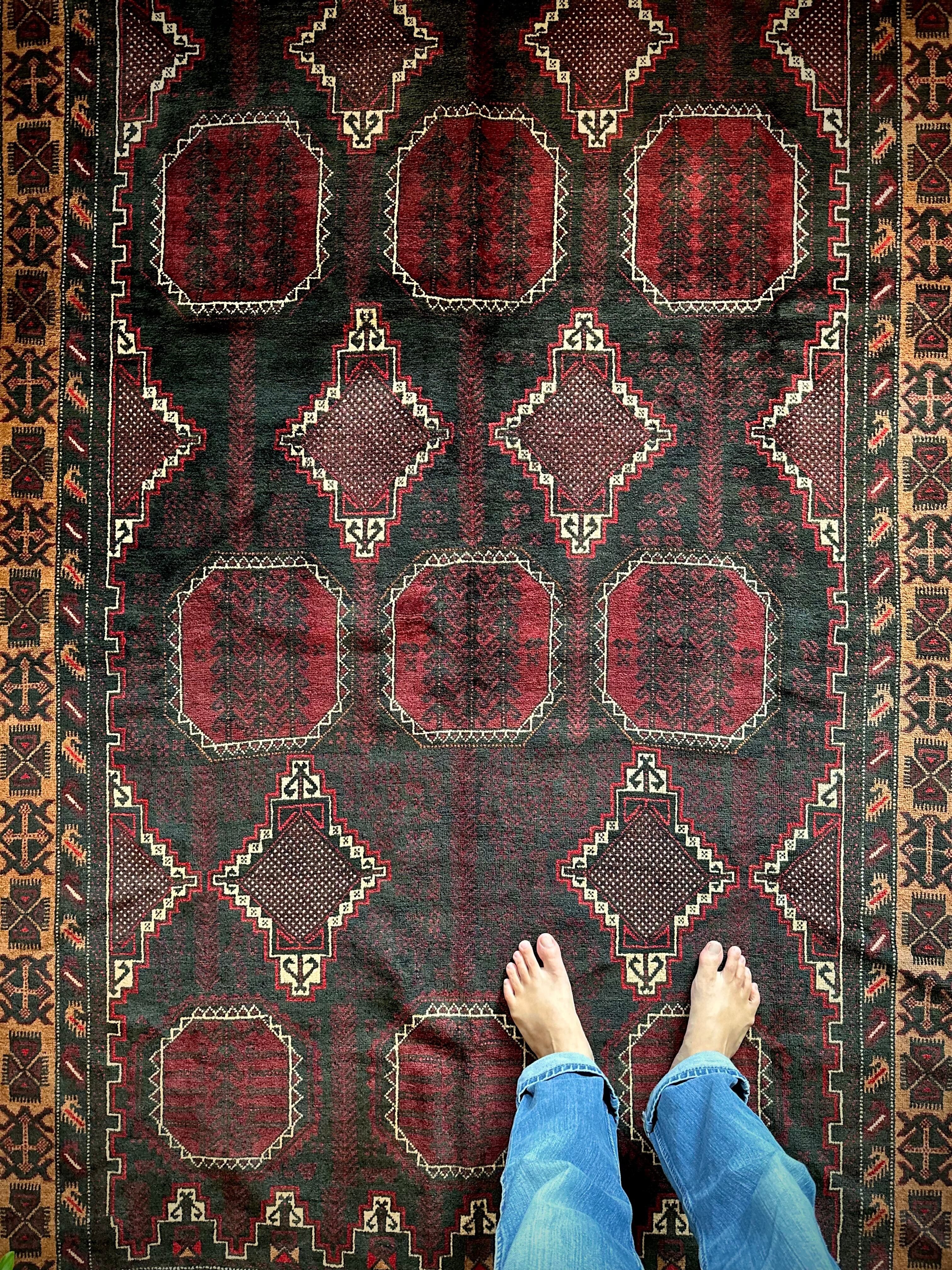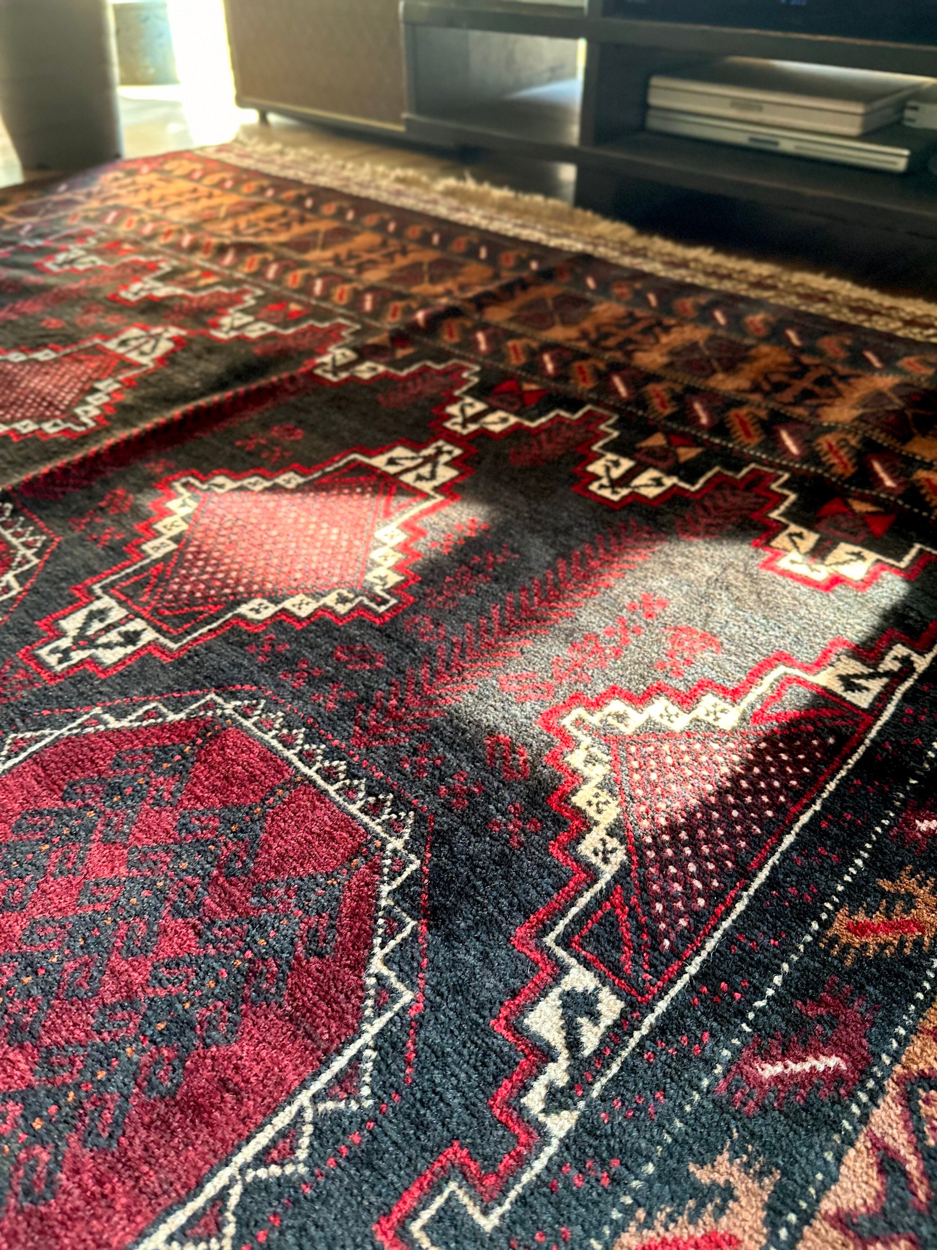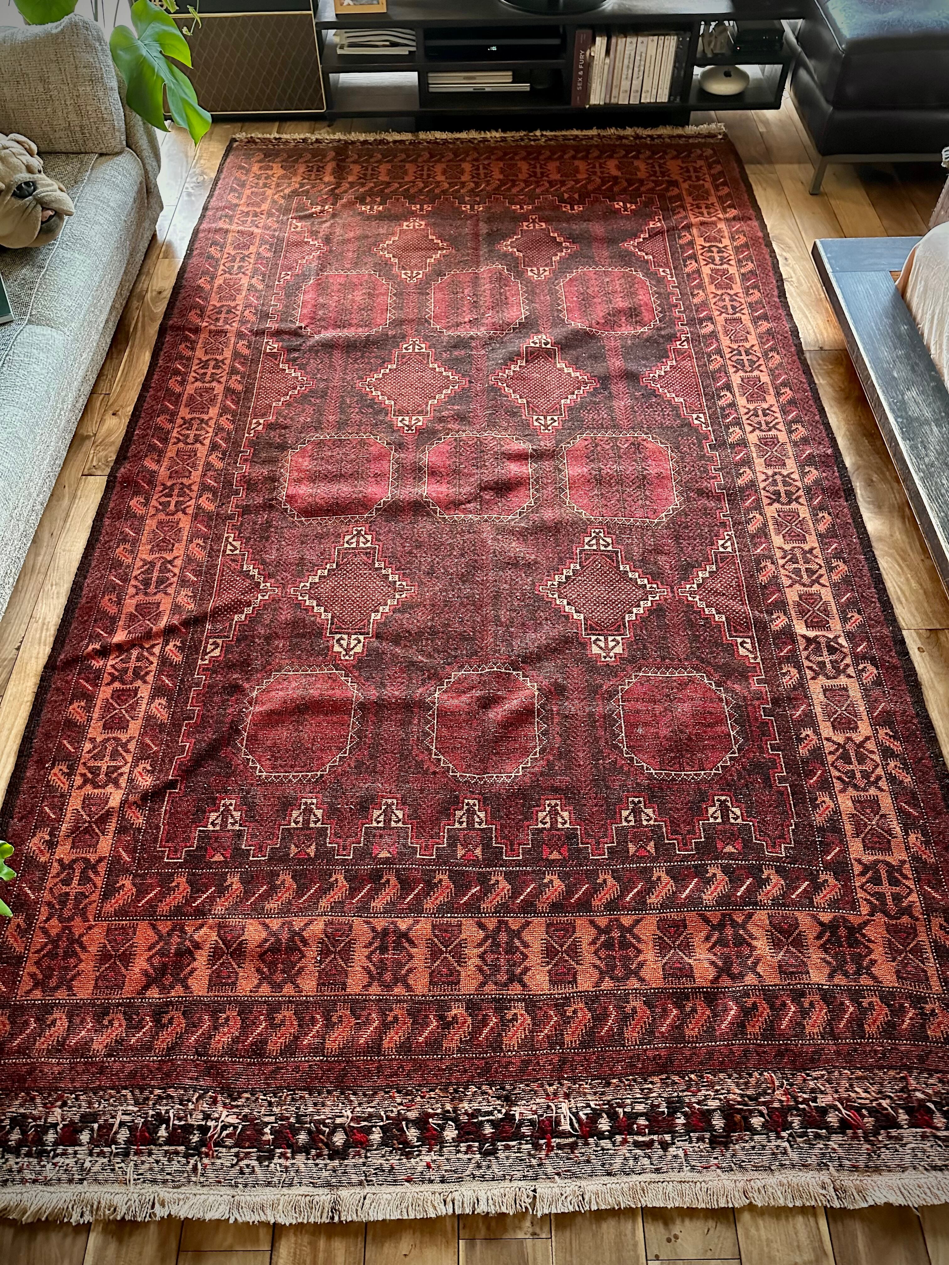 鈍く黒光りするブラックとバーガンディに、なんだかお洒落なカフェオレのボーダーが馴染むかっこいいこちらは、アフガニスタンはヘラート州に居住するバルーチ族のトライバルラグで、リビングを埋め尽くす3メーターを超えた特大サイズのメインラグになります。