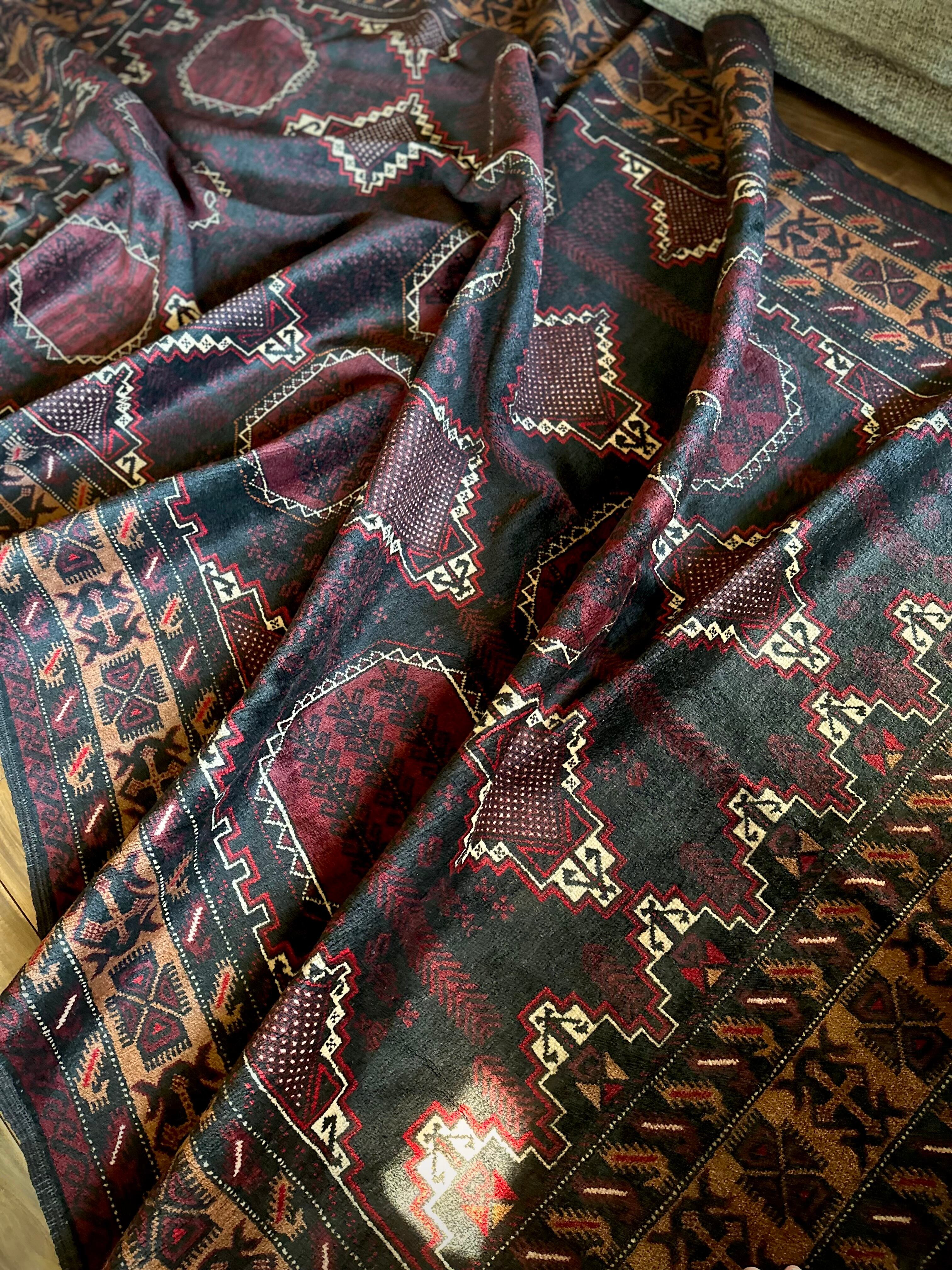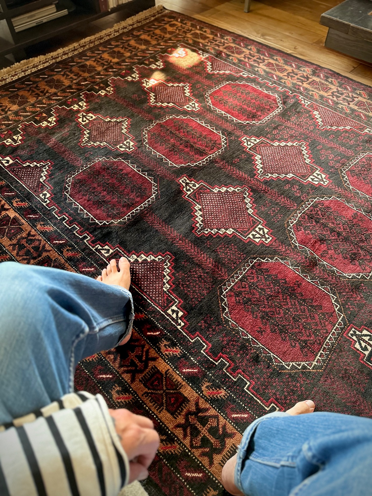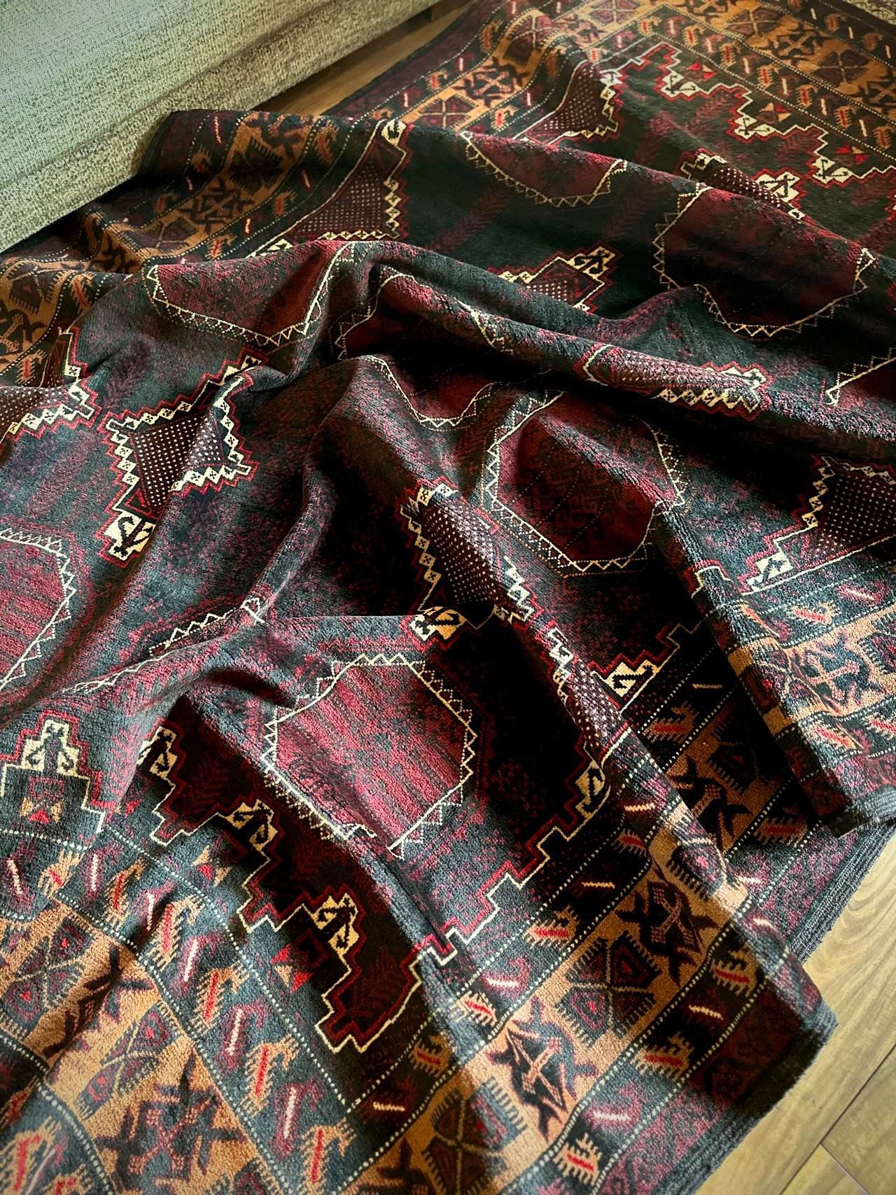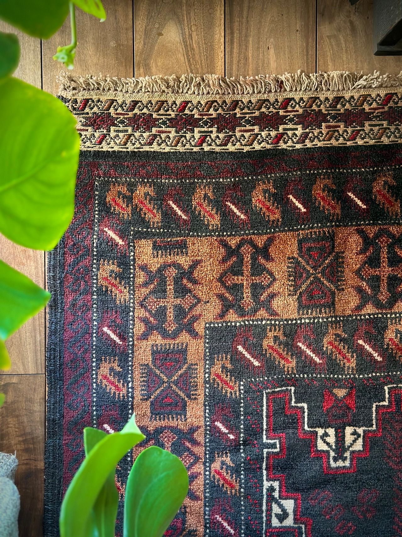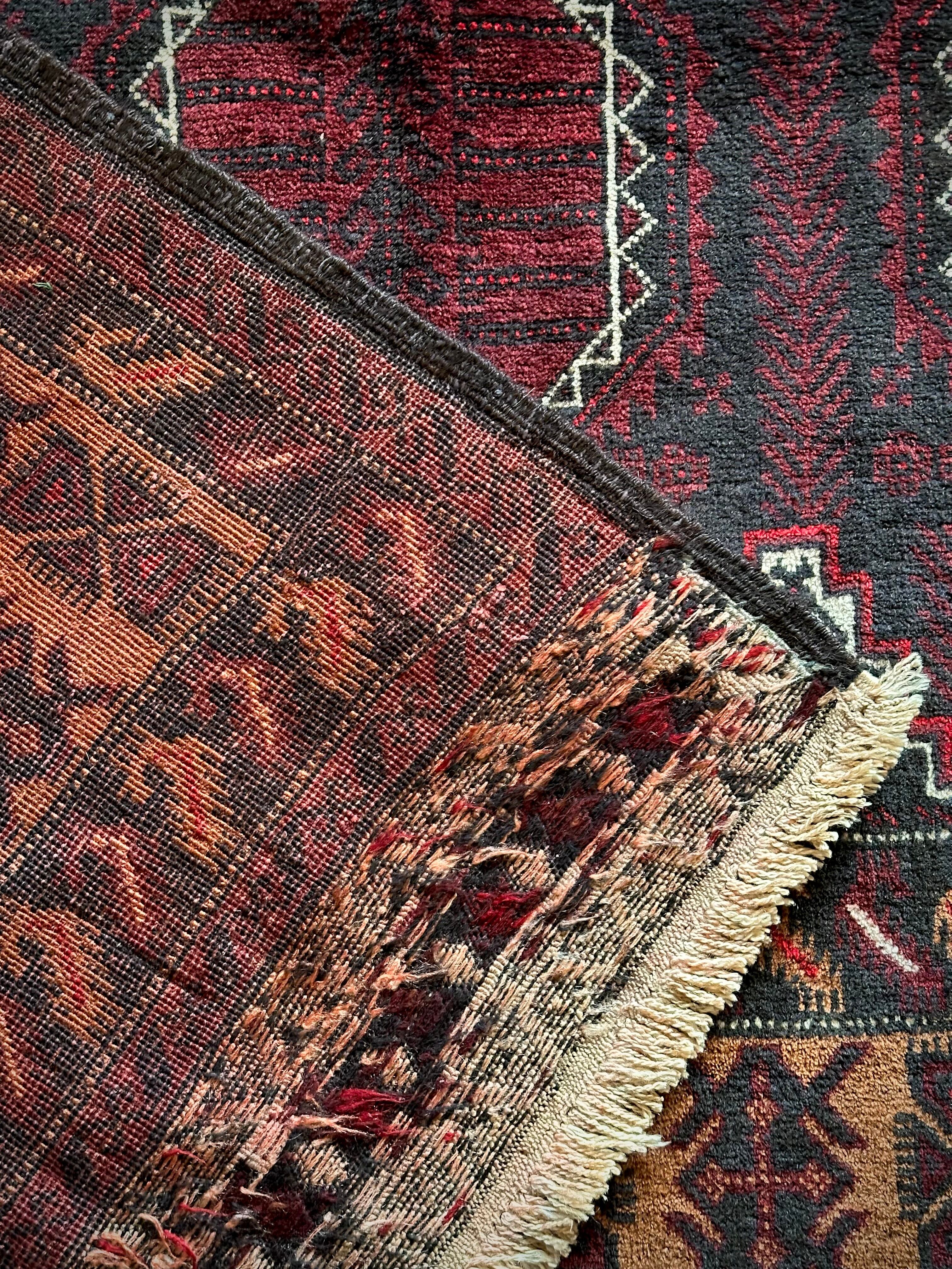 鈍く黒光りするブラックとバーガンディに、なんだかお洒落なカフェオレのボーダーが馴染むかっこいいこちらは、アフガニスタンはヘラート州に居住するバルーチ族のトライバルラグで、リビングを埋め尽くす3メーターを超えた特大サイズのメインラグになります。