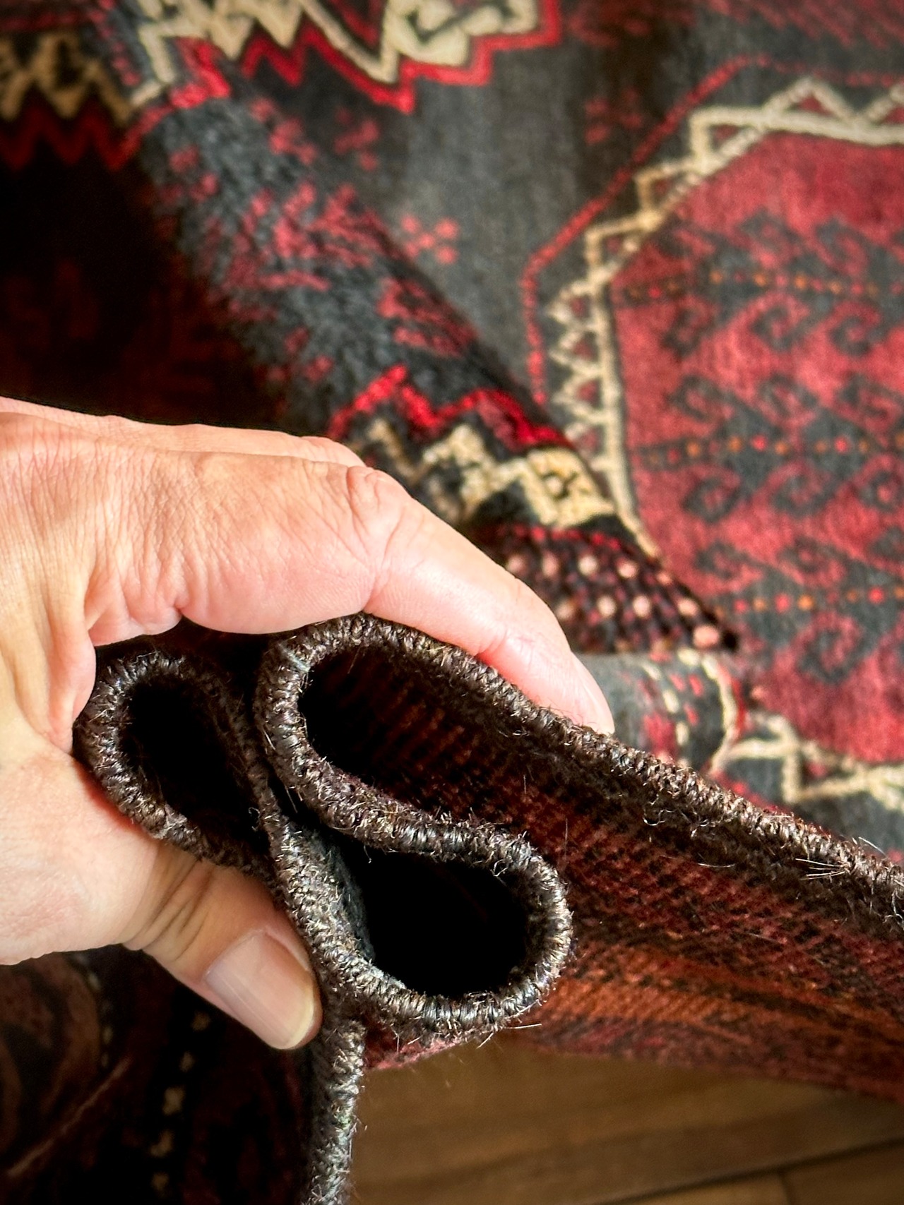 最後にラグそのものに関しては羊毛特有の匂いがあり、採寸は中央付近で計測していますが、手織りならではの歪みによる誤差や水洗いクリーニングによる縮み、また草木染めによる経年劣化の色ムラなどがありますが、それもまたヴィンテージラグの魅力かとご理解ください。