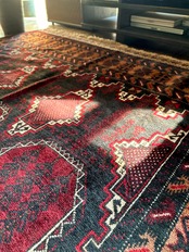 ザボール産のバルーチにも似た渋みのある配色で、ヘラート産としてはここまでの大きなサイズは珍しいでしょうか。バルーチらしい暗闇の中に浮かび上がるホワイトラインで描かれたサロールギュルに、両サイドの見事なキリムエンドが素晴らしく、ずらっと並んだ八芒星が幸運をもたらしてくれそうですね。