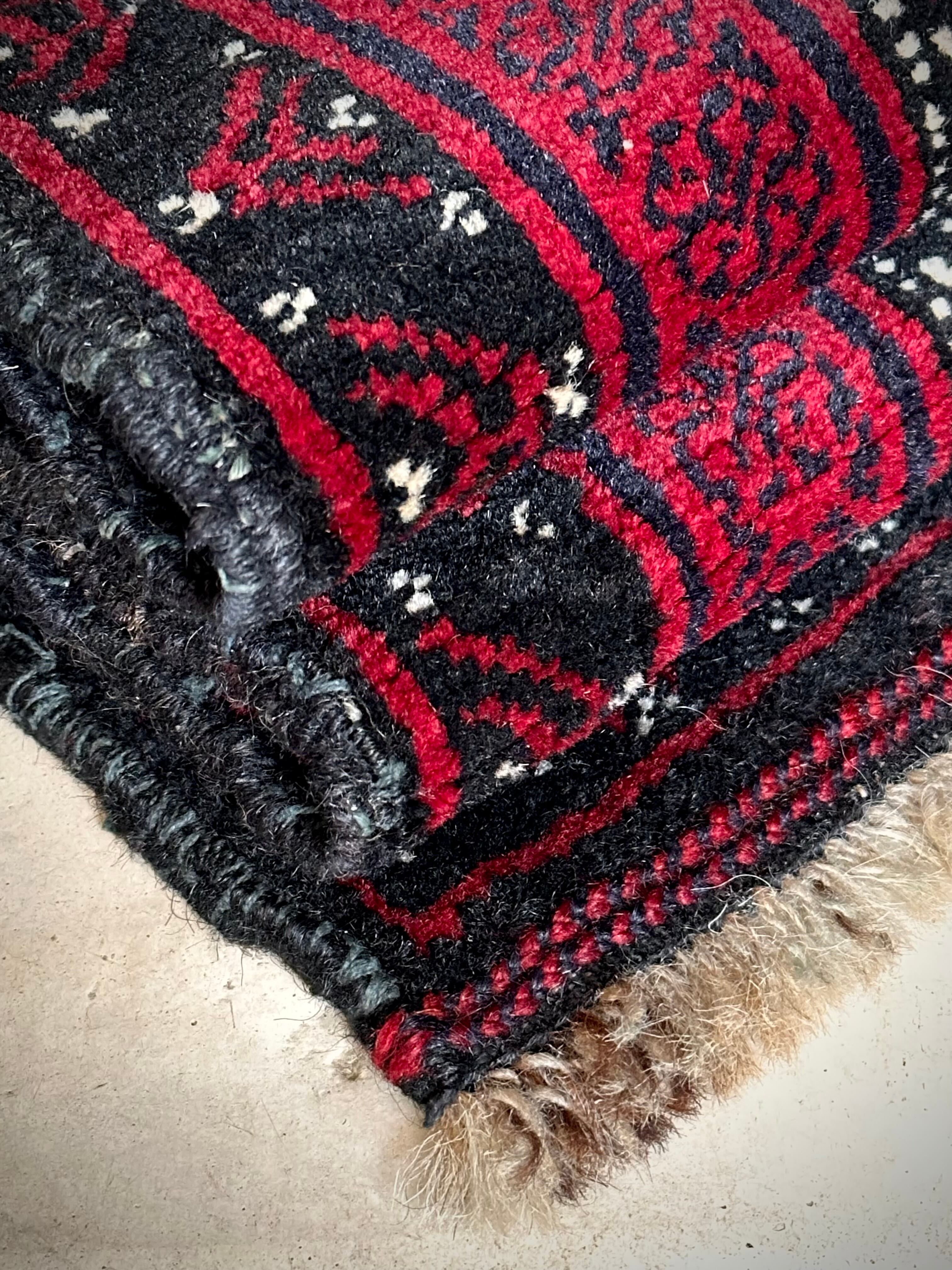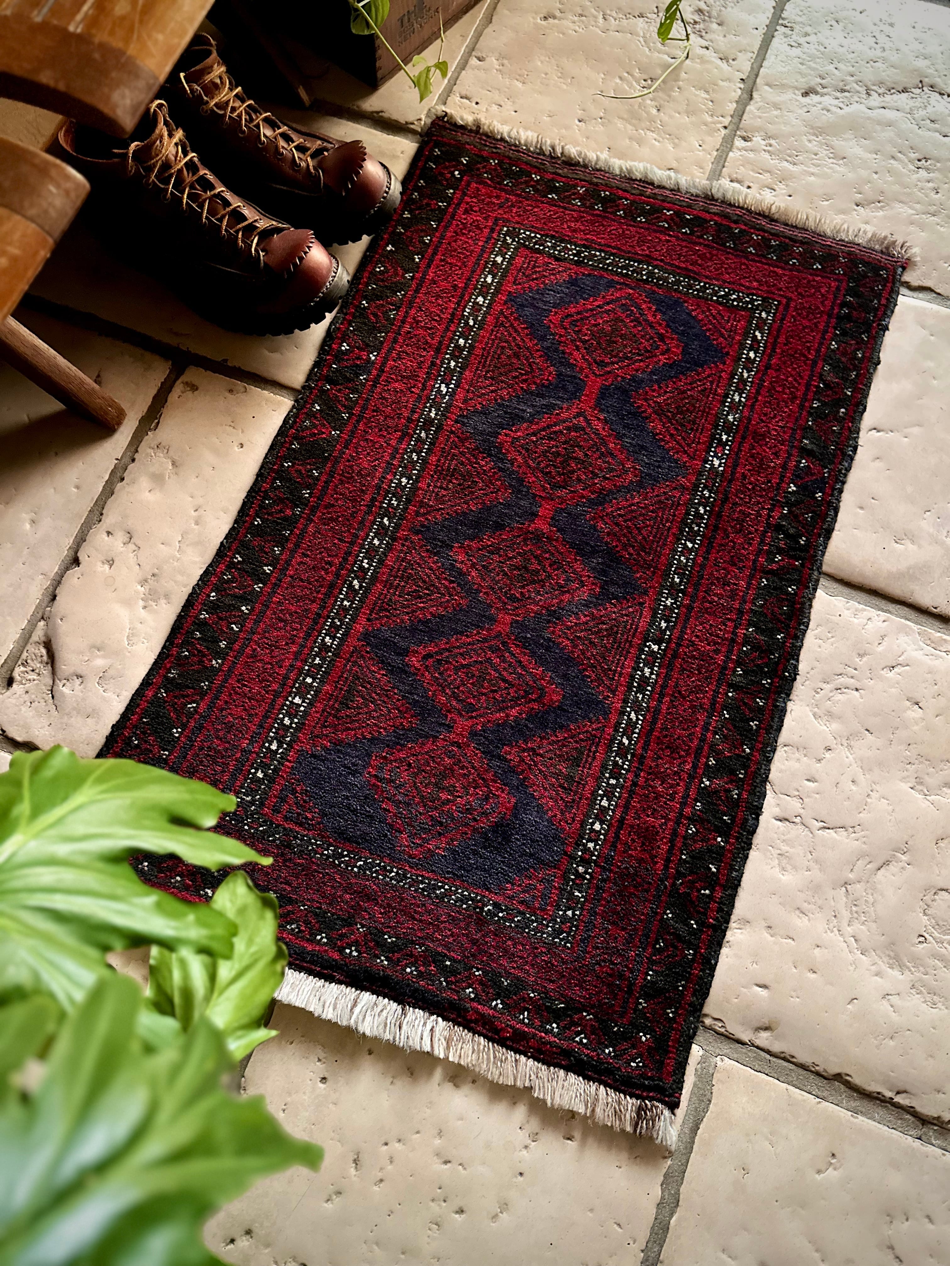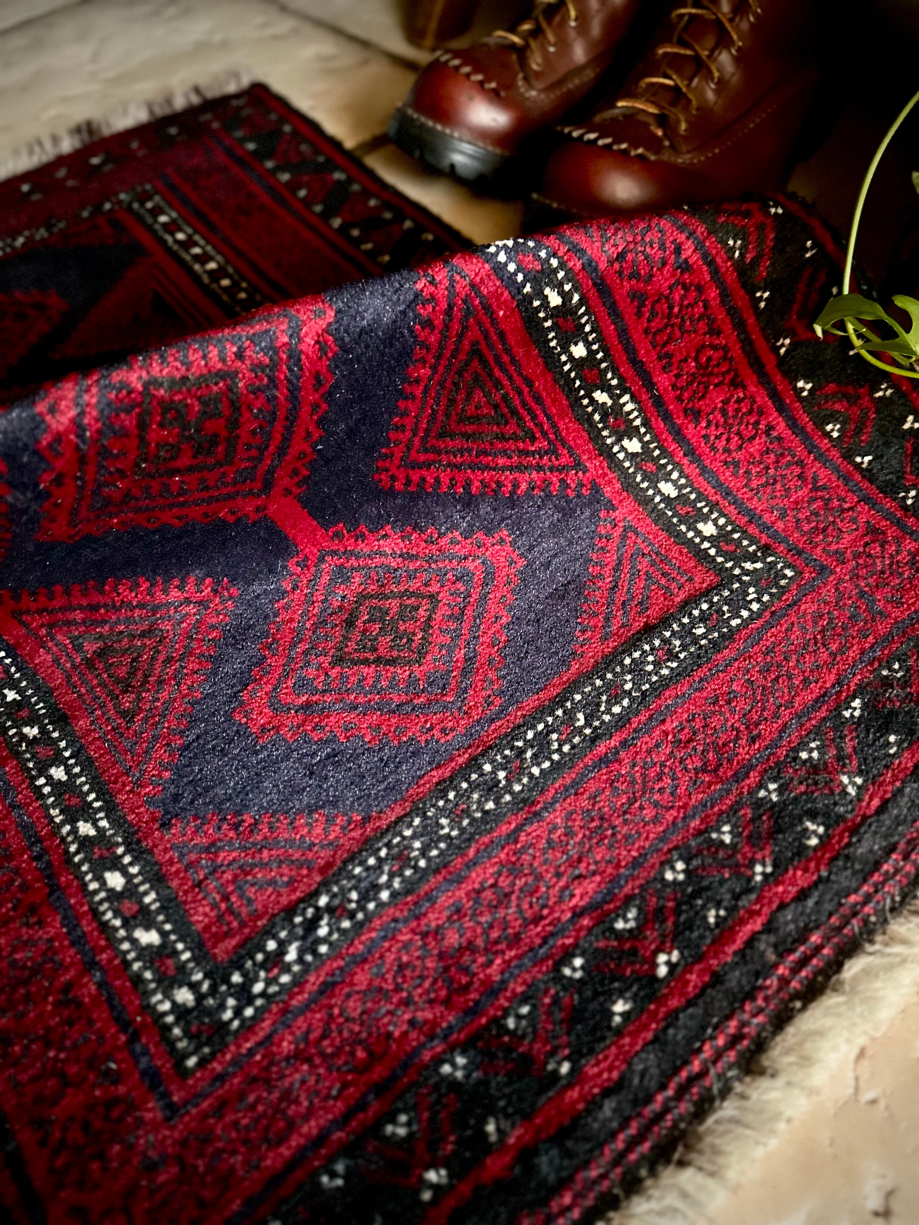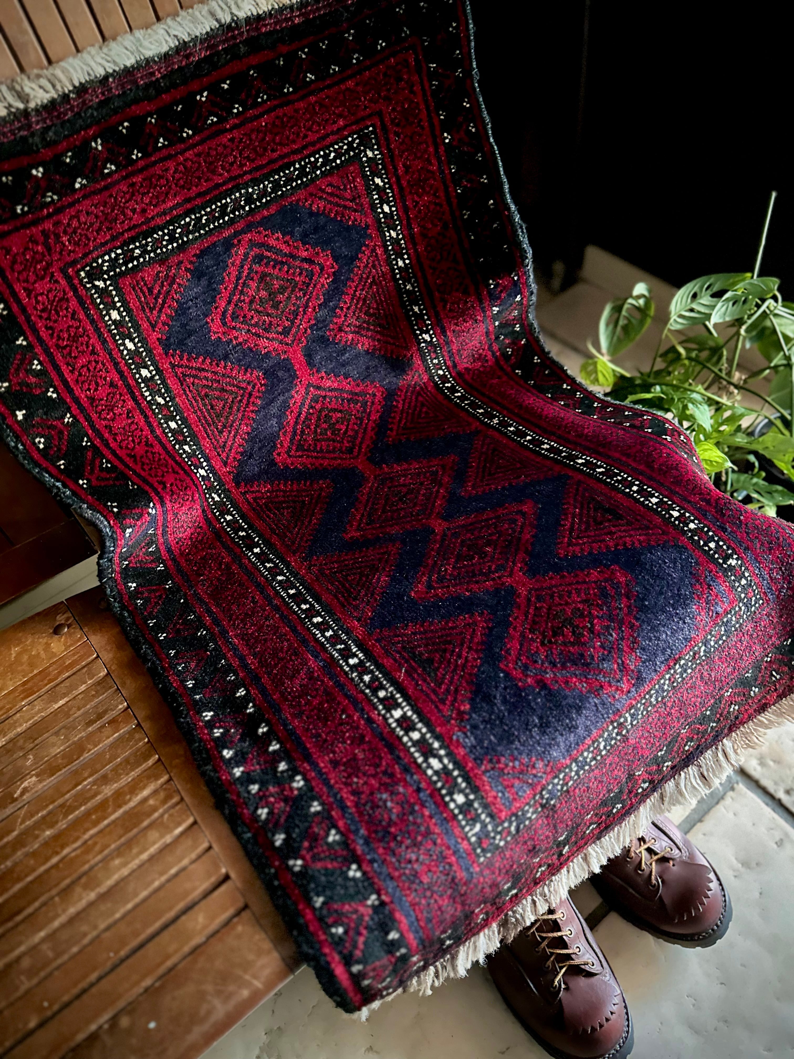 見た目にも渋いブラック&レッドのカラーリングで、光に反射する中央のネイビーが鈍く輝くこちらは、アフガニスタンはヘラート州に居住するバルーチ族のトライバルラグで、元は家財道具などを収納するバーリシトと呼ばれる袋状の表皮のみをラグに仕立て直したモノになります。