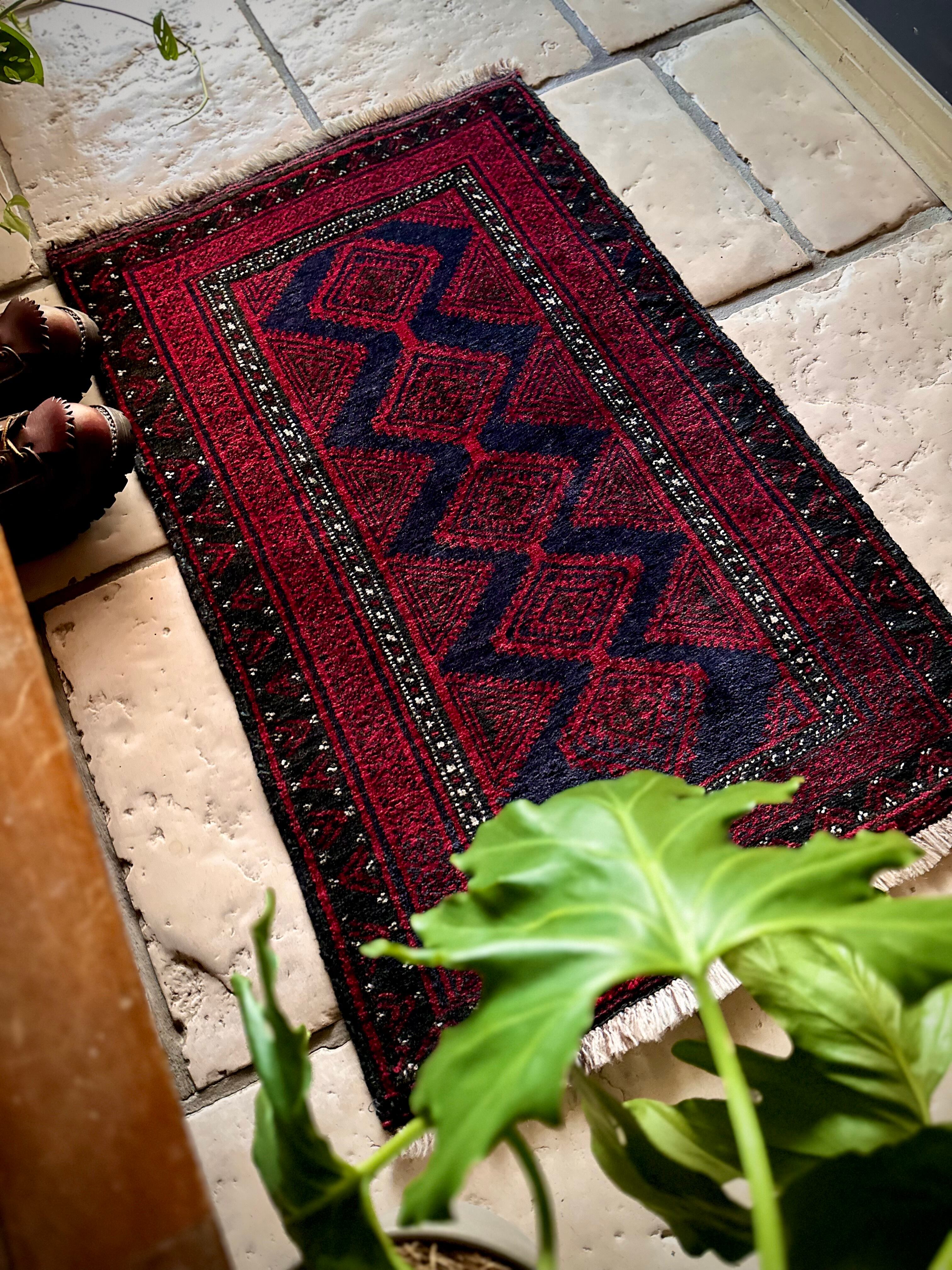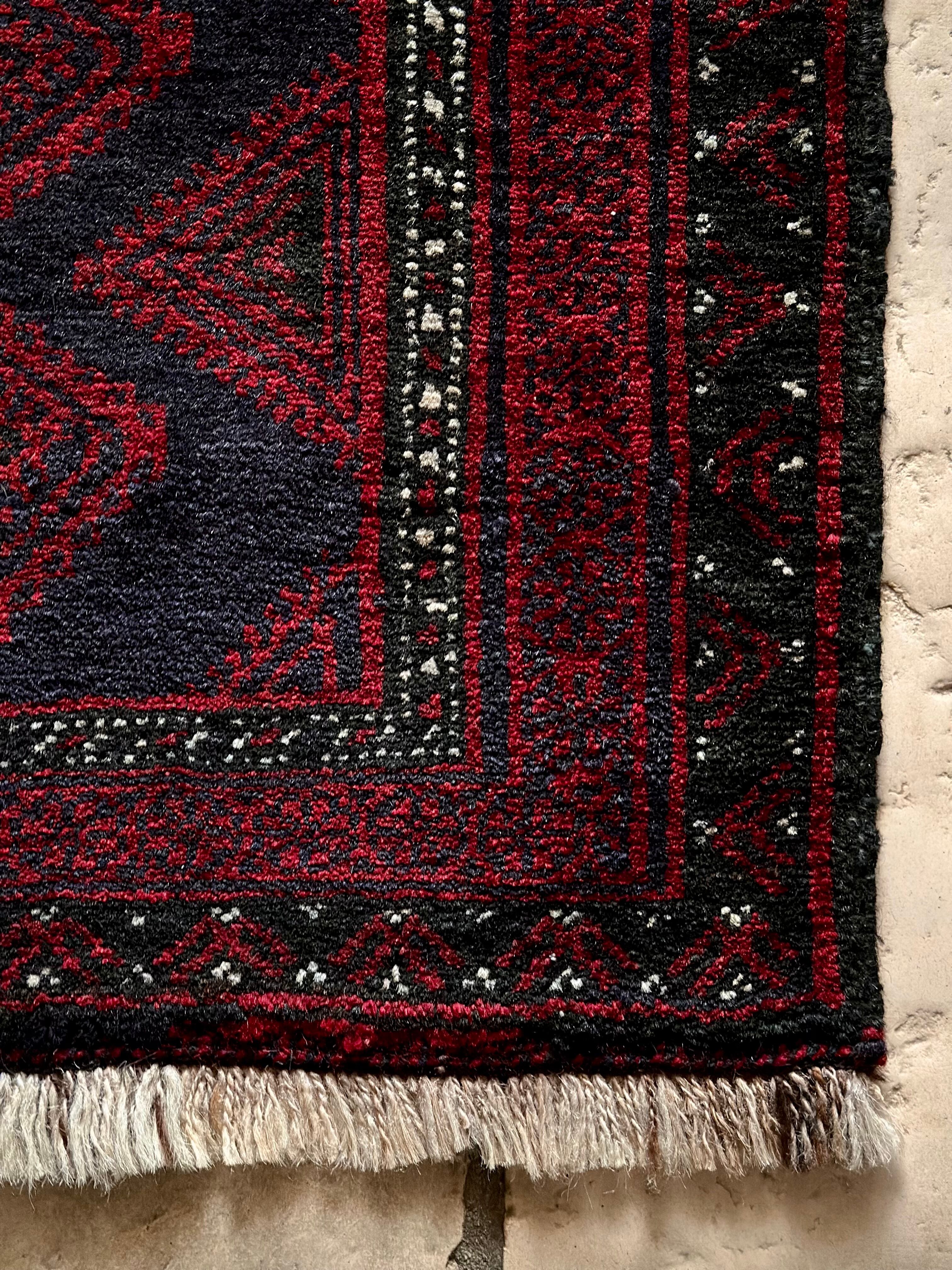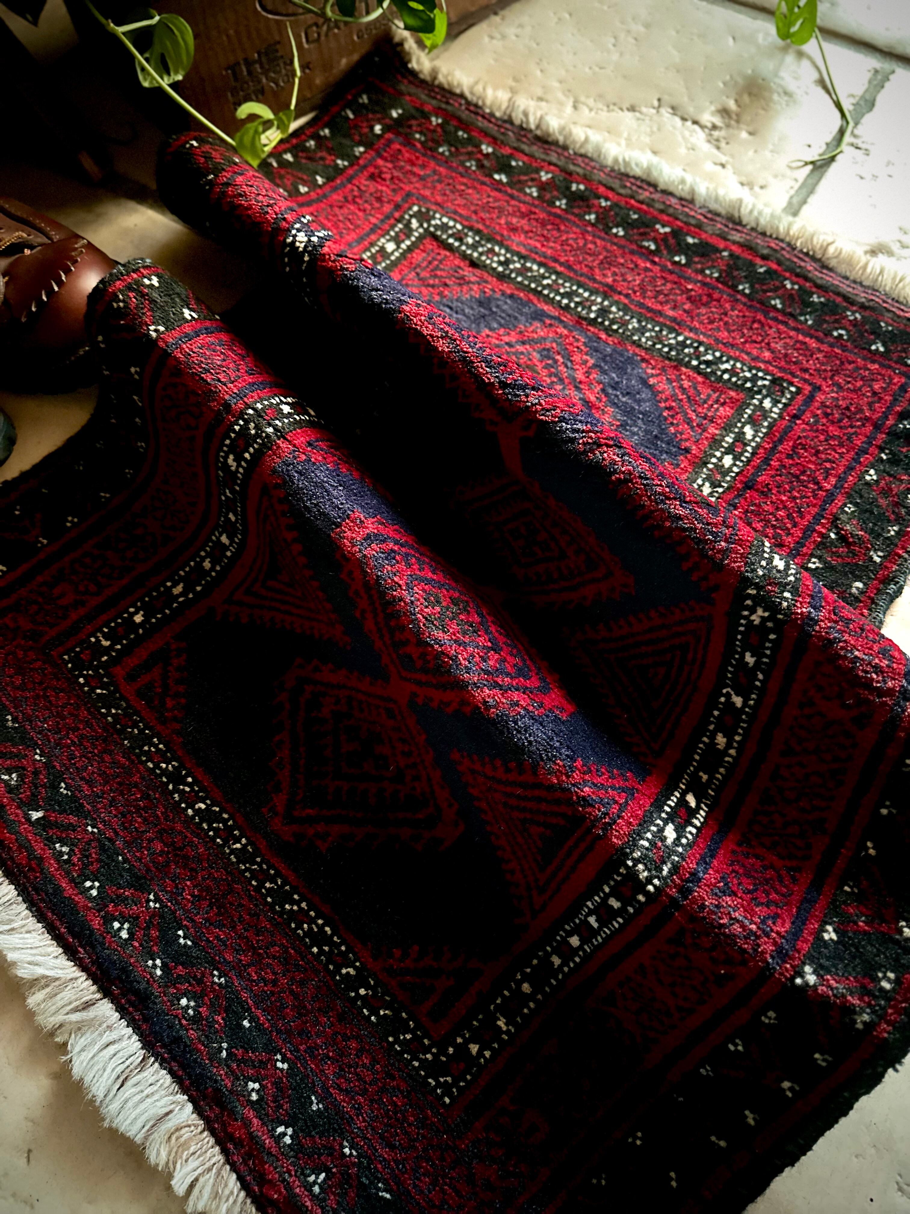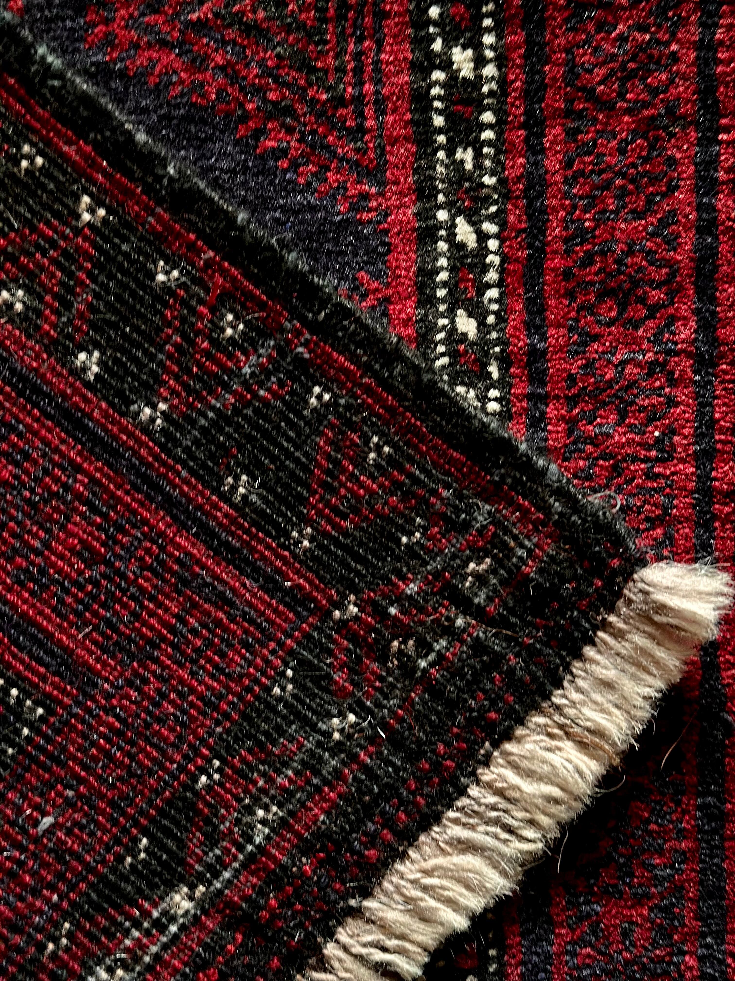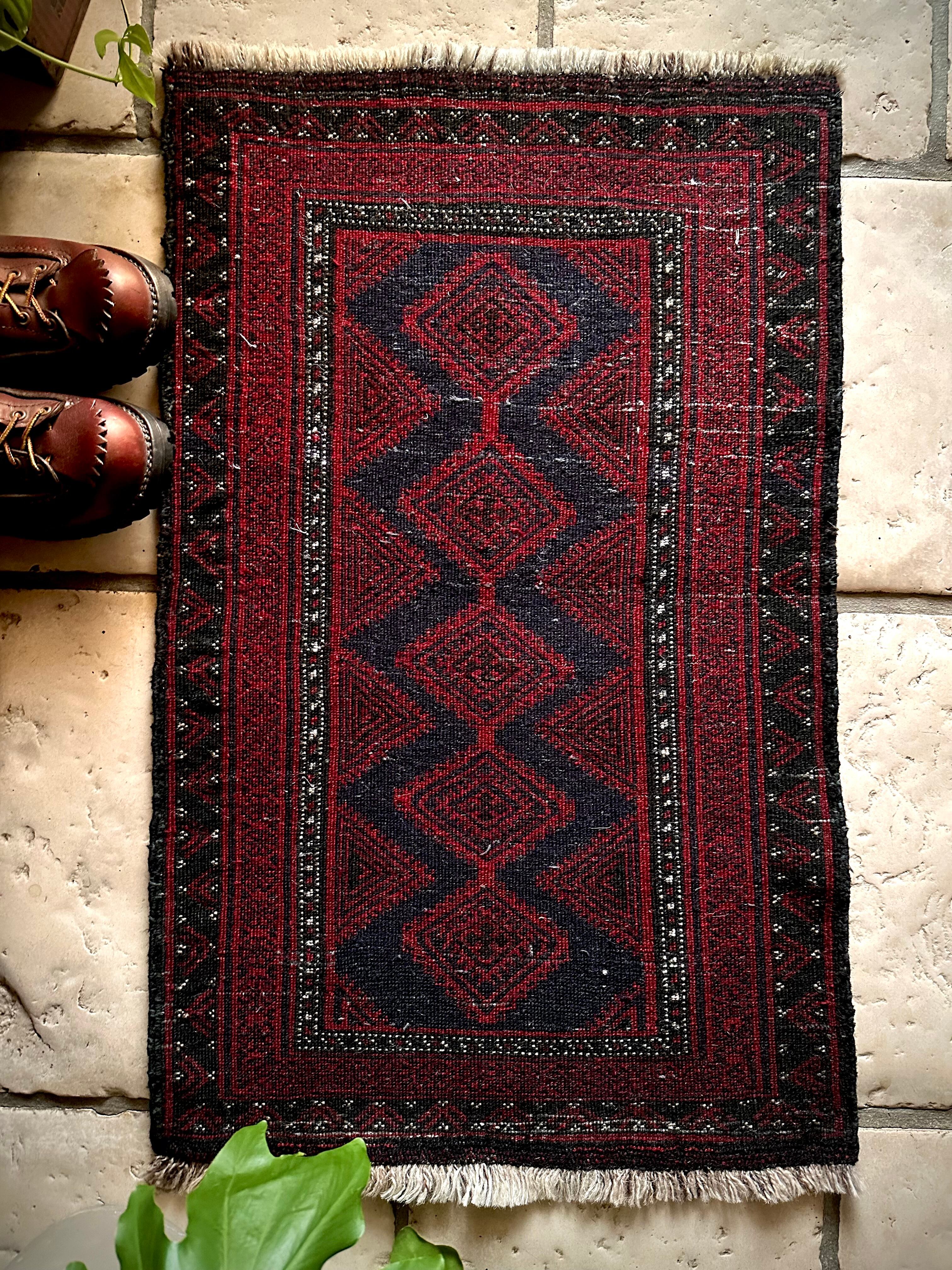 見た目にも渋いブラック&レッドのカラーリングで、光に反射する中央のネイビーが鈍く輝くこちらは、アフガニスタンはヘラート州に居住するバルーチ族のトライバルラグで、元は家財道具などを収納するバーリシトと呼ばれる袋状の表皮のみをラグに仕立て直したモノになります。