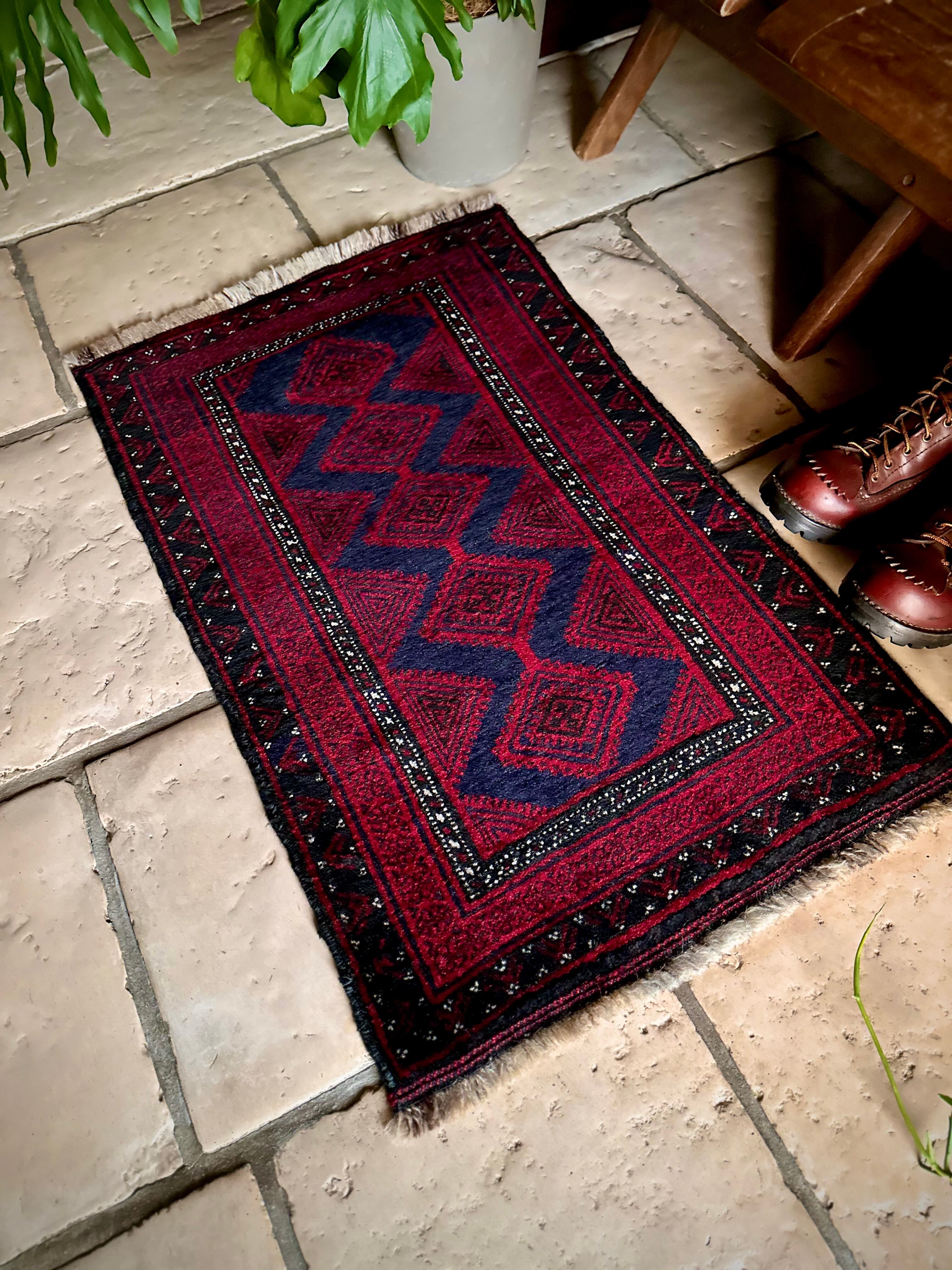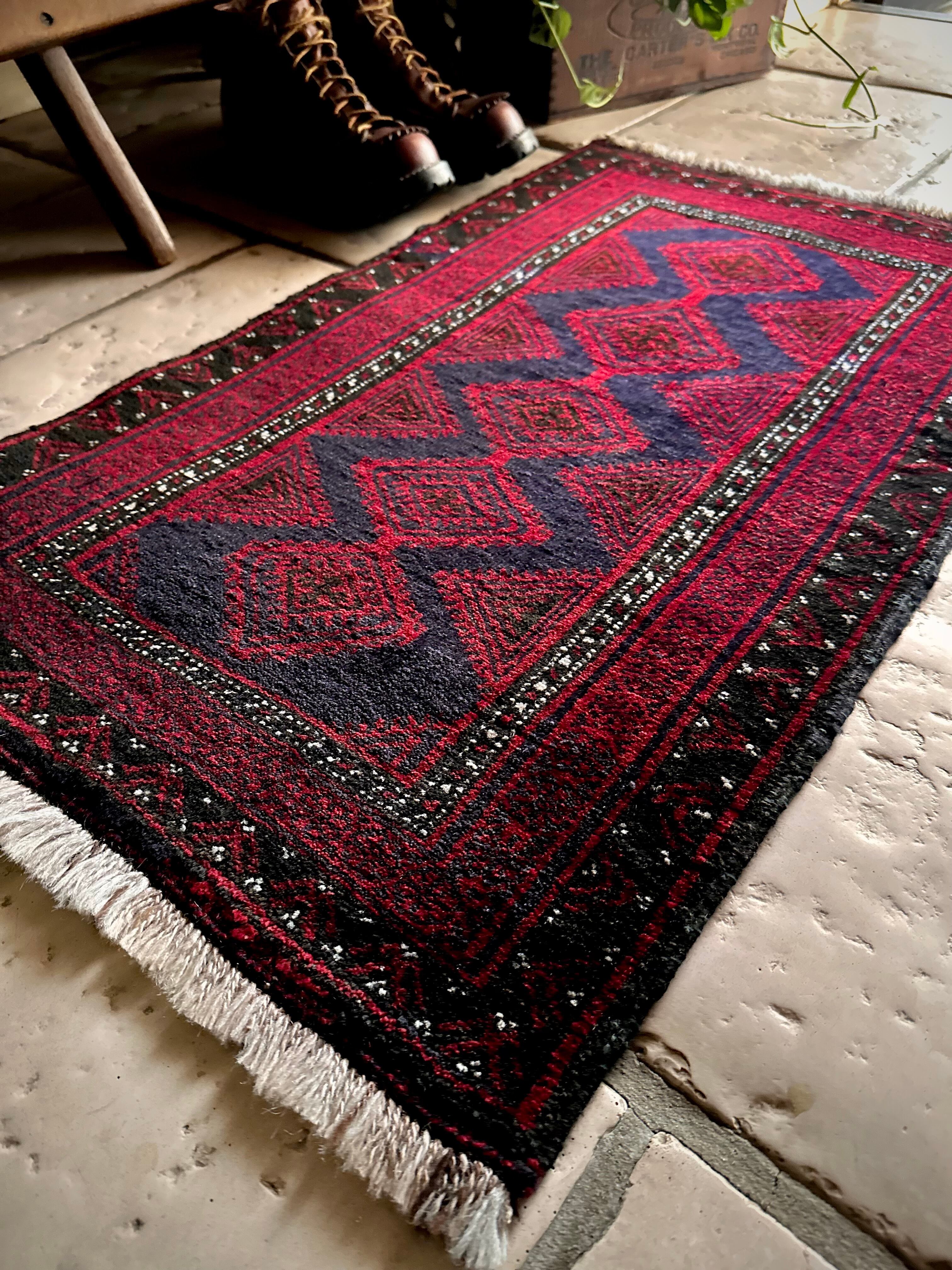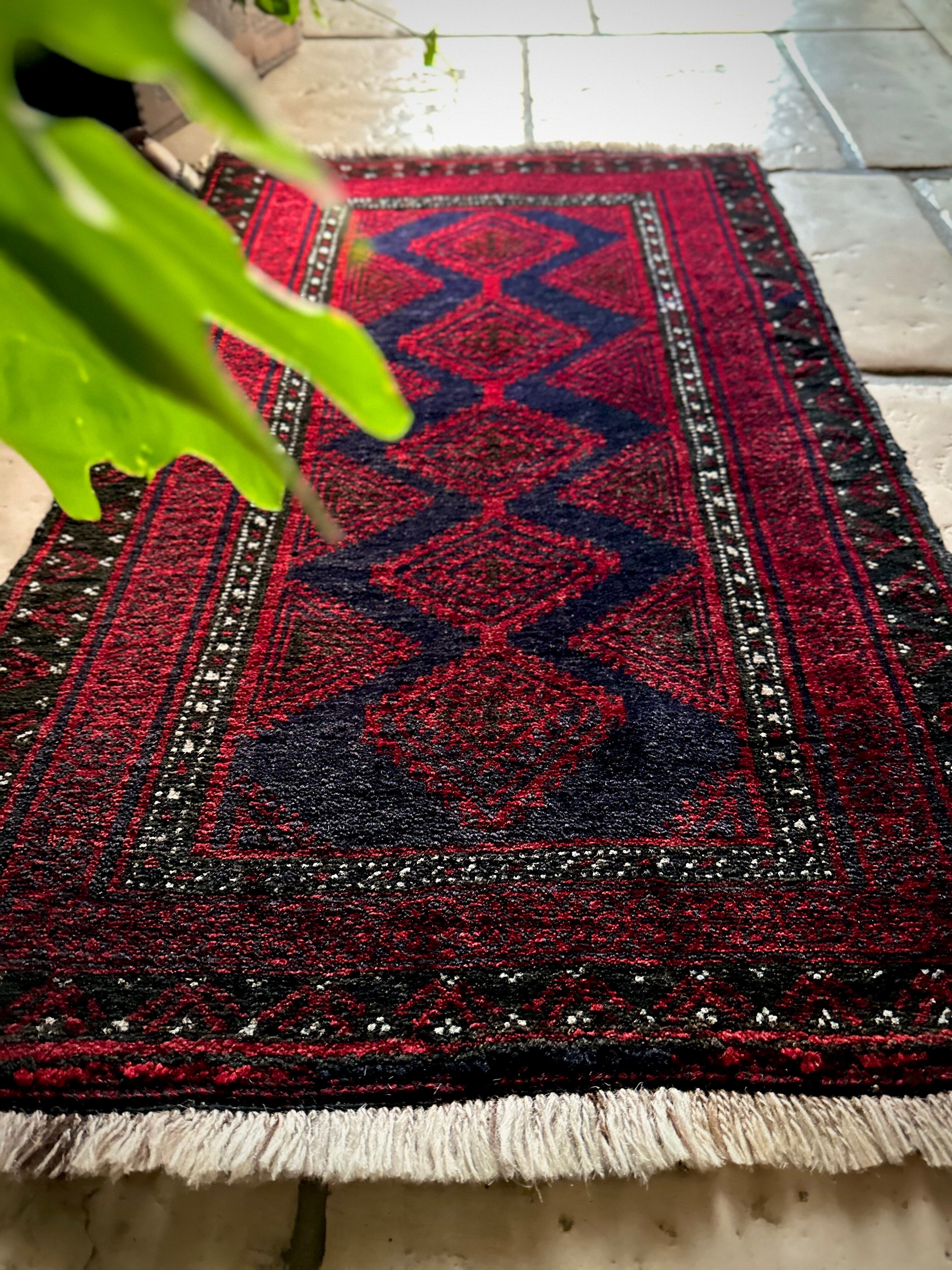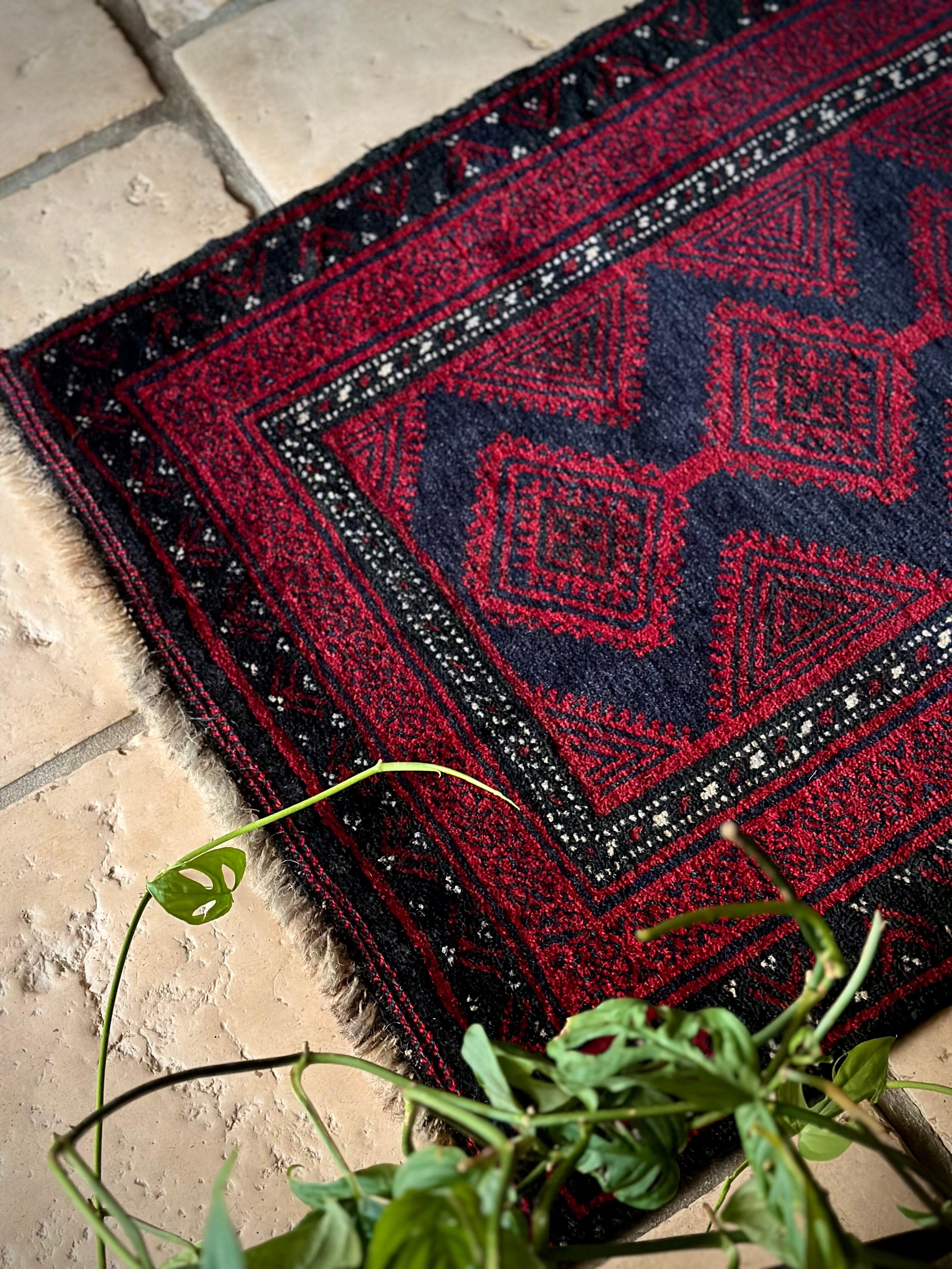 見た目にも渋いブラック&レッドのカラーリングで、光に反射する中央のネイビーが鈍く輝くこちらは、アフガニスタンはヘラート州に居住するバルーチ族のトライバルラグで、元は家財道具などを収納するバーリシトと呼ばれる袋状の表皮のみをラグに仕立て直したモノになります。