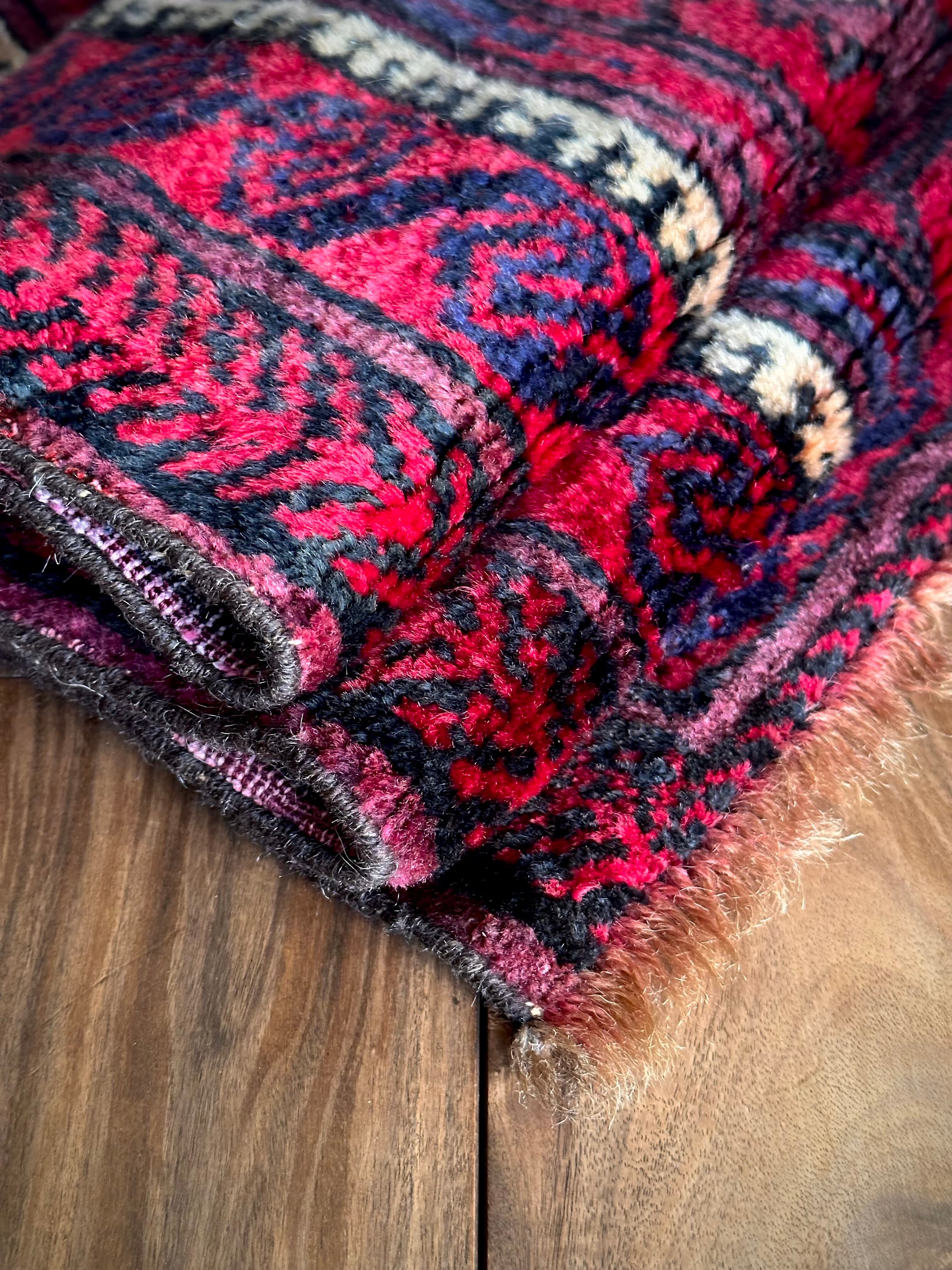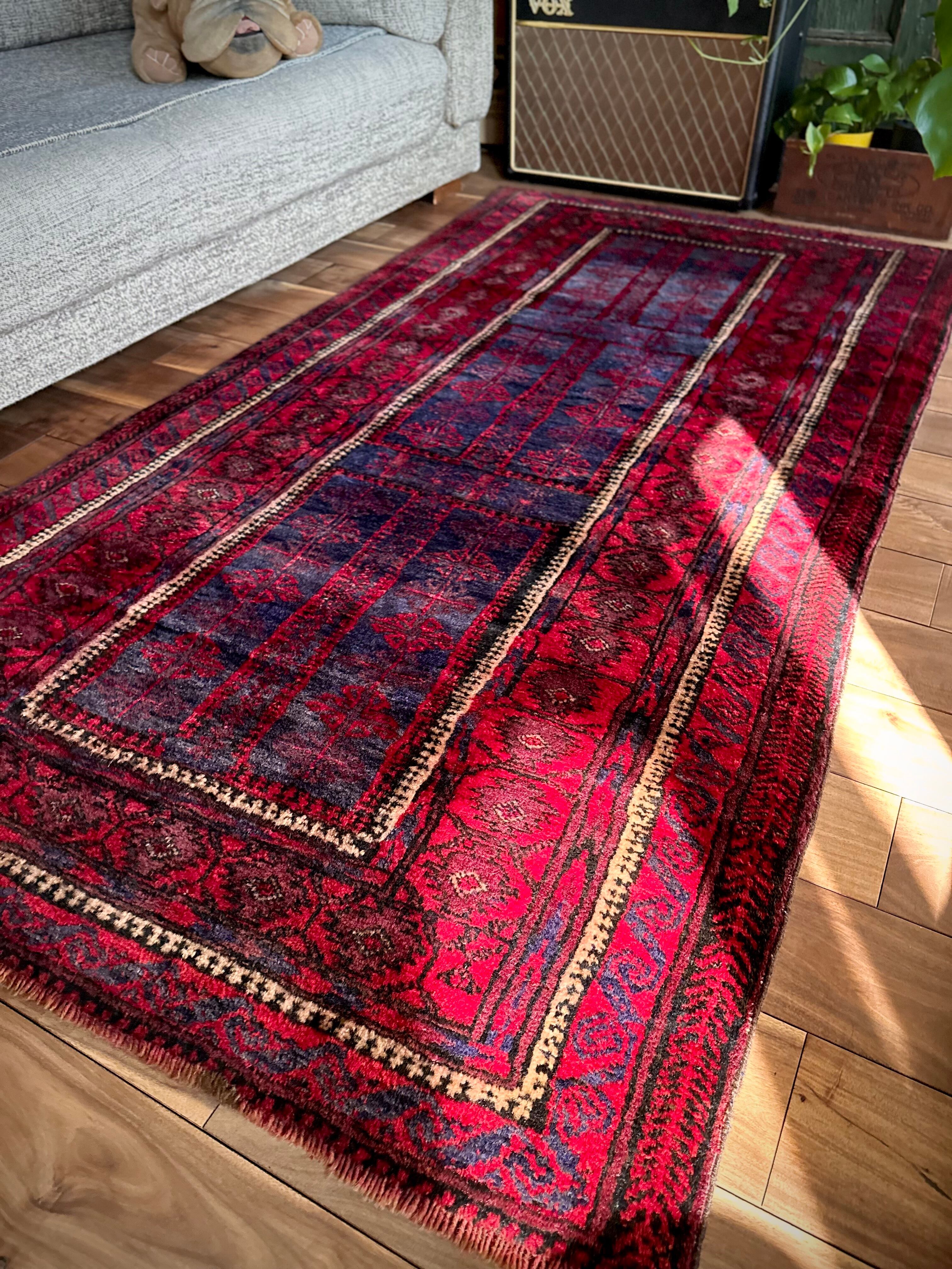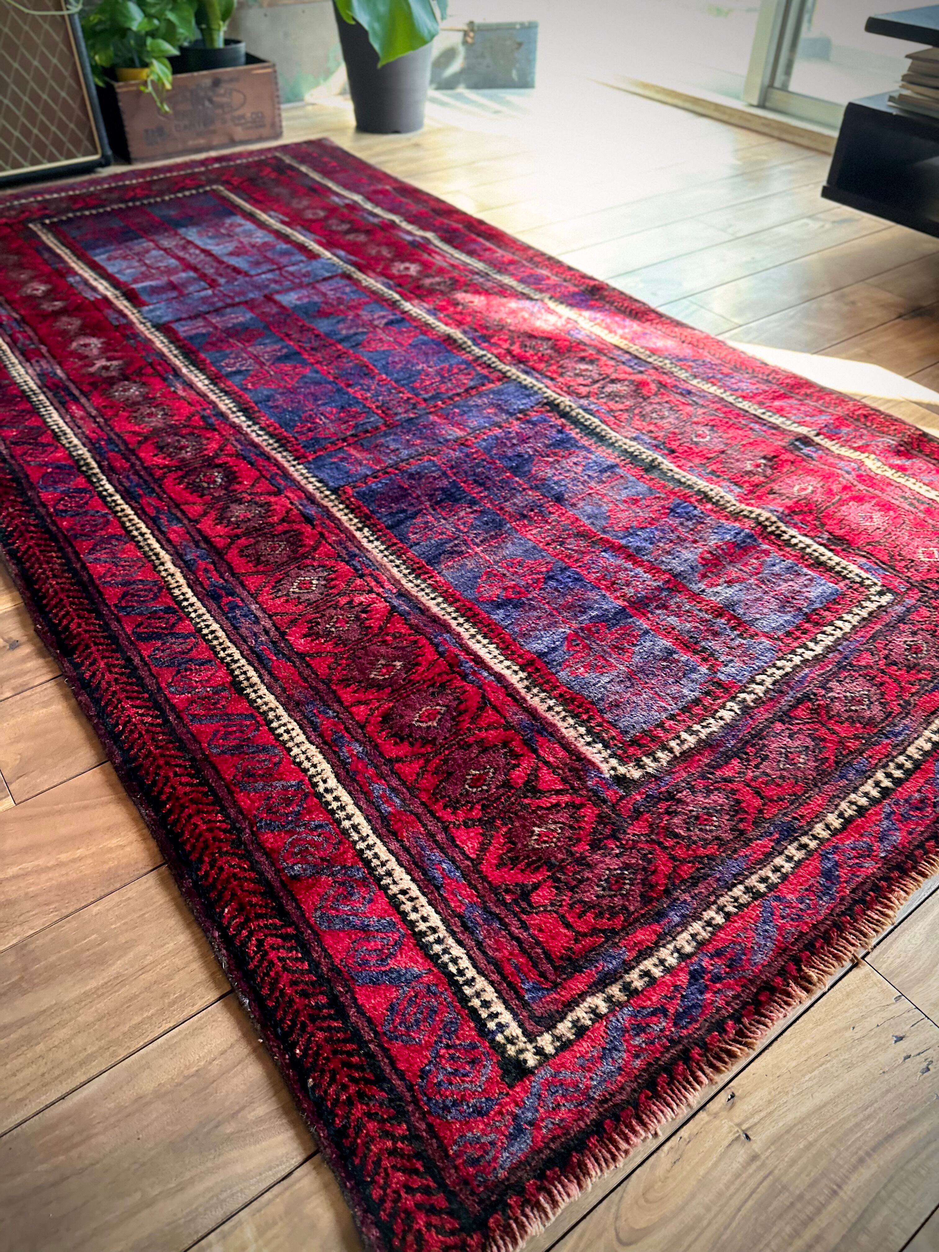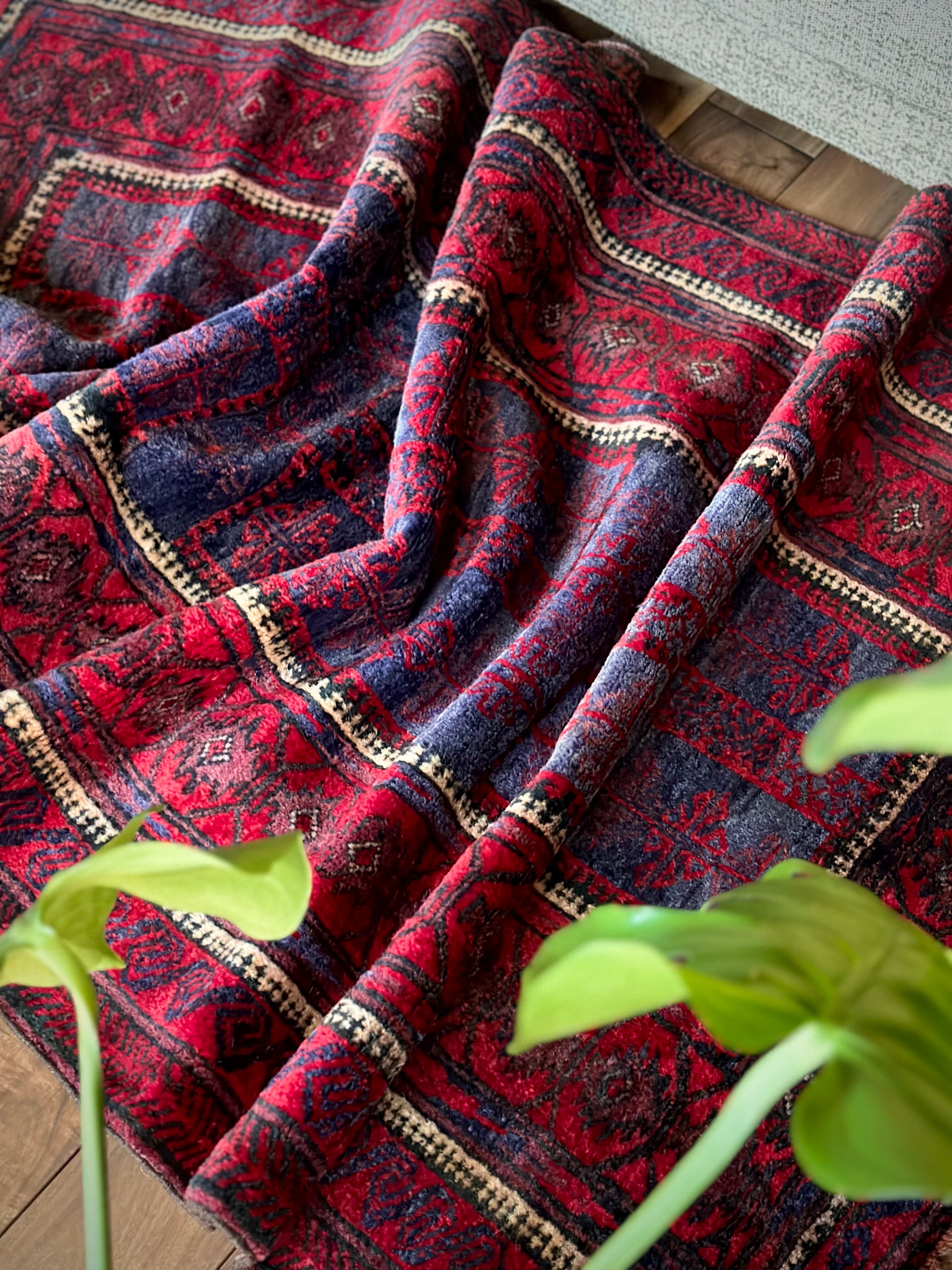 眩しいばかりの発色のいいレッドカラーにインディゴブルーのネイビーが艶やかに光り輝くこちらは、アフガニスタンはヘラート州に居住するバルーチ族のなかでも、デザイン性に優れたヤコブ・カーニー支族からのトライバルラグになります。