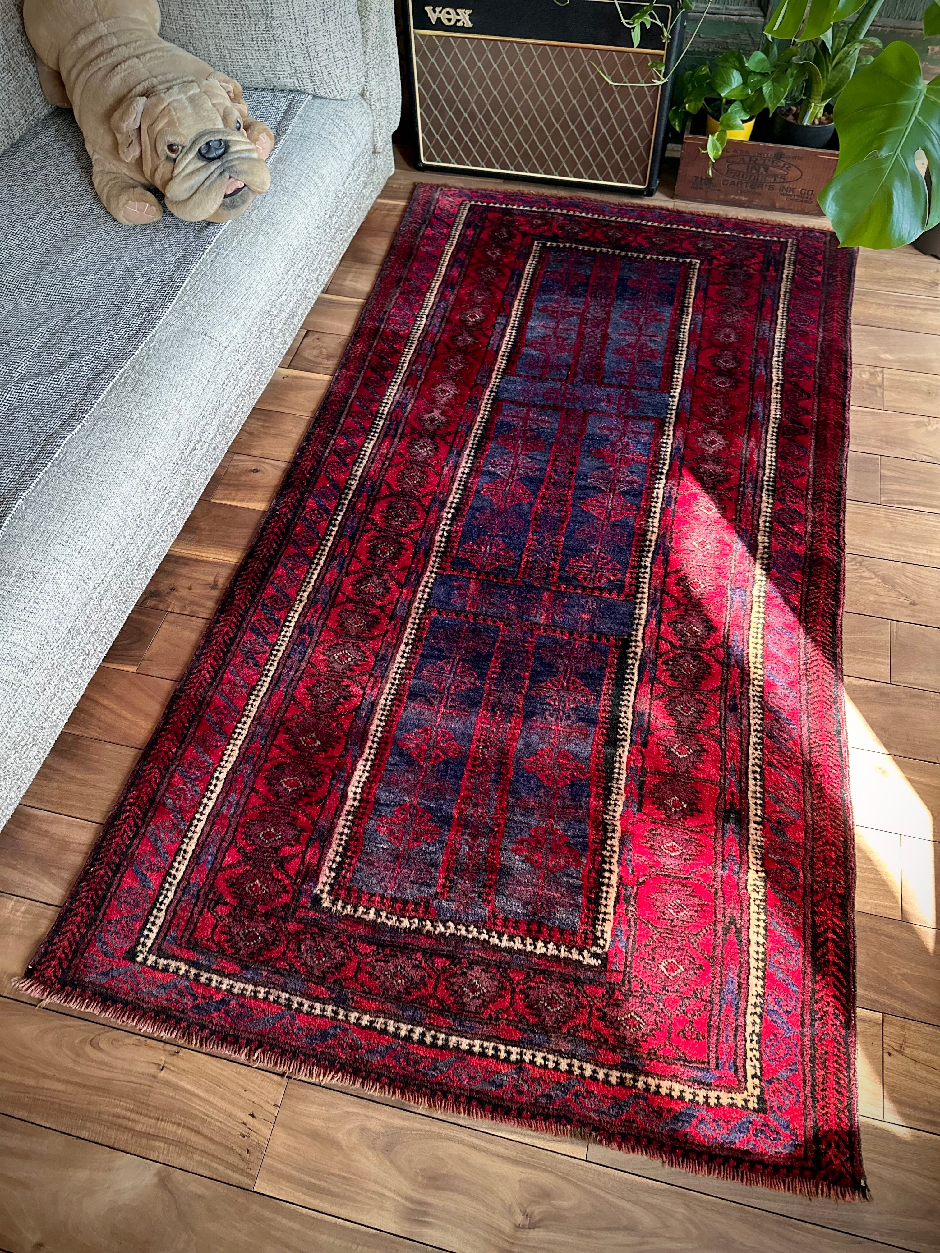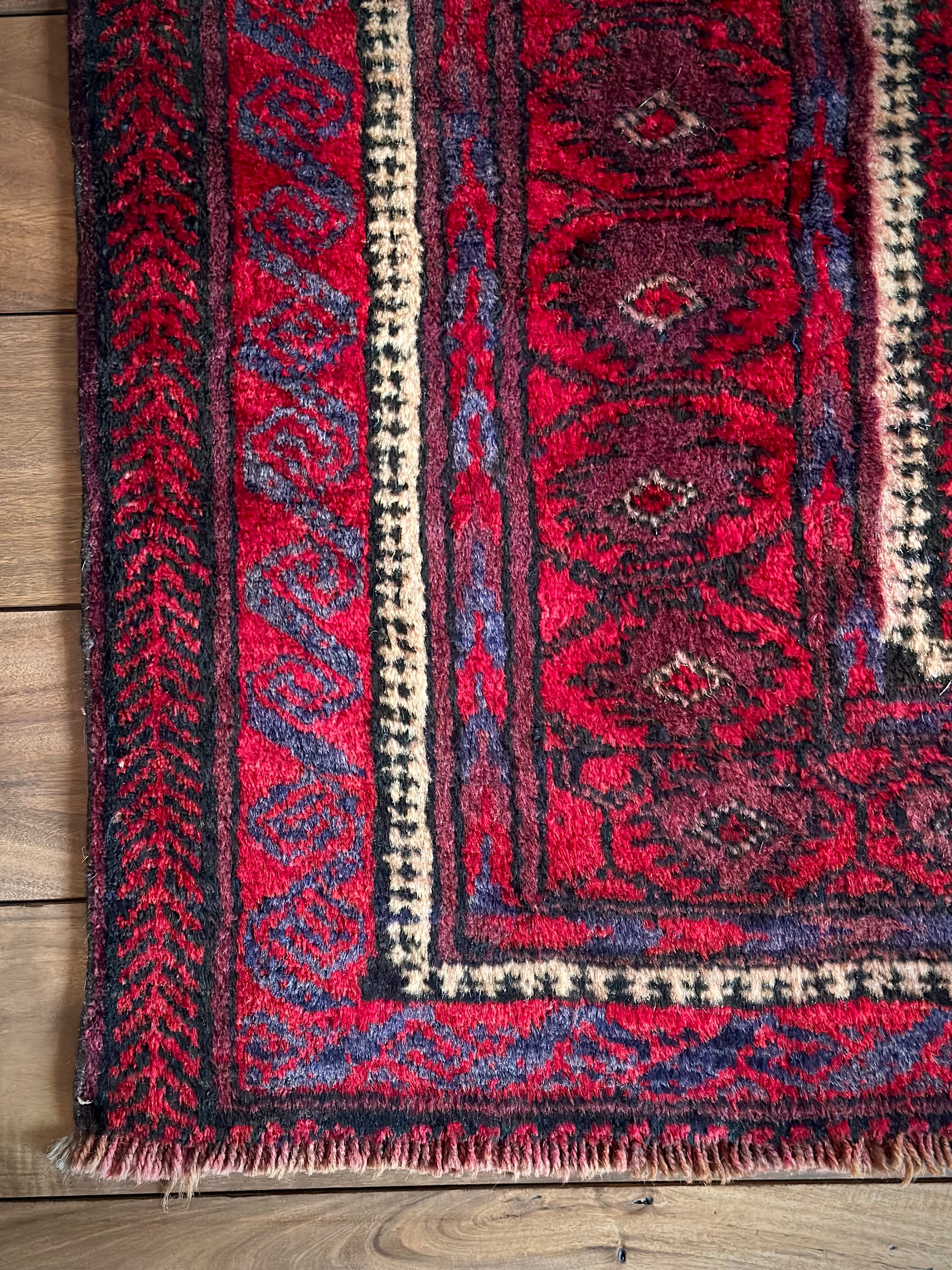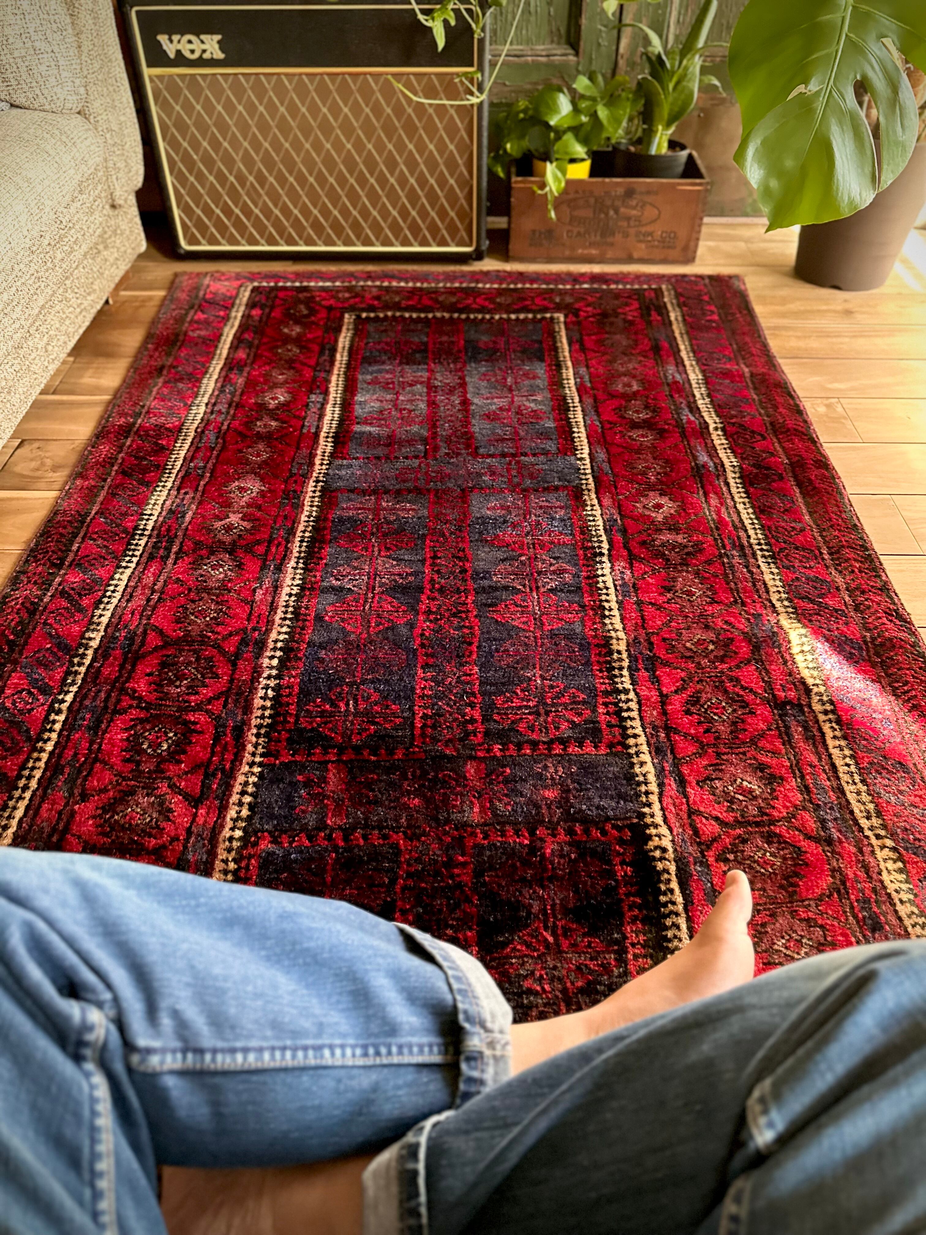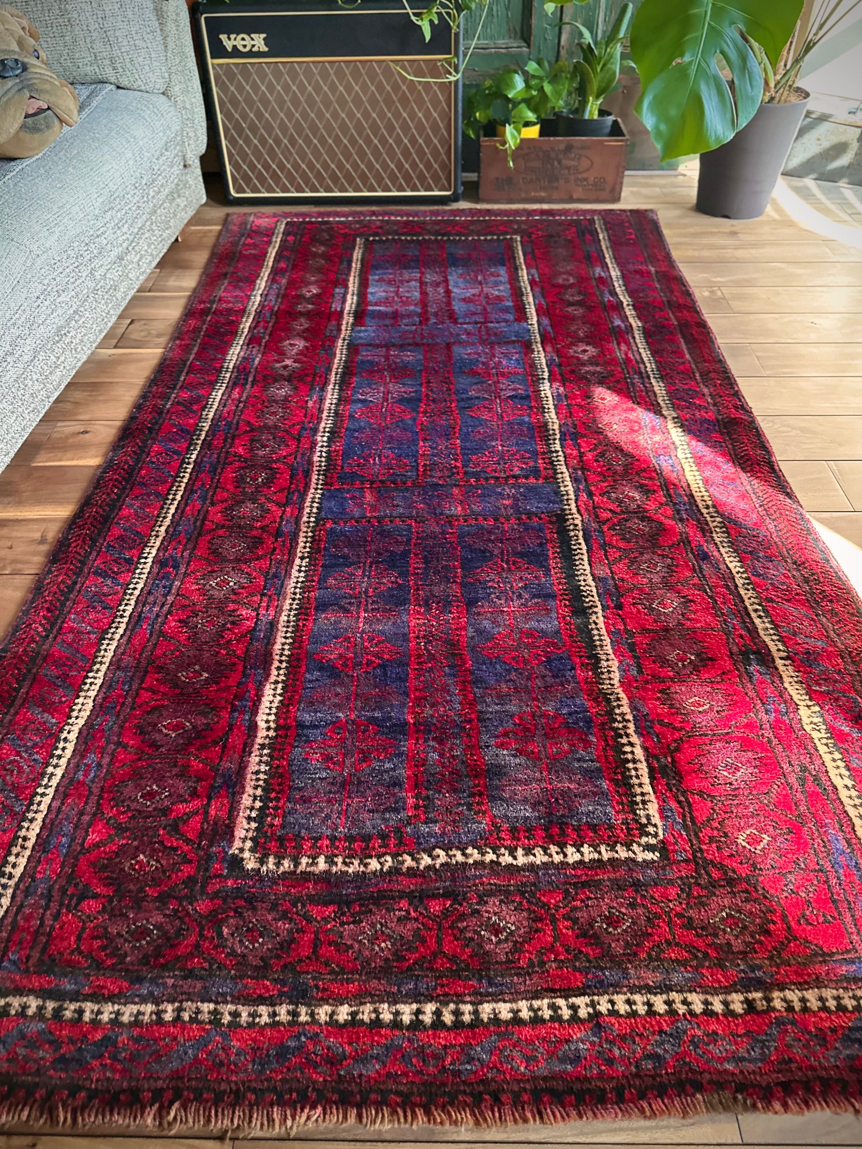 眩しいばかりの発色のいいレッドカラーにインディゴブルーのネイビーが艶やかに光り輝くこちらは、アフガニスタンはヘラート州に居住するバルーチ族のなかでも、デザイン性に優れたヤコブ・カーニー支族からのトライバルラグになります。