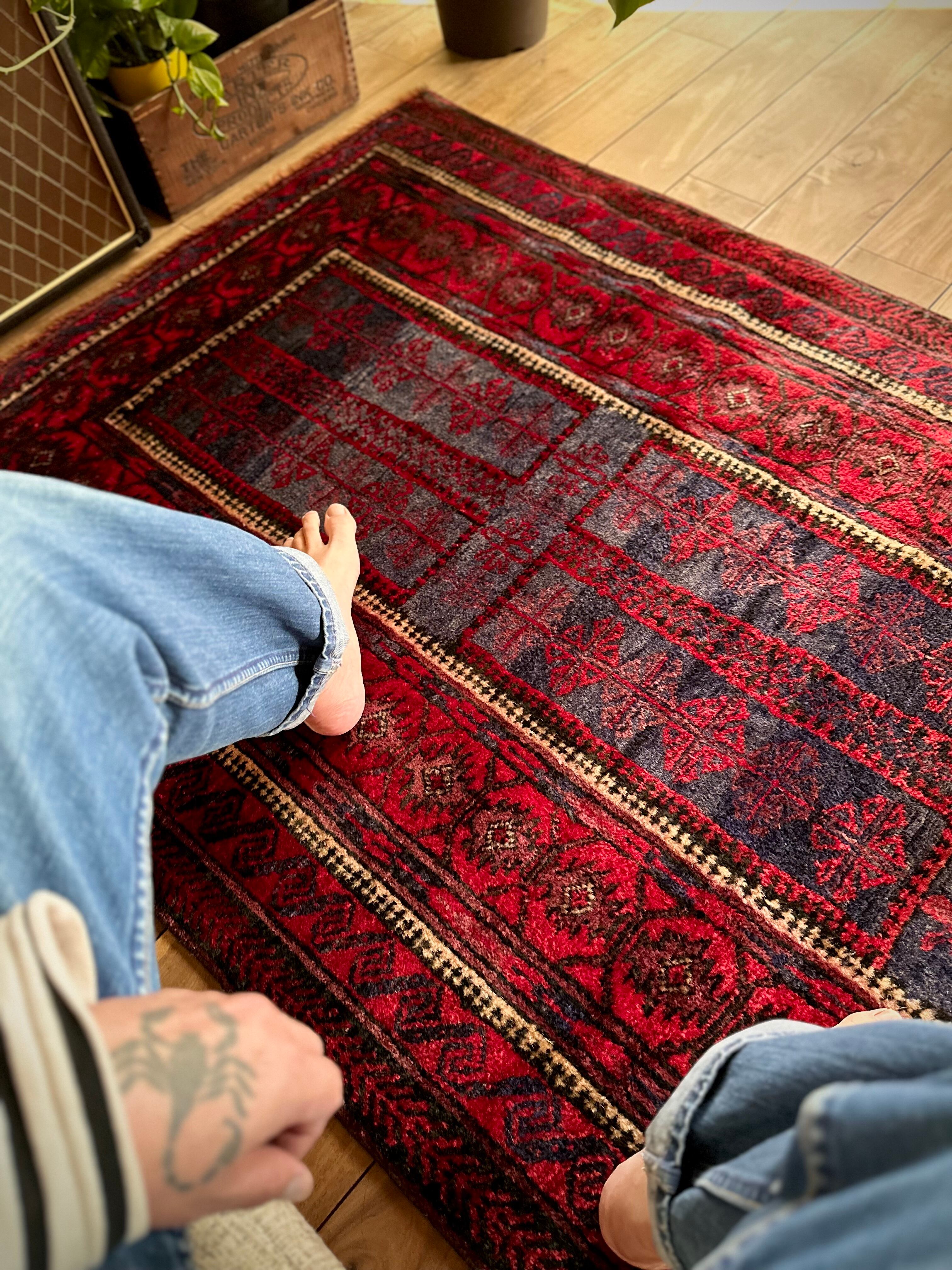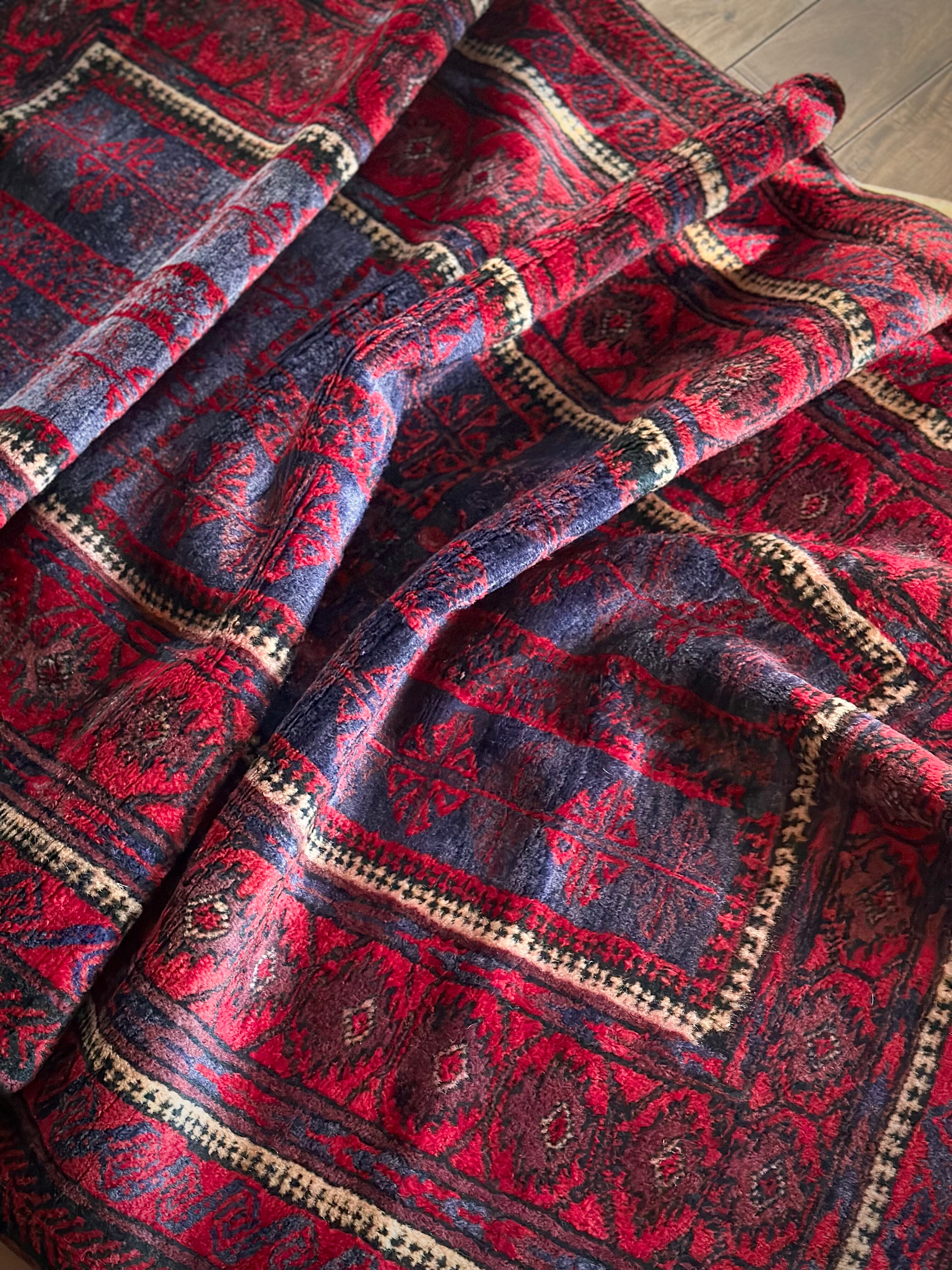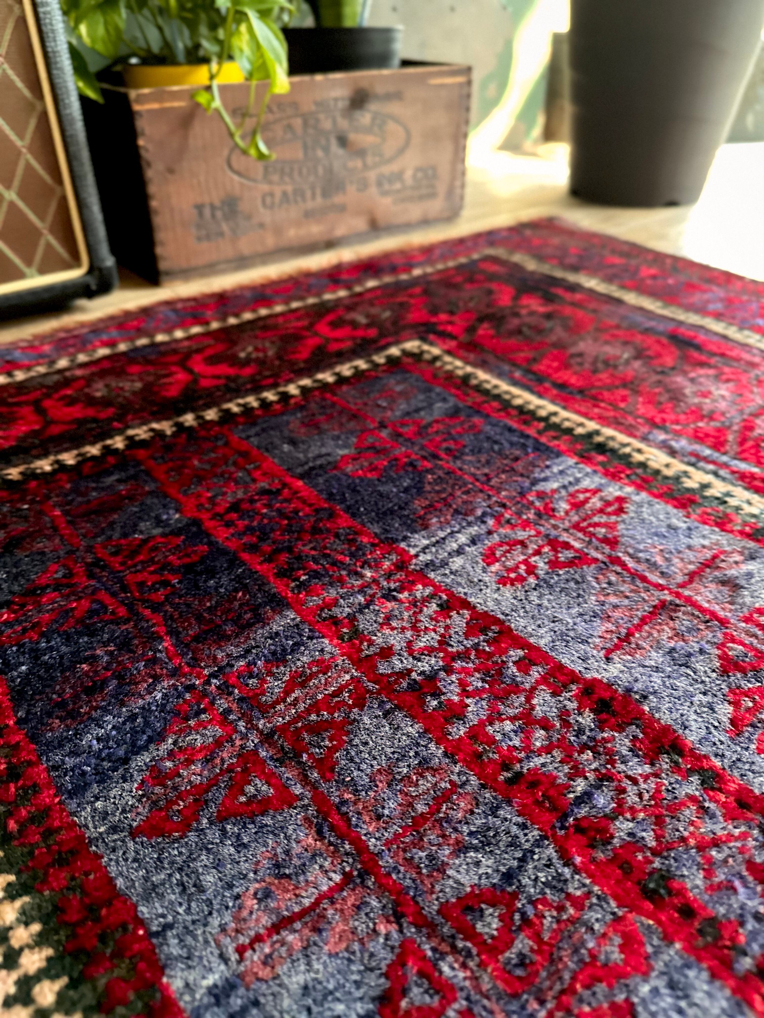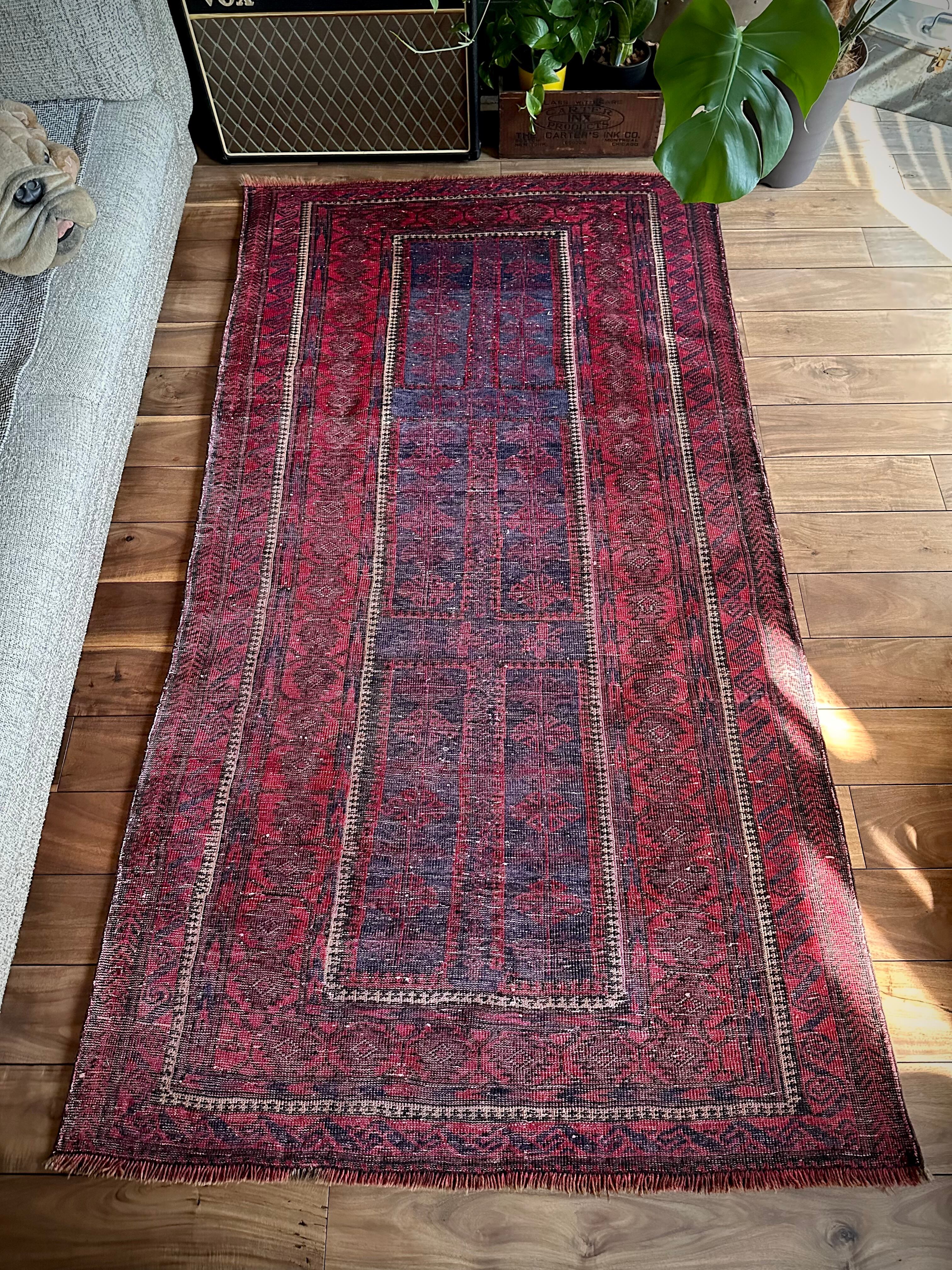 眩しいばかりの発色のいいレッドカラーにインディゴブルーのネイビーが艶やかに光り輝くこちらは、アフガニスタンはヘラート州に居住するバルーチ族のなかでも、デザイン性に優れたヤコブ・カーニー支族からのトライバルラグになります。
