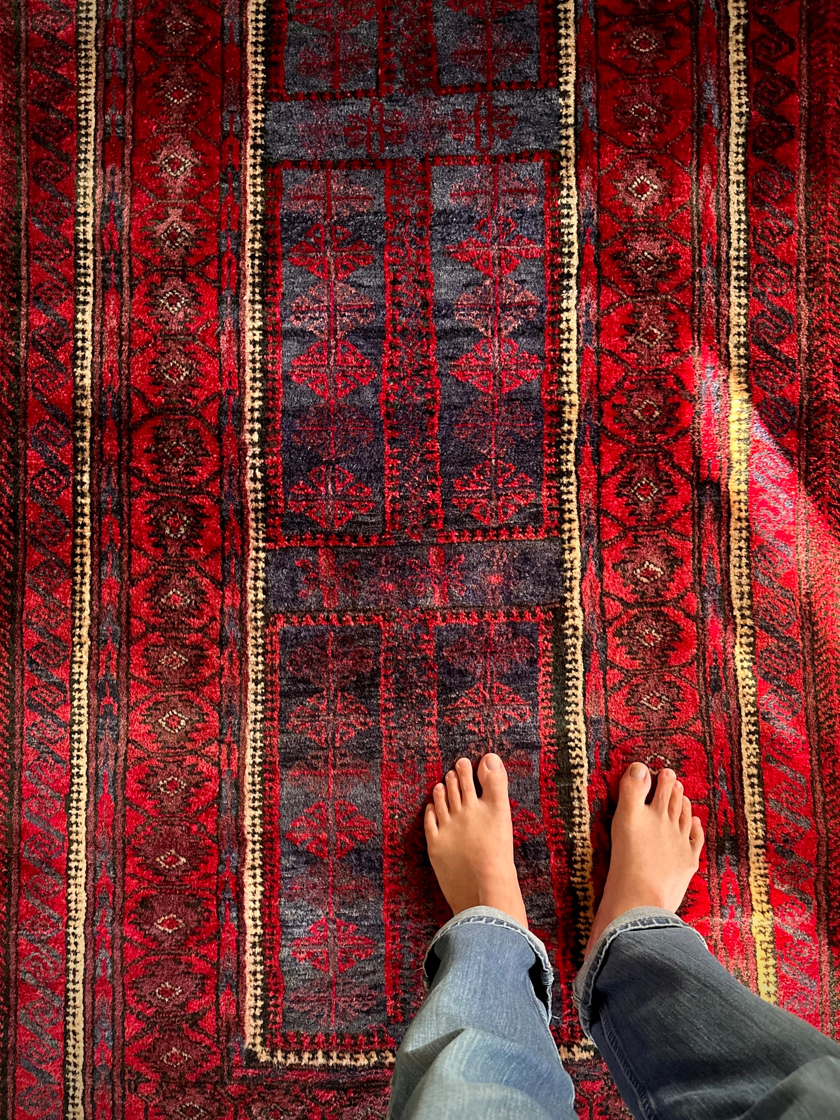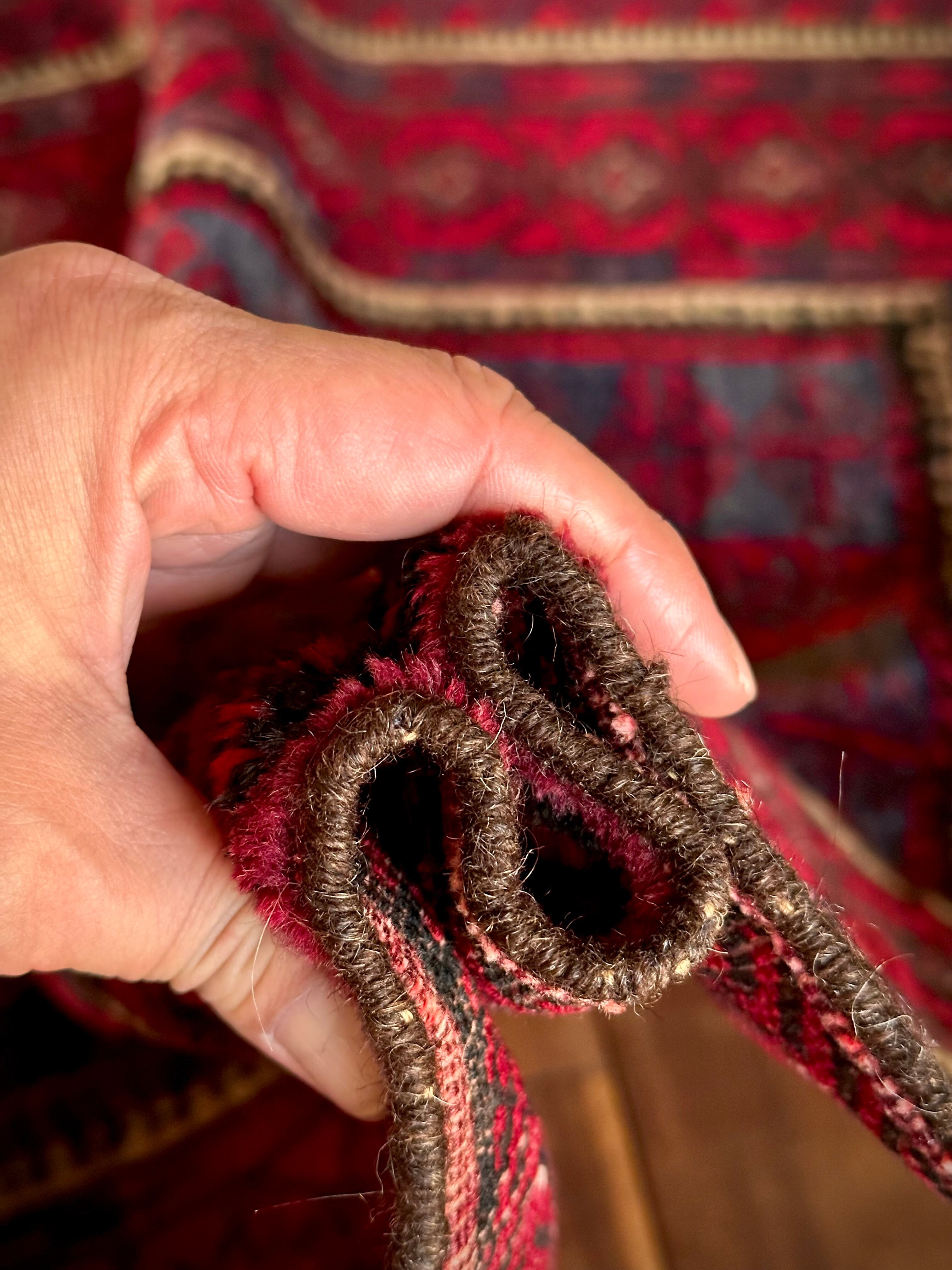 他のバルーチラグを遥かに凌ぐ燻し銀なカッコ良さで、デザインもさることながらここまで深みがある美しい赤色は今まで見た事がないでしょうか。またインディゴと思われる褪せたネイビーの色彩も相まって、陽に当たる輝きは眉唾物の金色夜叉そのものですね。