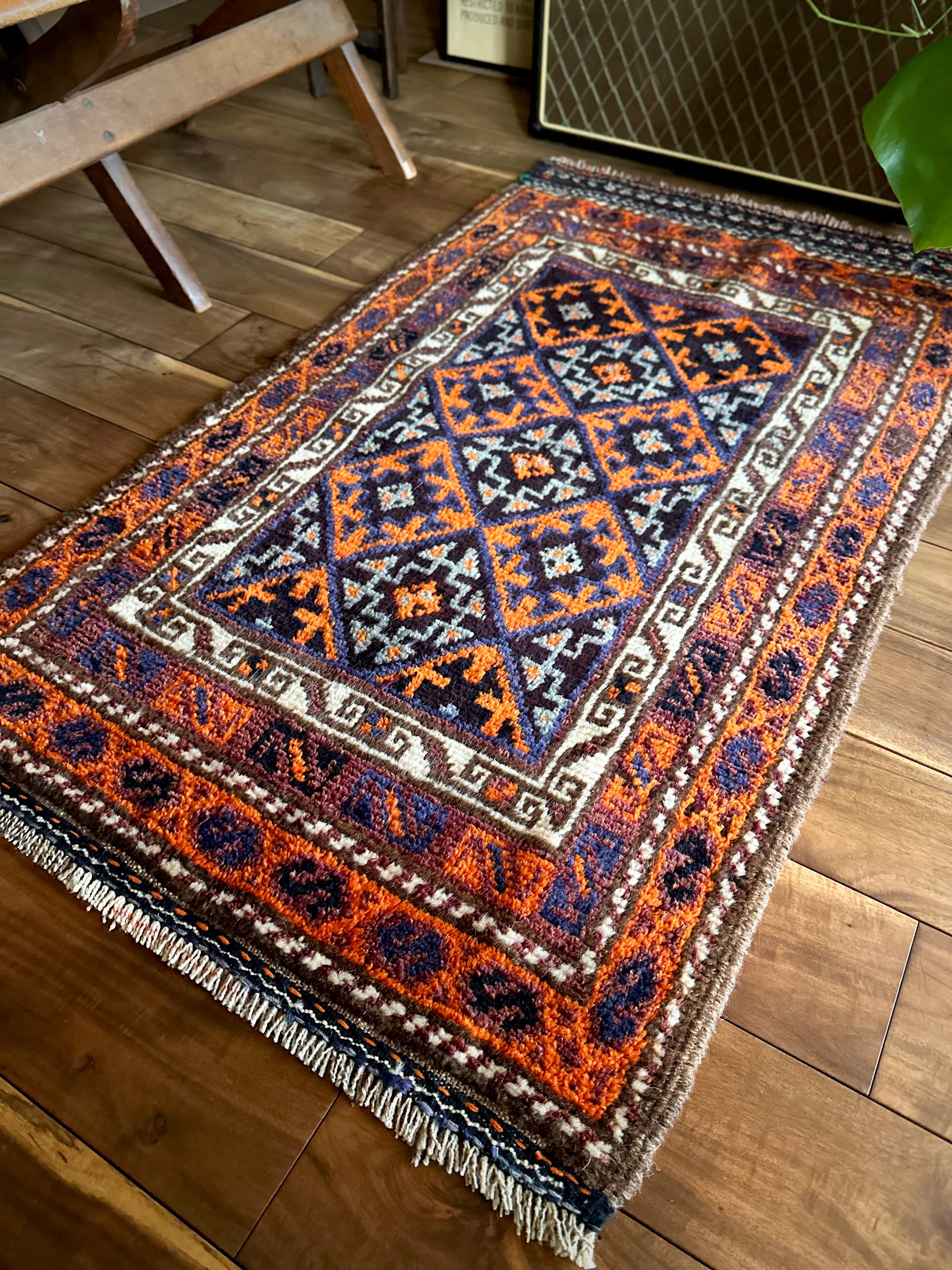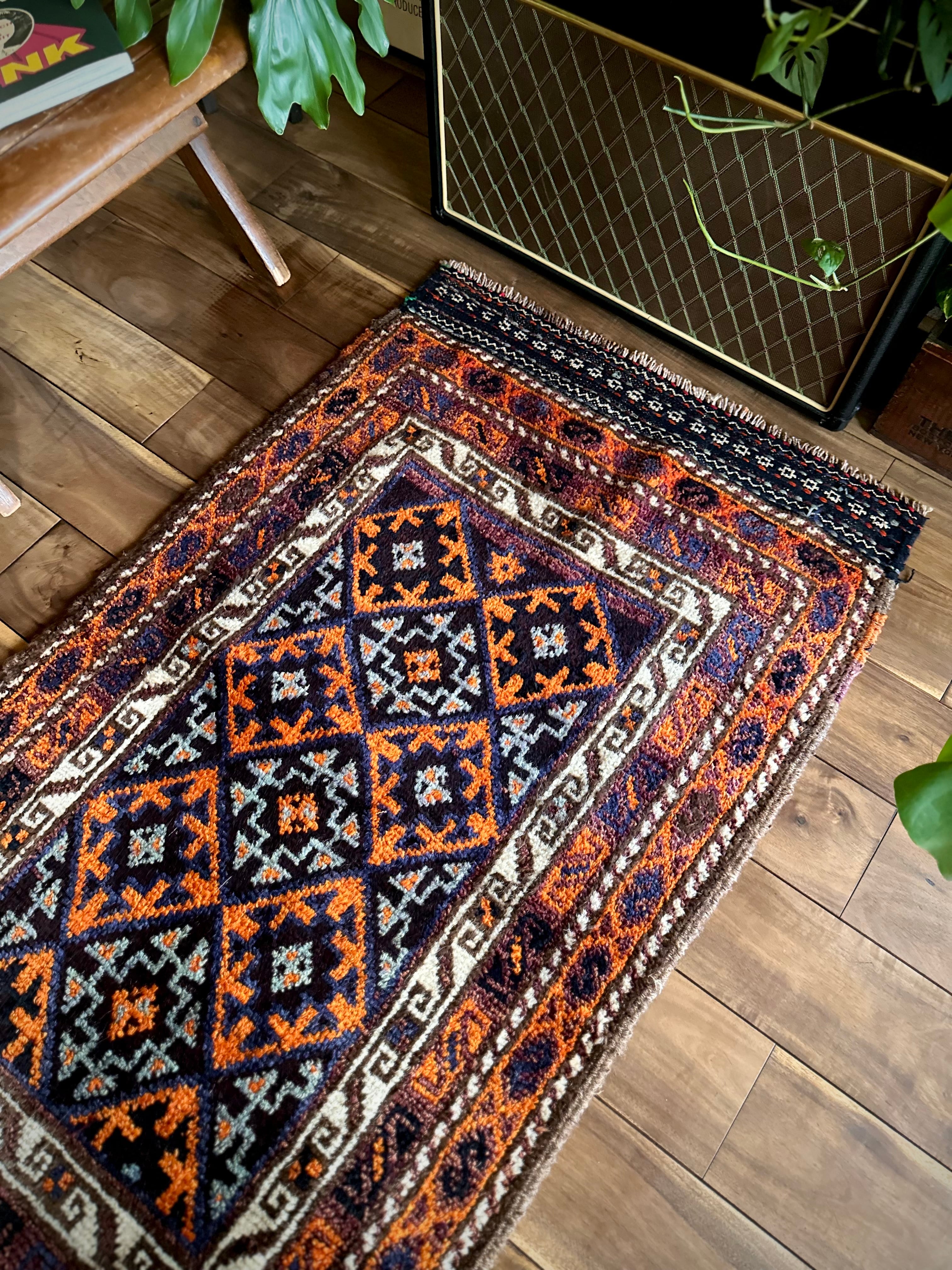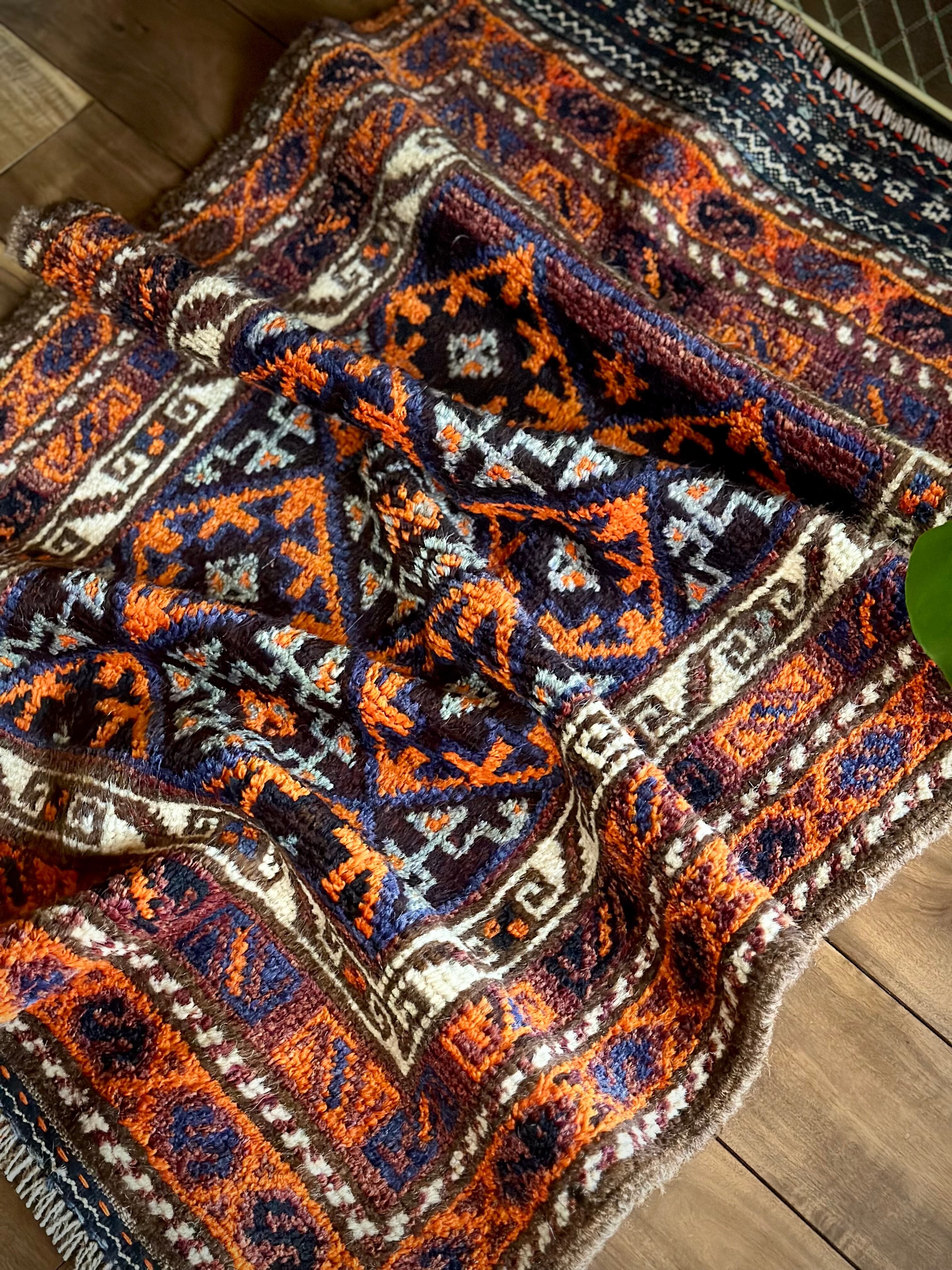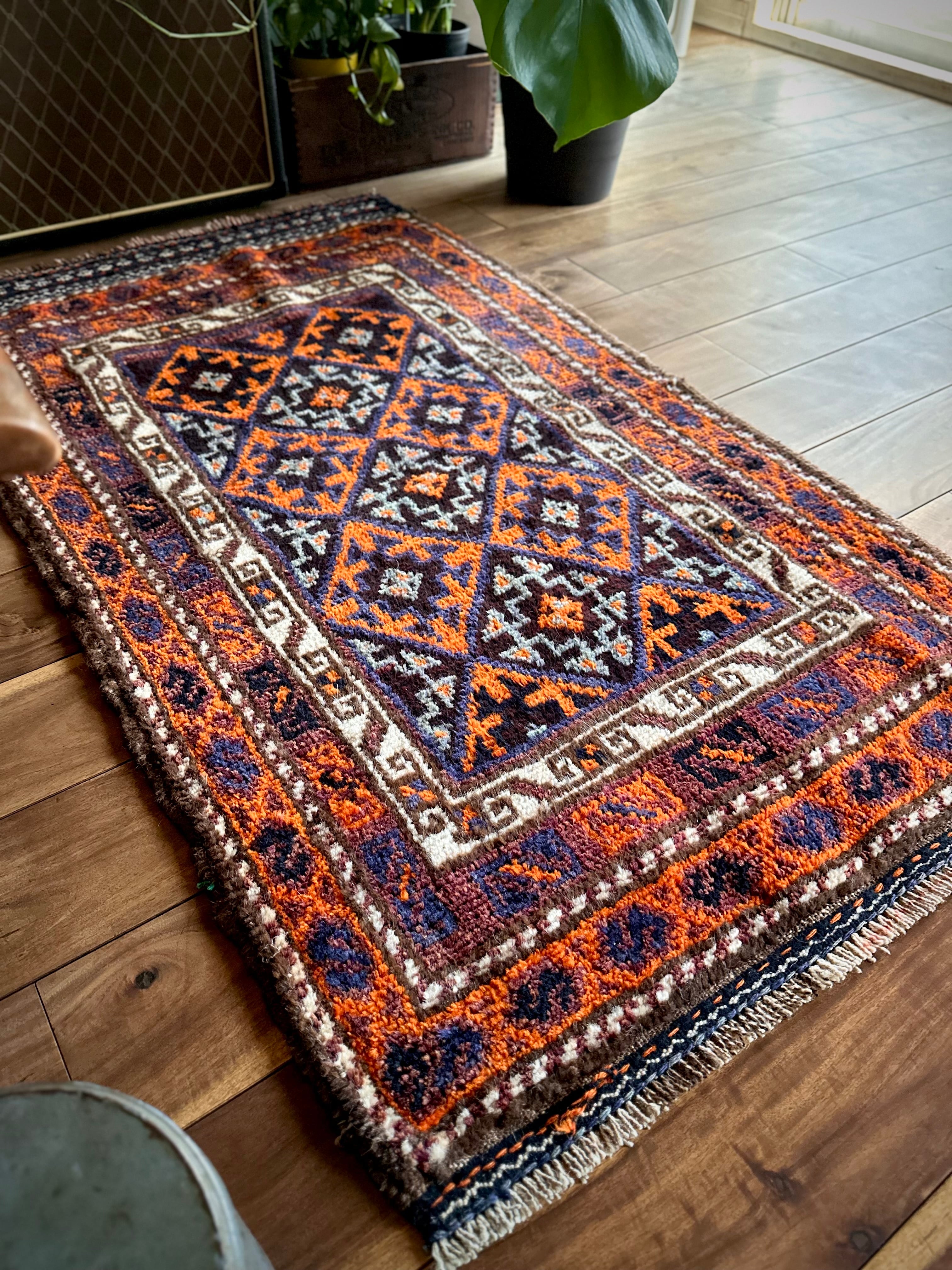 目を惹くオレンジと淡い水色にコバルトブルーのバイアス柄で織り込まれたギュル紋様がトライバルらしいこちらは、アフガニスタンはヘラート州に居住するバルーチ族のトライバルラグで、元は家財道具などを収納するバーリシトと呼ばれる袋状の表皮のみをラグに仕立て直したモノになります。