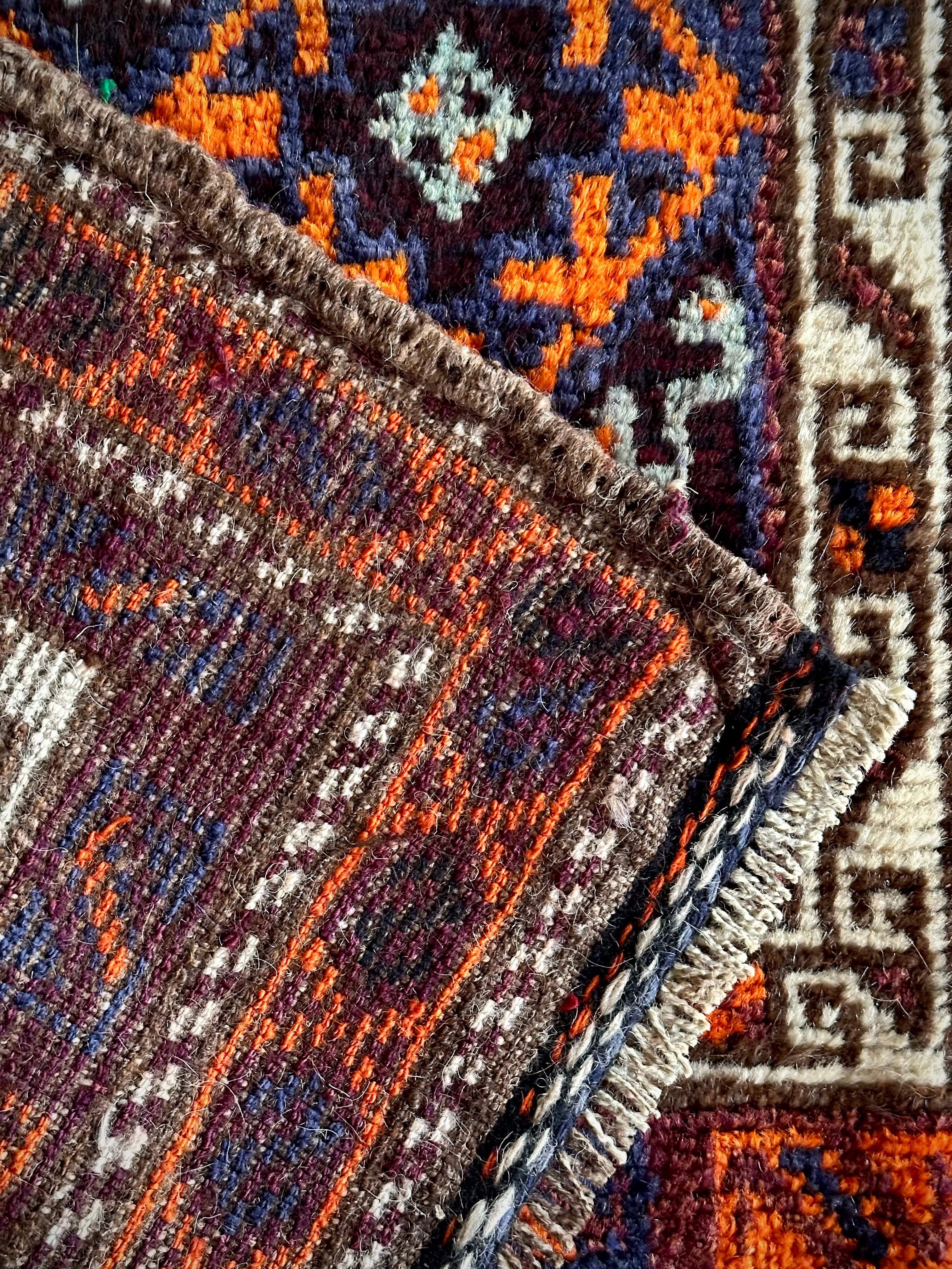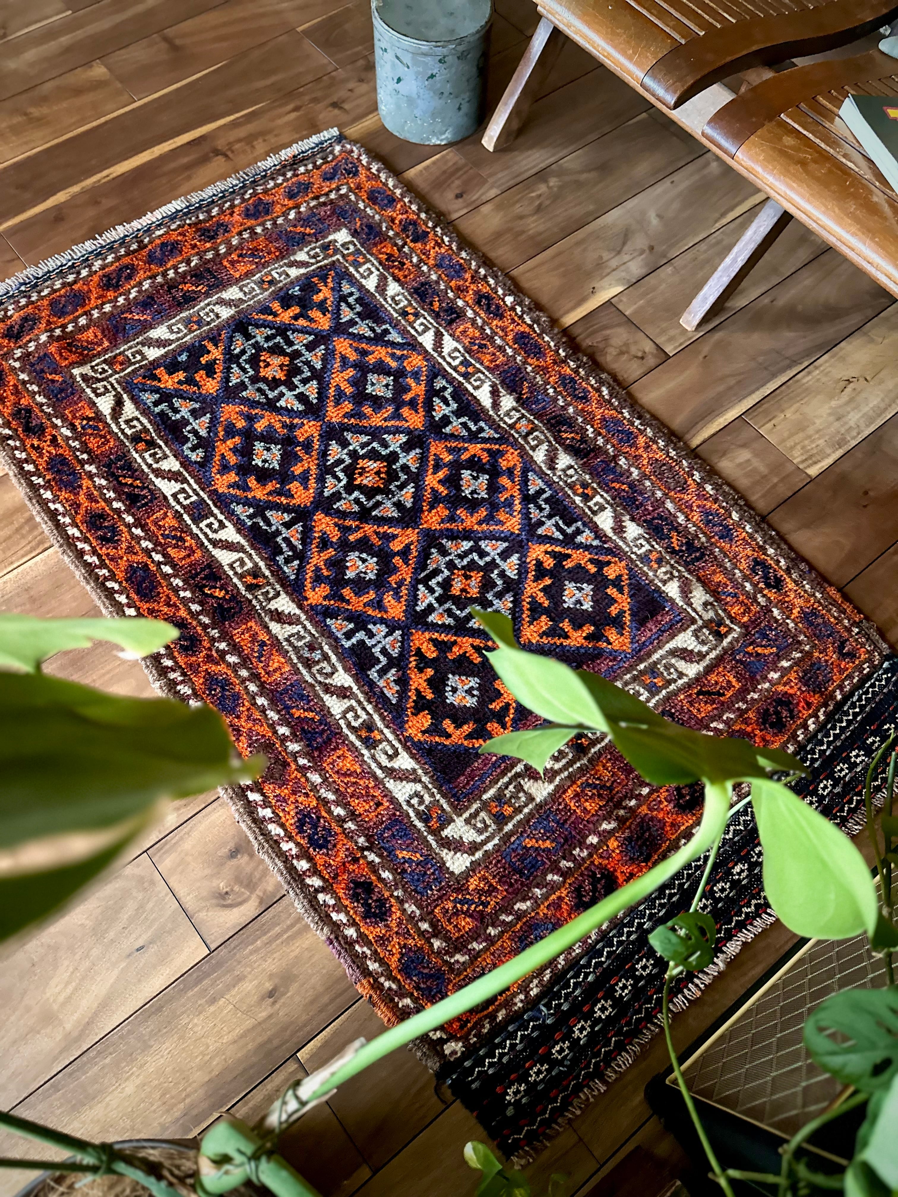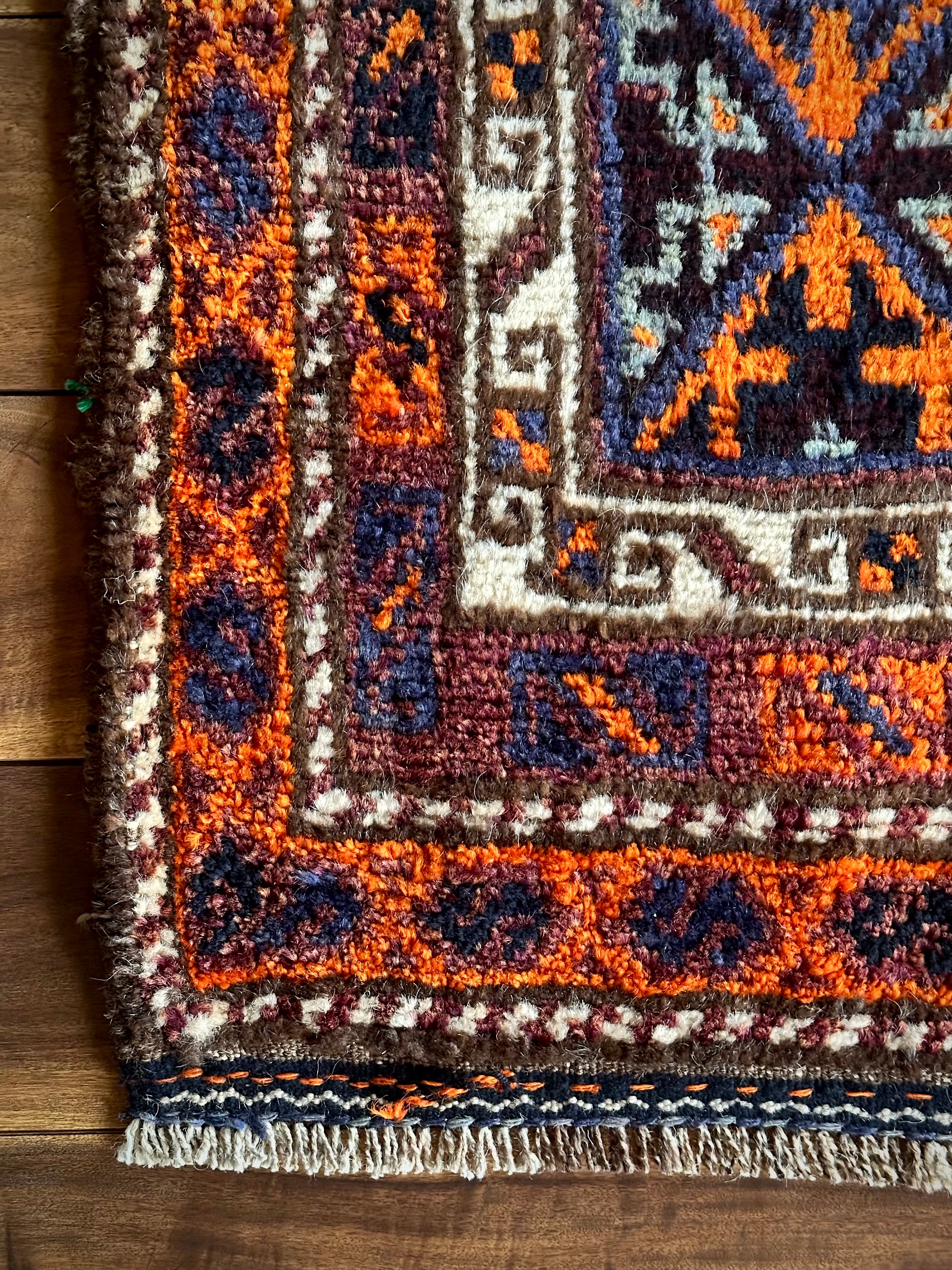 目を惹くオレンジと淡い水色にコバルトブルーのバイアス柄で織り込まれたギュル紋様がトライバルらしいこちらは、アフガニスタンはヘラート州に居住するバルーチ族のトライバルラグで、元は家財道具などを収納するバーリシトと呼ばれる袋状の表皮のみをラグに仕立て直したモノになります。