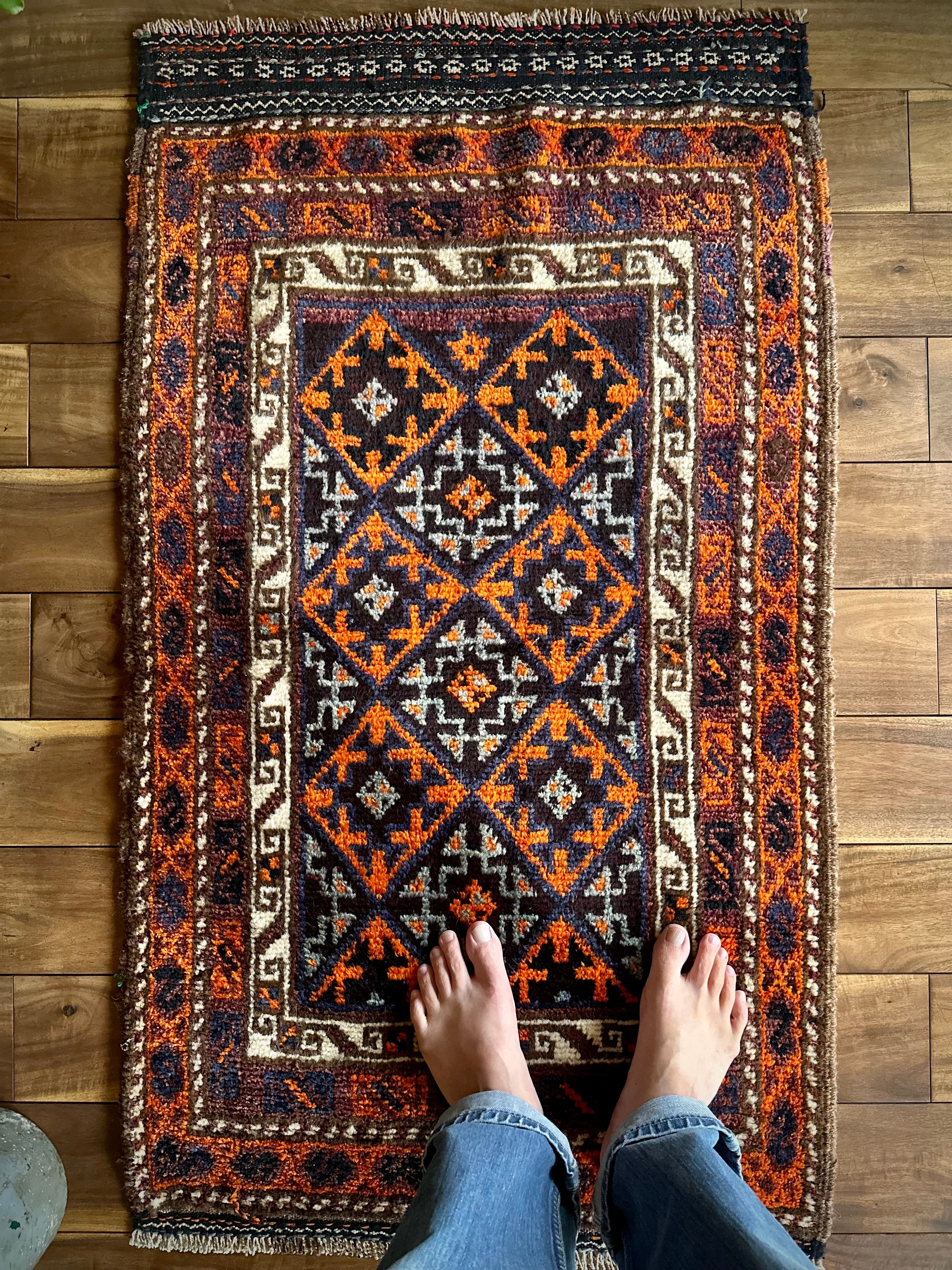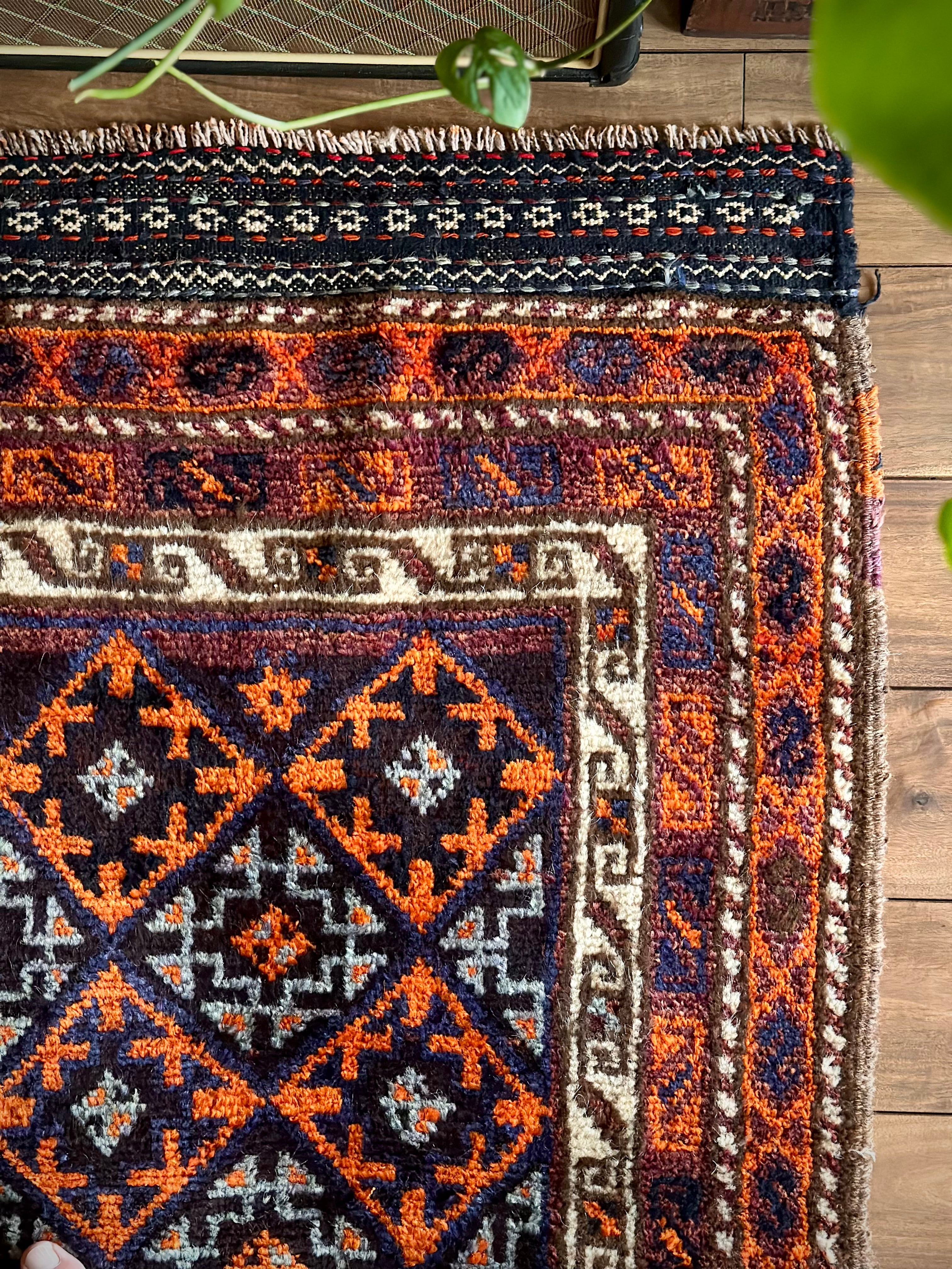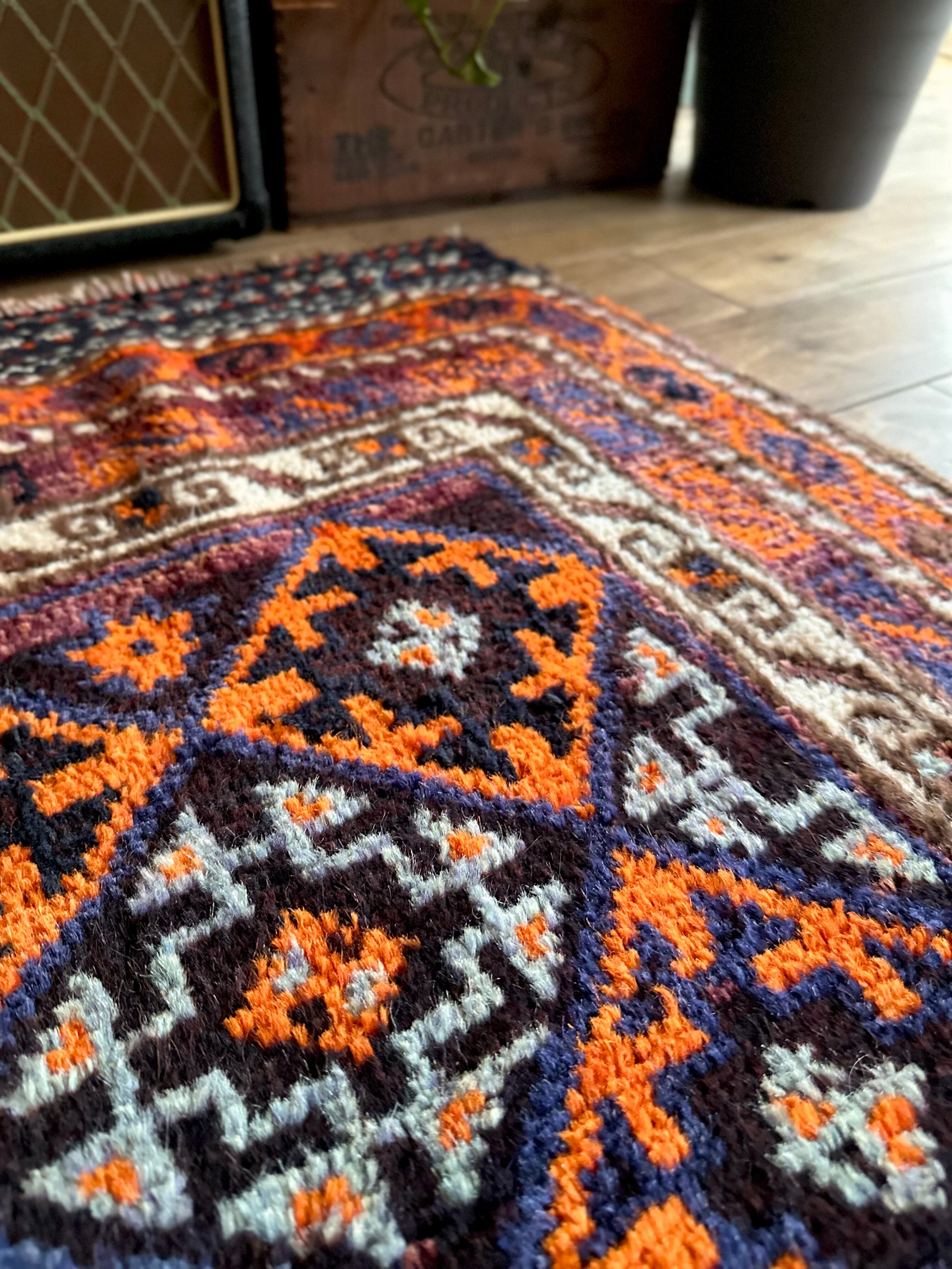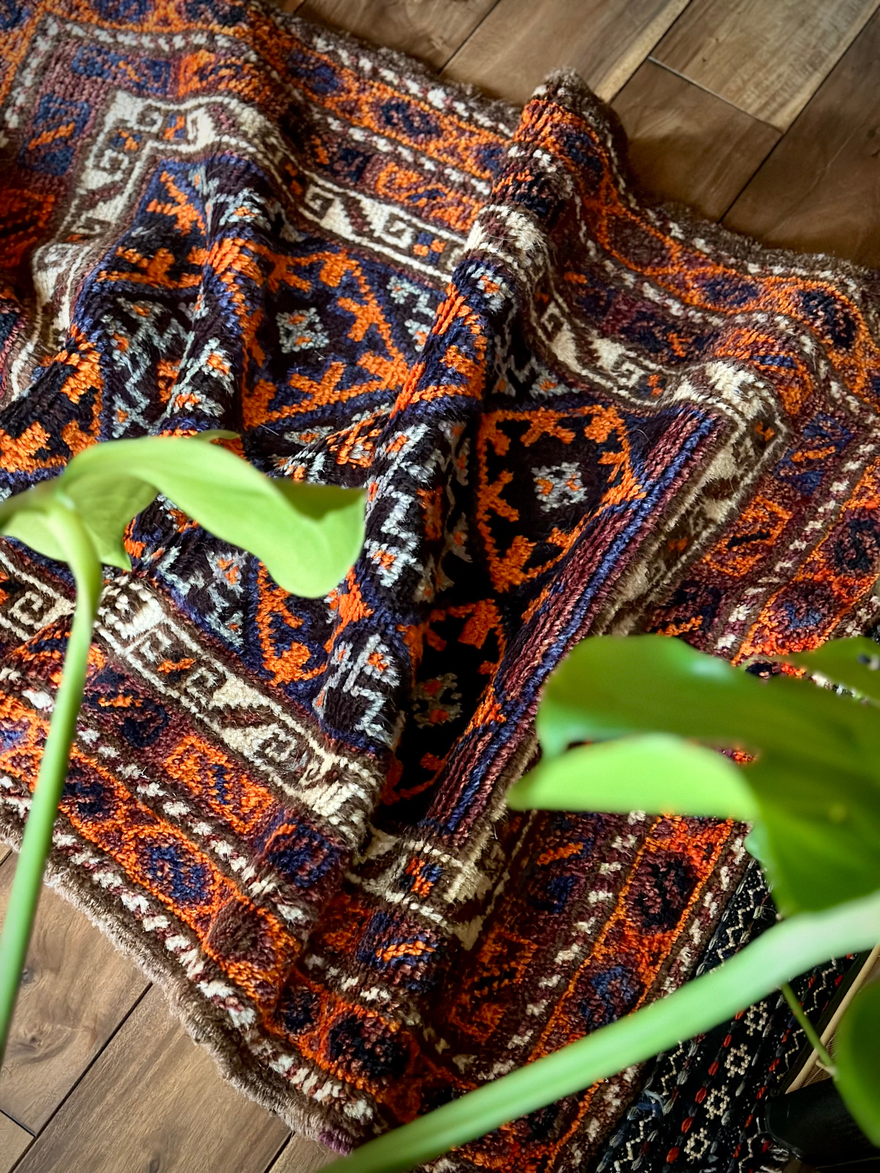 目を惹くオレンジと淡い水色にコバルトブルーのバイアス柄で織り込まれたギュル紋様がトライバルらしいこちらは、アフガニスタンはヘラート州に居住するバルーチ族のトライバルラグで、元は家財道具などを収納するバーリシトと呼ばれる袋状の表皮のみをラグに仕立て直したモノになります。