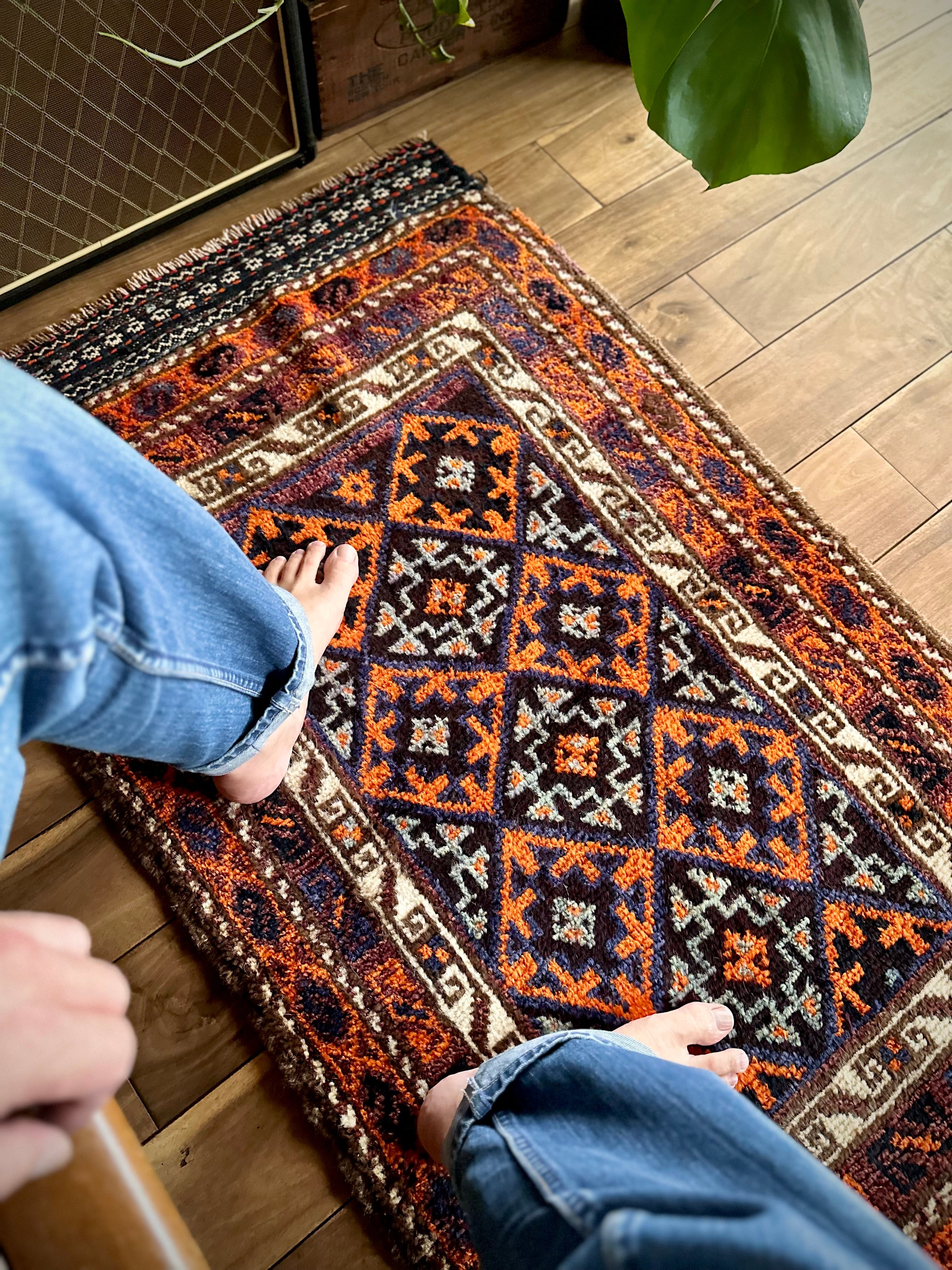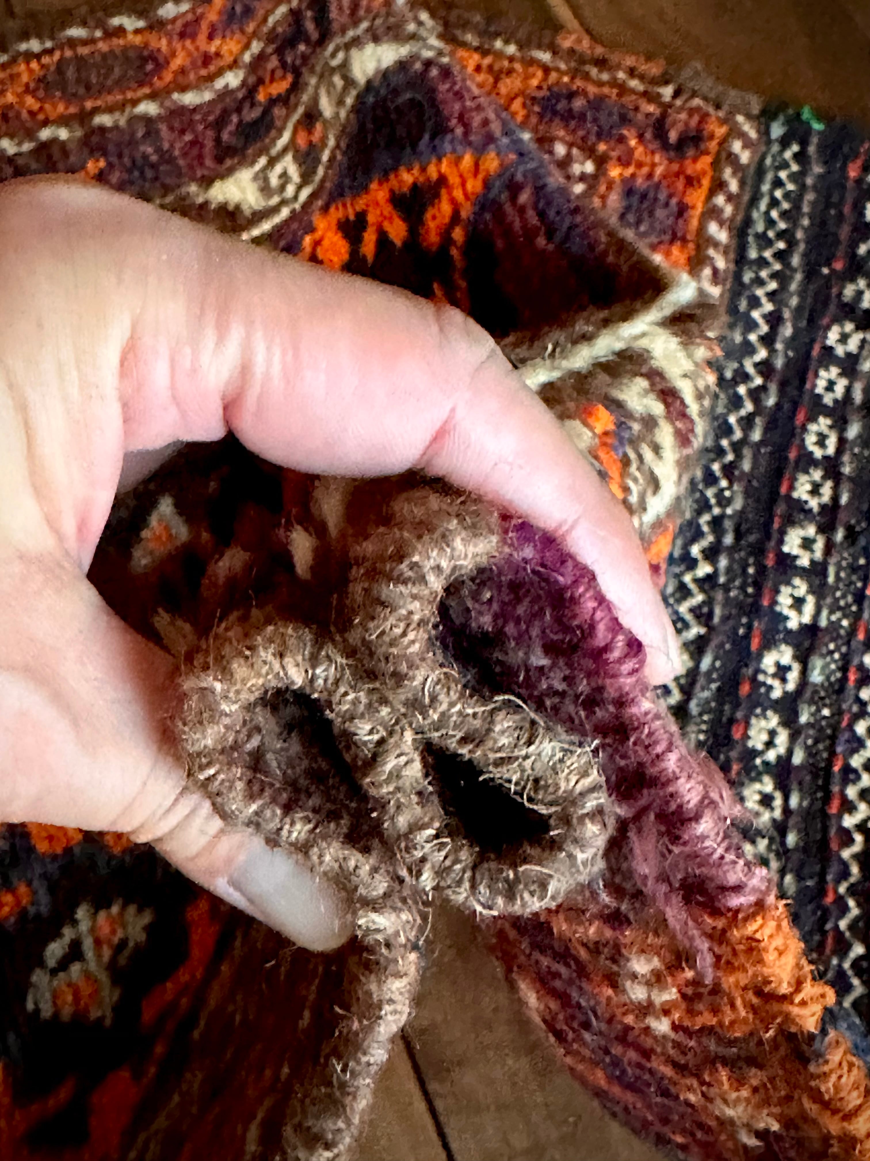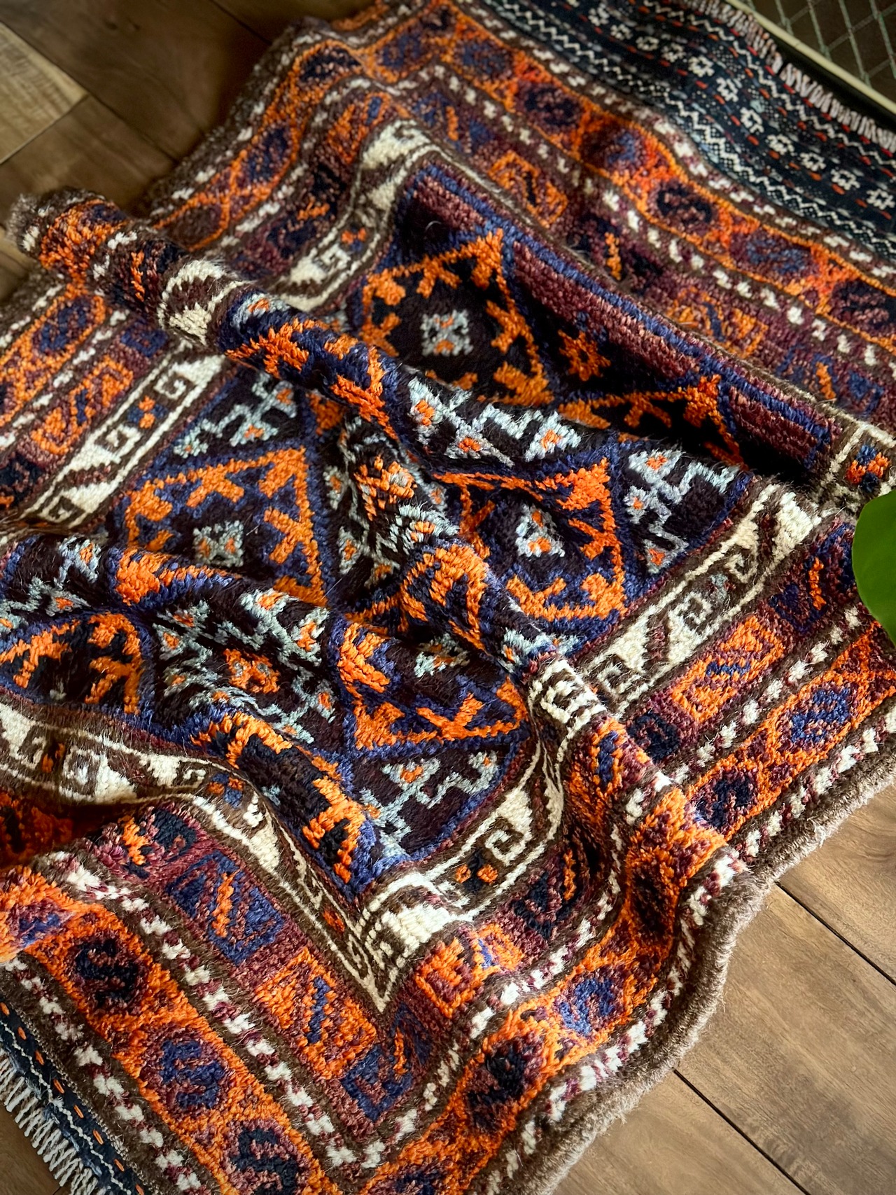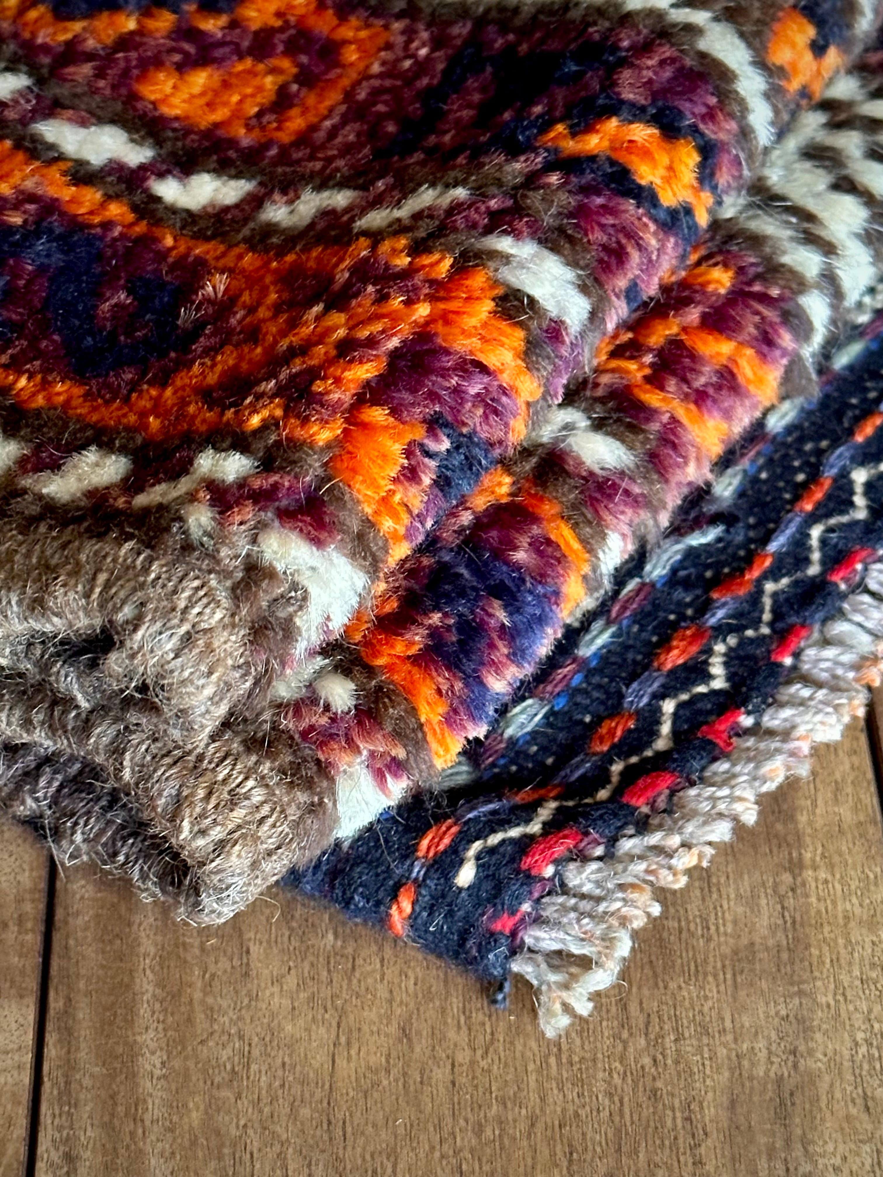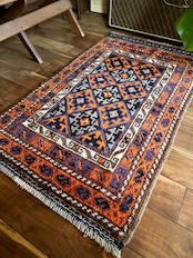最後にラグそのものに関しては羊毛特有の匂いがあり、採寸は中央付近で計測していますが、手織りならではの歪みによる誤差や水洗いクリーニングによる縮み、また草木染めによる経年劣化の色ムラなどがありますが、それもまたヴィンテージラグの魅力かとご理解ください。