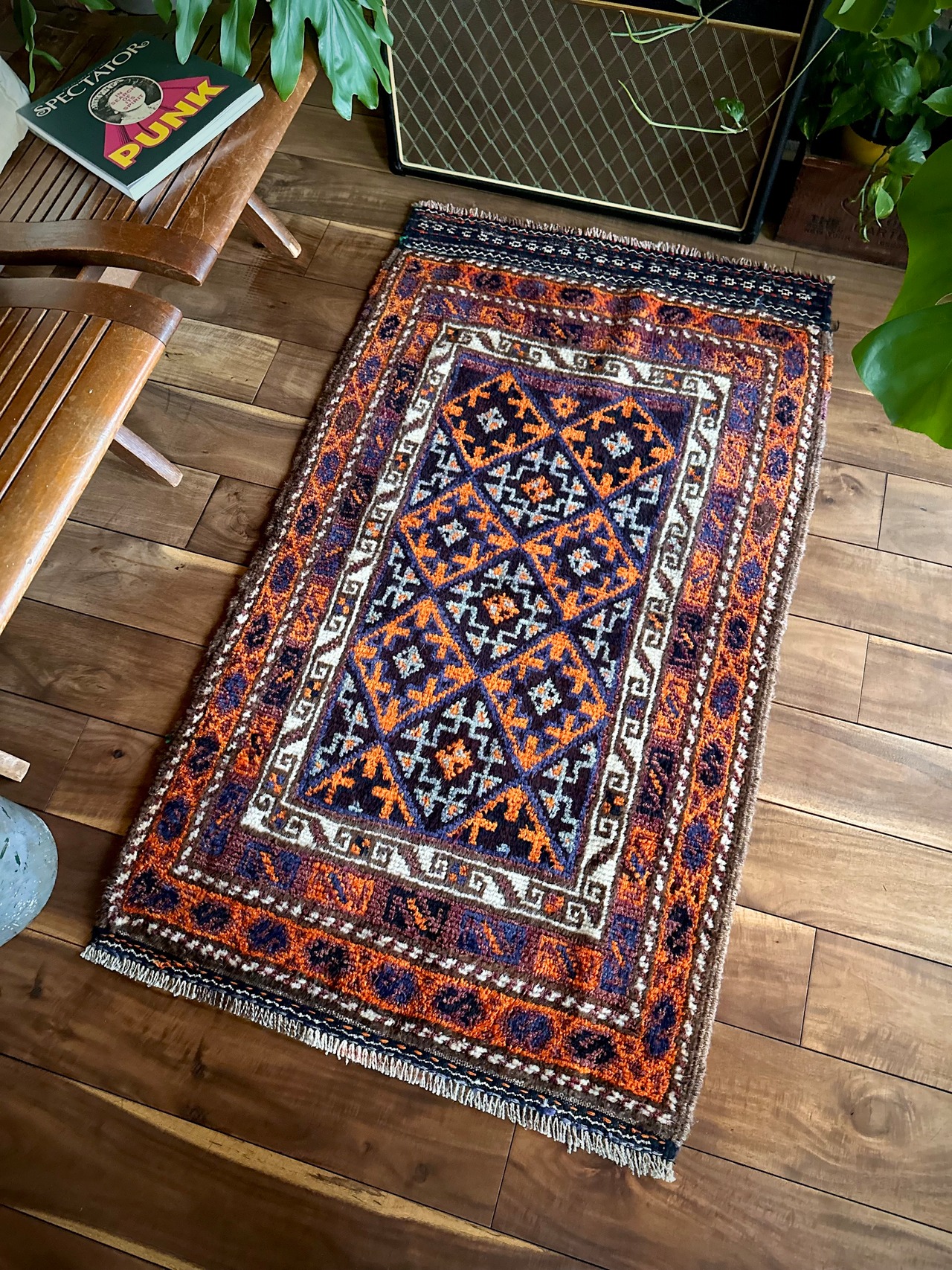 経年としては55年のヴィンテージラグになりますが、元が袋物だけにそれほどの使用感もなく、特に目立つ汚れやダメージにリペア箇所は見当たらないグッドなコンディションで、派手な色合いながらもしっくりとお部屋に馴染むアクセントラグになります。