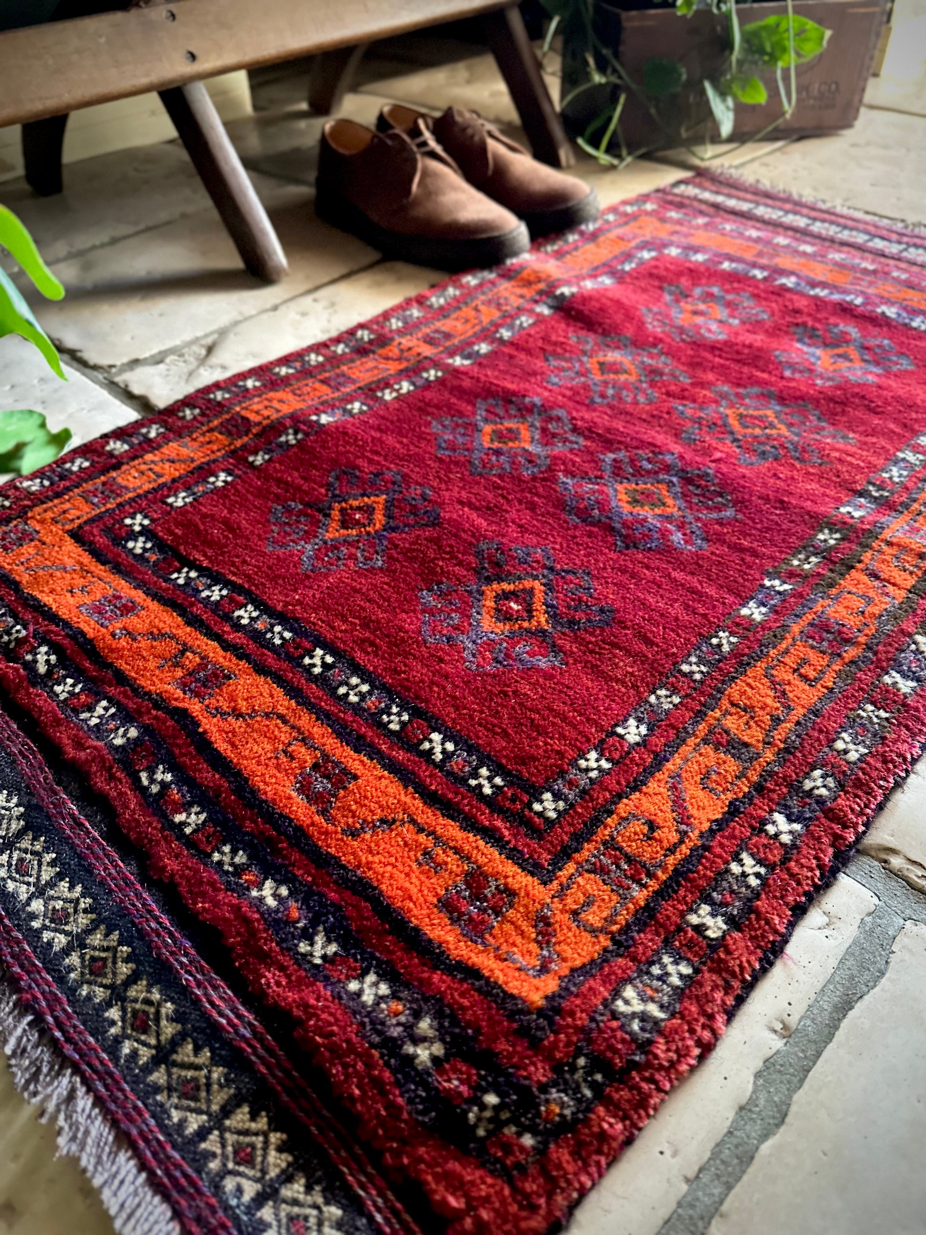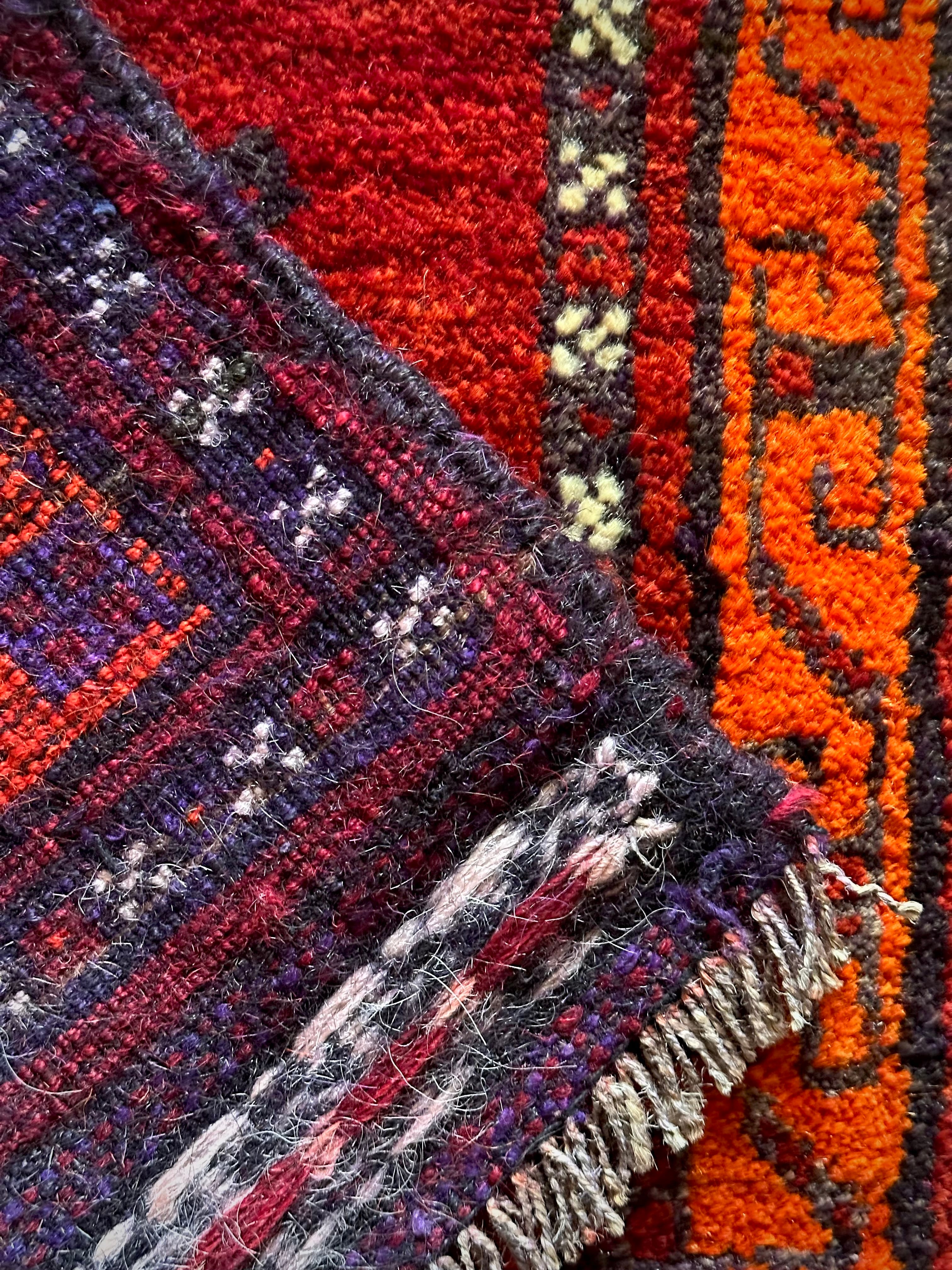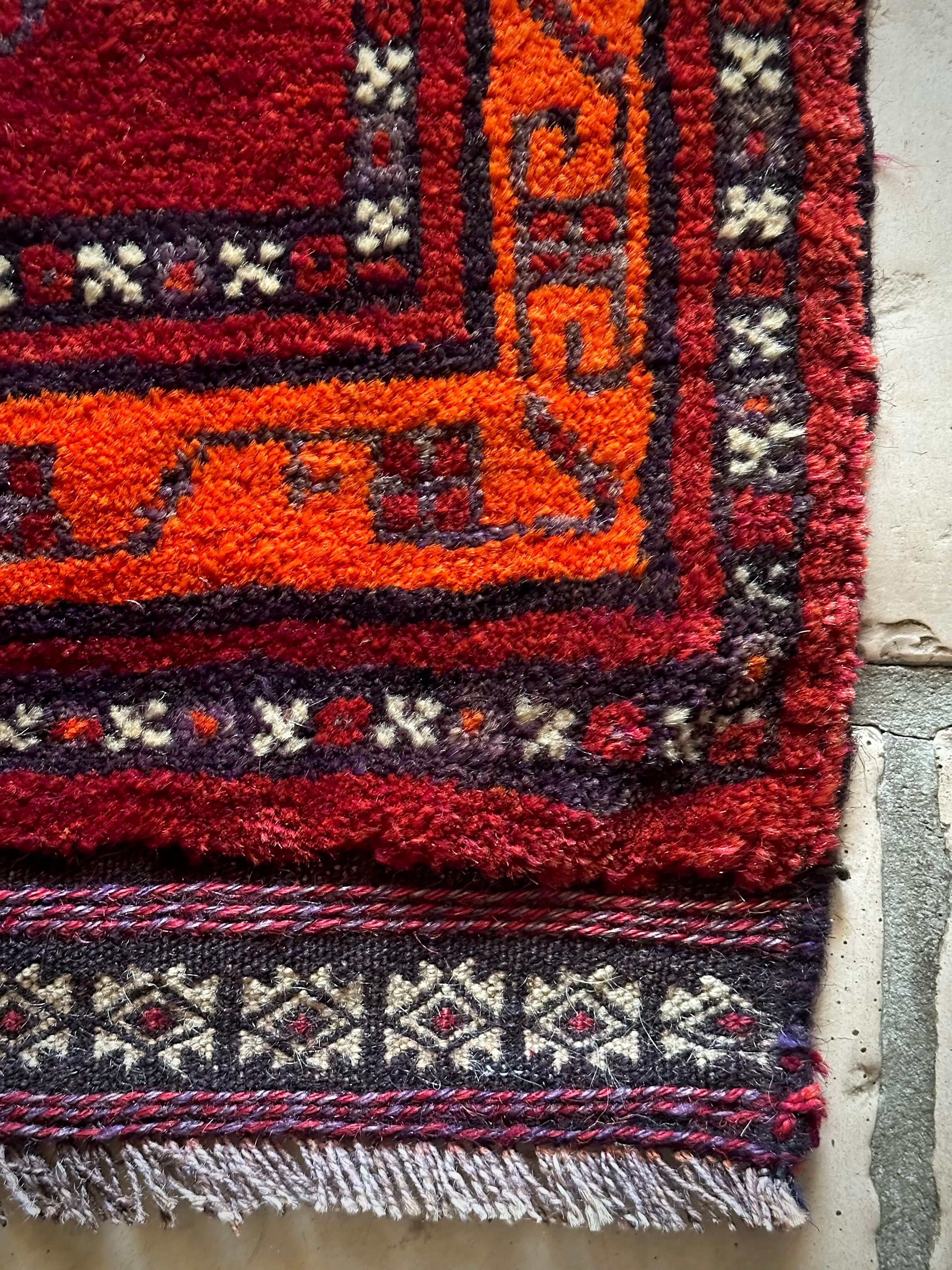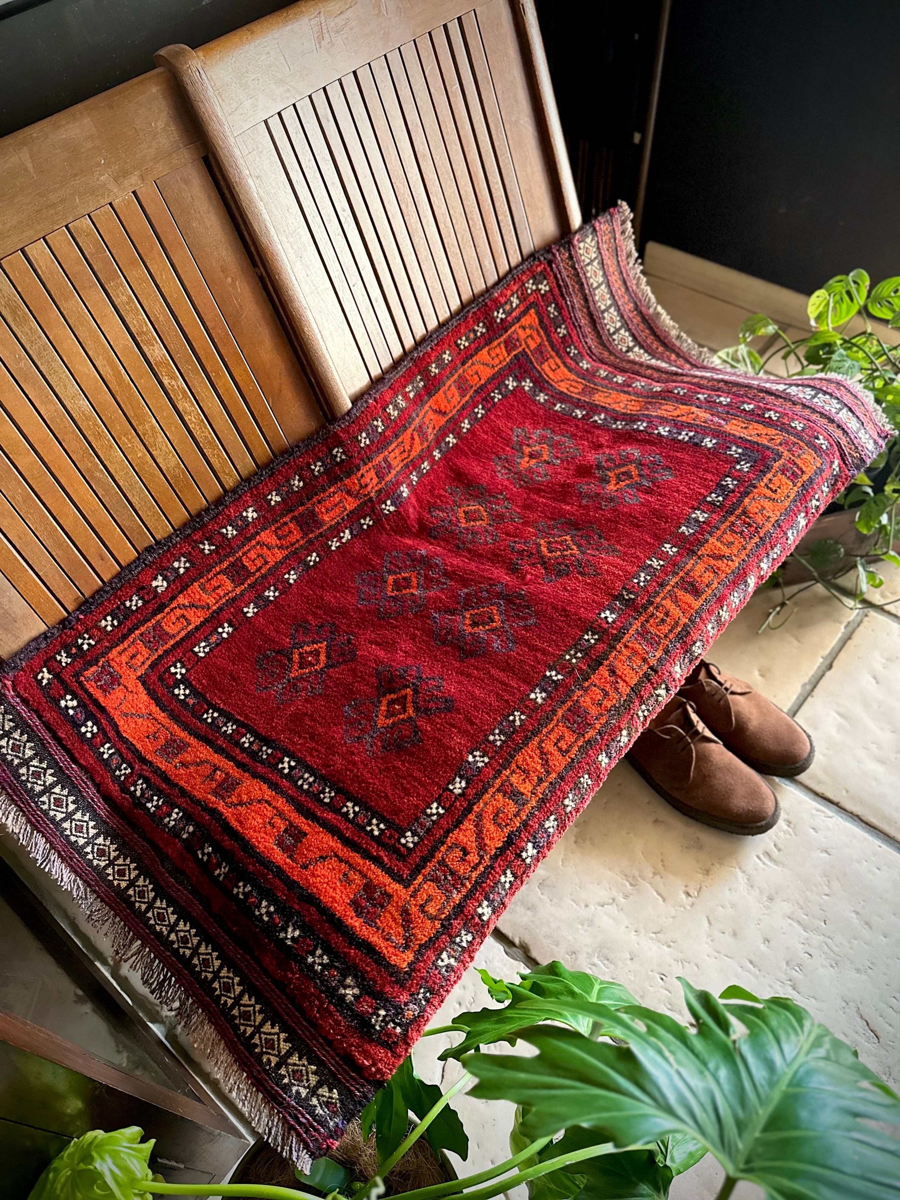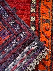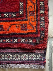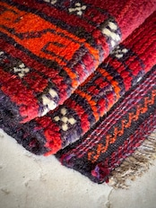 鮮やかな発色のバーガンディとオレンジが際立つ見た目にもフカフカと気持ち良さそうなこちらは、アフガニスタンはヘラート州に居住するバルーチ族のトライバルラグで、元は家財道具などを収納するバーリシトと呼ばれる袋状の表皮のみをラグに仕立て直したモノになります。