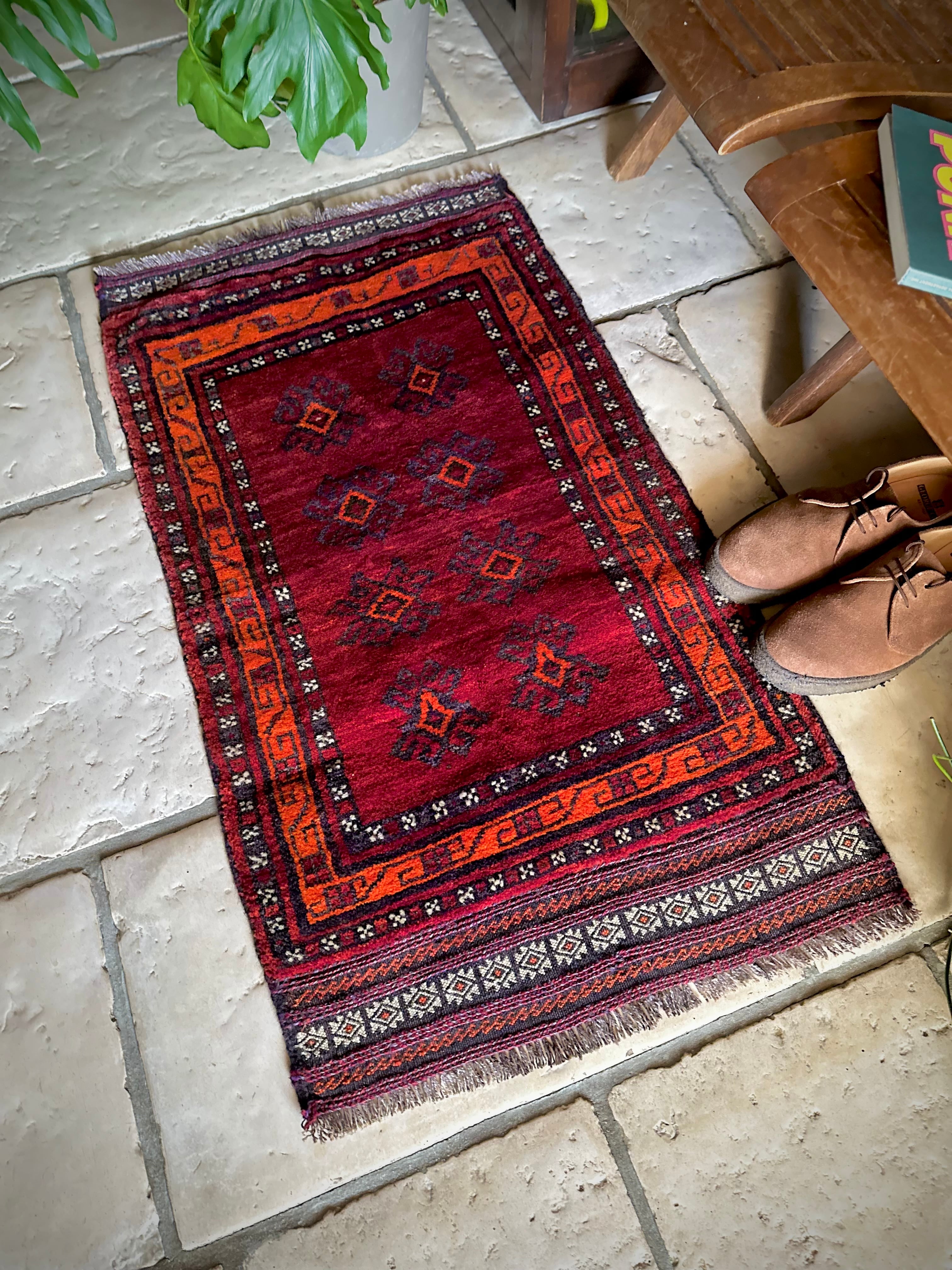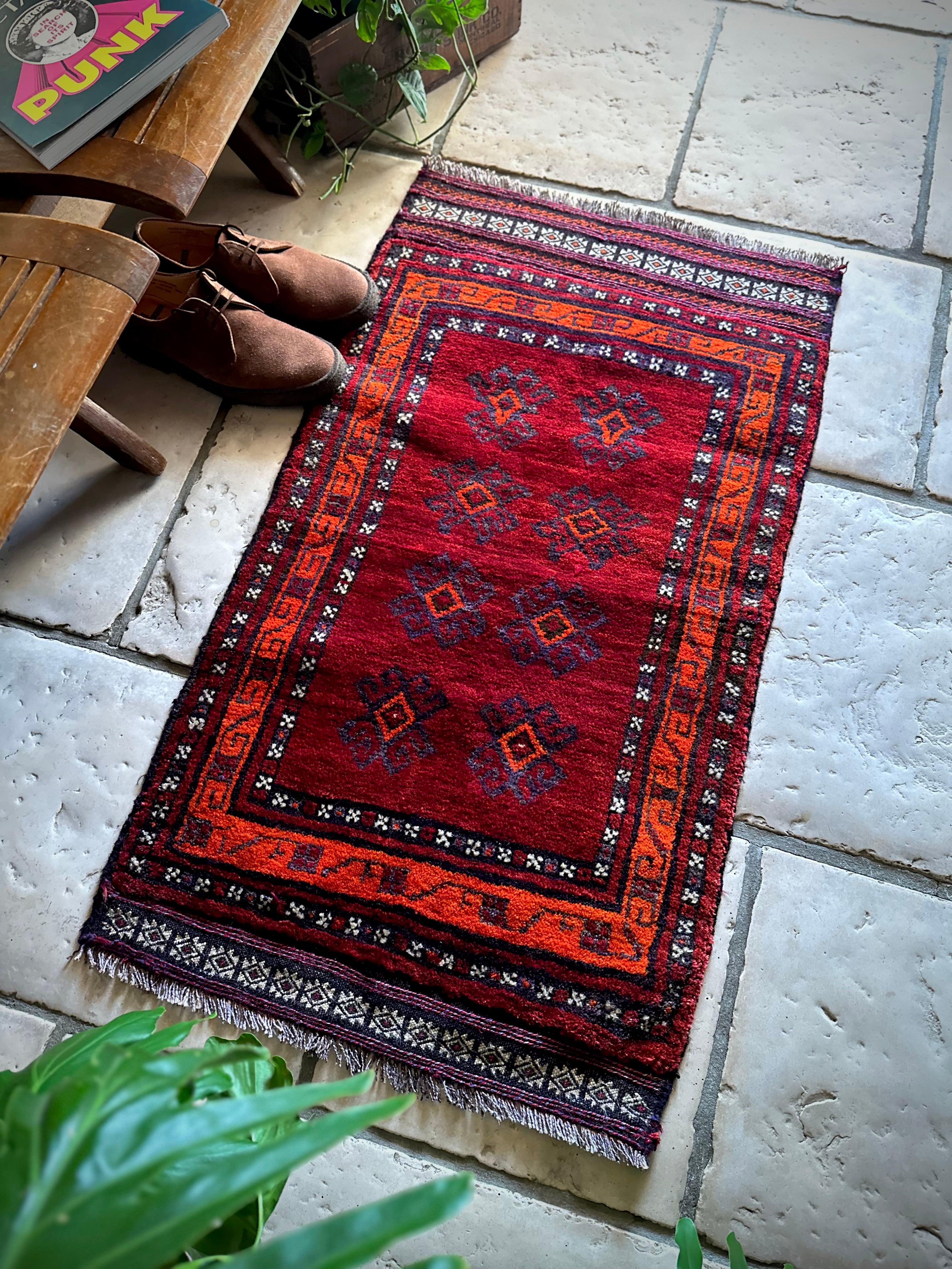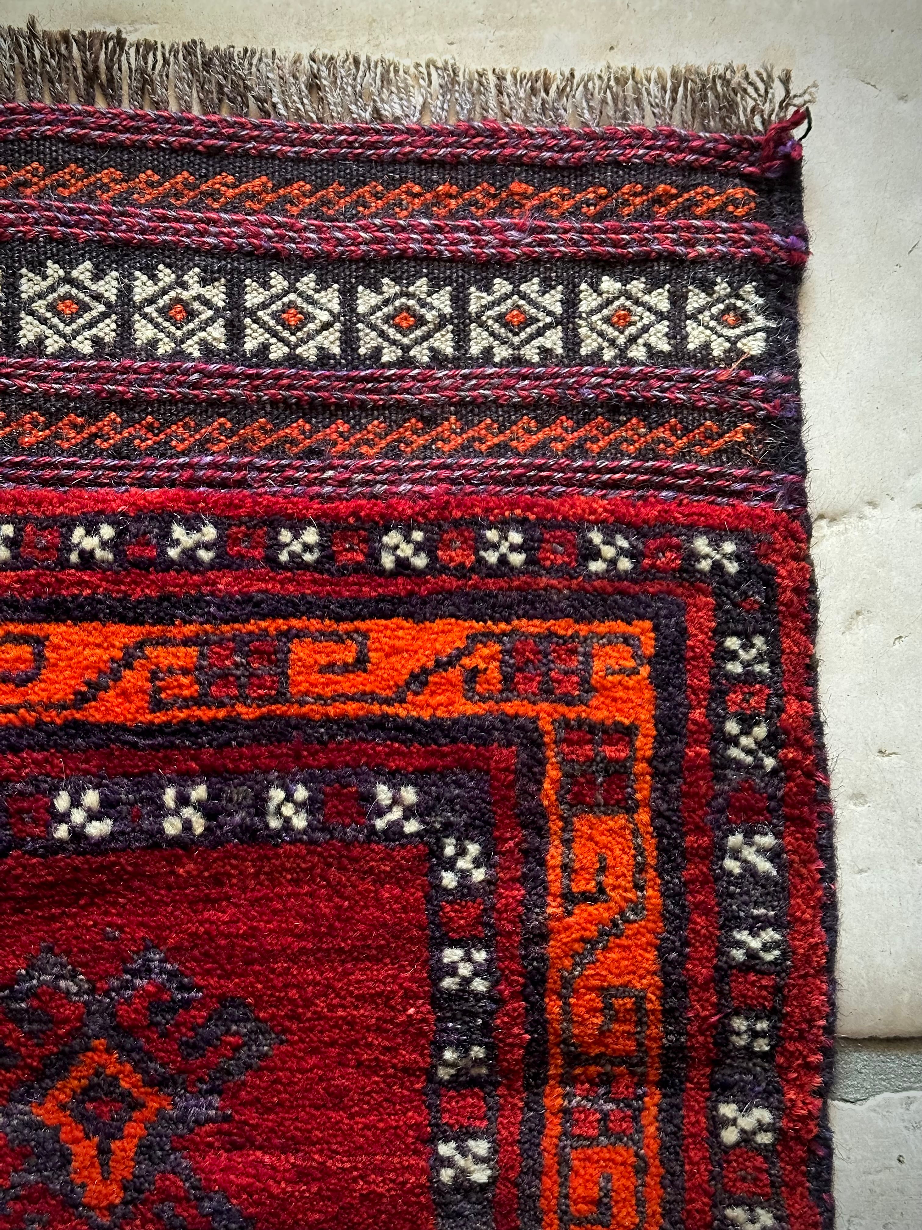 鮮やかな発色のバーガンディとオレンジが際立つ見た目にもフカフカと気持ち良さそうなこちらは、アフガニスタンはヘラート州に居住するバルーチ族のトライバルラグで、元は家財道具などを収納するバーリシトと呼ばれる袋状の表皮のみをラグに仕立て直したモノになります。