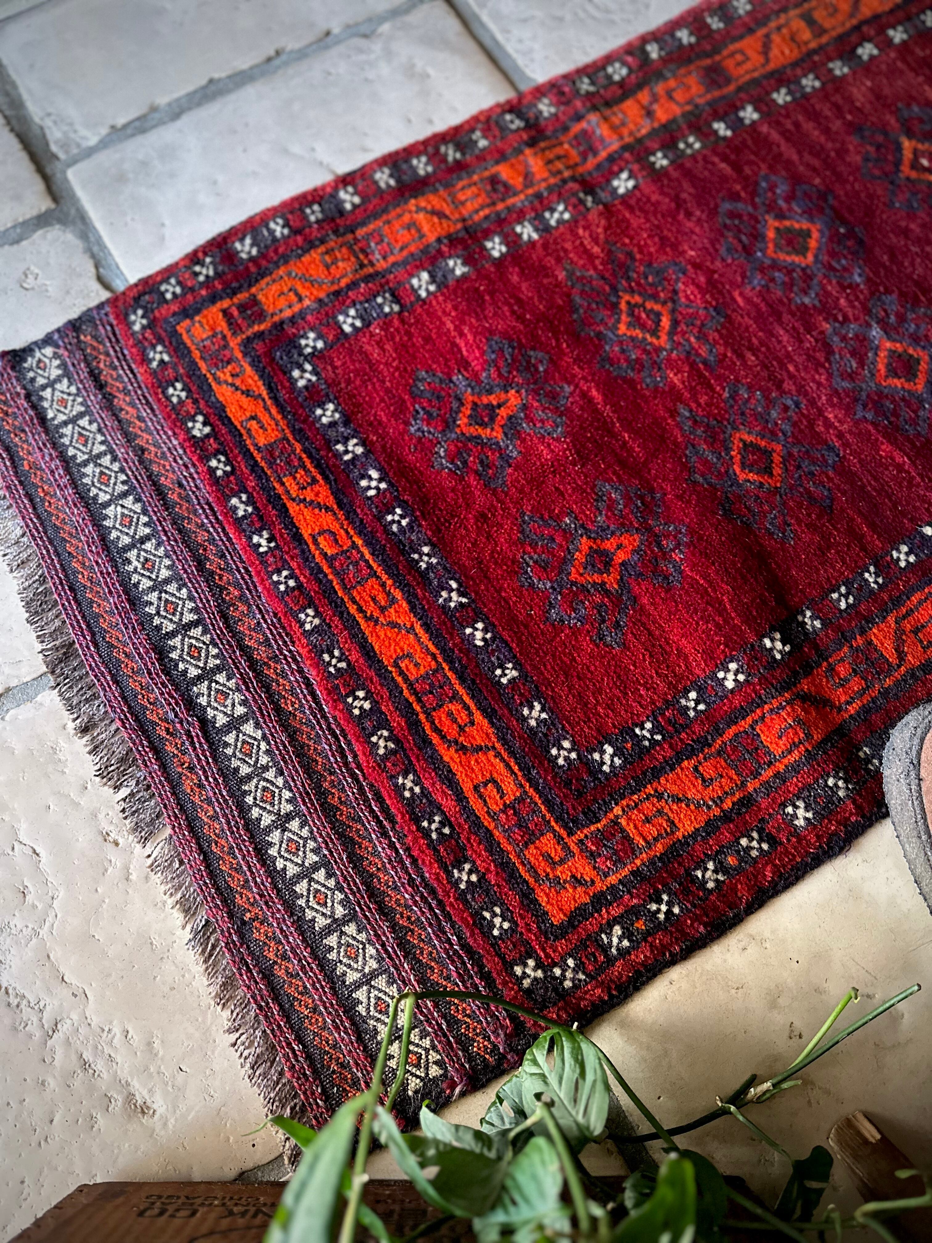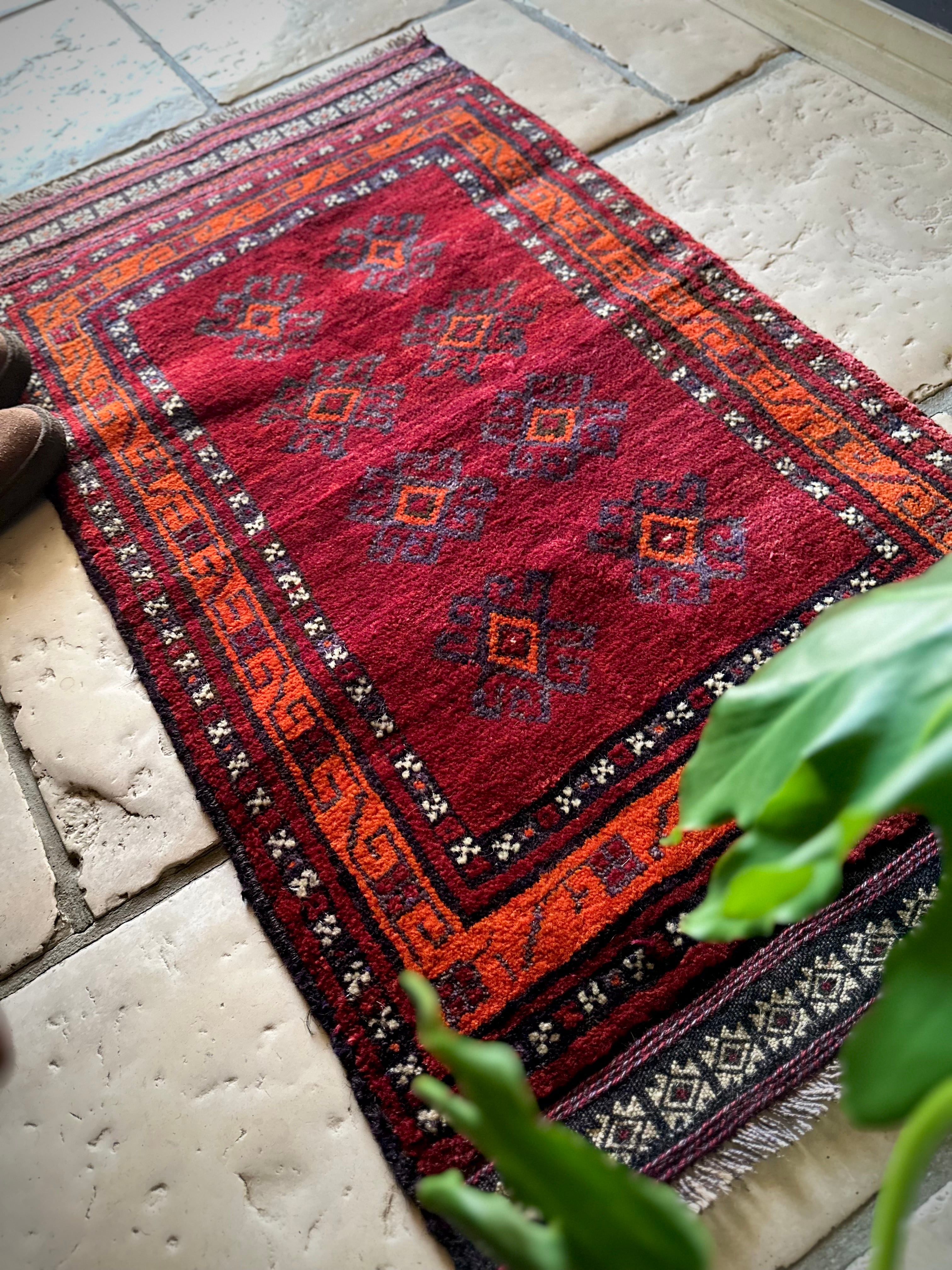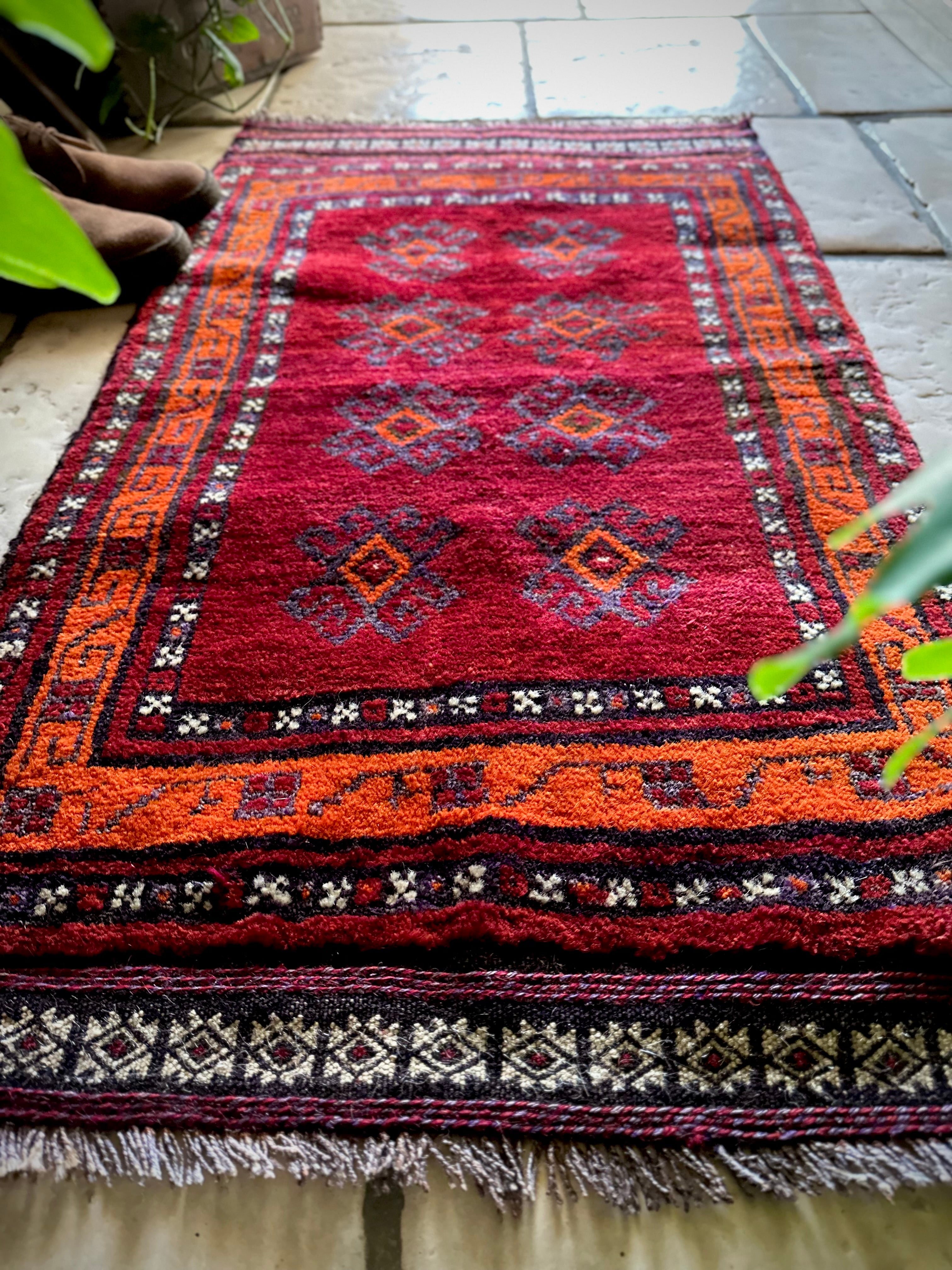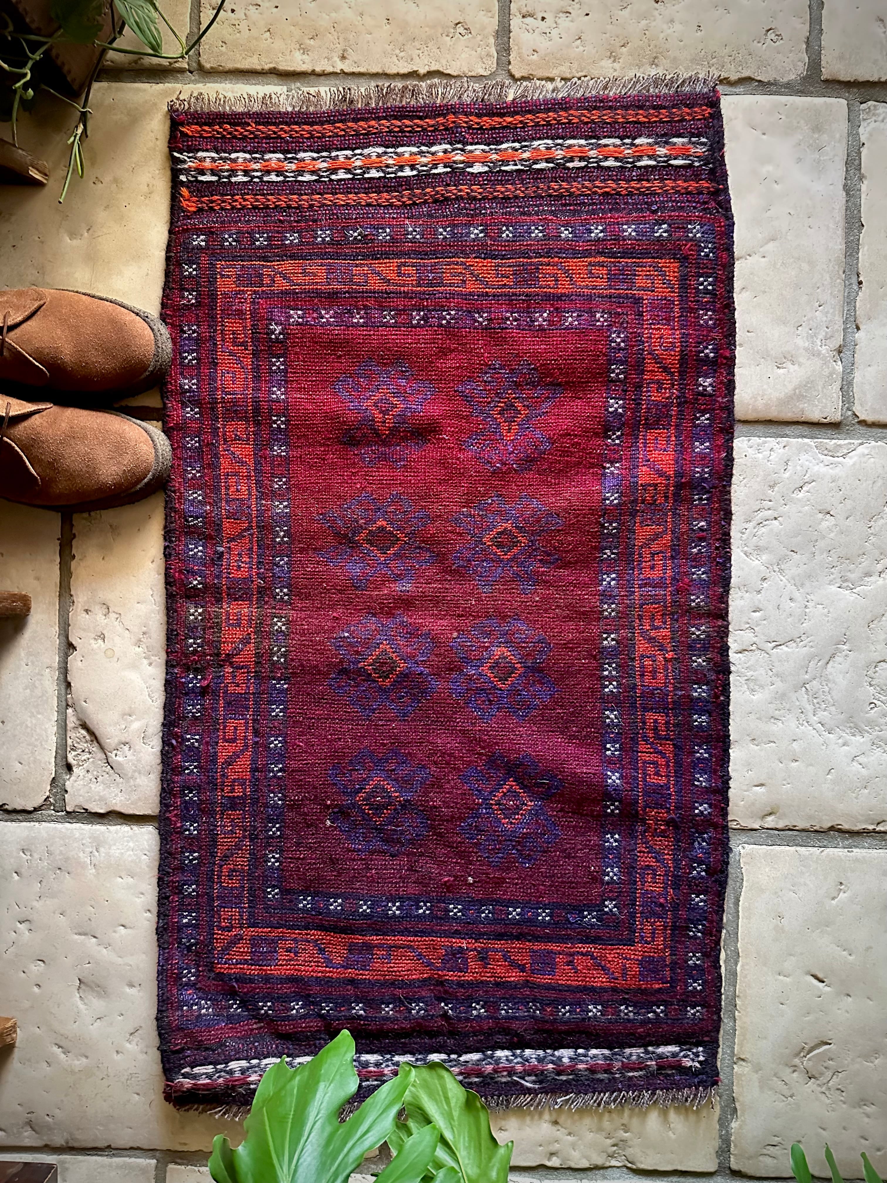 鮮やかな発色のバーガンディとオレンジが際立つ見た目にもフカフカと気持ち良さそうなこちらは、アフガニスタンはヘラート州に居住するバルーチ族のトライバルラグで、元は家財道具などを収納するバーリシトと呼ばれる袋状の表皮のみをラグに仕立て直したモノになります。