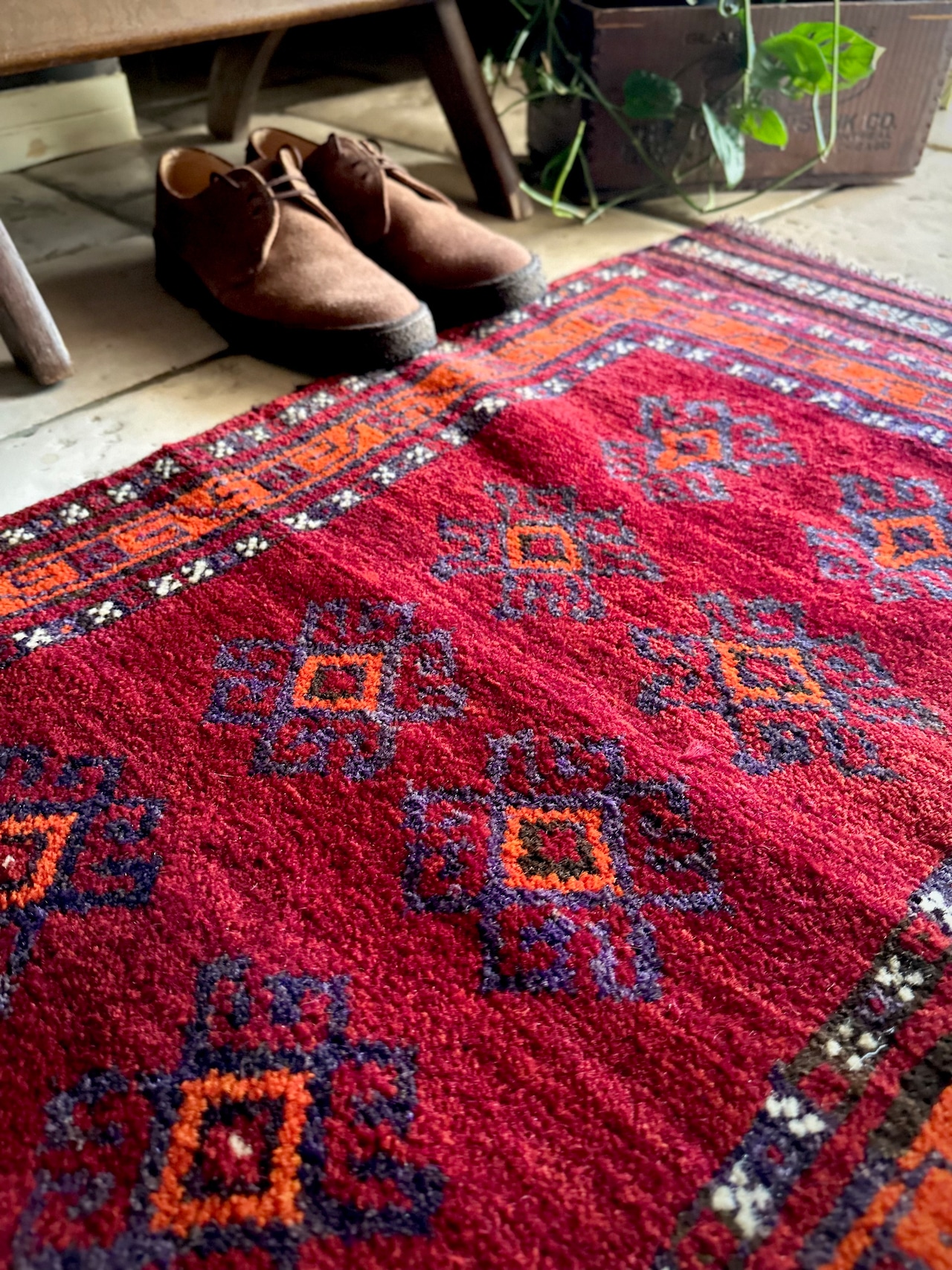 シンプルなパープルのギュルがプリミティブな雰囲気で、バーリシトならではのキリムエンドの装飾がかっこいいでしょうか。大きさは玄関マットやちょっとした小上がりに最適なサイズ感で、しっとりとした柔らかさの扱いやすいアクセントラグになります。
