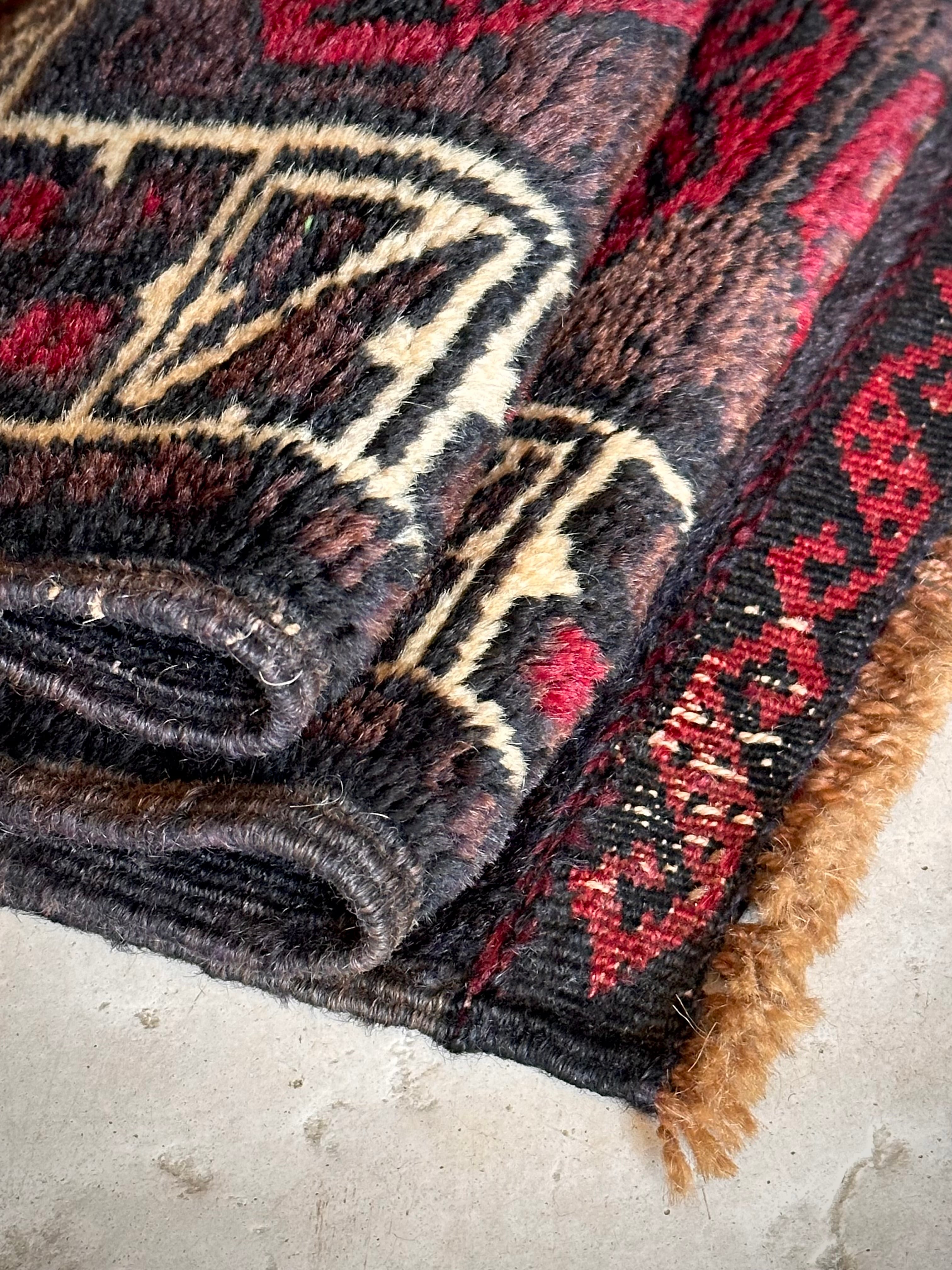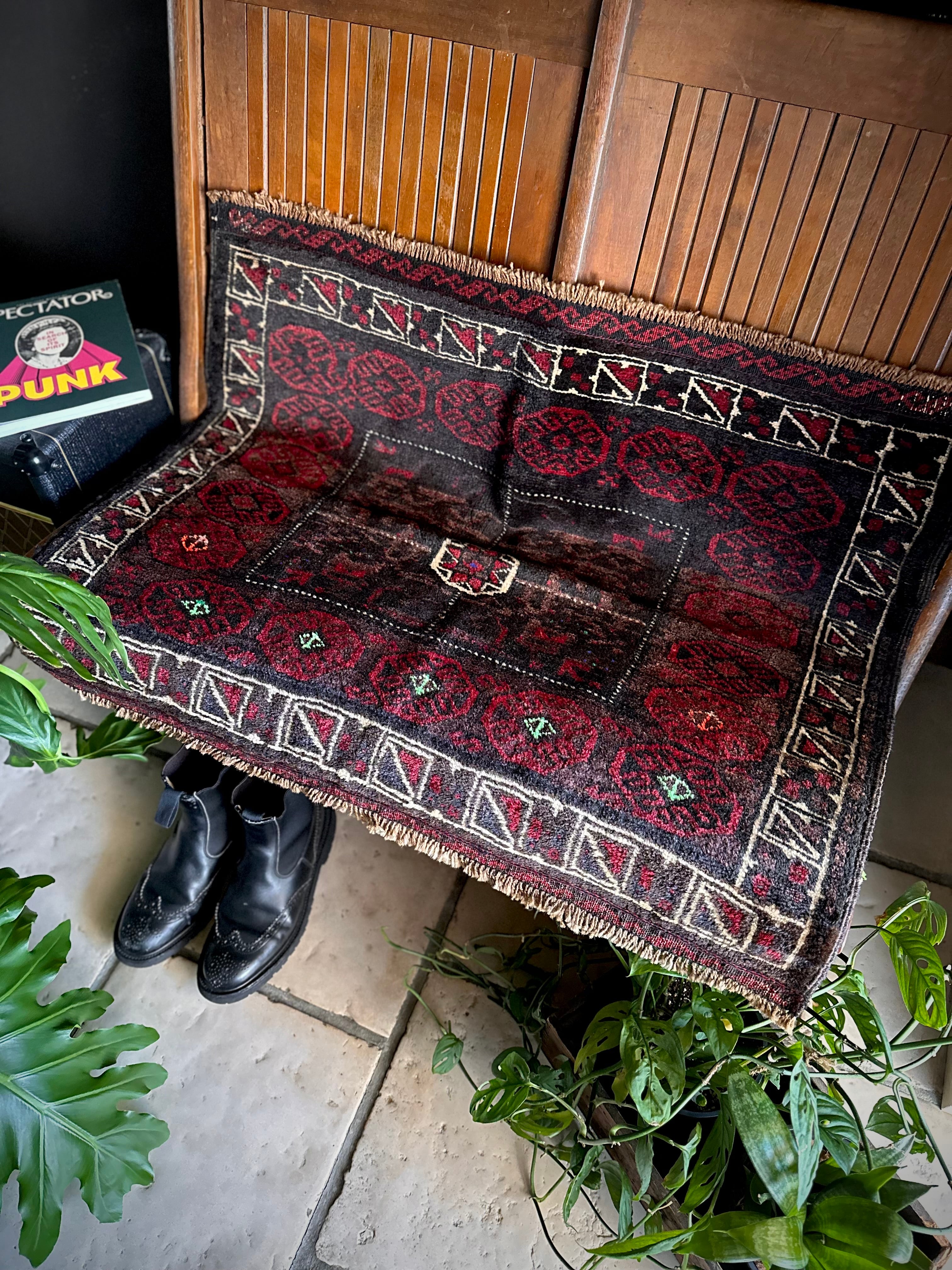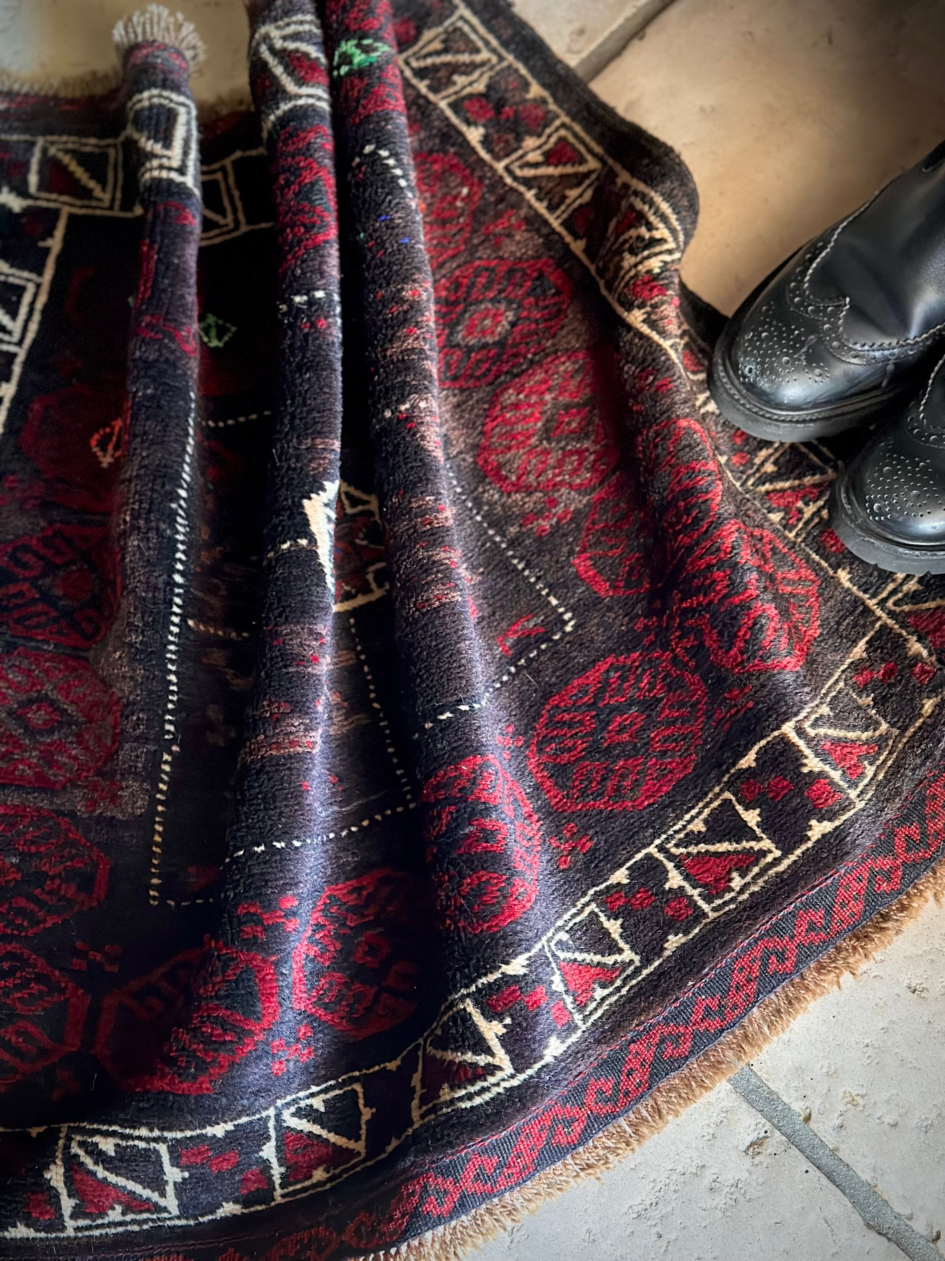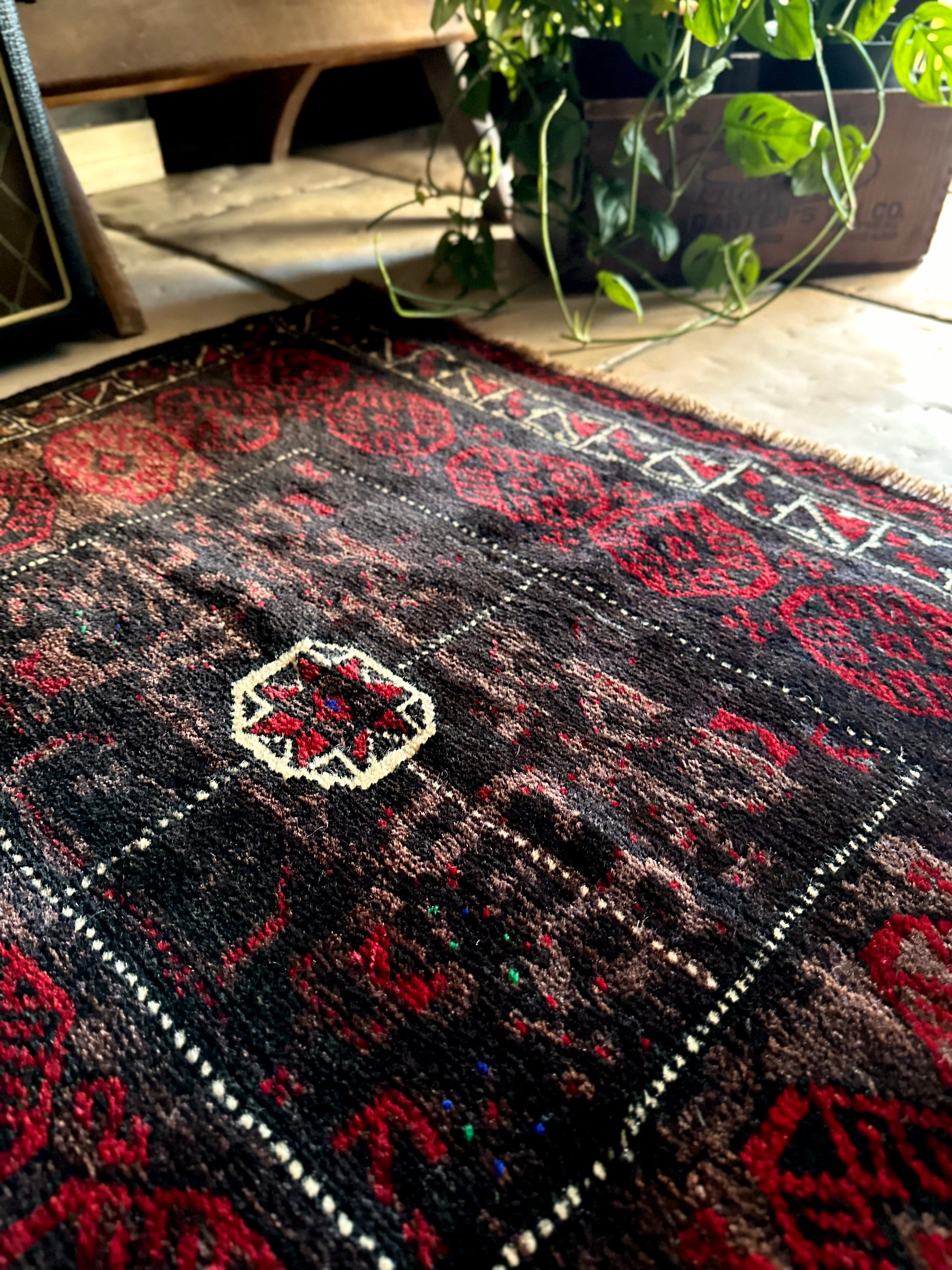 中央に幸運を司る八芒星に鈍く輝くボルドーの柄が描かれたブラックベースがかっこいい雰囲気のこちらは、アフガニスタンはヘラート州に居住するバルーチ族のトライバルラグで、元はラクダなどに背負わせるホルジンと呼ばれる振り分け用バッグの表皮のみをラグに仕立て直したモノになります。